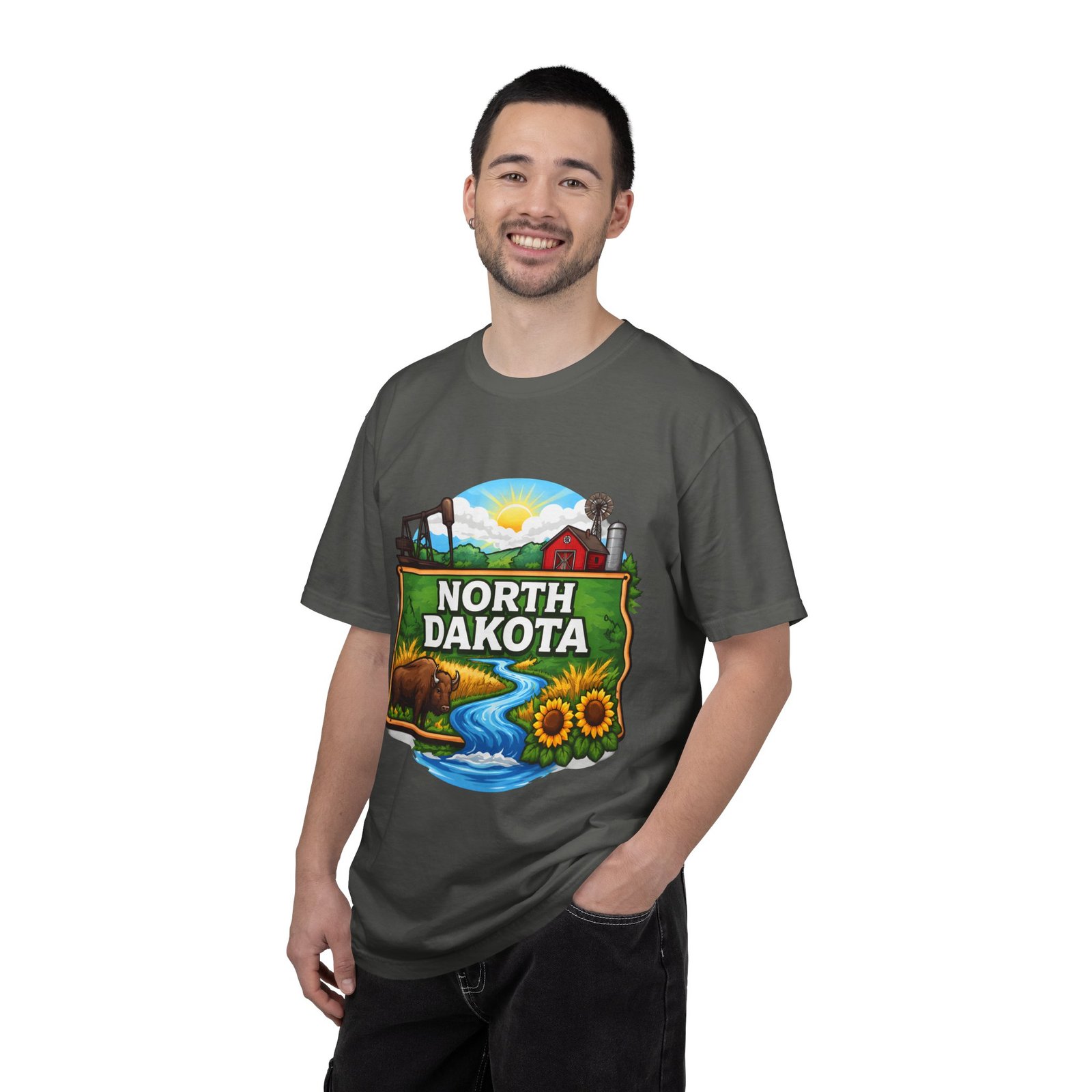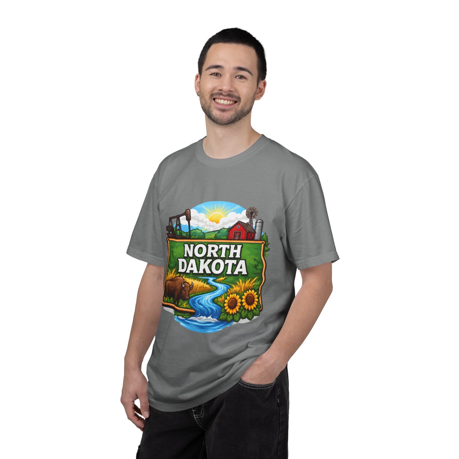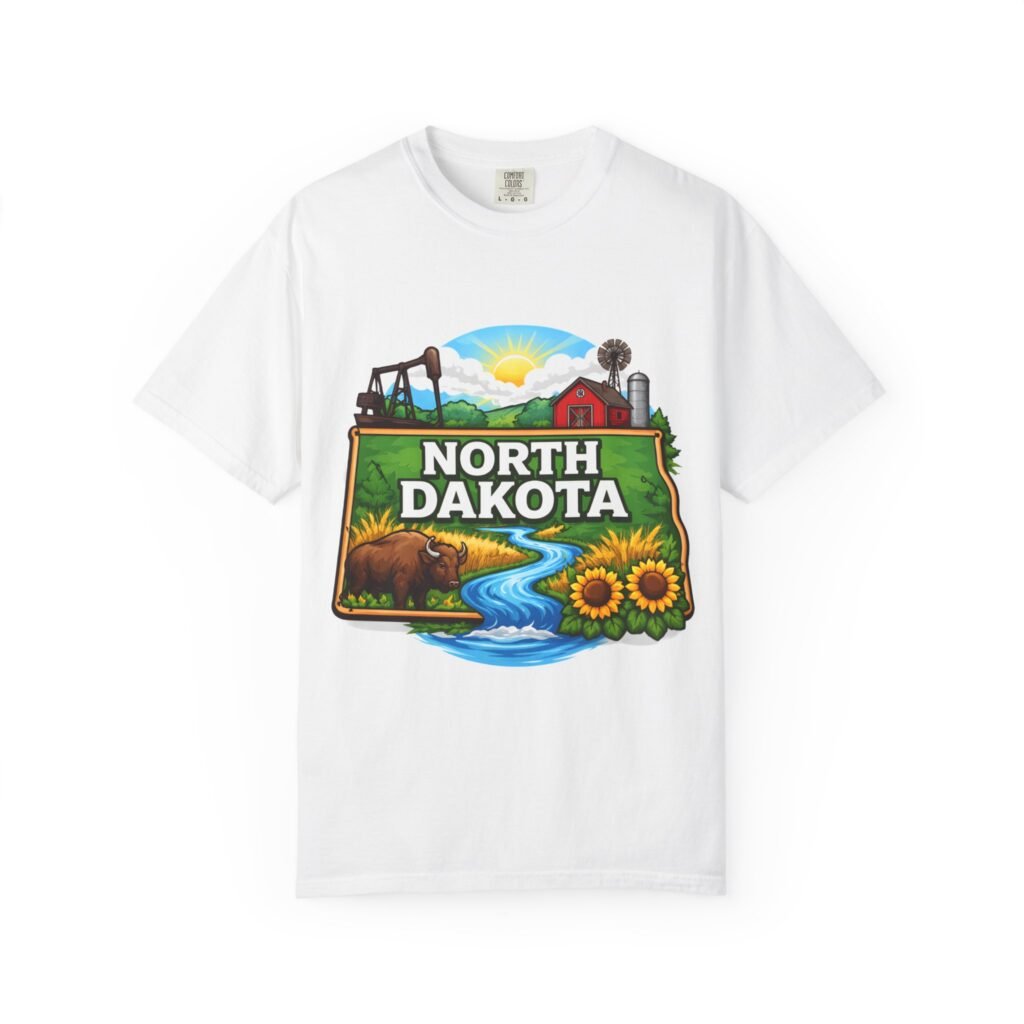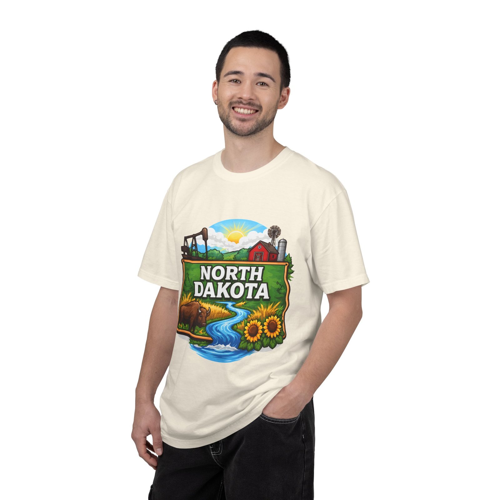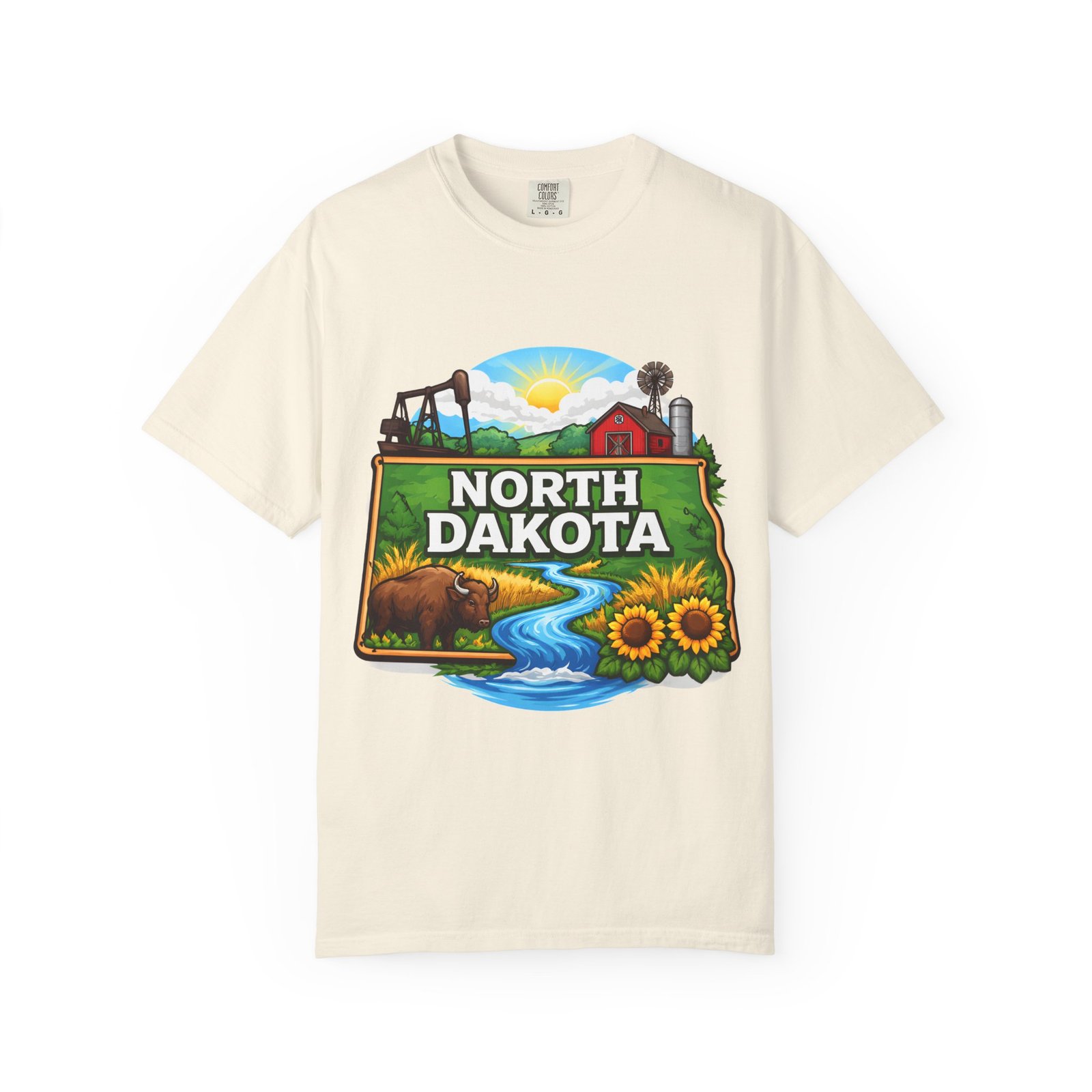 Soft, heavyweight cotton that feels like an old favorite from the first wear. This garment-dyed tee brings a bite of North Dakota wherever you go: rolling prairie, sunflowers leaning toward the light, a winding river, and a quietly grazing bison beneath a wide sky. The relaxed fit and dense 6.1 oz fabric make it a go-to for long days outside or evenings around a fire. Wear it with worn jeans or layered under a flannel for a lived-in look that carries a sense of place and story.