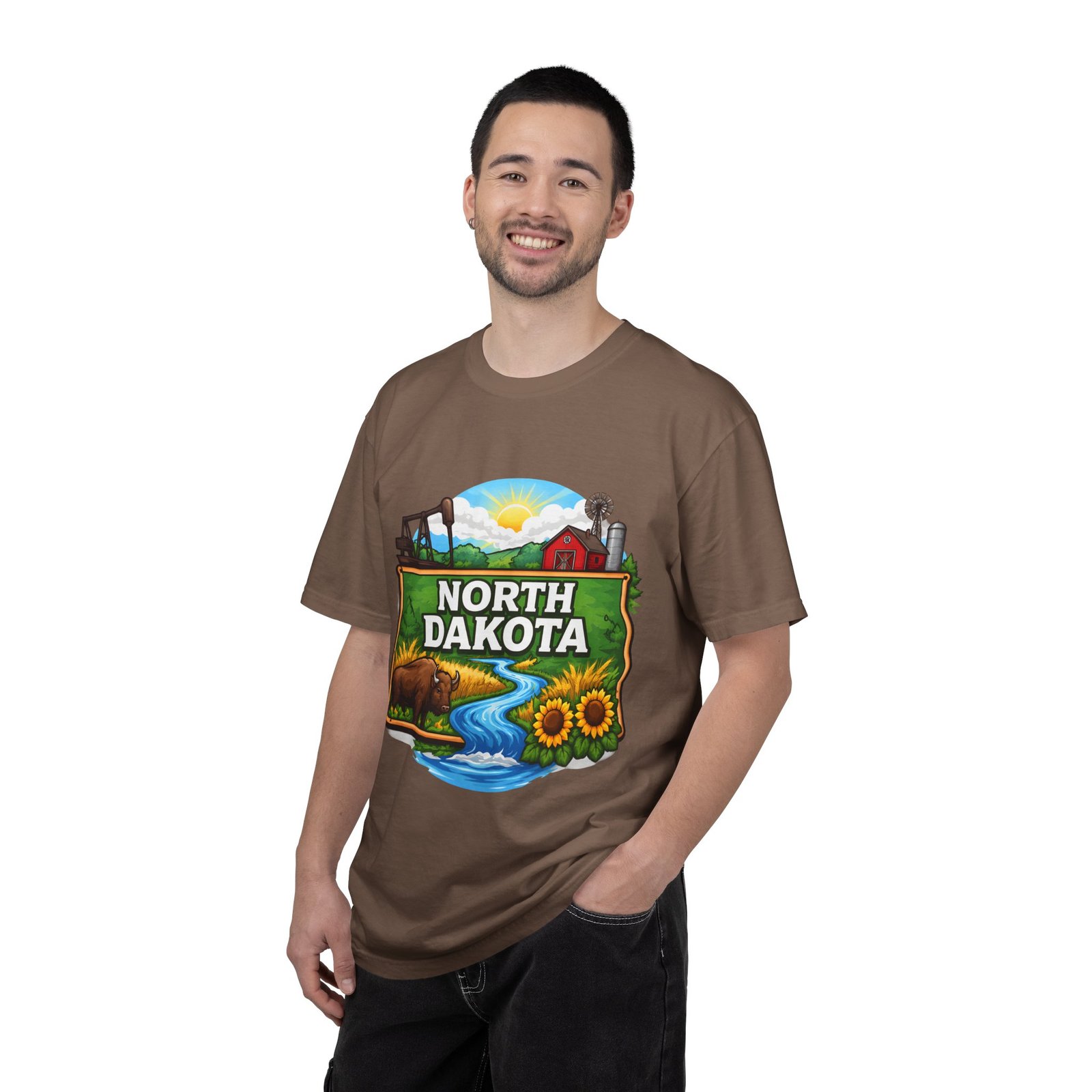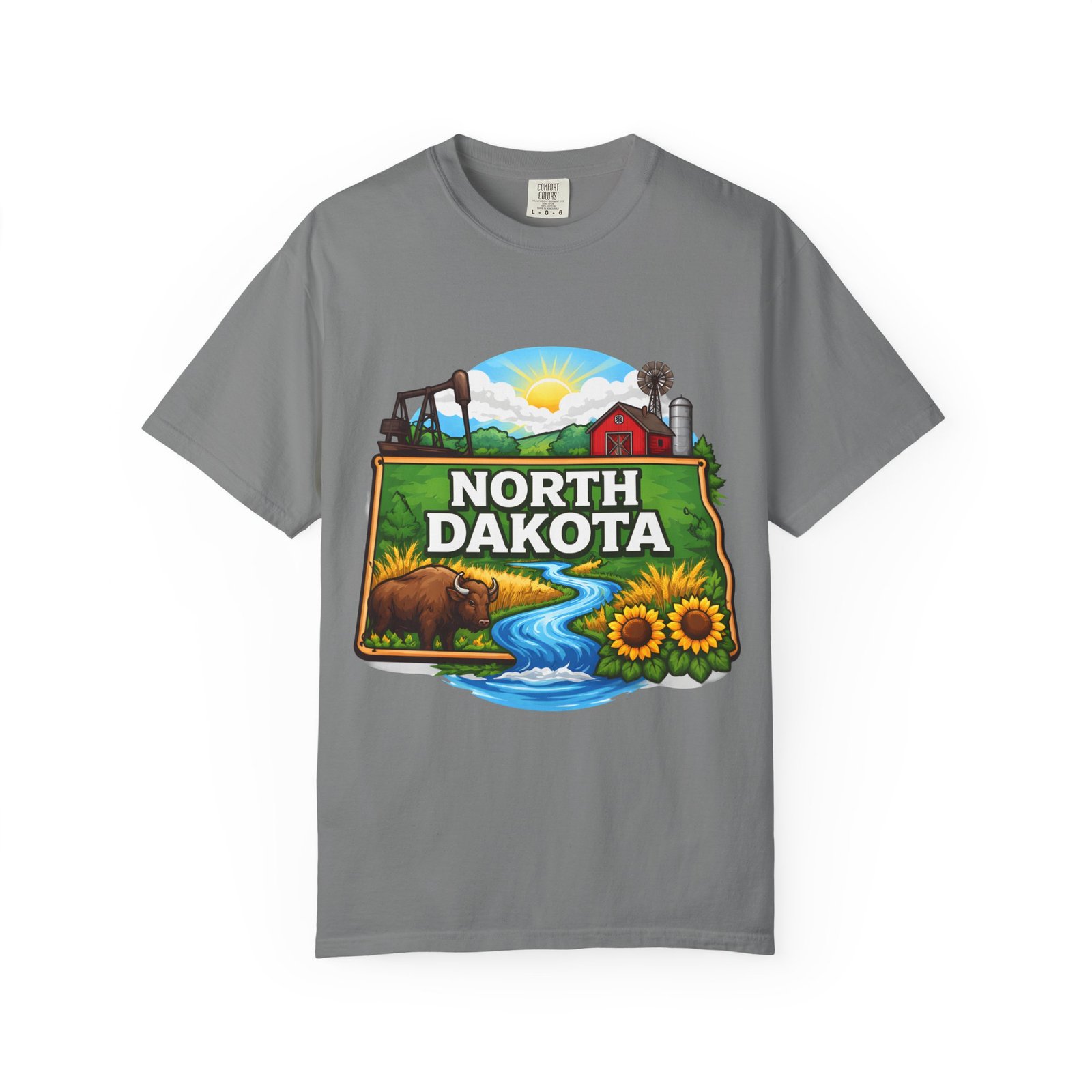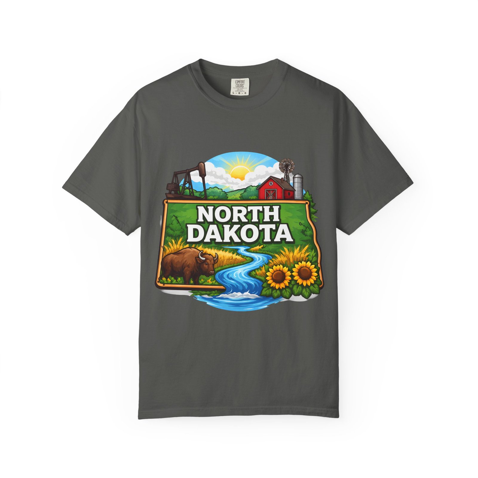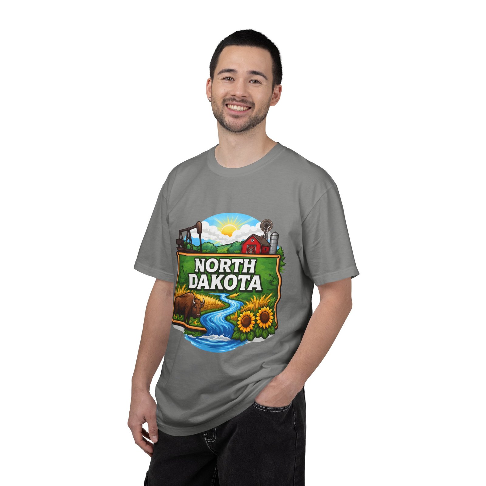 Soft, heavyweight cotton that feels like an old favorite from the first wear. This garment-dyed tee brings a bite of North Dakota wherever you go: rolling prairie, sunflowers leaning toward the light, a winding river, and a quietly grazing bison beneath a wide sky. The relaxed fit and dense 6.1 oz fabric make it a go-to for long days outside or evenings around a fire. Wear it with worn jeans or layered under a flannel for a lived-in look that carries a sense of place and story.