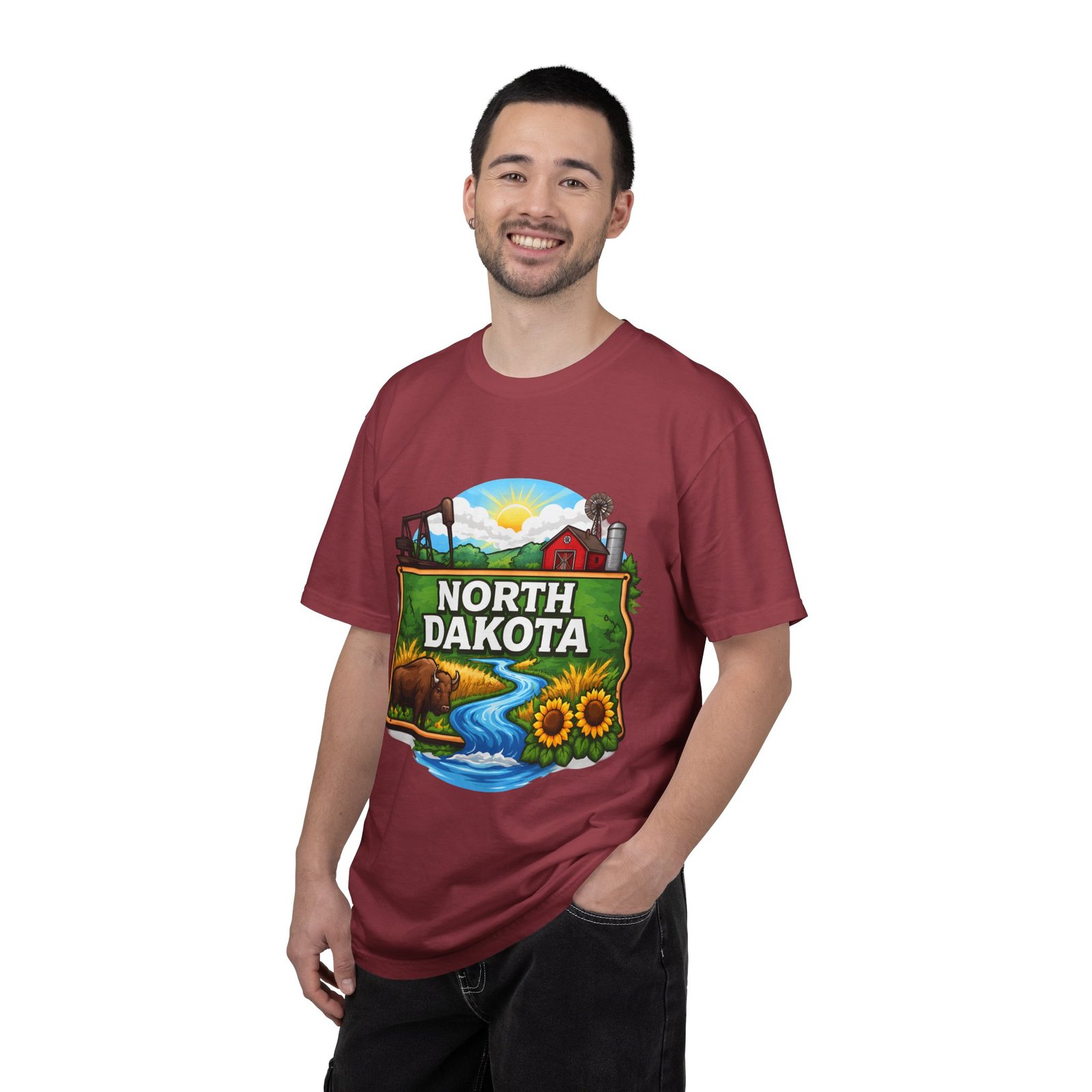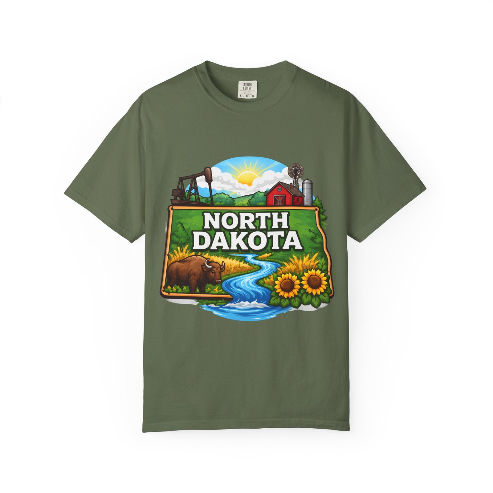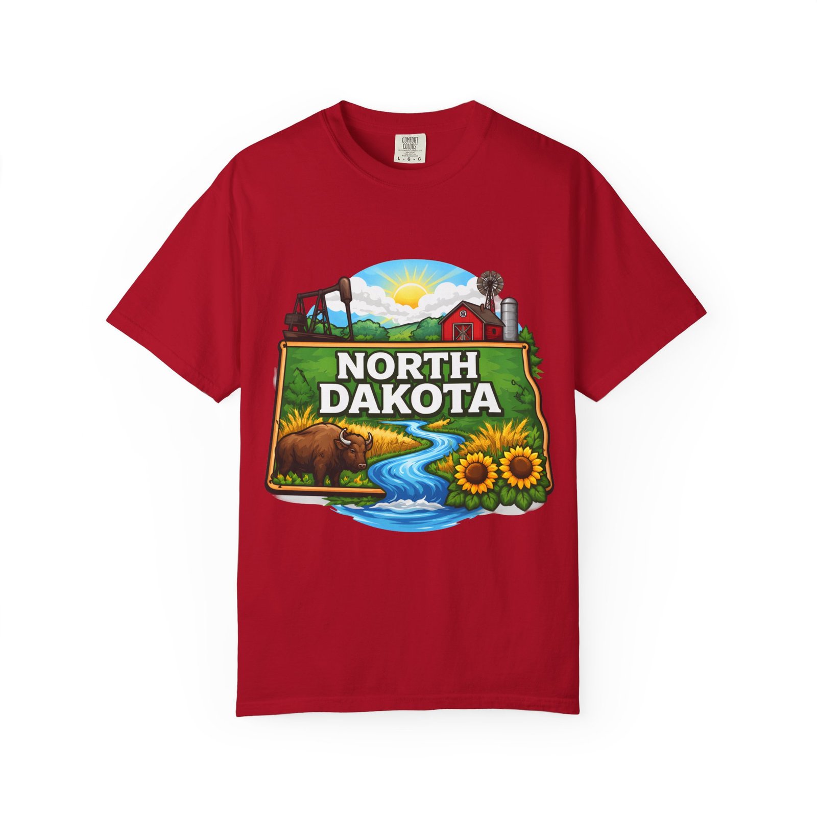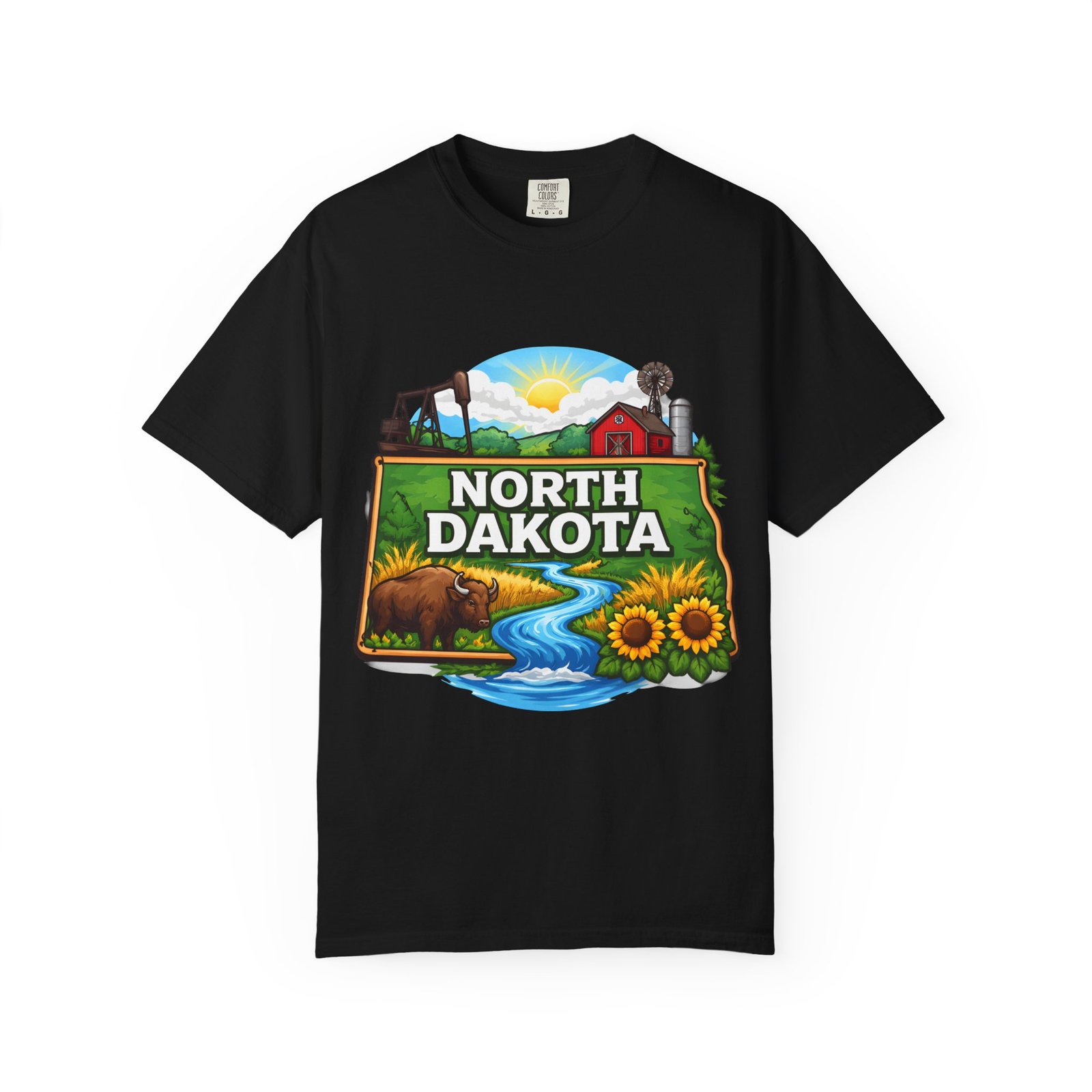 Soft, heavyweight cotton that feels like an old favorite from the first wear. This garment-dyed tee brings a bite of North Dakota wherever you go: rolling prairie, sunflowers leaning toward the light, a winding river, and a quietly grazing bison beneath a wide sky. The relaxed fit and dense 6.1 oz fabric make it a go-to for long days outside or evenings around a fire. Wear it with worn jeans or layered under a flannel for a lived-in look that carries a sense of place and story.