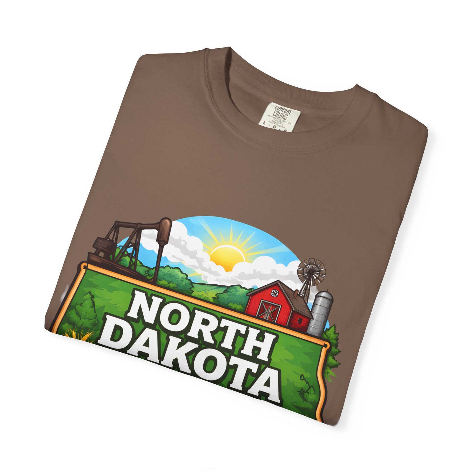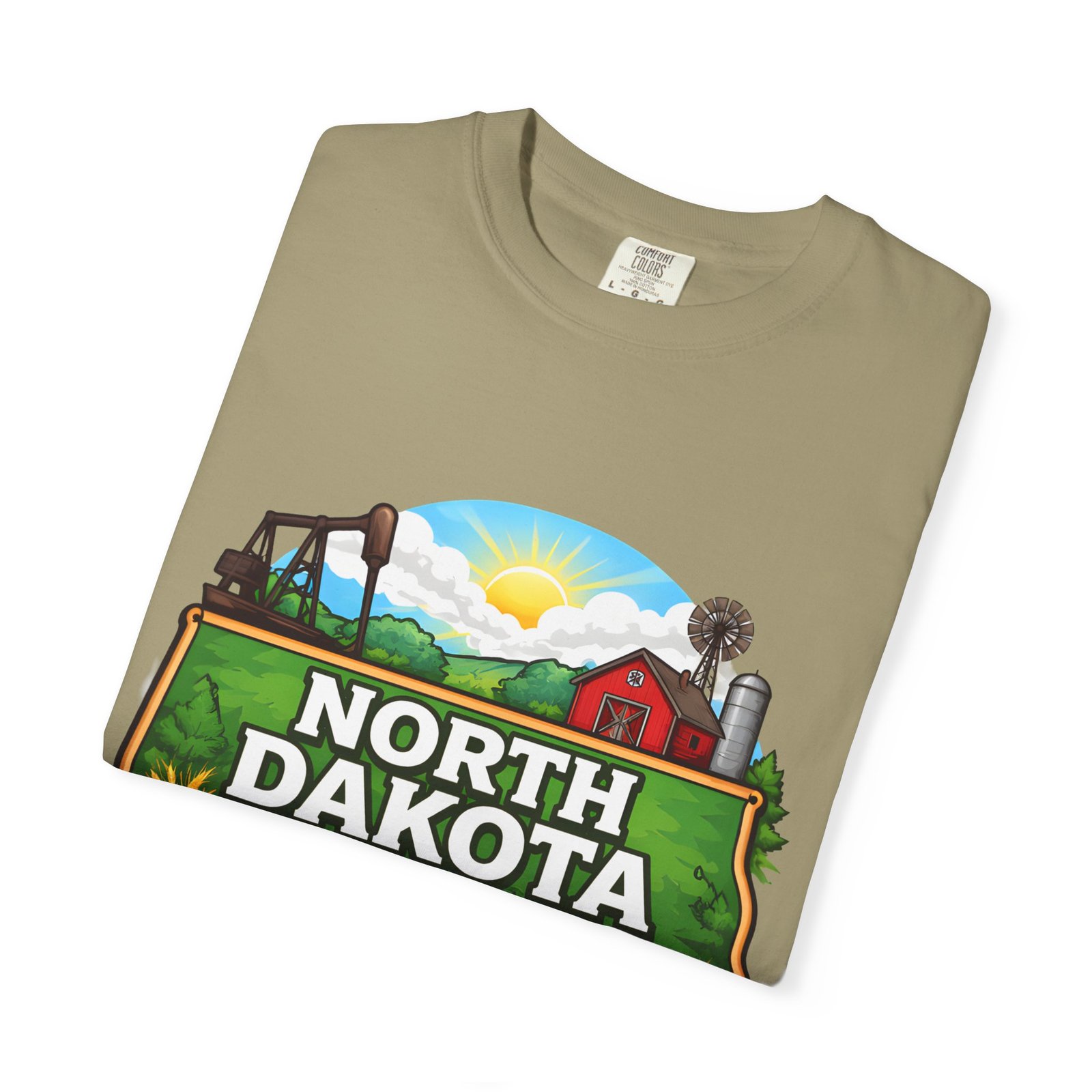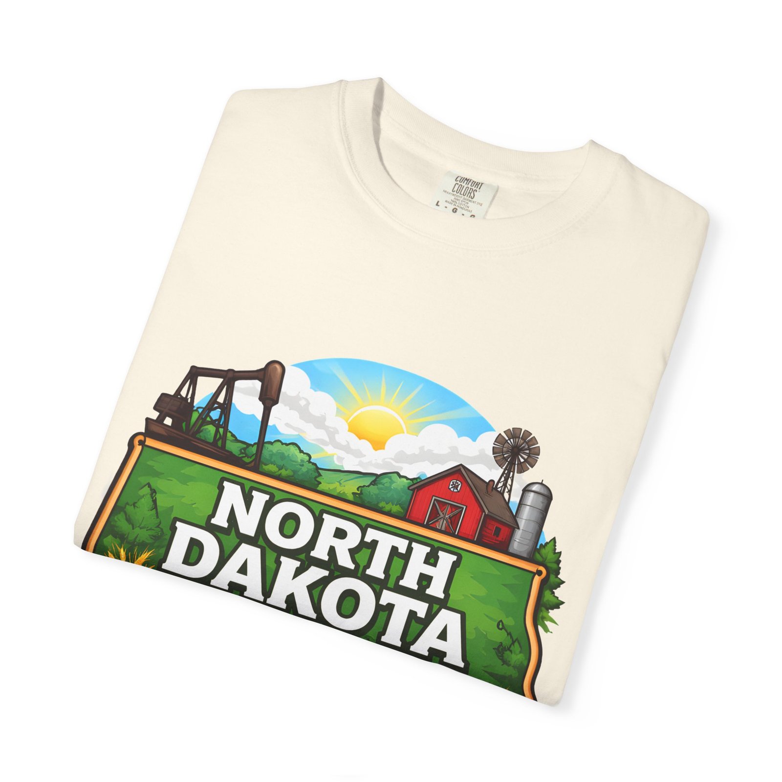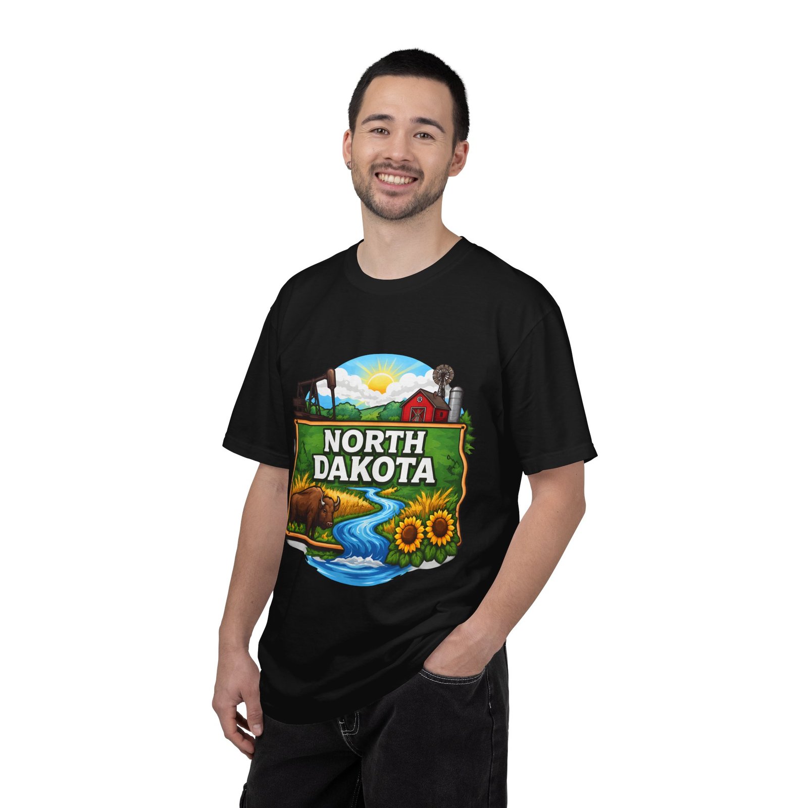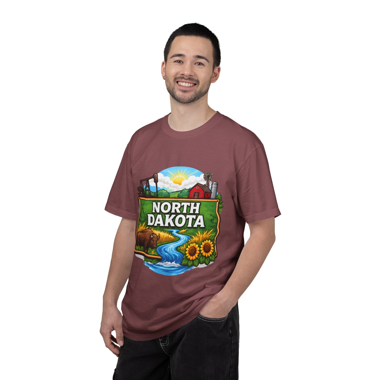 Soft, heavyweight cotton that feels like an old favorite from the first wear. This garment-dyed tee brings a bite of North Dakota wherever you go: rolling prairie, sunflowers leaning toward the light, a winding river, and a quietly grazing bison beneath a wide sky. The relaxed fit and dense 6.1 oz fabric make it a go-to for long days outside or evenings around a fire. Wear it with worn jeans or layered under a flannel for a lived-in look that carries a sense of place and story.