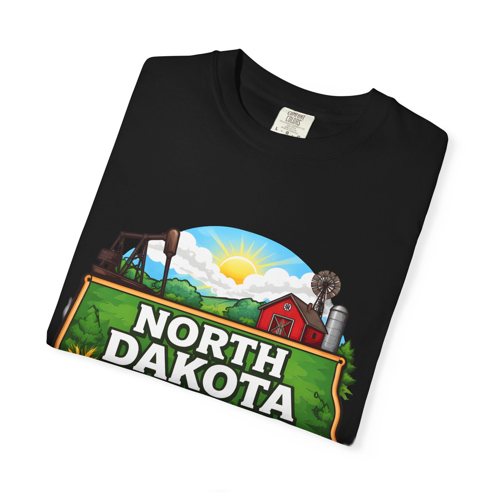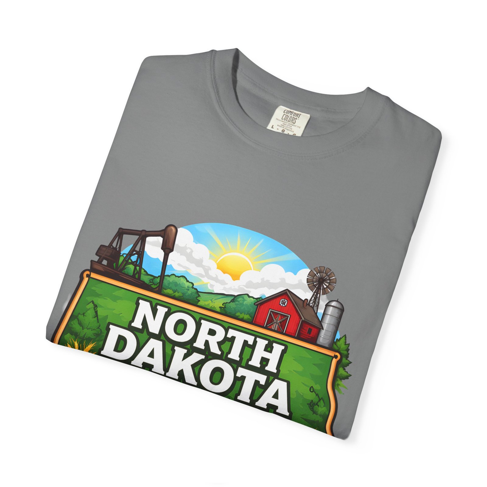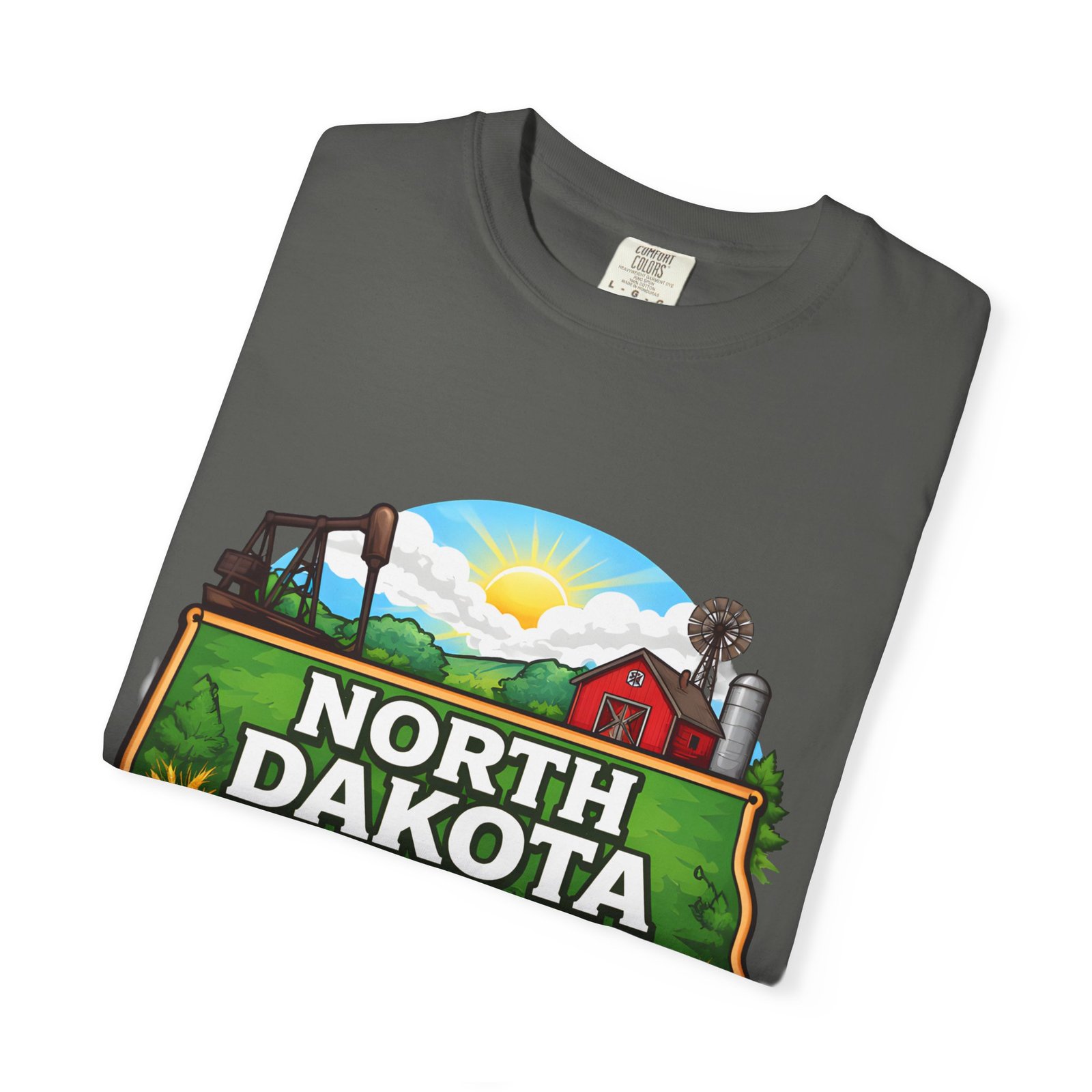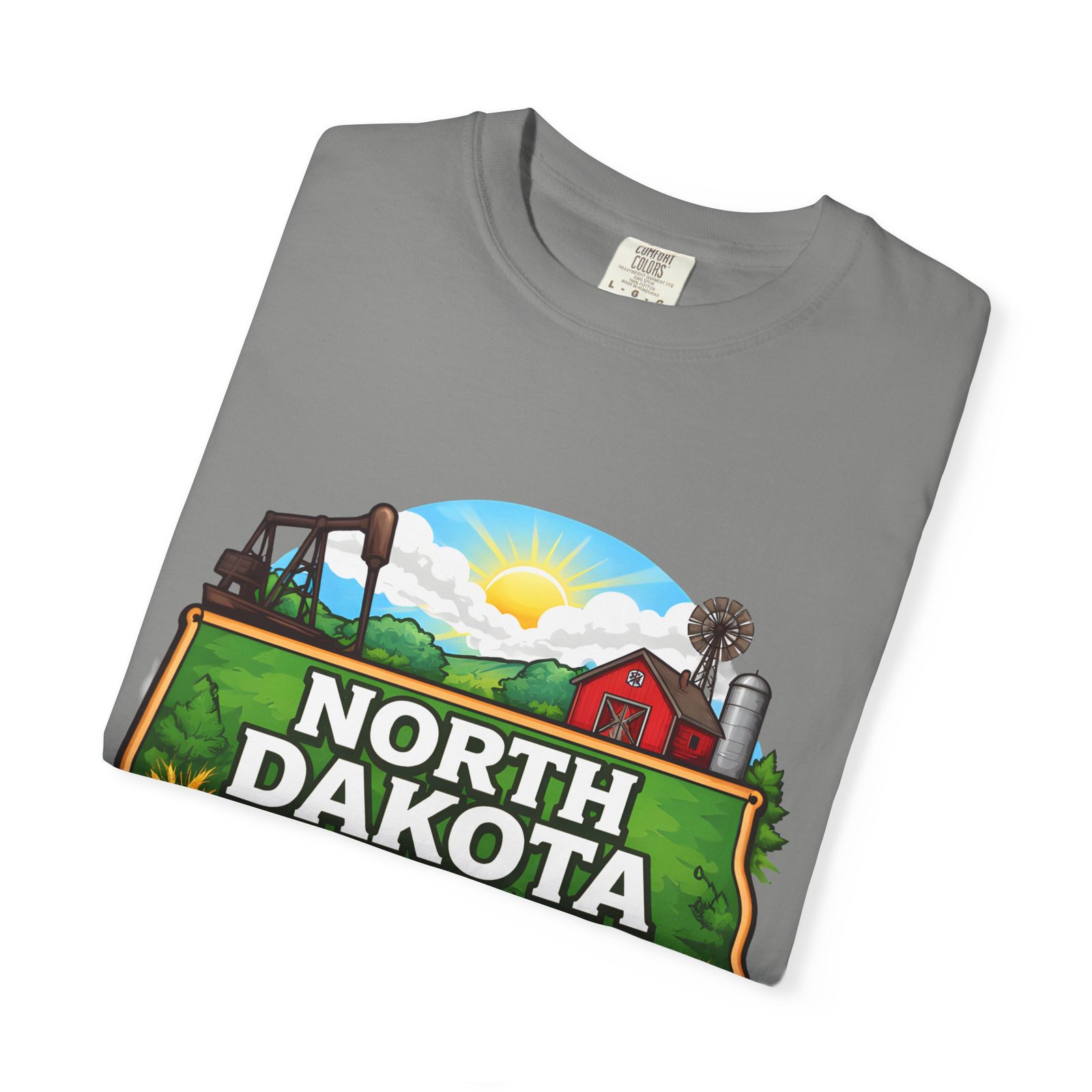 Soft, heavyweight cotton that feels like an old favorite from the first wear. This garment-dyed tee brings a bite of North Dakota wherever you go: rolling prairie, sunflowers leaning toward the light, a winding river, and a quietly grazing bison beneath a wide sky. The relaxed fit and dense 6.1 oz fabric make it a go-to for long days outside or evenings around a fire. Wear it with worn jeans or layered under a flannel for a lived-in look that carries a sense of place and story.