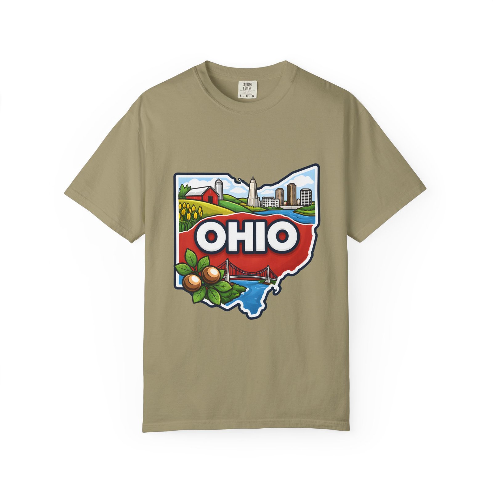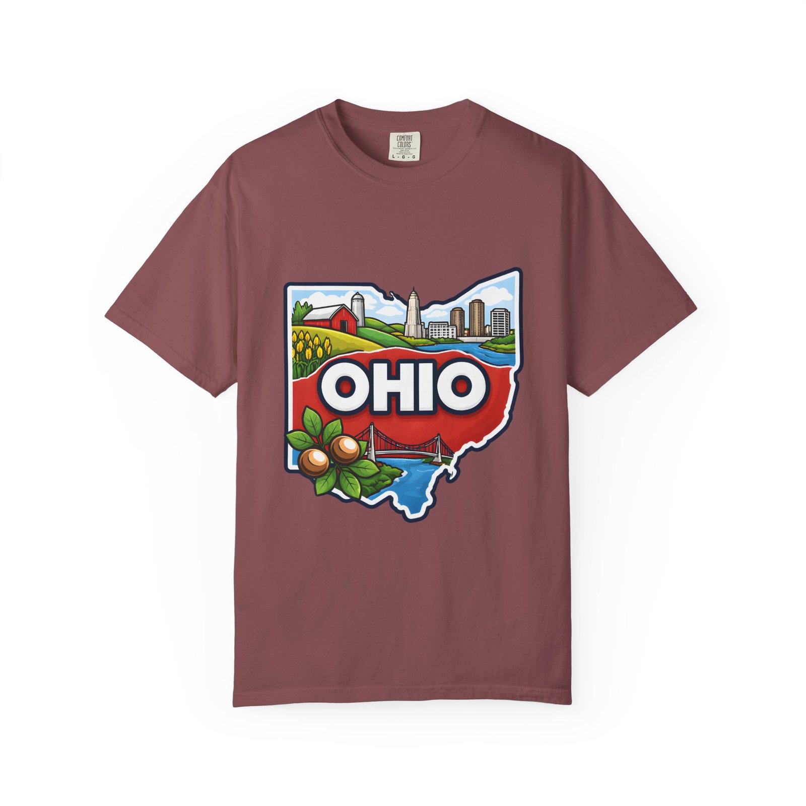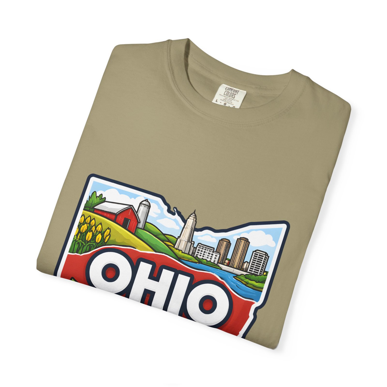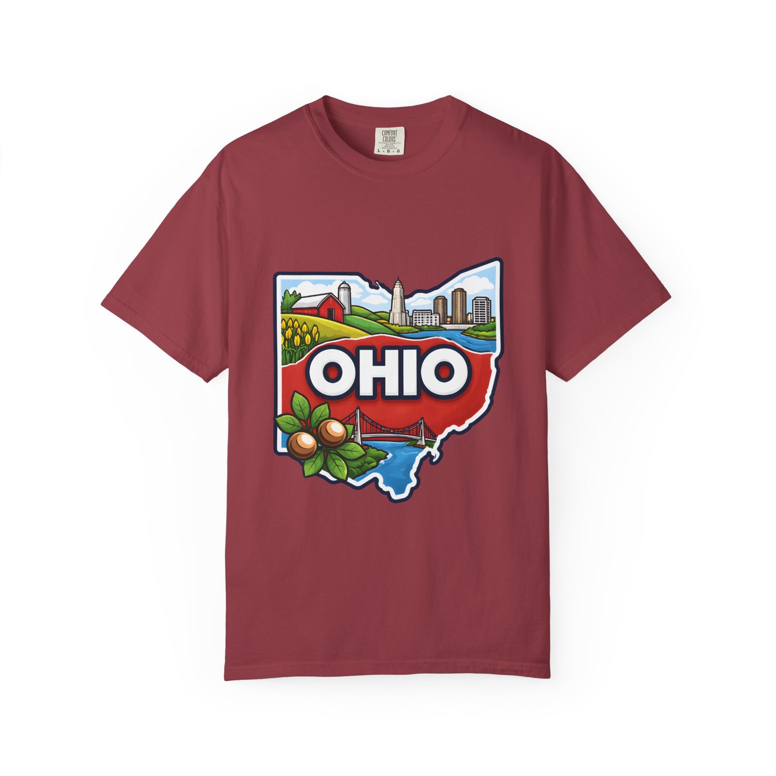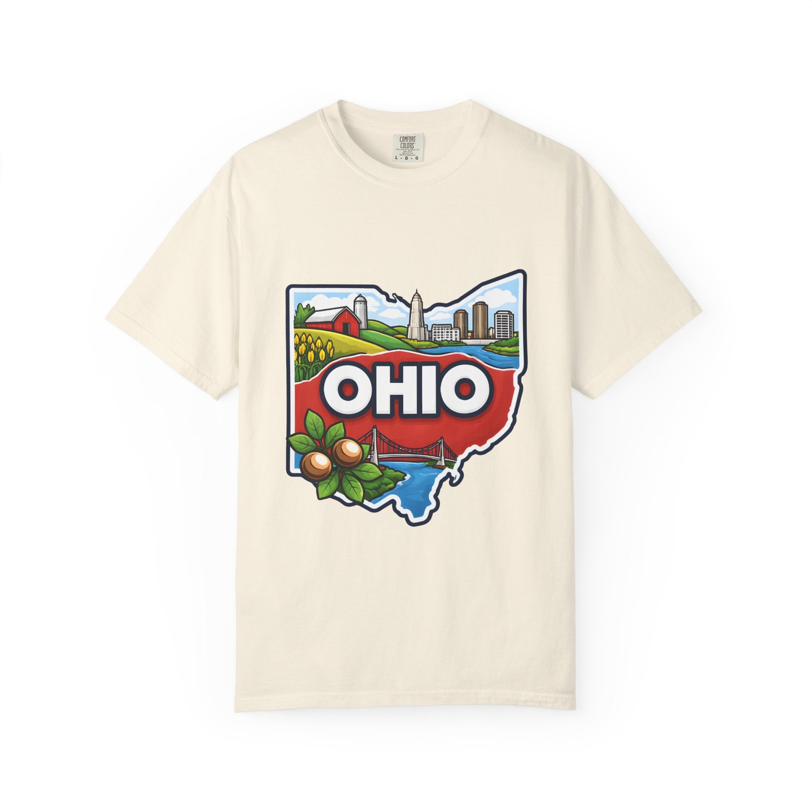 Soft, lived-in comfort meets hometown pride. This garment-dyed tee carries a warm, slightly vintage hand — the cotton relaxes against your skin and the colors mellow with wear. Front artwork maps Ohio in bold, playful colors: city skyline, rolling farmland, a red barn, and seasonal fruit accents. Wear it on weekend drives, farmers’ market mornings, or casual nights with friends. The relaxed fit and heavyweight cotton make it feel durable without stiffening your movement. Over time the fabric and print settle into the rhythms of your days, becoming a favorite layer for cool evenings and sunlit afternoons alike.