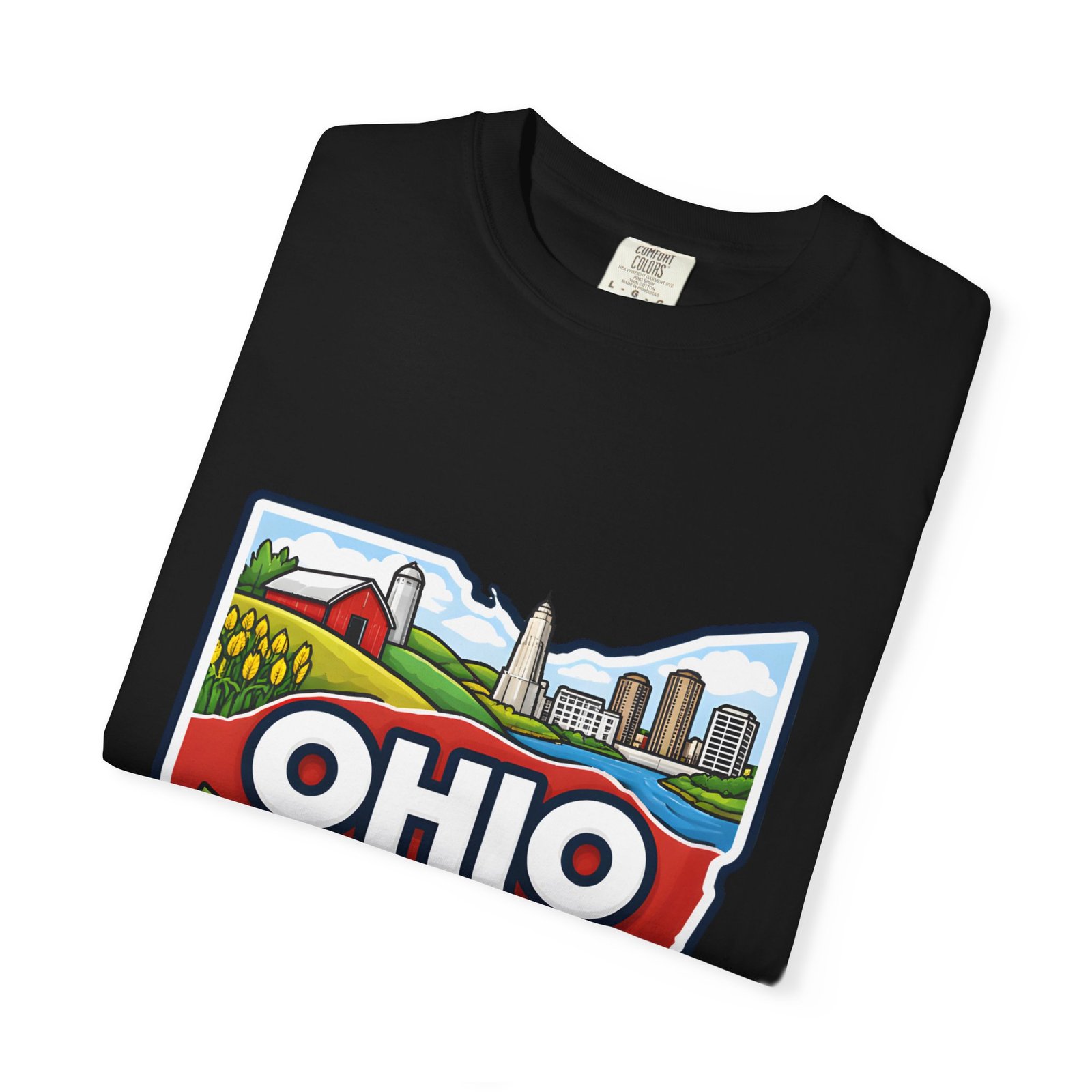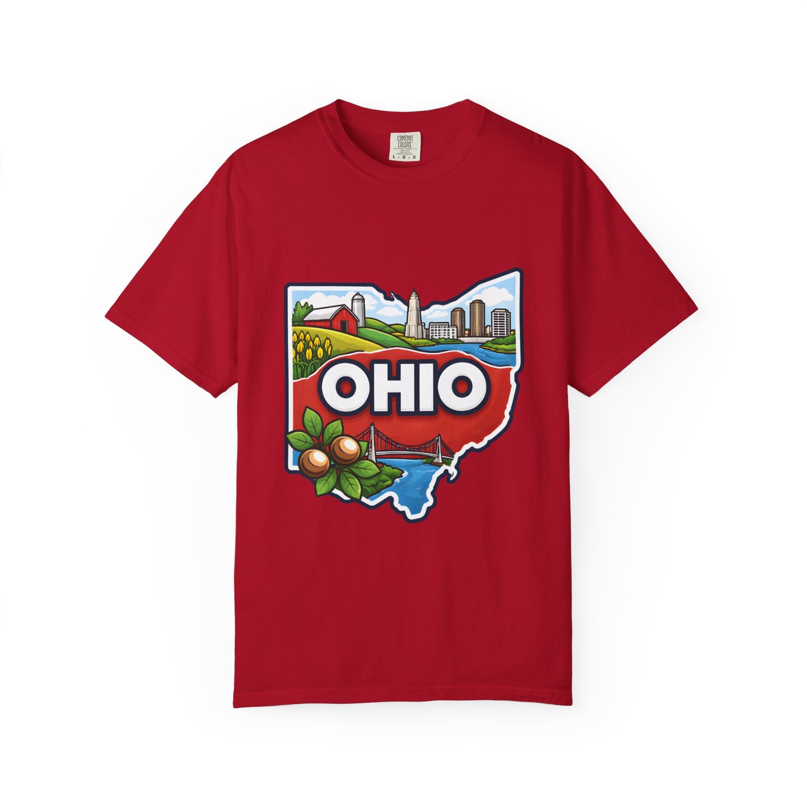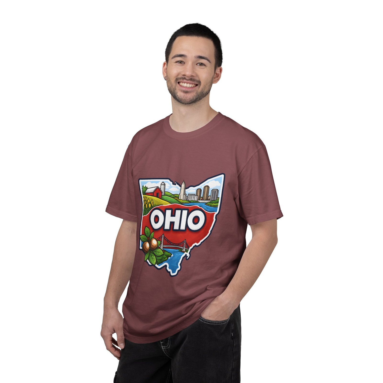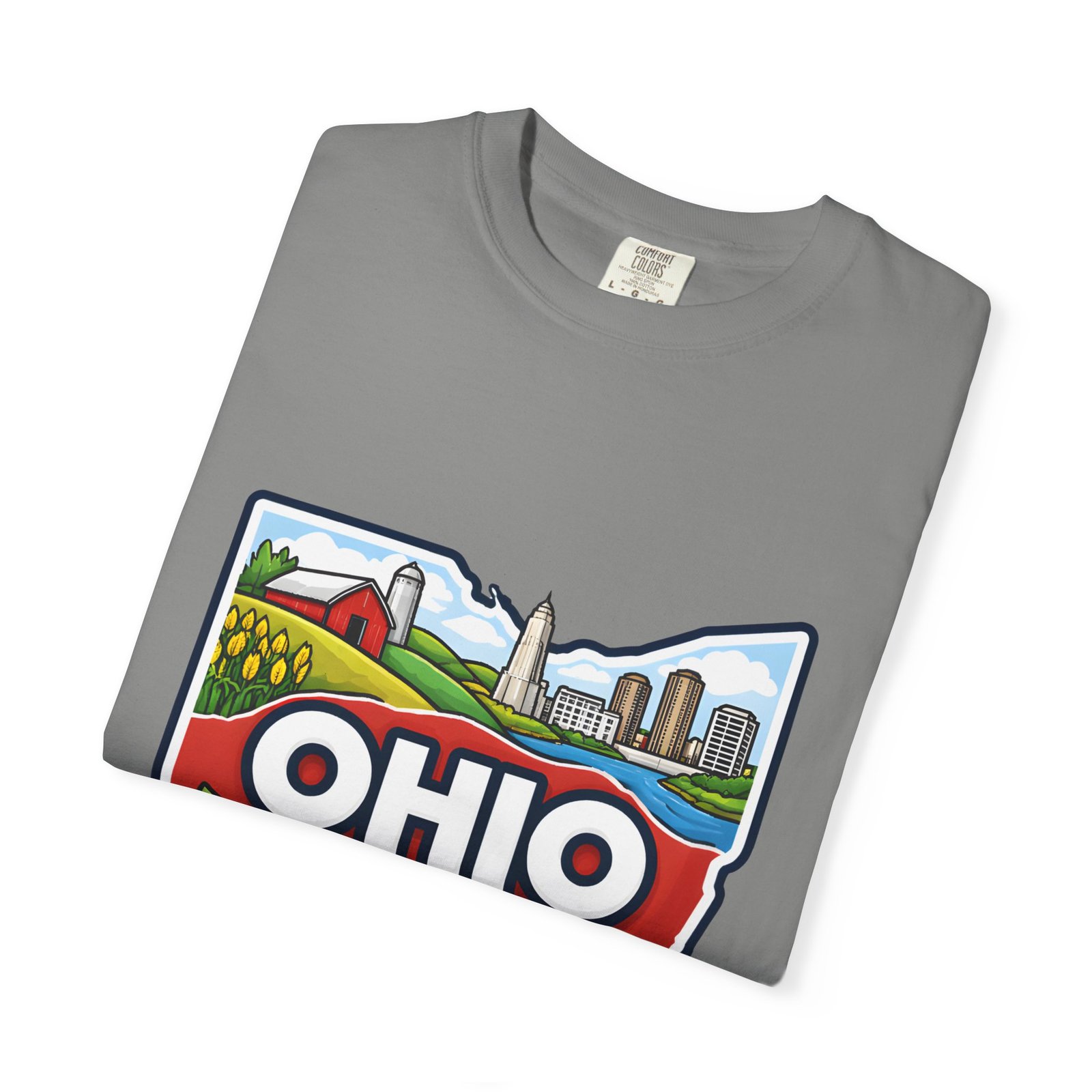 Soft, lived-in comfort meets hometown pride. This garment-dyed tee carries a warm, slightly vintage hand — the cotton relaxes against your skin and the colors mellow with wear. Front artwork maps Ohio in bold, playful colors: city skyline, rolling farmland, a red barn, and seasonal fruit accents. Wear it on weekend drives, farmers’ market mornings, or casual nights with friends. The relaxed fit and heavyweight cotton make it feel durable without stiffening your movement. Over time the fabric and print settle into the rhythms of your days, becoming a favorite layer for cool evenings and sunlit afternoons alike.