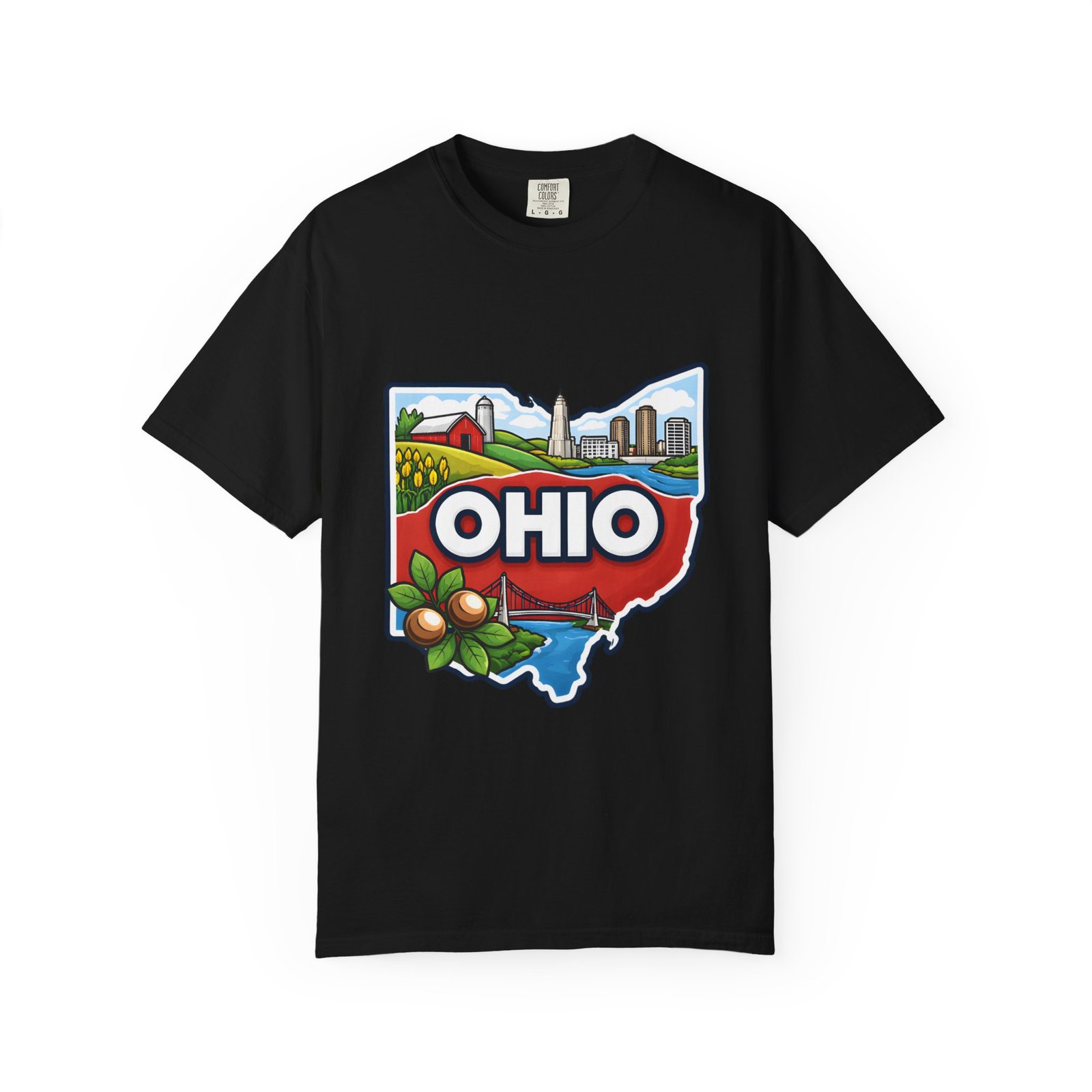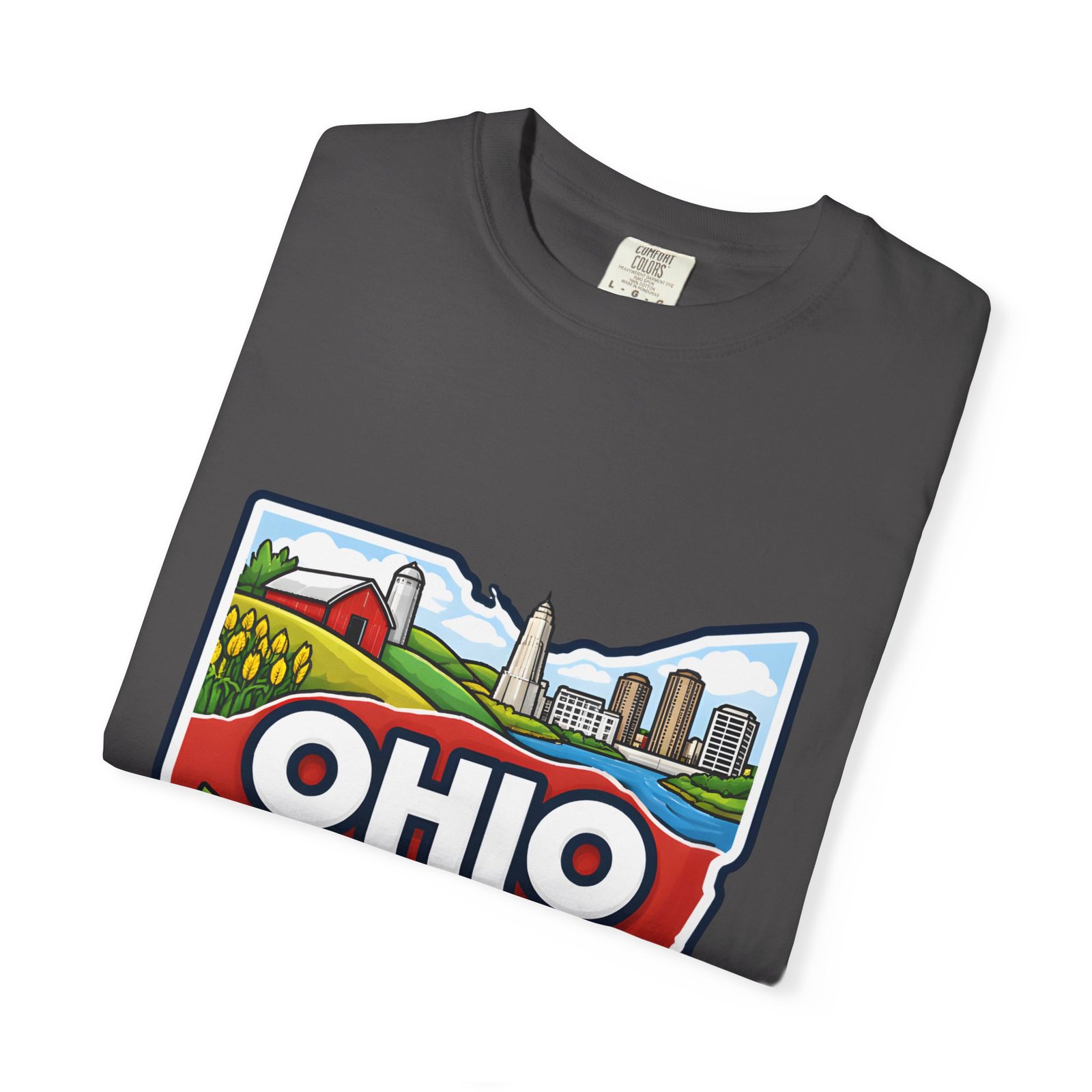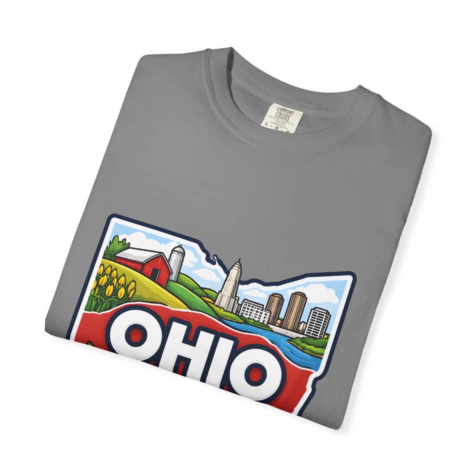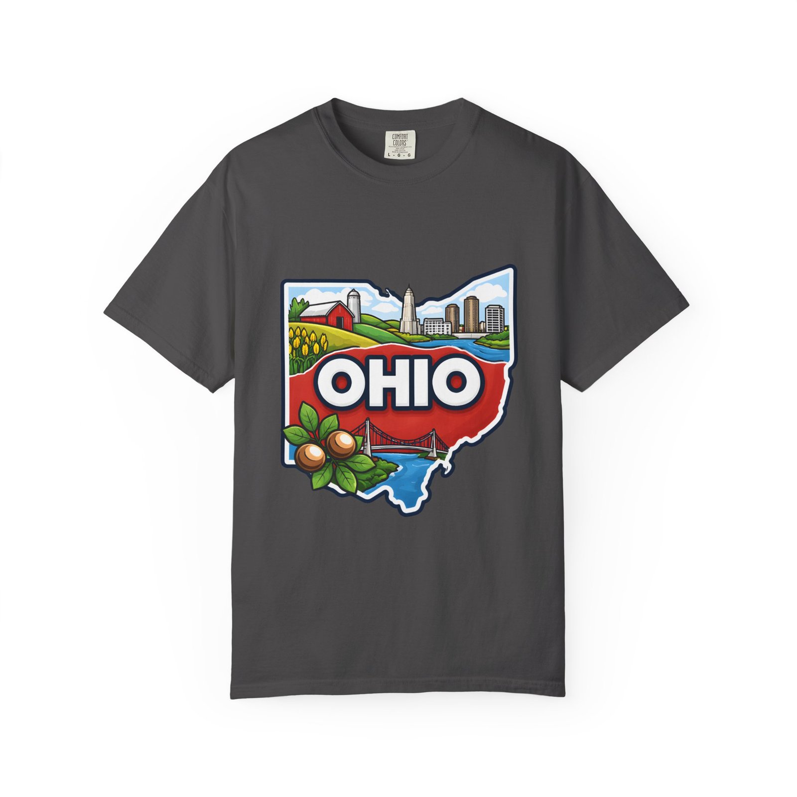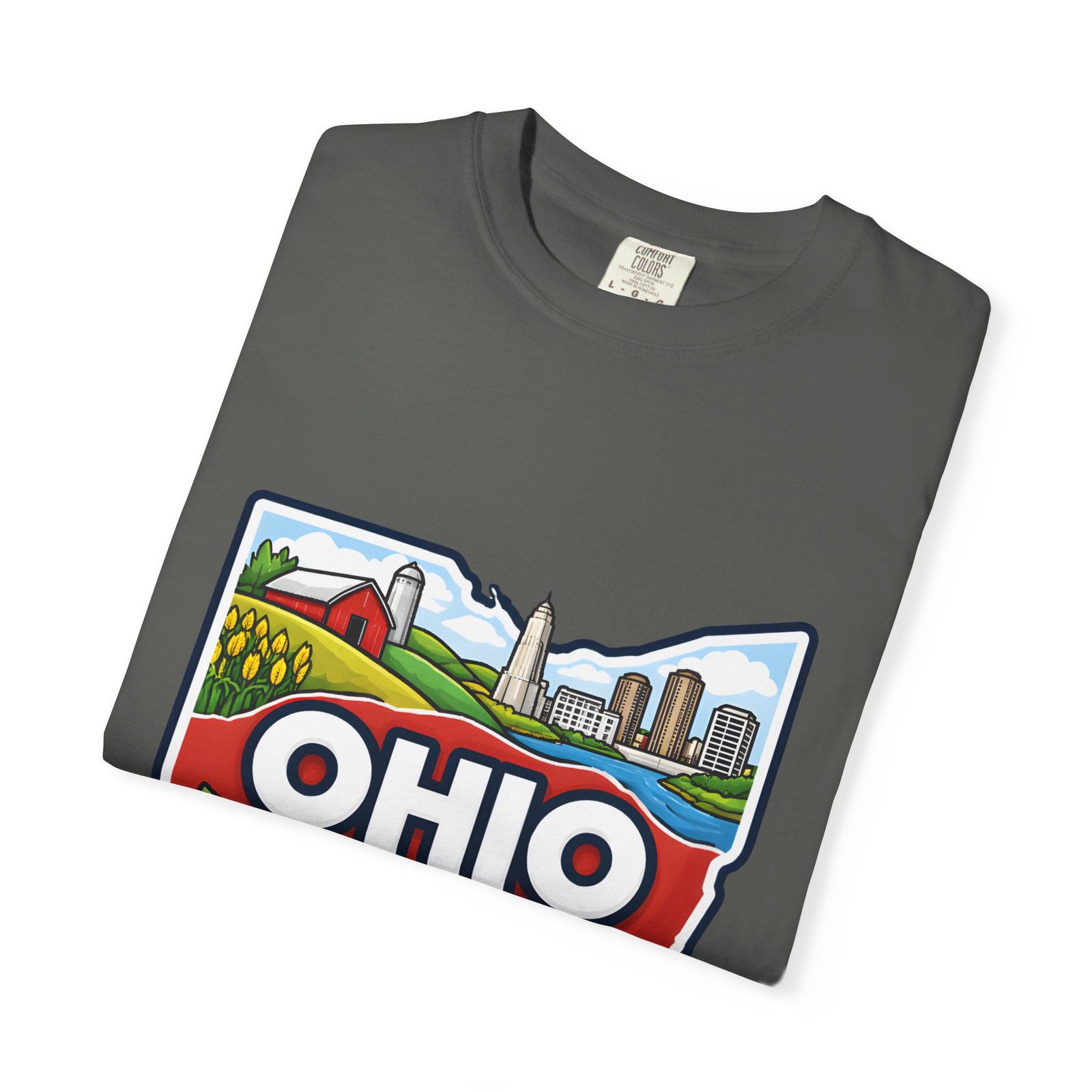 Soft, lived-in comfort meets hometown pride. This garment-dyed tee carries a warm, slightly vintage hand — the cotton relaxes against your skin and the colors mellow with wear. Front artwork maps Ohio in bold, playful colors: city skyline, rolling farmland, a red barn, and seasonal fruit accents. Wear it on weekend drives, farmers’ market mornings, or casual nights with friends. The relaxed fit and heavyweight cotton make it feel durable without stiffening your movement. Over time the fabric and print settle into the rhythms of your days, becoming a favorite layer for cool evenings and sunlit afternoons alike.