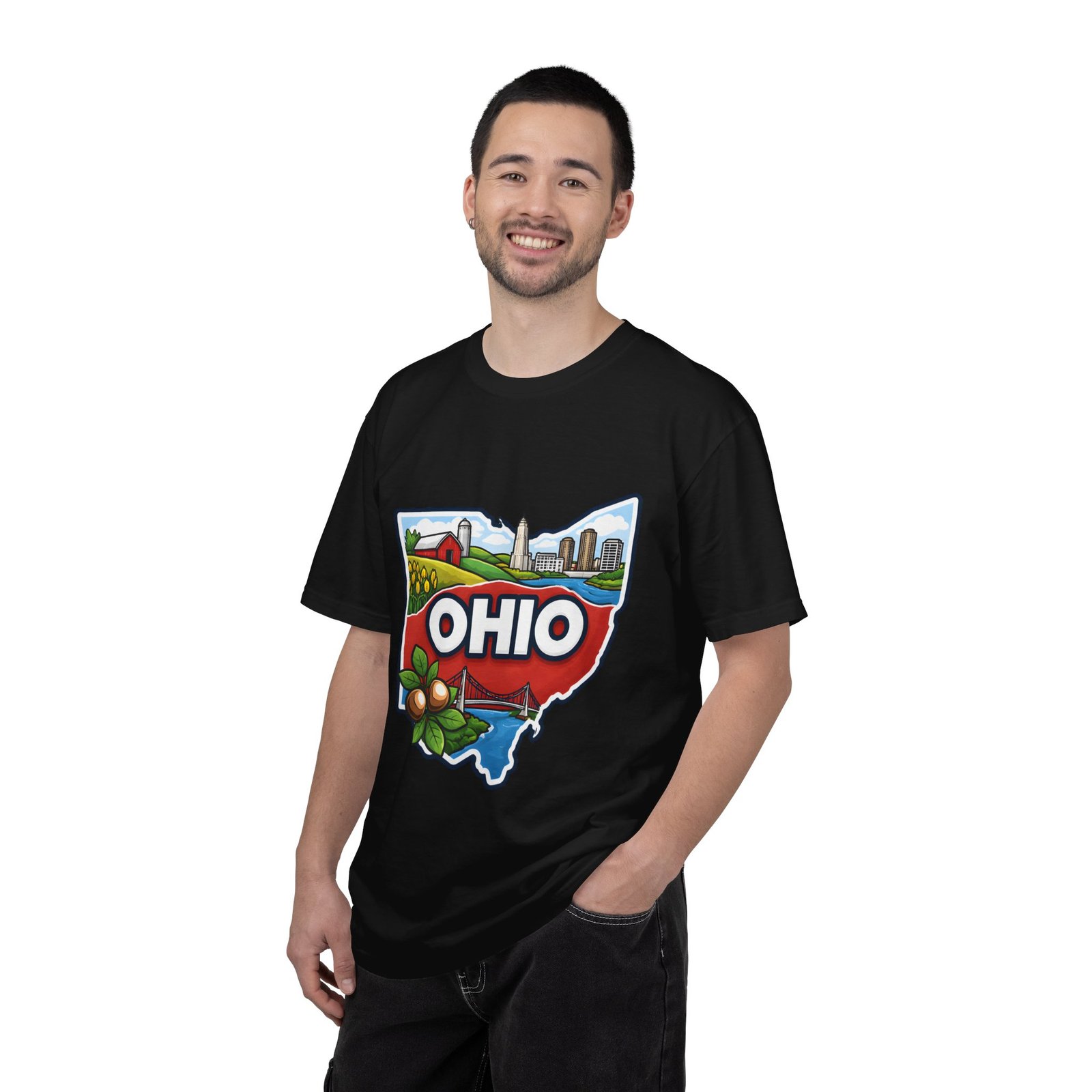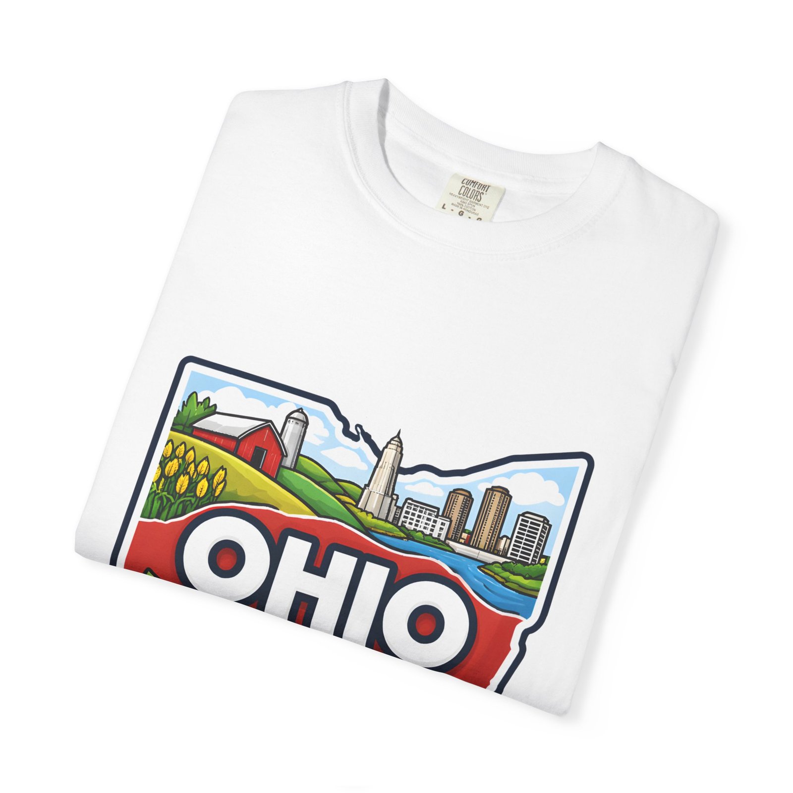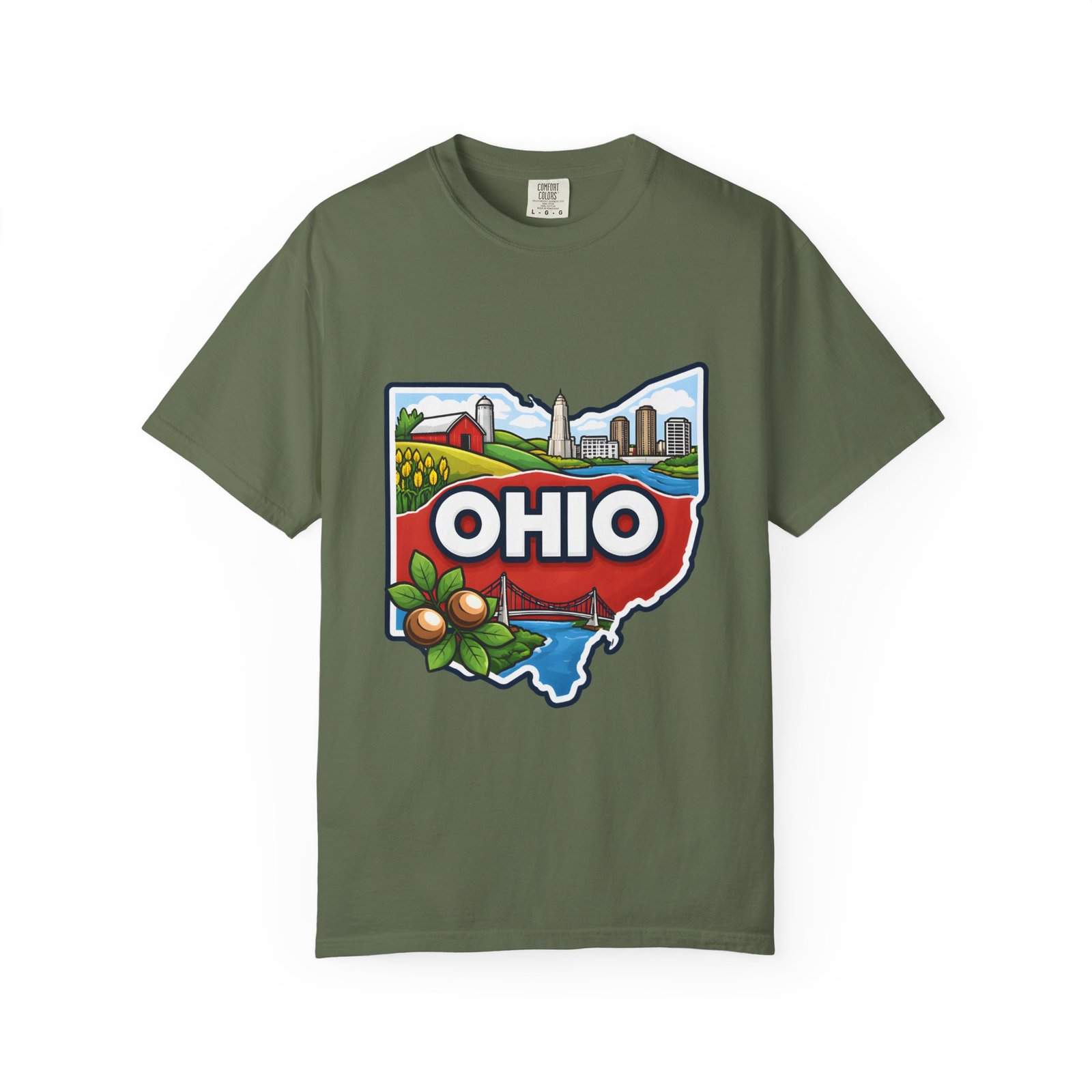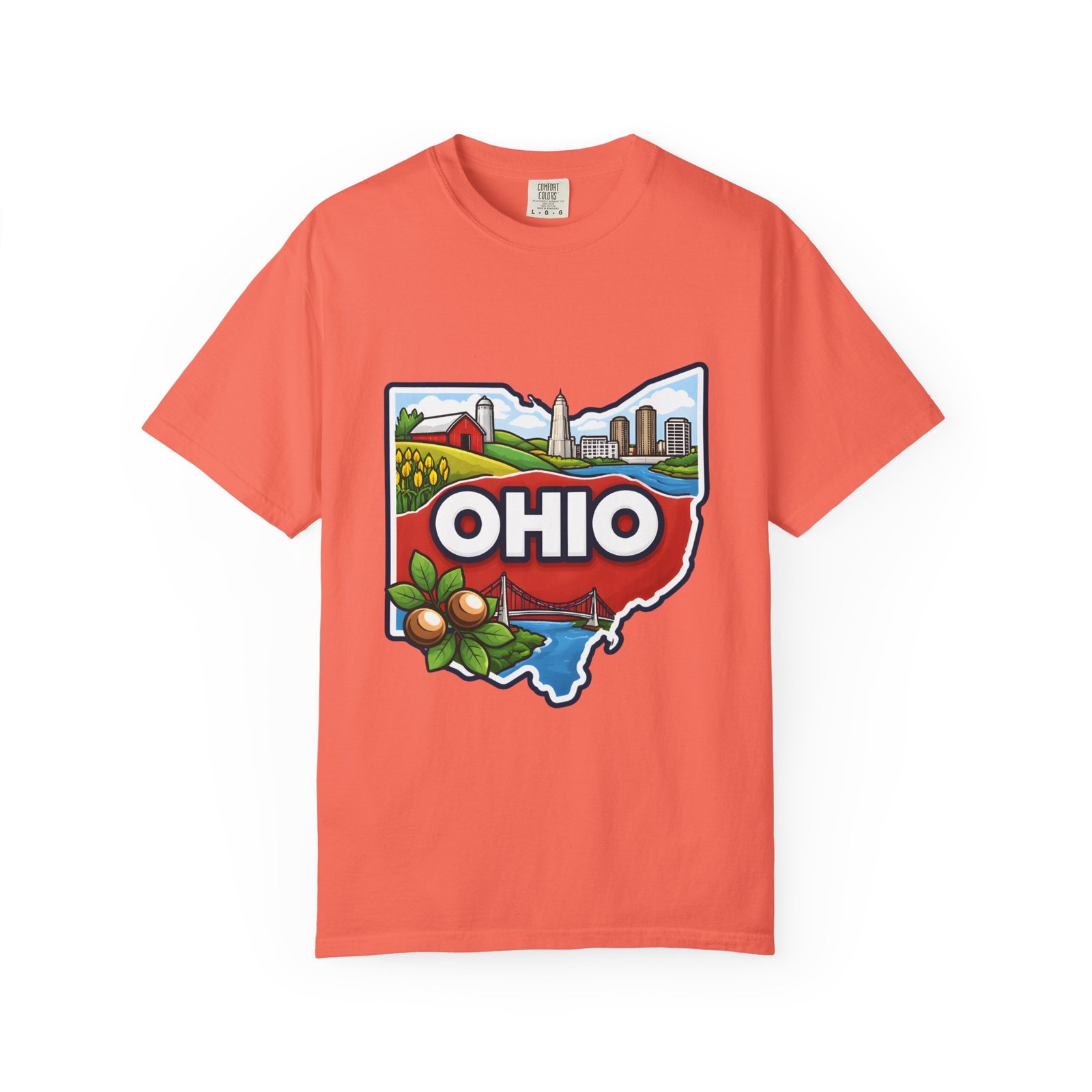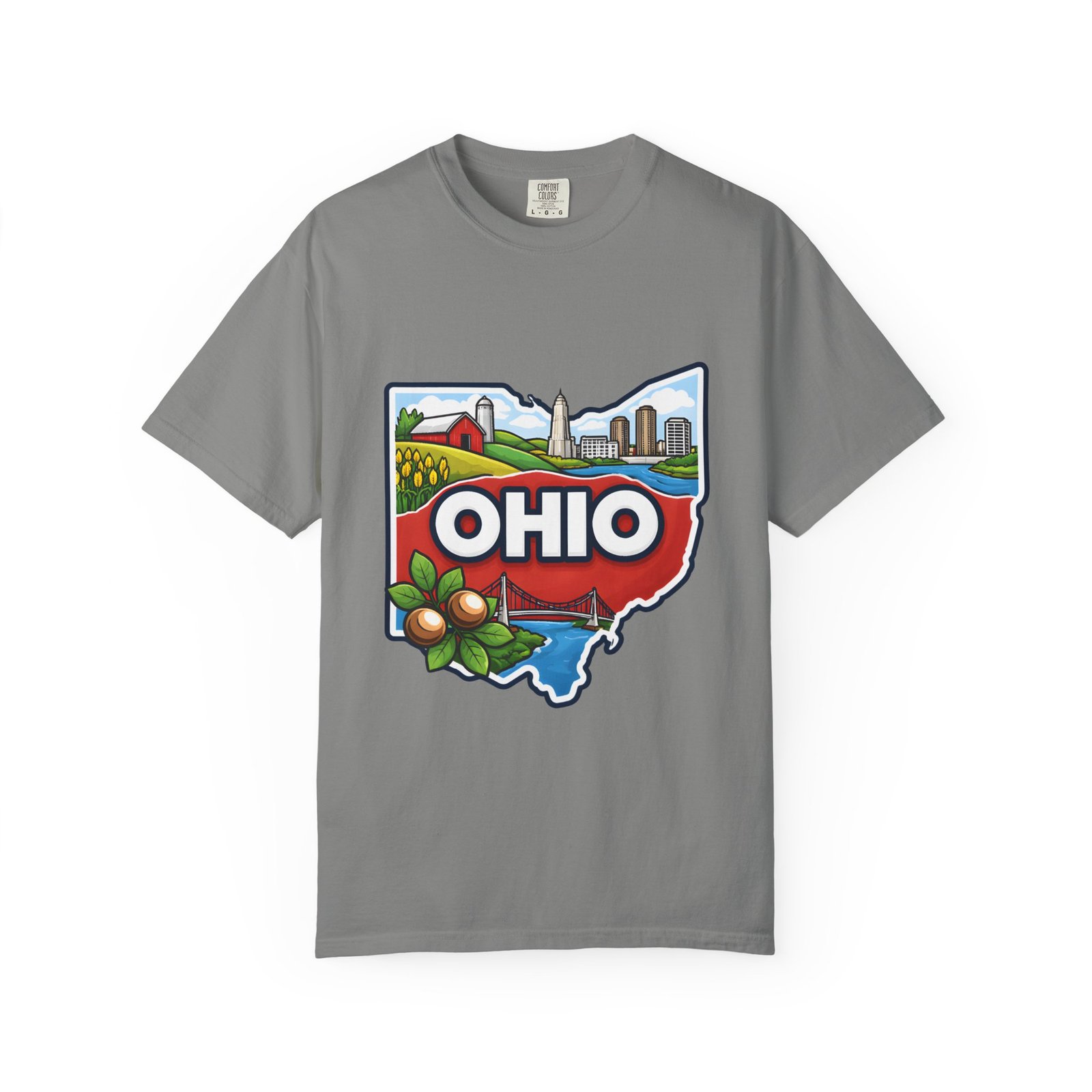 Soft, lived-in comfort meets hometown pride. This garment-dyed tee carries a warm, slightly vintage hand — the cotton relaxes against your skin and the colors mellow with wear. Front artwork maps Ohio in bold, playful colors: city skyline, rolling farmland, a red barn, and seasonal fruit accents. Wear it on weekend drives, farmers’ market mornings, or casual nights with friends. The relaxed fit and heavyweight cotton make it feel durable without stiffening your movement. Over time the fabric and print settle into the rhythms of your days, becoming a favorite layer for cool evenings and sunlit afternoons alike.