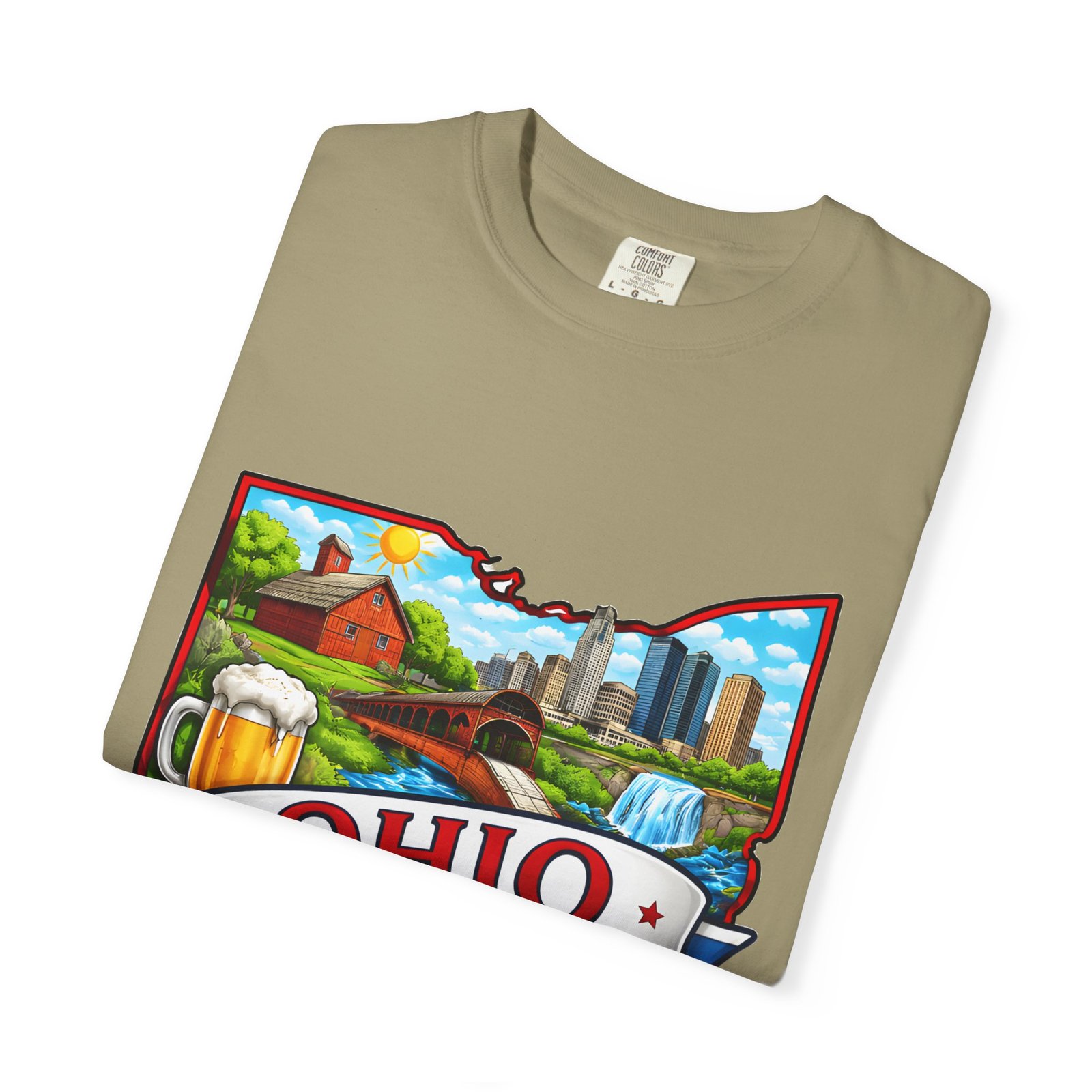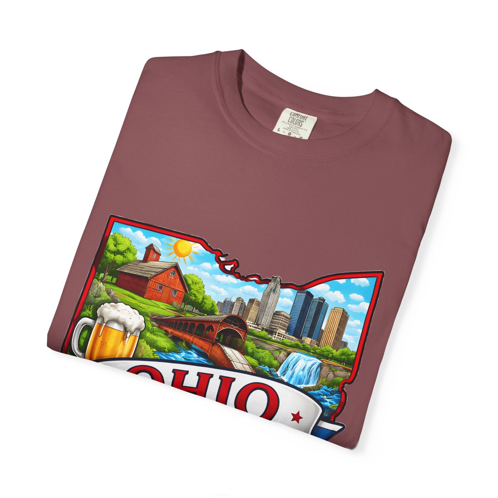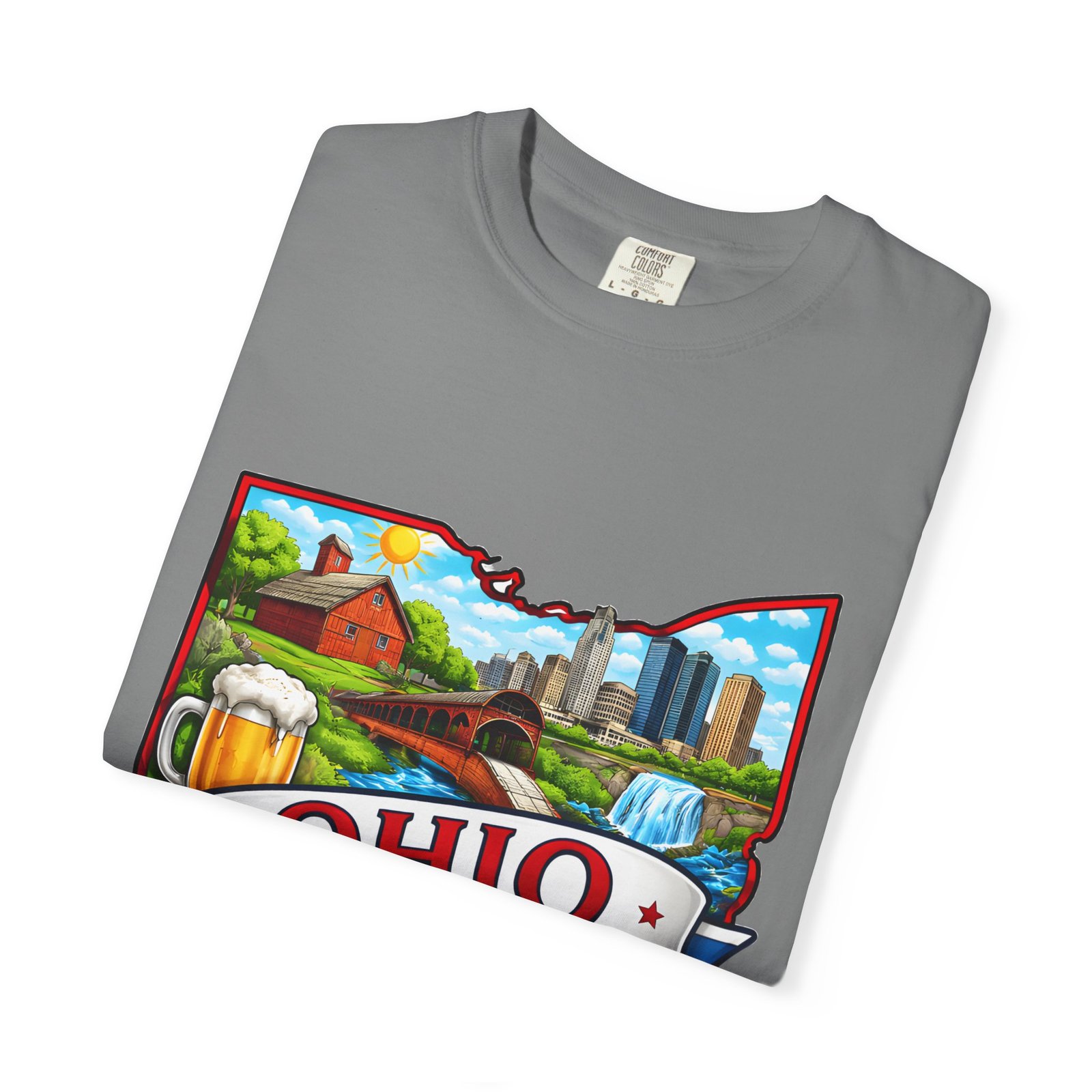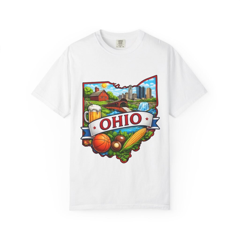 Soft, lived-in comfort meets hometown pride. This heavyweight garment-dyed tee carries a vintage-feel print shaped like Ohio — waterfalls, skyline, farmland, and classic local icons — so wearing it feels like stepping into a memory of summer fairs, tailgates, and river-side afternoons. The relaxed cut and washed-down color give it an easy, broken-in vibe that layers well under a flannel or stands alone when you want to shout your state love without shouting. It settles softly against the skin and holds its shape through repeated wear, making it the kind of shirt you reach for when you want familiar comfort and a little hometown swagger.