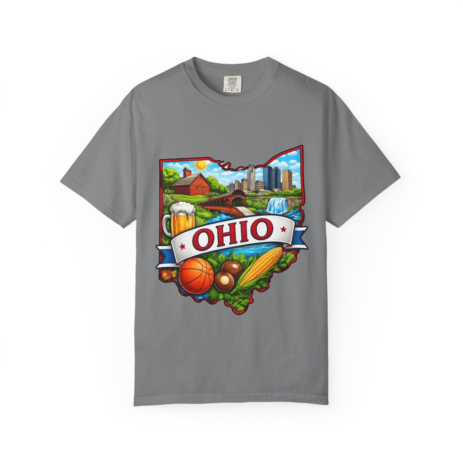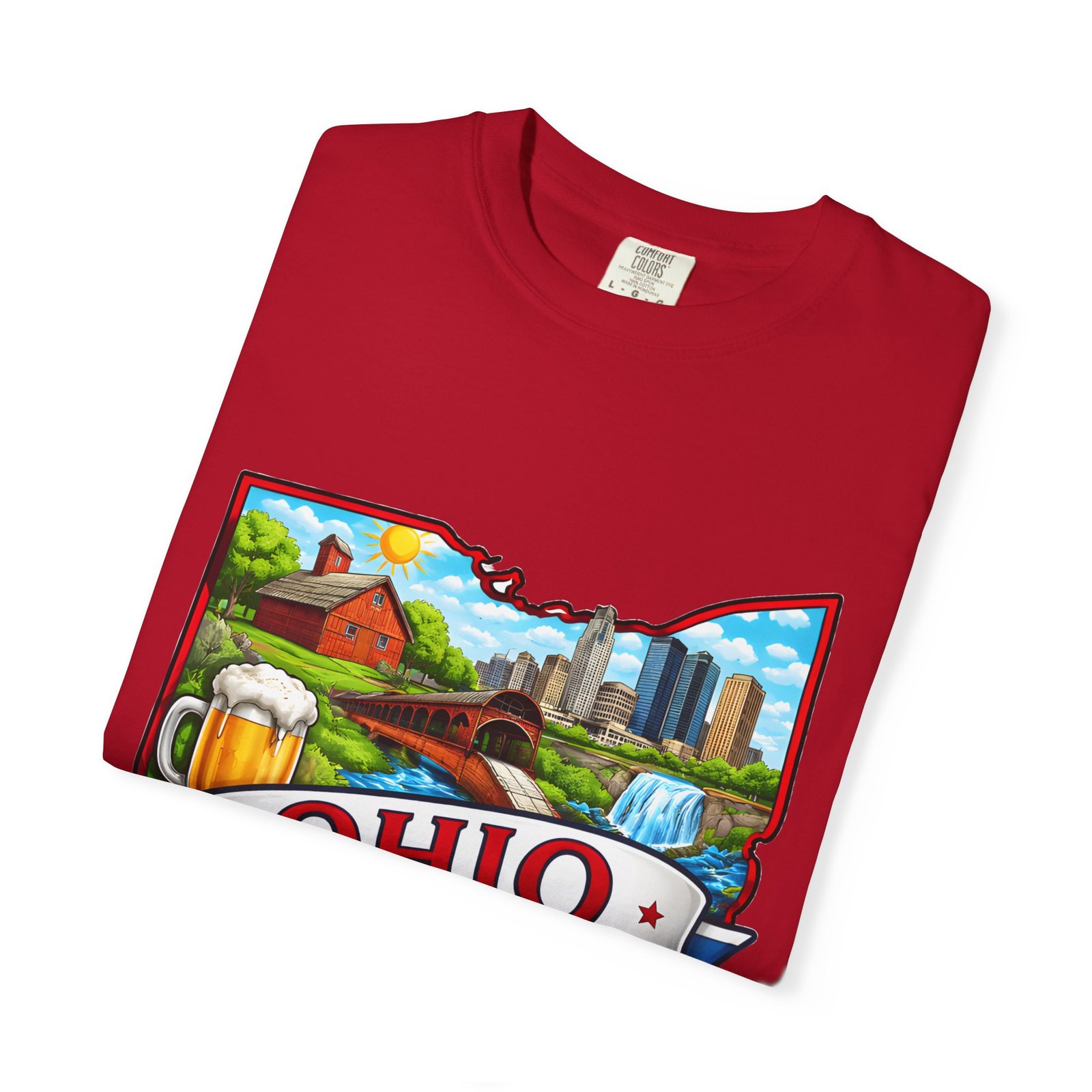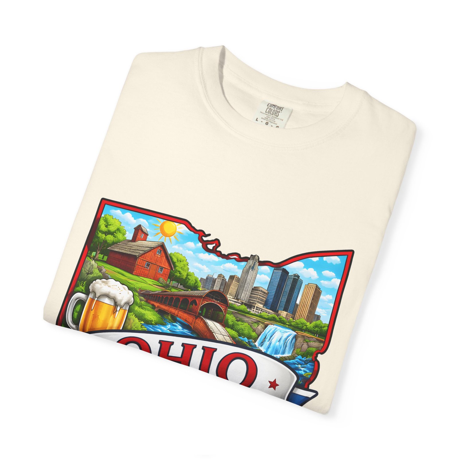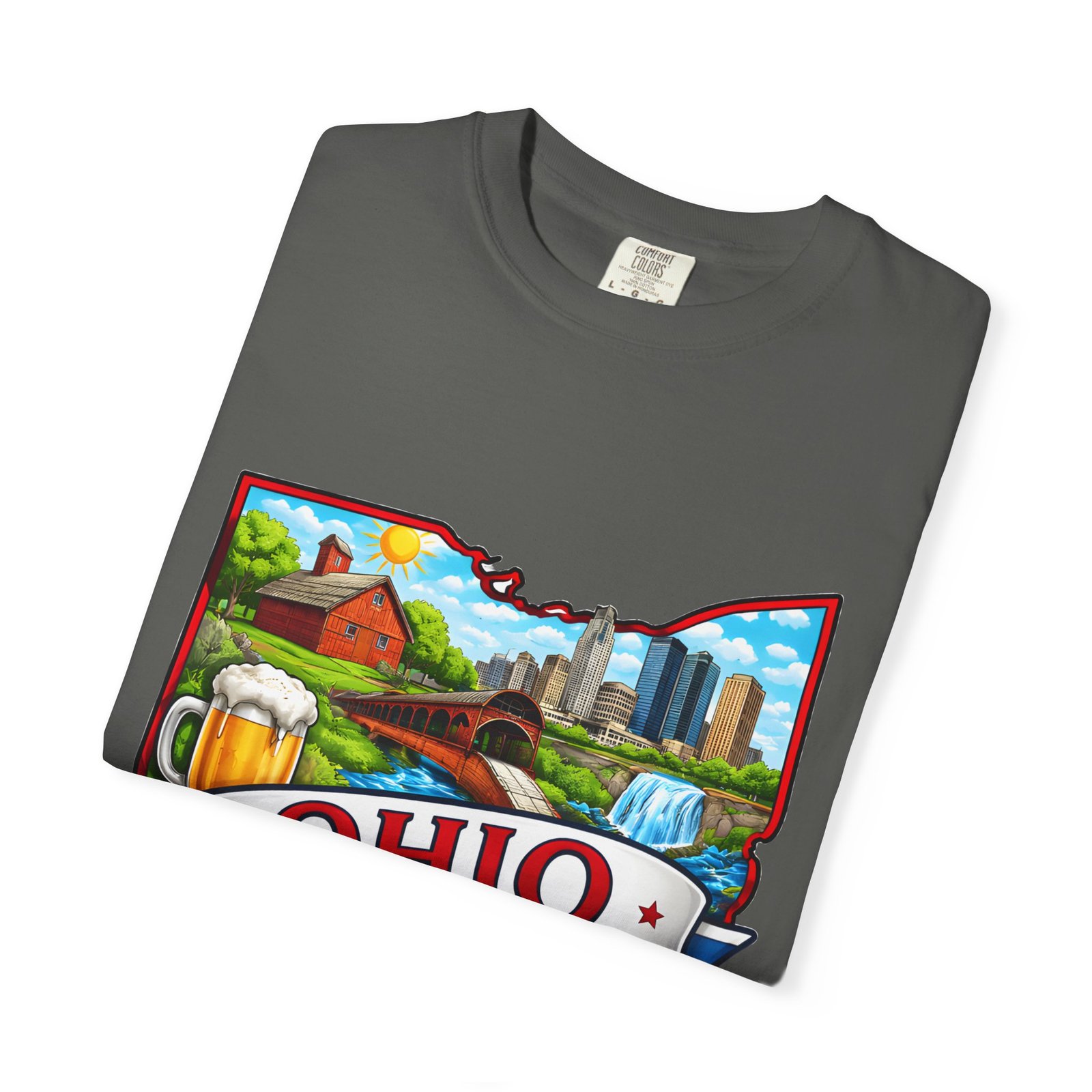 Soft, lived-in comfort meets hometown pride. This heavyweight garment-dyed tee carries a vintage-feel print shaped like Ohio — waterfalls, skyline, farmland, and classic local icons — so wearing it feels like stepping into a memory of summer fairs, tailgates, and river-side afternoons. The relaxed cut and washed-down color give it an easy, broken-in vibe that layers well under a flannel or stands alone when you want to shout your state love without shouting. It settles softly against the skin and holds its shape through repeated wear, making it the kind of shirt you reach for when you want familiar comfort and a little hometown swagger.