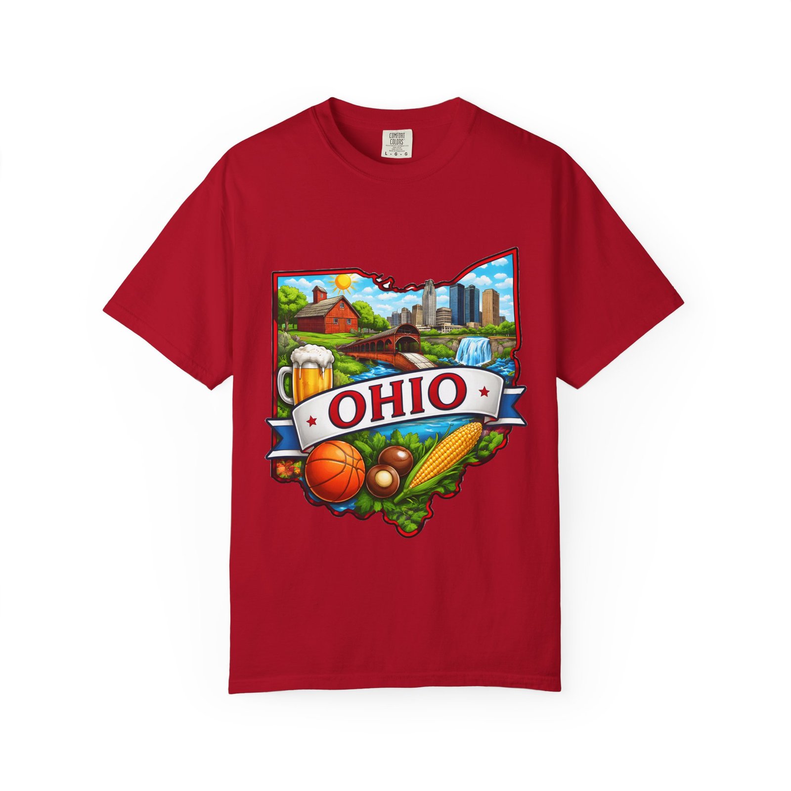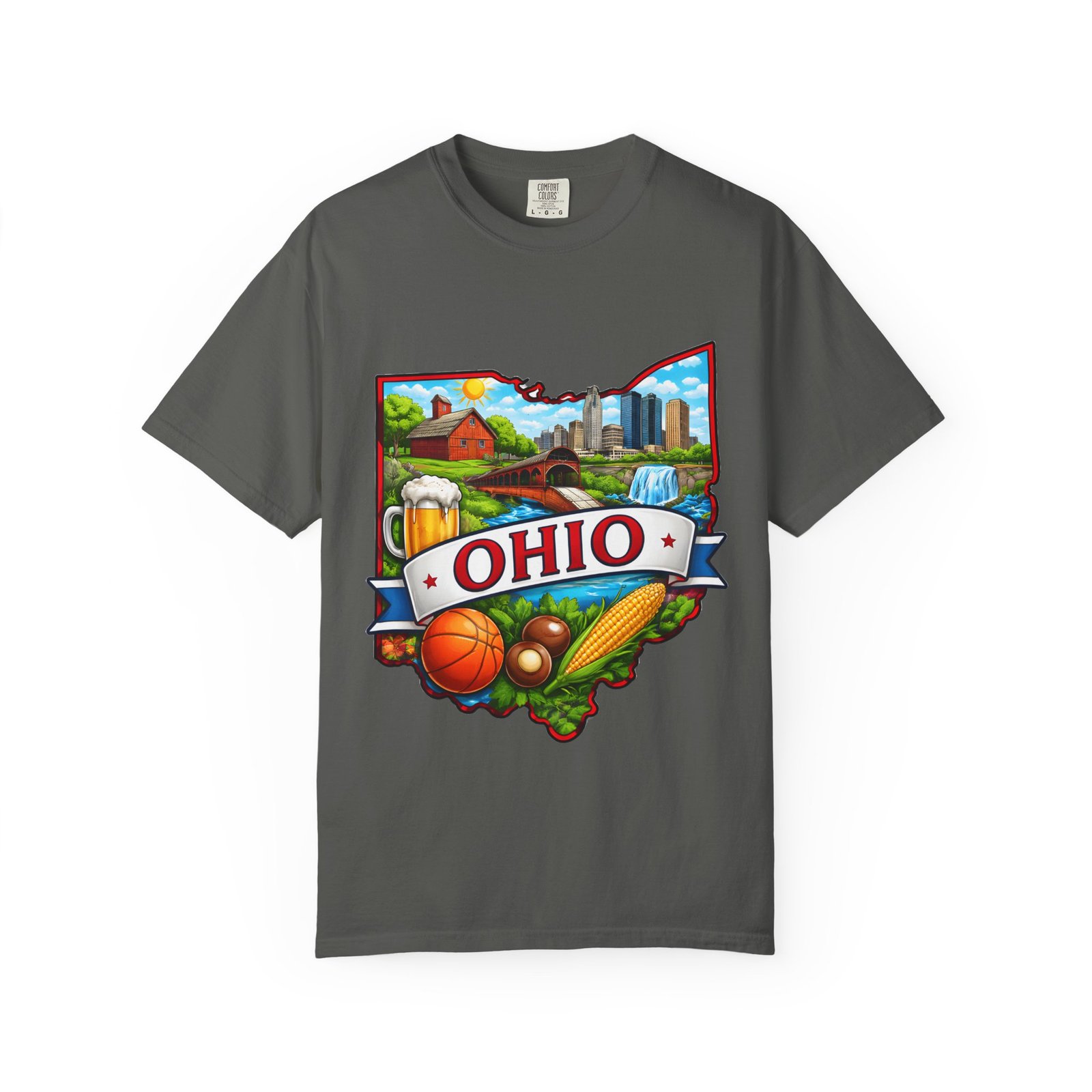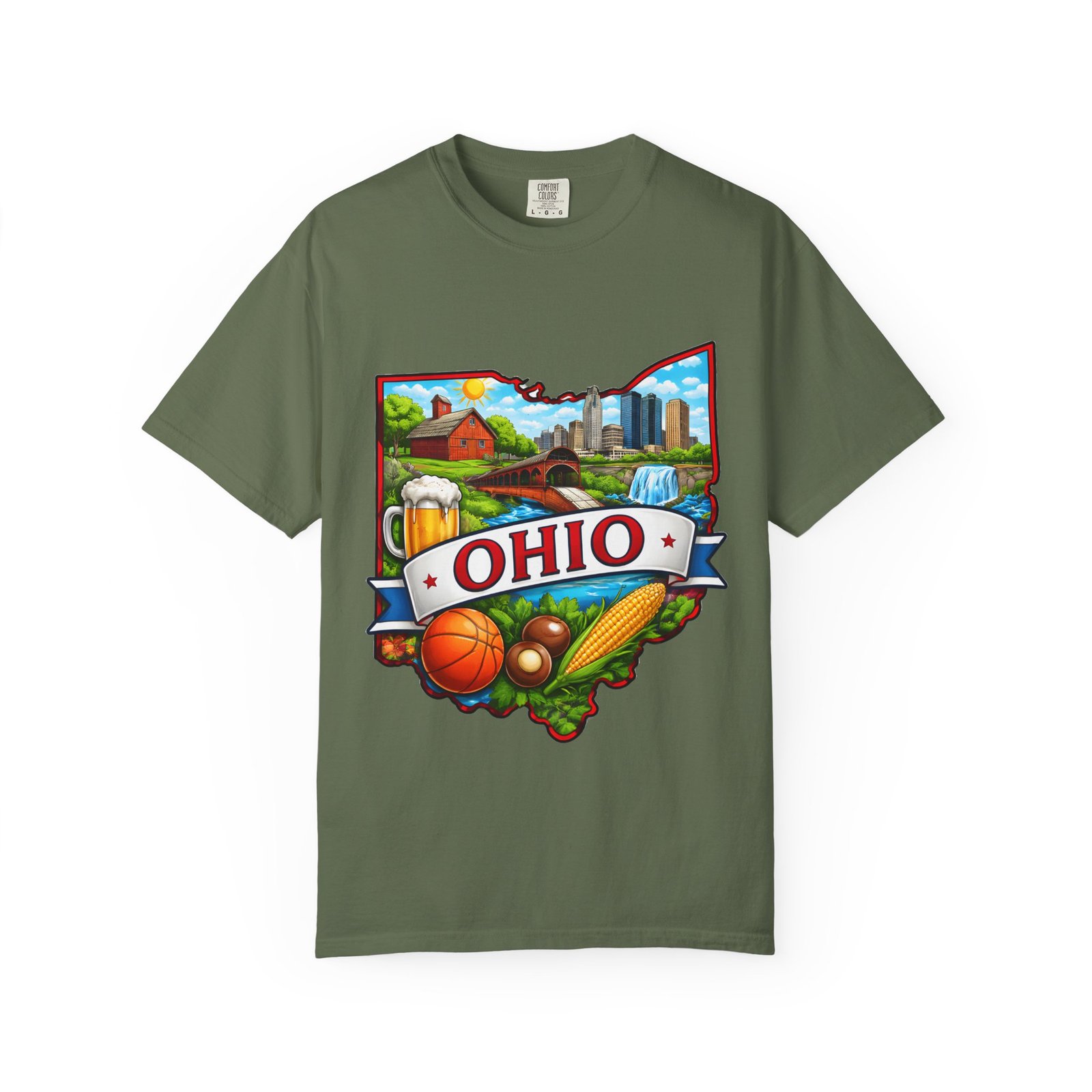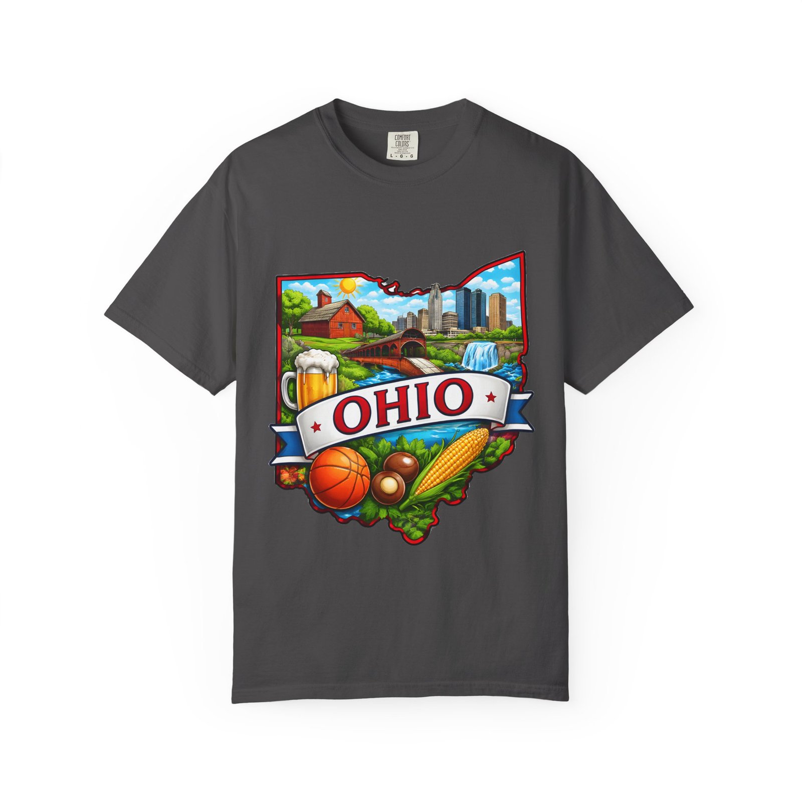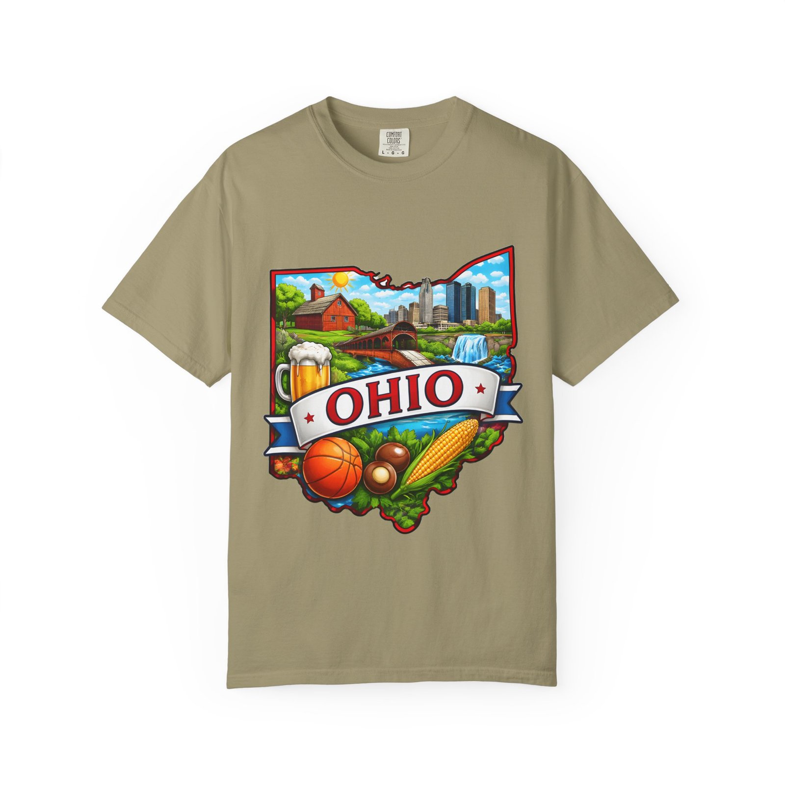 Soft, lived-in comfort meets hometown pride. This heavyweight garment-dyed tee carries a vintage-feel print shaped like Ohio — waterfalls, skyline, farmland, and classic local icons — so wearing it feels like stepping into a memory of summer fairs, tailgates, and river-side afternoons. The relaxed cut and washed-down color give it an easy, broken-in vibe that layers well under a flannel or stands alone when you want to shout your state love without shouting. It settles softly against the skin and holds its shape through repeated wear, making it the kind of shirt you reach for when you want familiar comfort and a little hometown swagger.