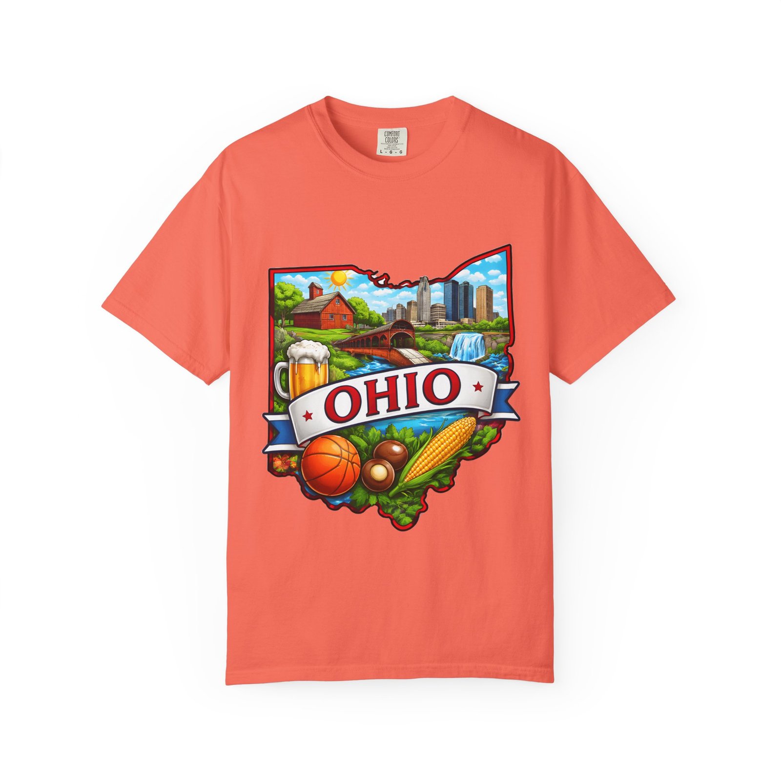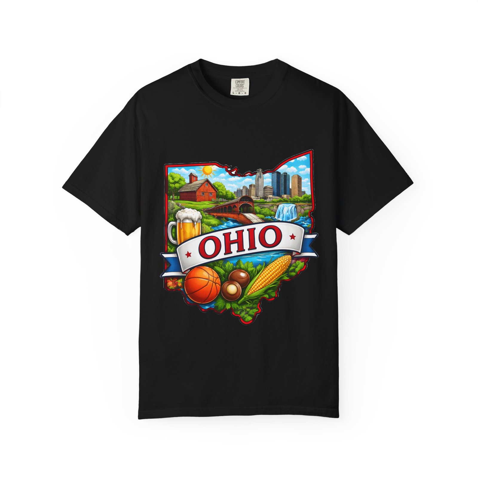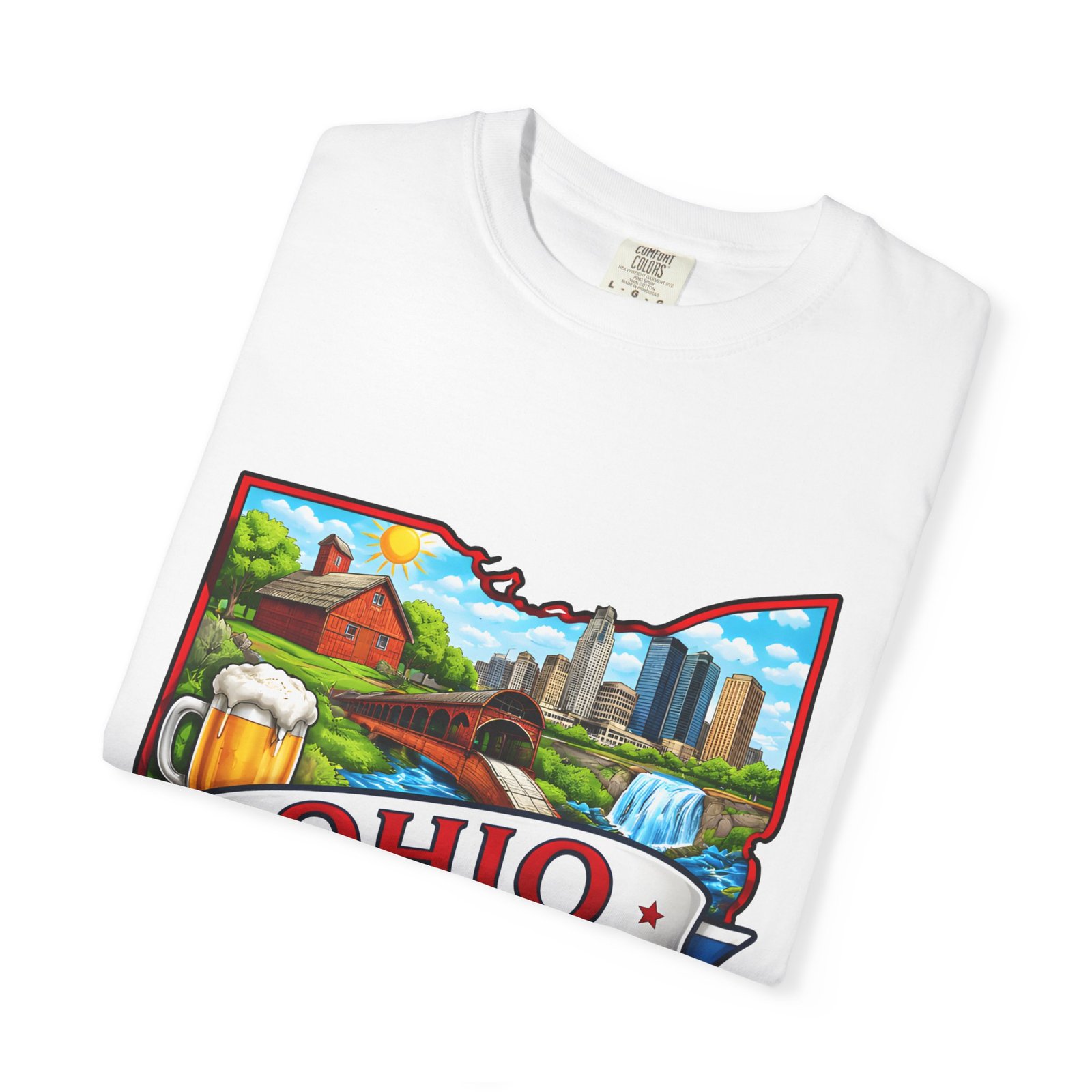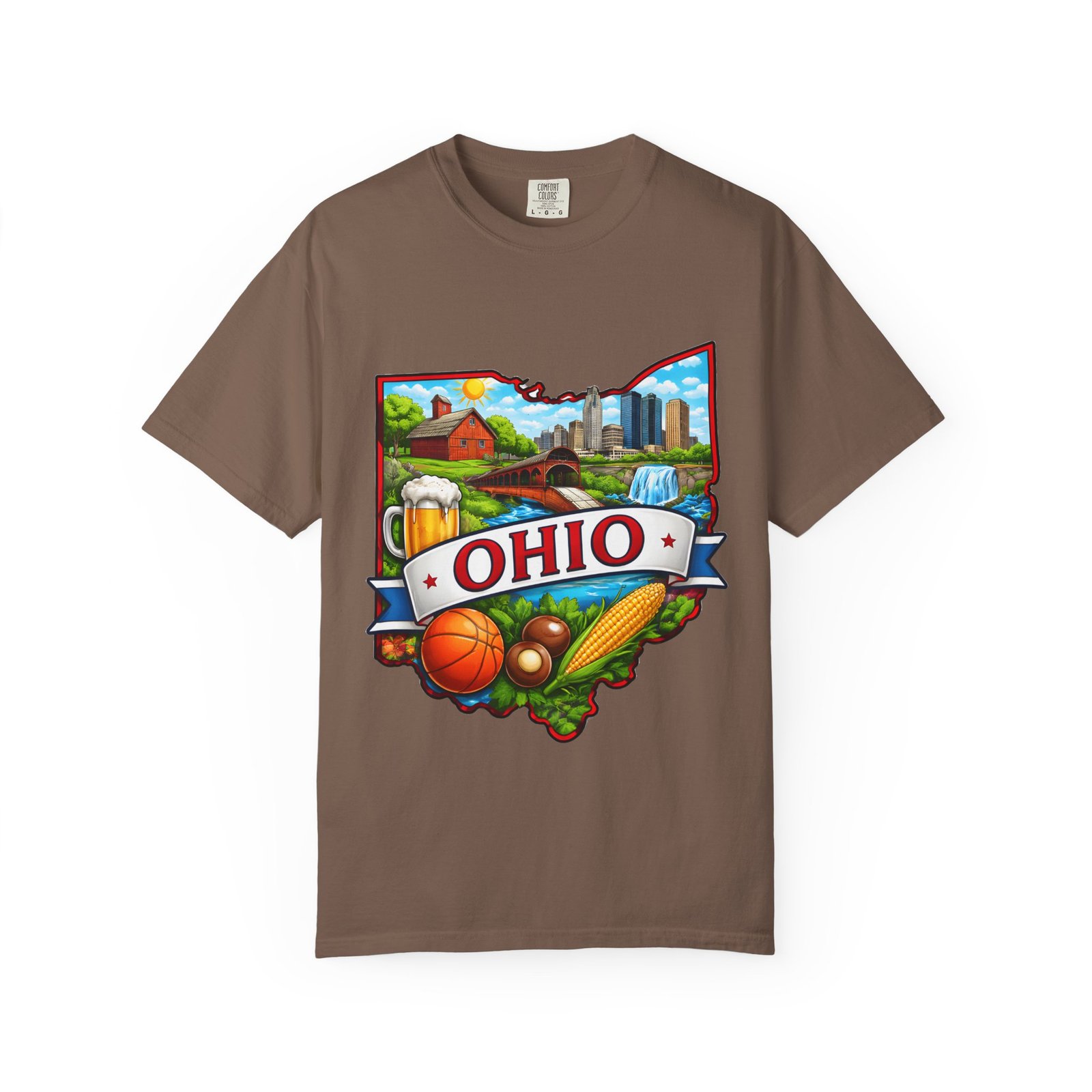 Soft, lived-in comfort meets hometown pride. This heavyweight garment-dyed tee carries a vintage-feel print shaped like Ohio — waterfalls, skyline, farmland, and classic local icons — so wearing it feels like stepping into a memory of summer fairs, tailgates, and river-side afternoons. The relaxed cut and washed-down color give it an easy, broken-in vibe that layers well under a flannel or stands alone when you want to shout your state love without shouting. It settles softly against the skin and holds its shape through repeated wear, making it the kind of shirt you reach for when you want familiar comfort and a little hometown swagger.