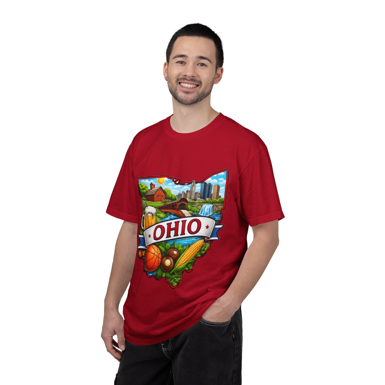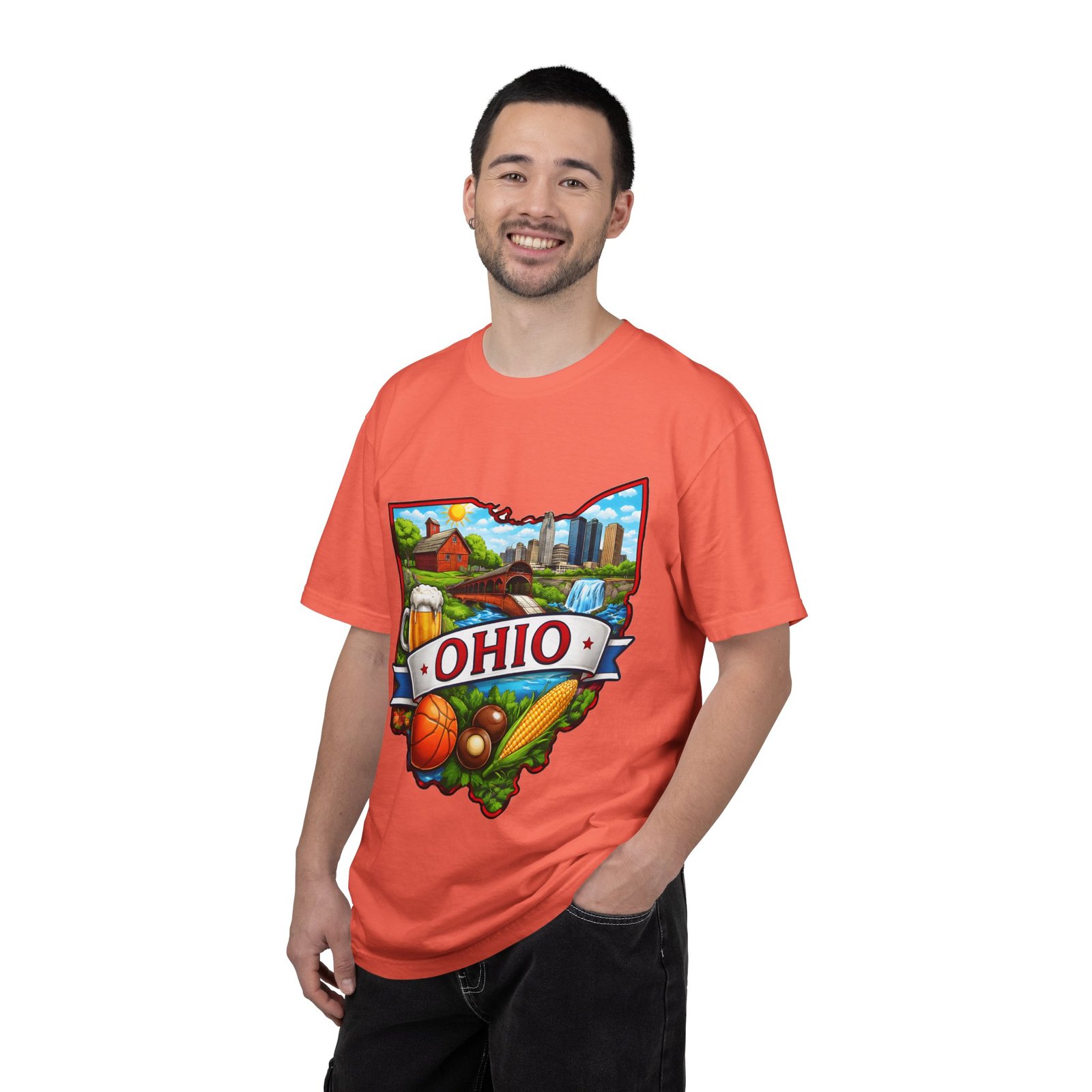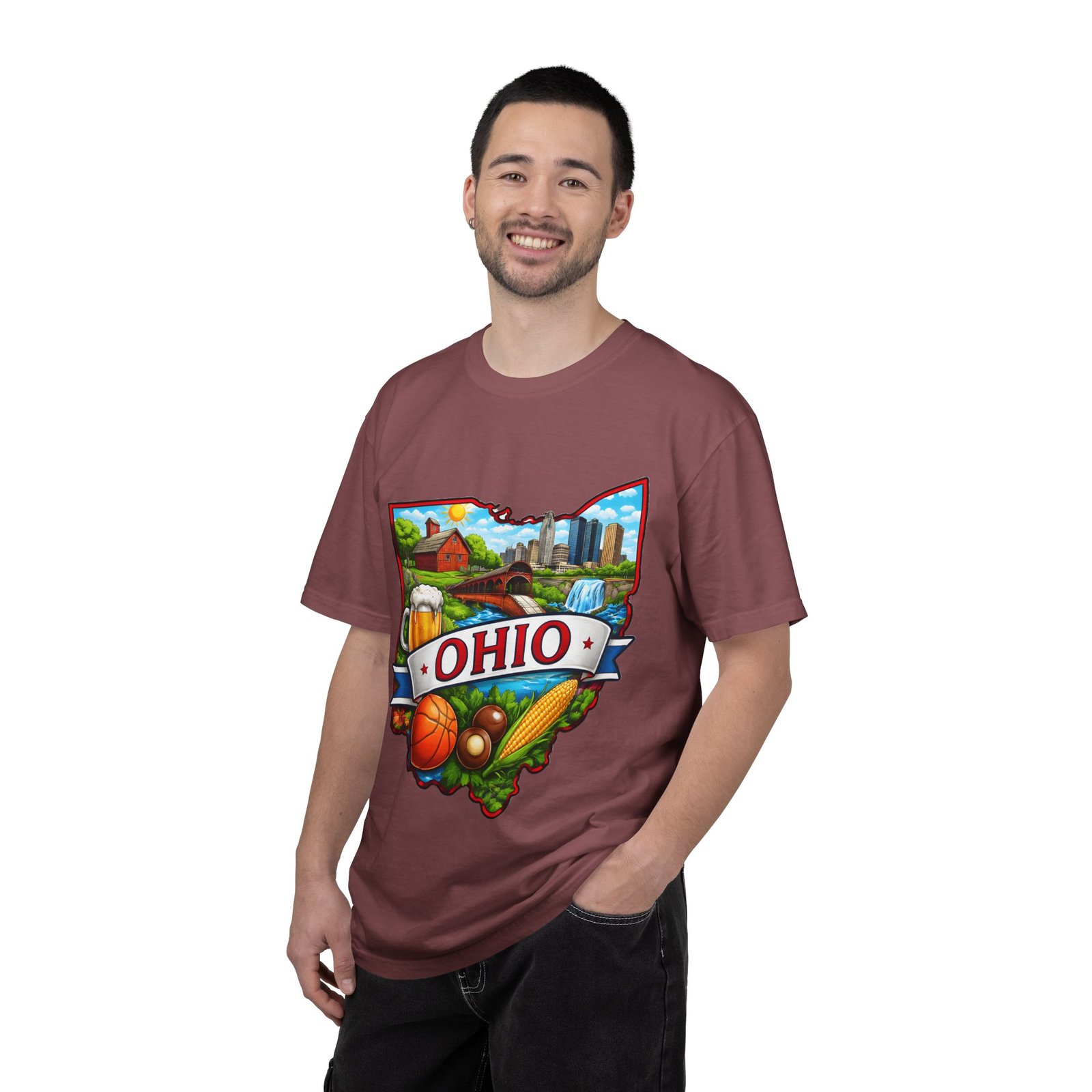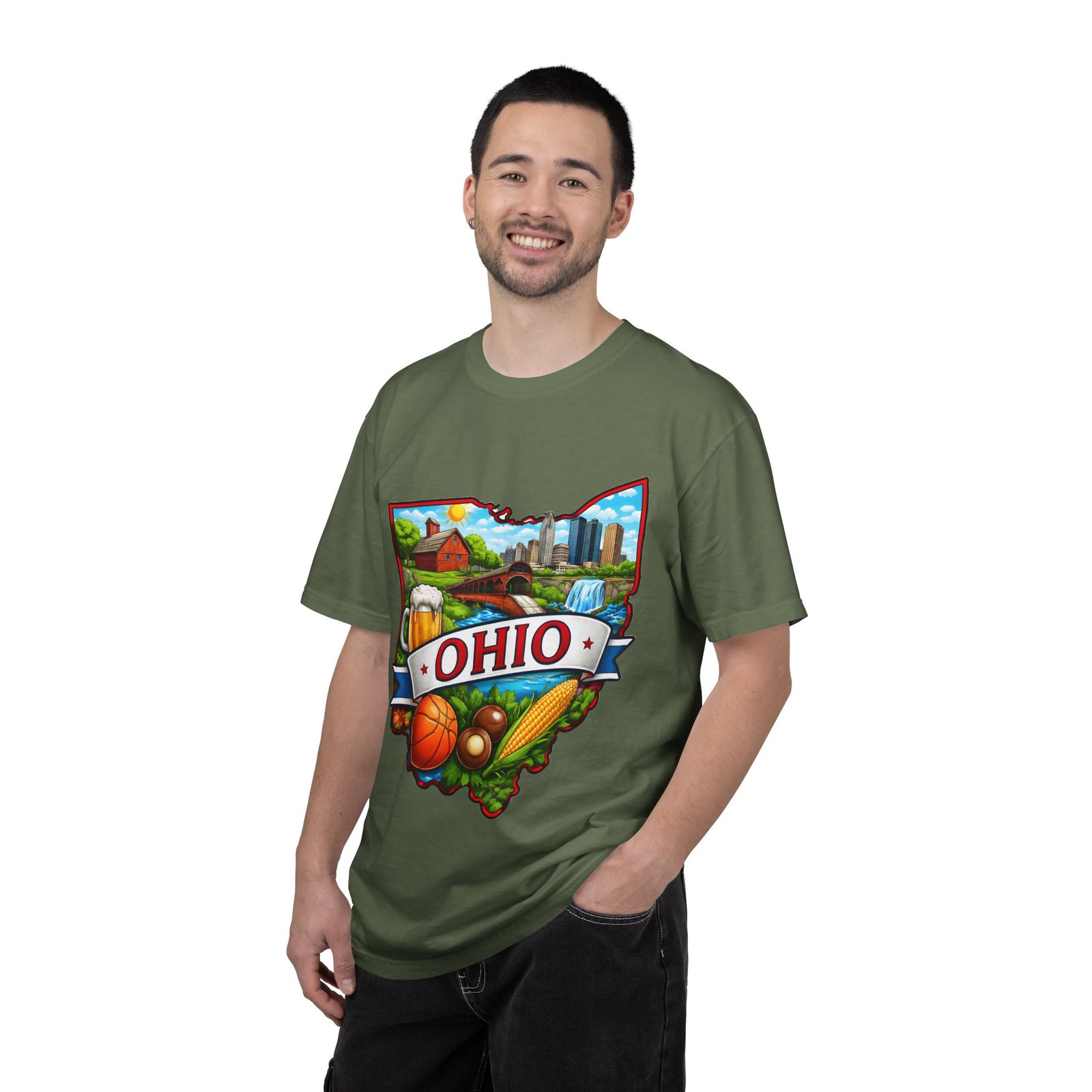 Soft, lived-in comfort meets hometown pride. This heavyweight garment-dyed tee carries a vintage-feel print shaped like Ohio — waterfalls, skyline, farmland, and classic local icons — so wearing it feels like stepping into a memory of summer fairs, tailgates, and river-side afternoons. The relaxed cut and washed-down color give it an easy, broken-in vibe that layers well under a flannel or stands alone when you want to shout your state love without shouting. It settles softly against the skin and holds its shape through repeated wear, making it the kind of shirt you reach for when you want familiar comfort and a little hometown swagger.
