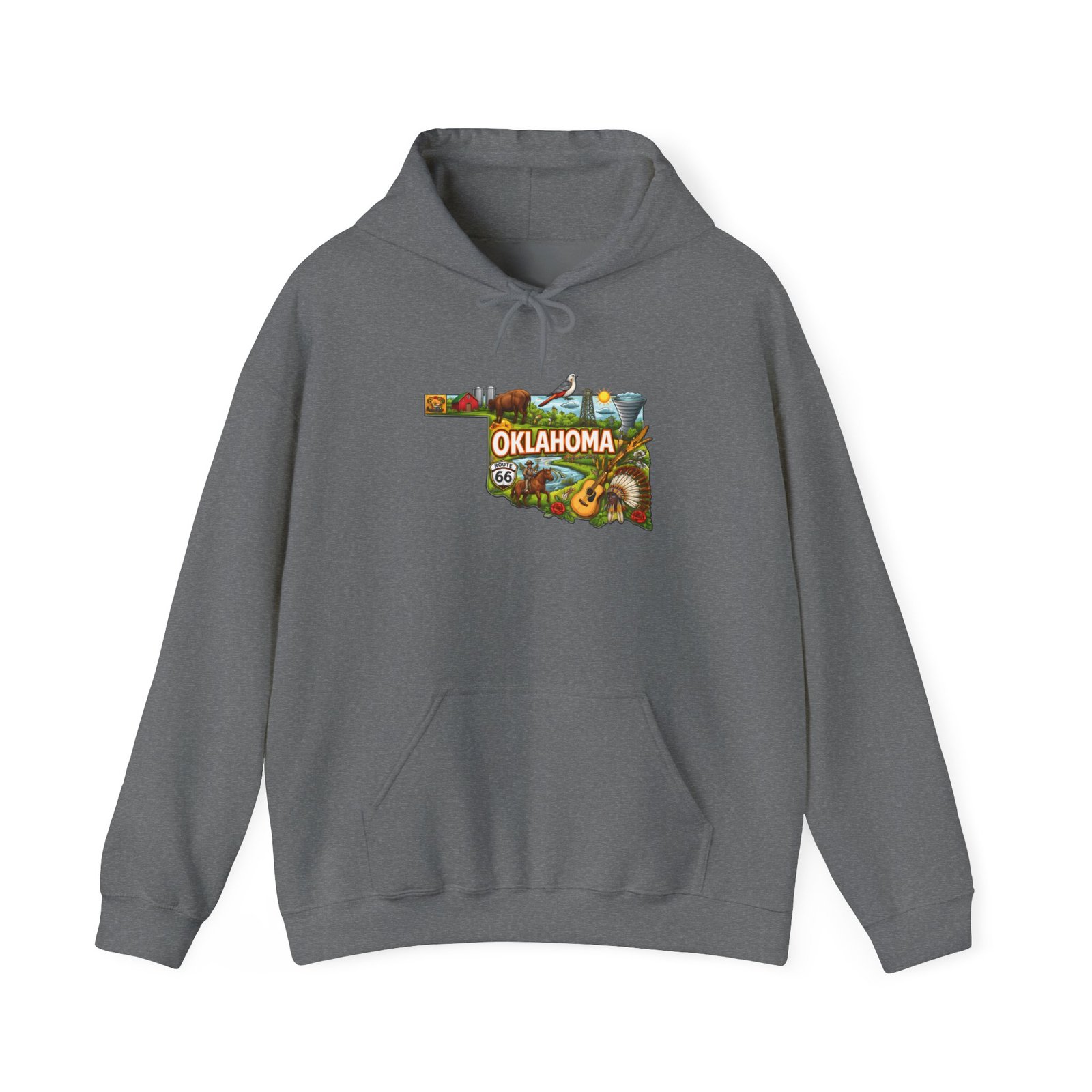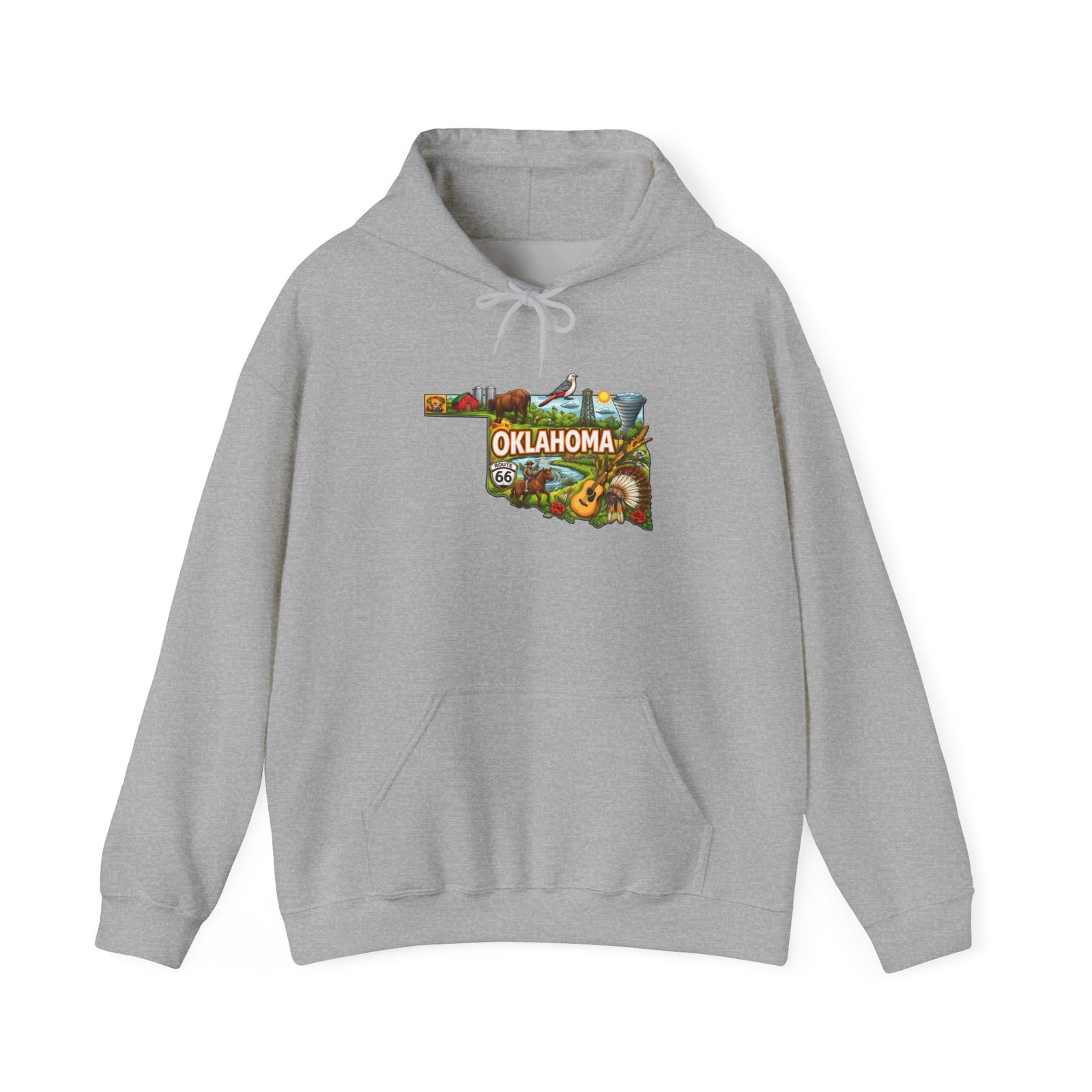 This cozy hooded sweatshirt wears Oklahoma like a warm memory. Soft, medium-heavy fabric and a roomy kangaroo pocket make it a go-to for chilly mornings, late-night drives, and weekend field trips. The front artwork—shaped like the state and filled with sunlit prairie scenes and wildflowers—feels both nostalgic and alive. It settles easily over jeans or layered under a jacket, carrying a quiet pride for wide skies and open roads. The drawstring hood and double-lined construction add comfort and durability, while optional embroidery or vivid DTF sleeve details let you personalize it without losing that lived-in, hometown vibe.