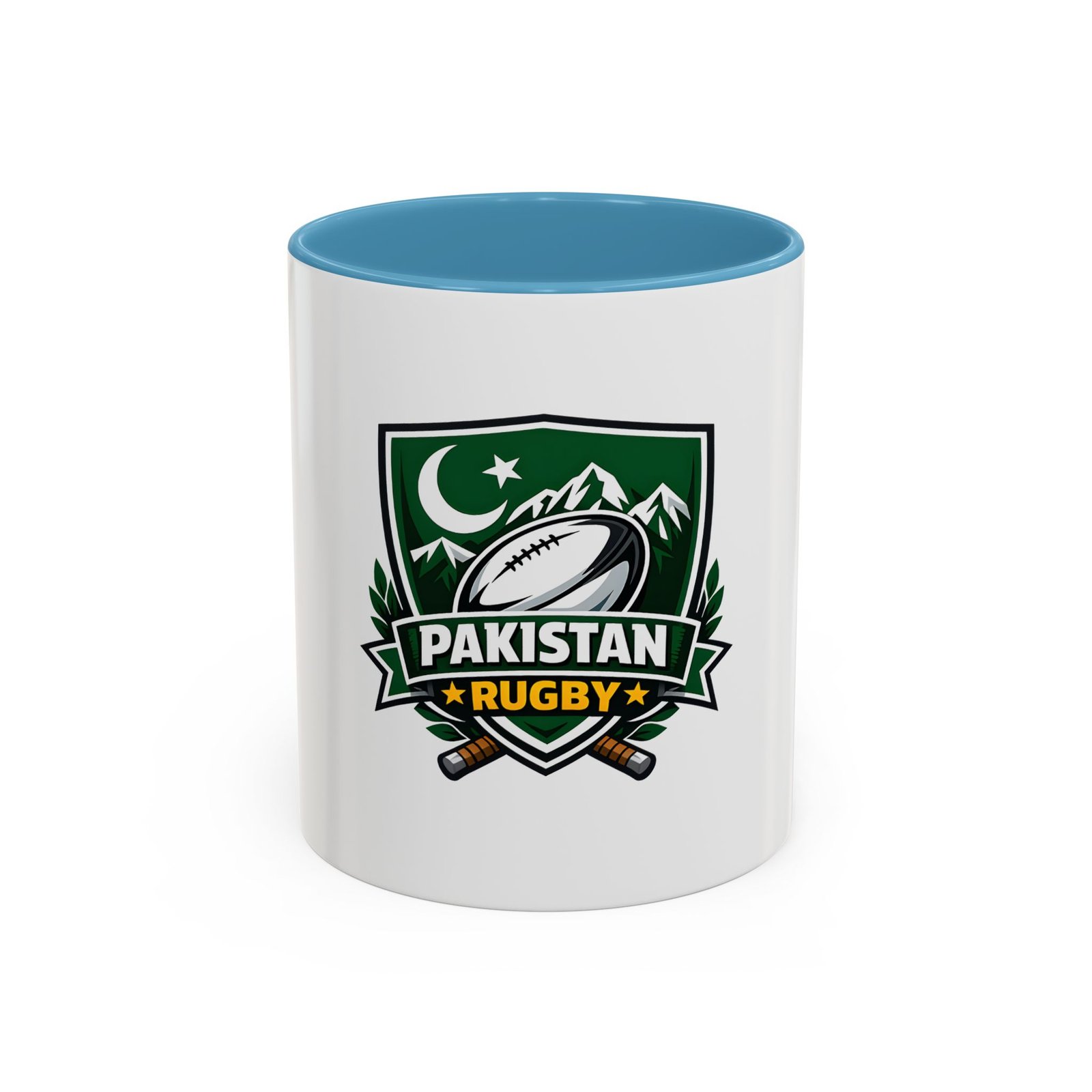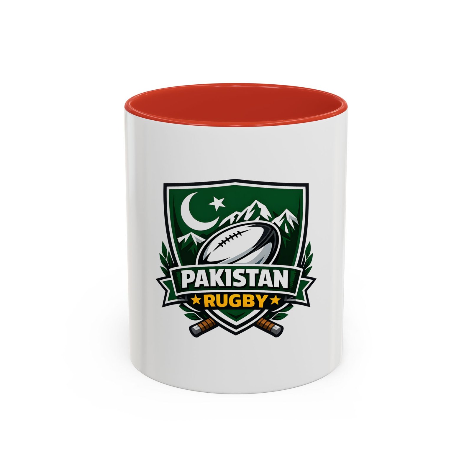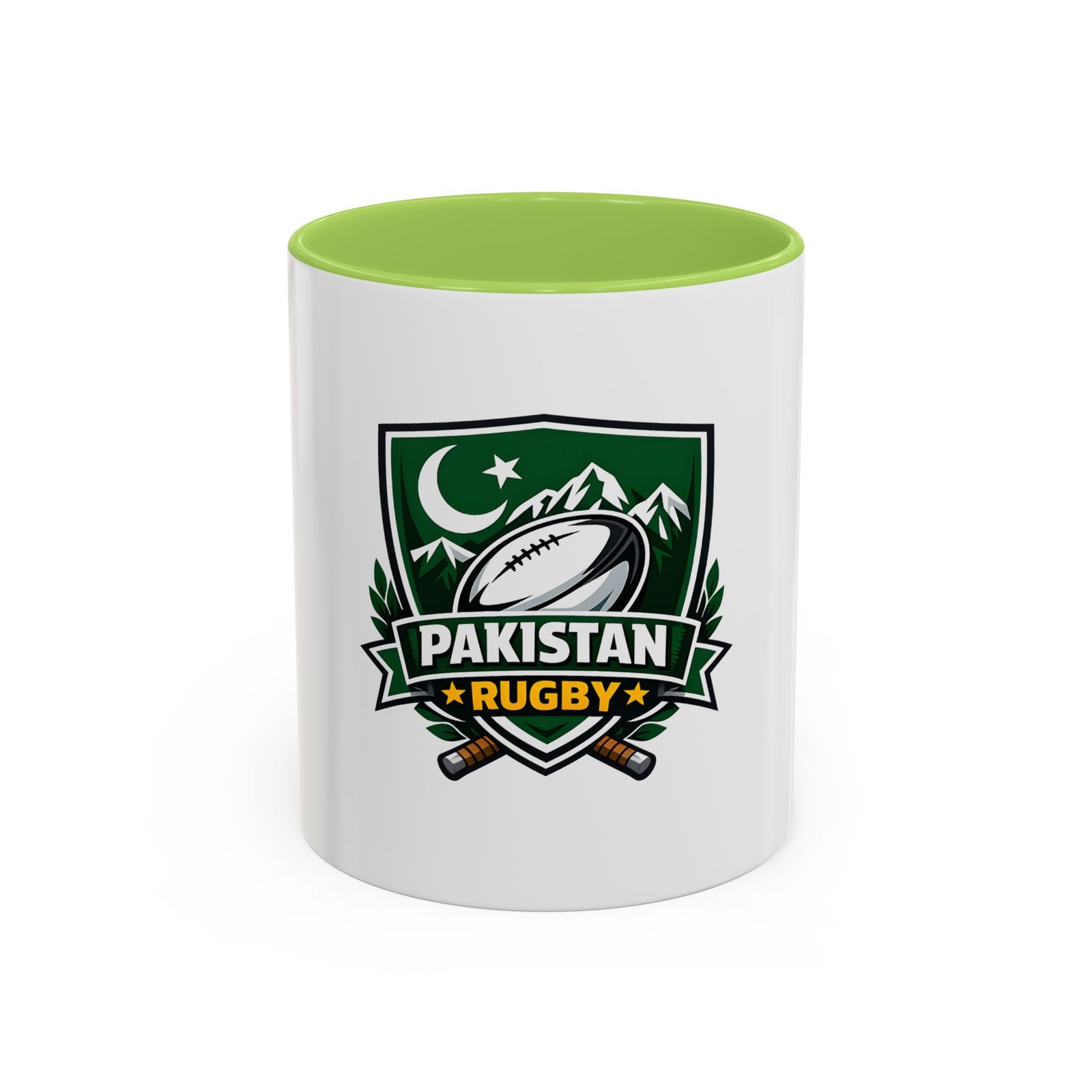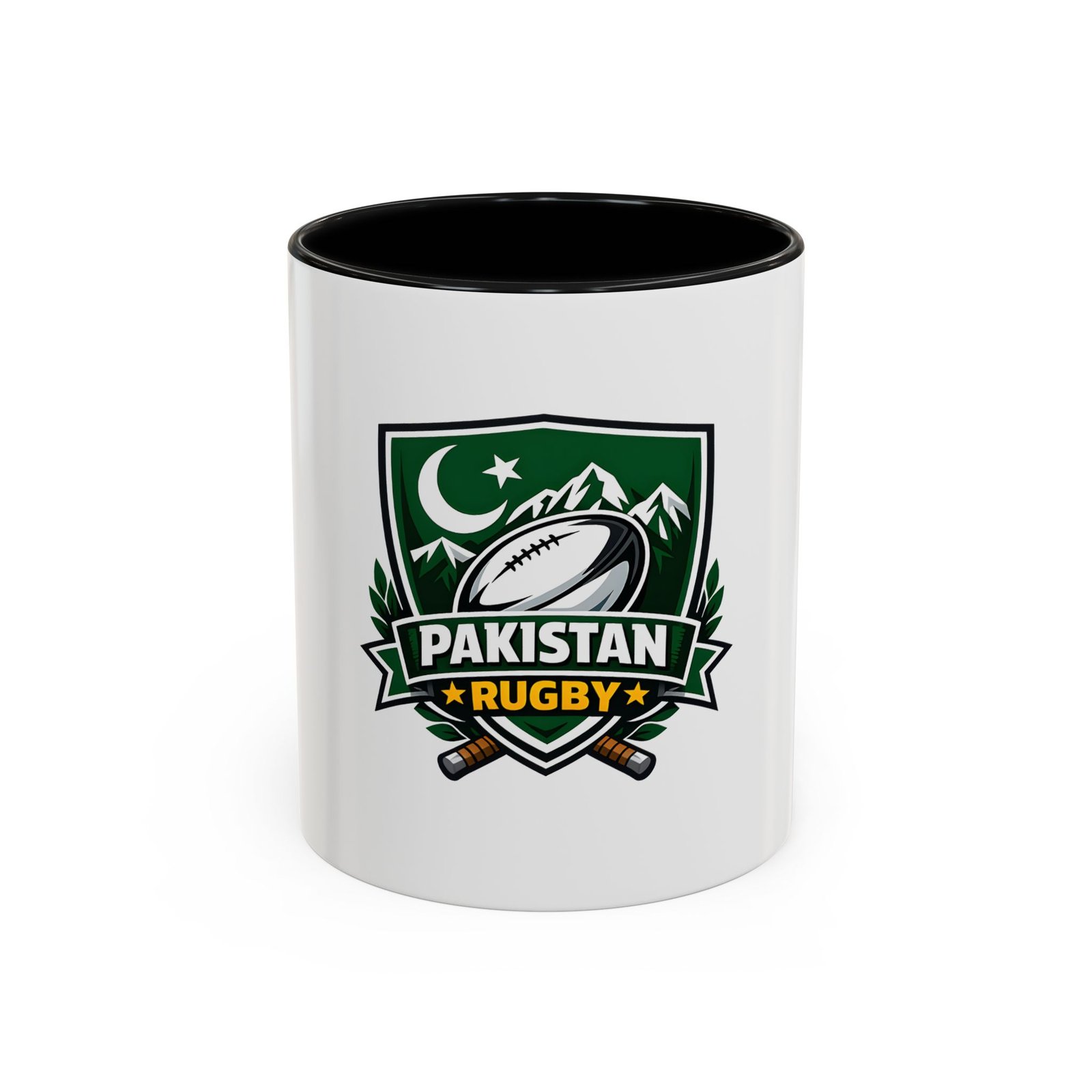 Start your day with a bold nod to the green and white. This ceramic accent mug brings Pakistan rugby spirit to your morning coffee or late-night tea. The emblem — a rugby ball framed by mountains, crescent, and crossed goalposts — feels like a rallying cry: quiet pride, team grit, and a love of the game. Bright, crisp printing on glossy white ceramic highlights the dark-green crest, while the colored interior and handle add a punch of contrast every time you lift it. It’s comfortable to hold, easy to clean, and built to handle everyday use at home, in the club lounge, or tucked into a player’s gear bag between training sessions.