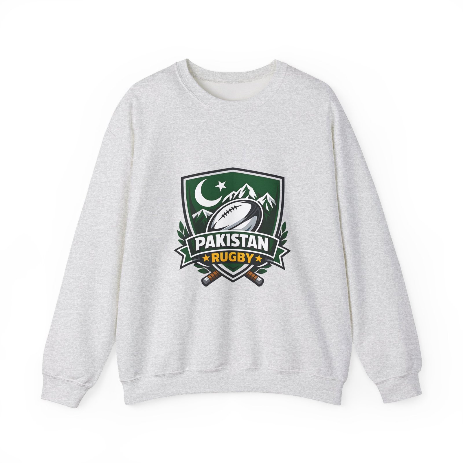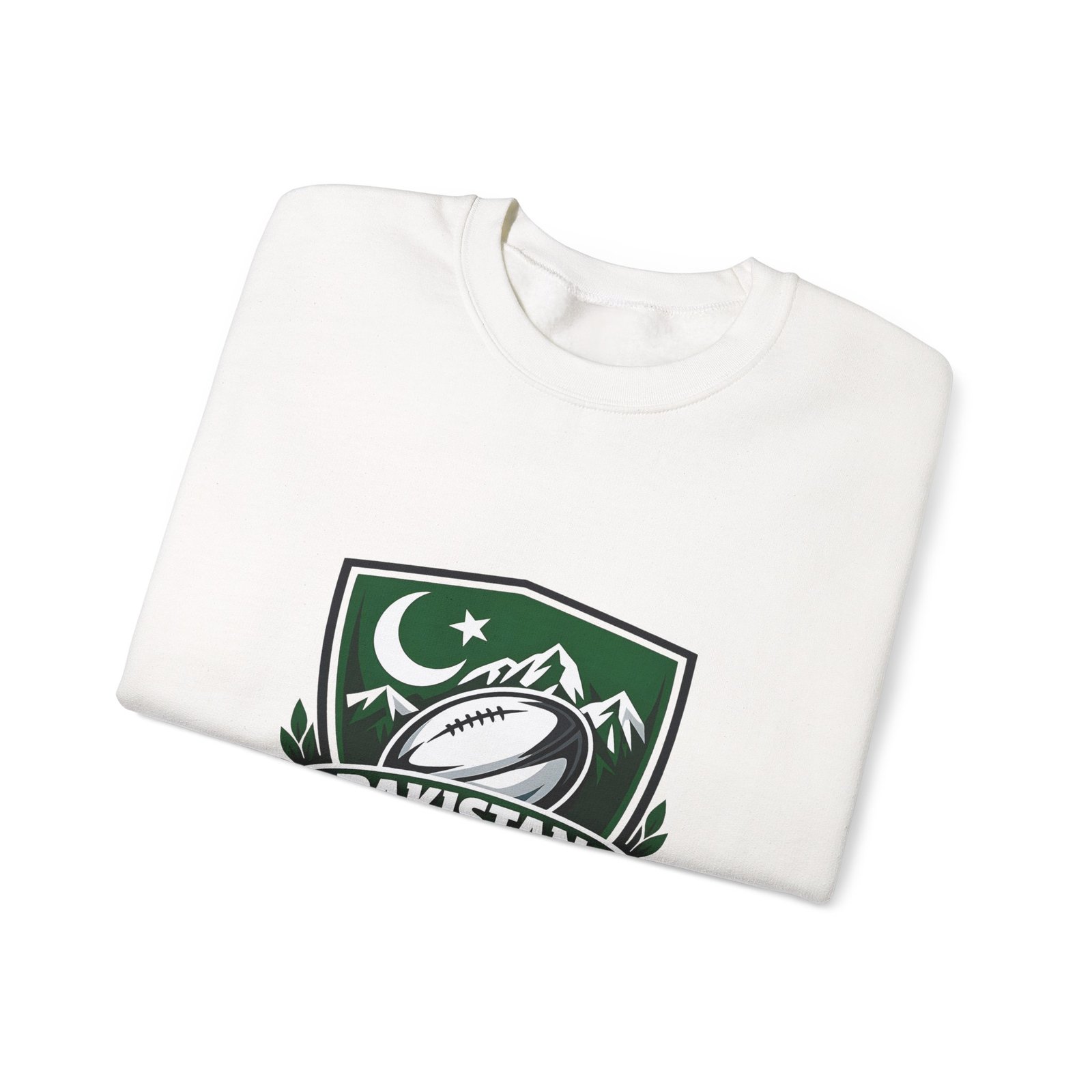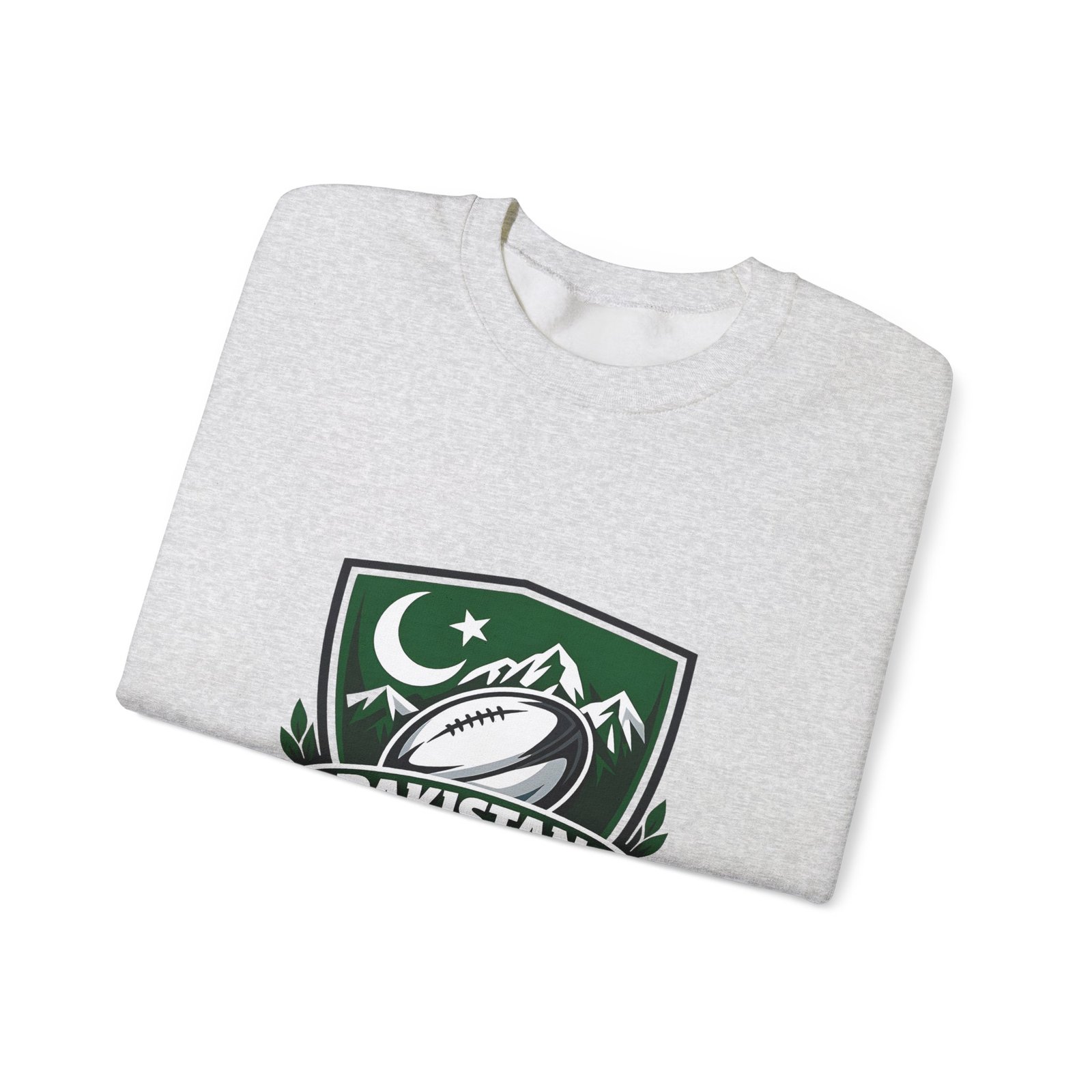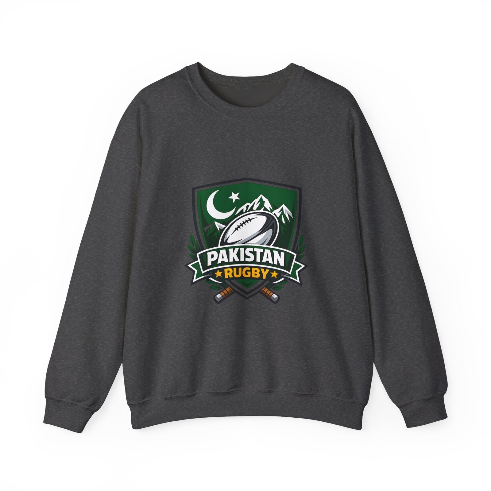 A soft, midweight crewneck that wears like a teammate. This sweatshirt carries a bold Pakistan Rugby crest across the chest — crescent and stars, mountain silhouettes and a stylized rugby ball — so every wear feels like standing with your squad. The fabric has a smooth, slightly brushed face and a clean, classic fit that layers easily over tees or under a jacket. Details like ribbed collar and cuffs, tubular knit construction (no side seams), and reinforced double-needle stitching mean it won’t sag after season after season. Choose embroidered accents on the chest or wrists for a textured, heritage look, or keep the crisp printed crest as shown. Ethically sourced cotton and OEKO‑TEX certified dyes add quiet confidence to something you’ll reach for on cool mornings, match days, and long drives home.