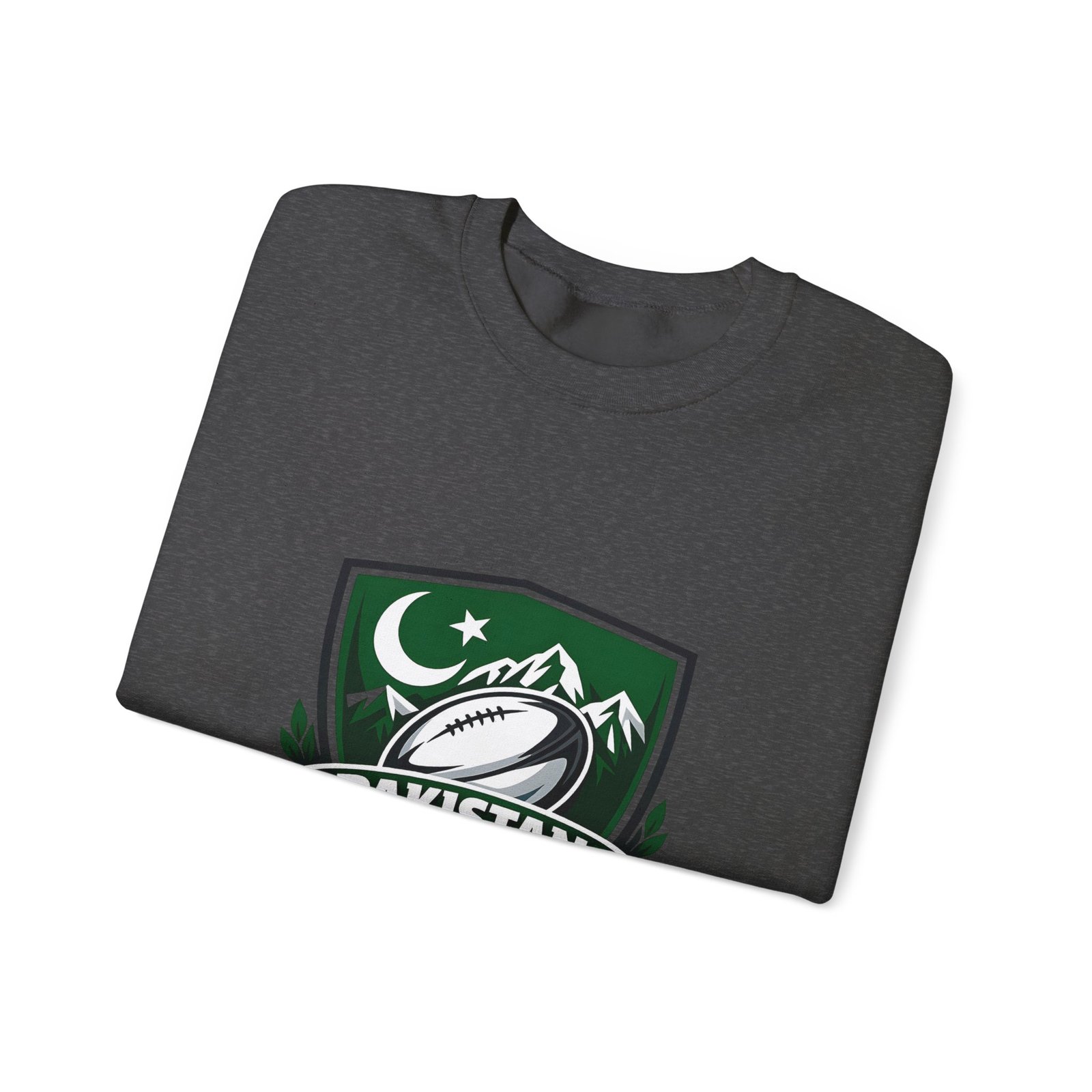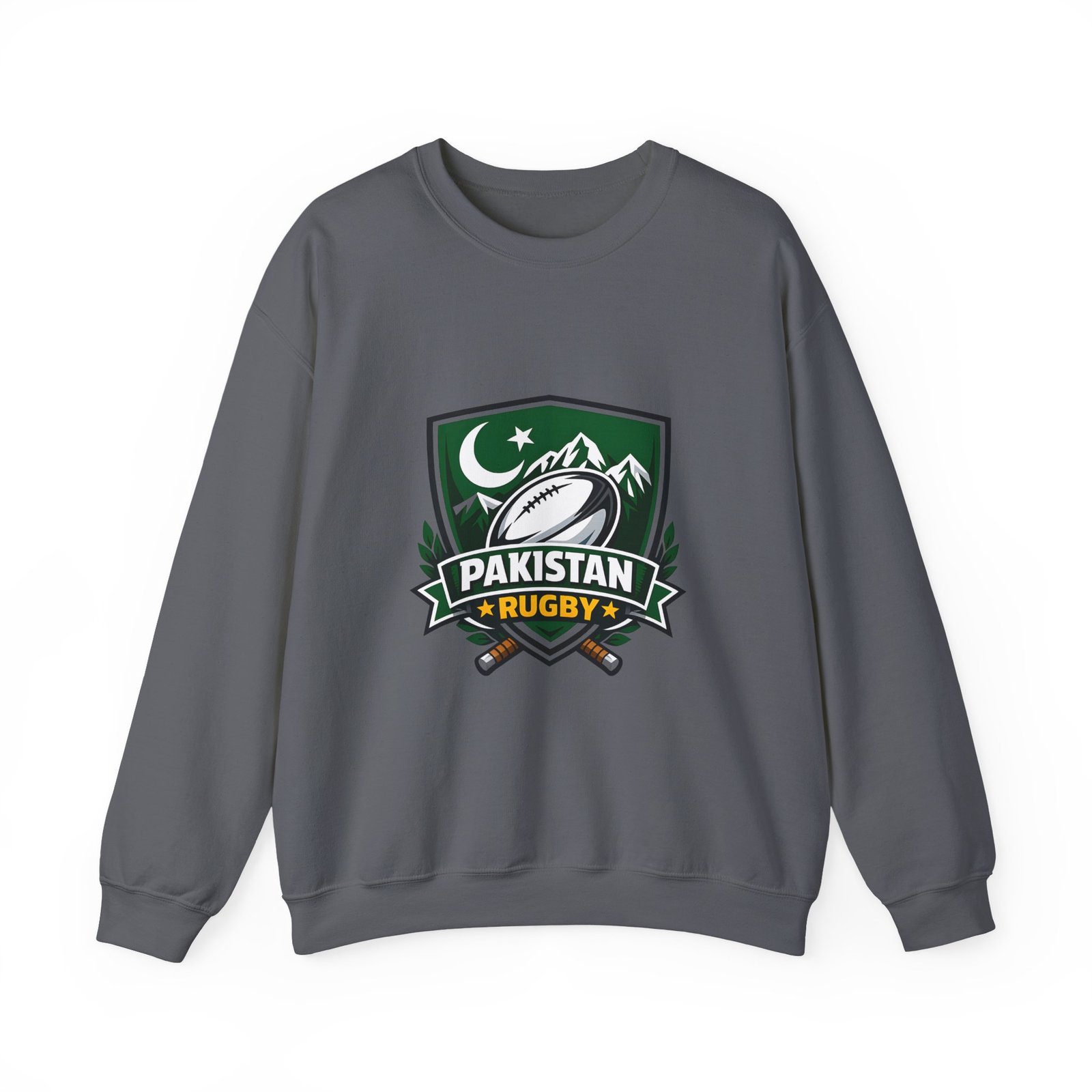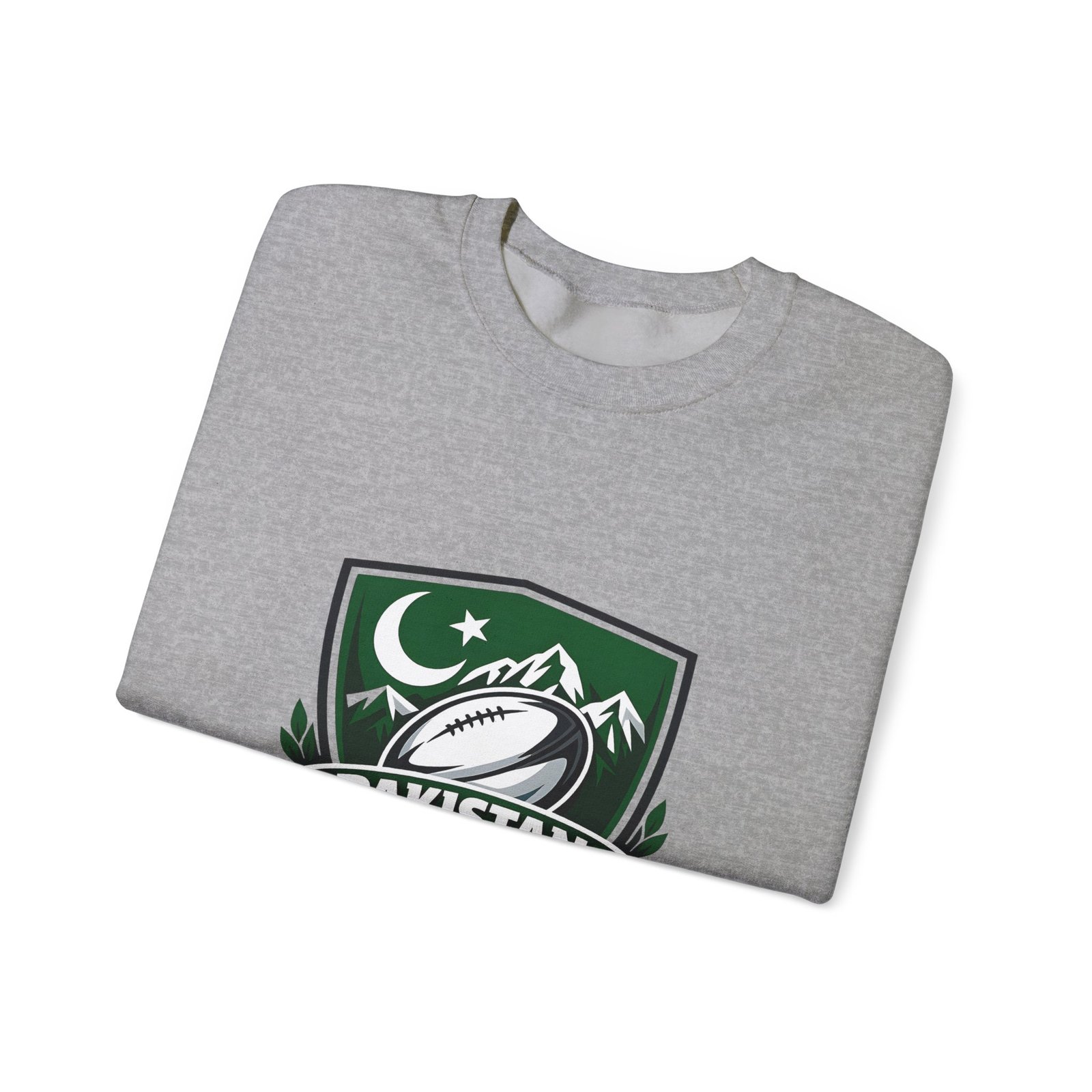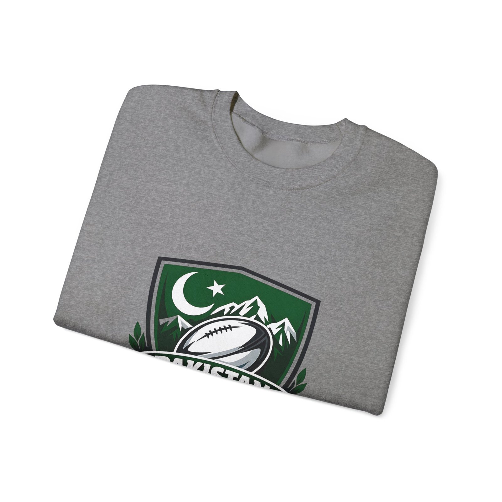 A soft, midweight crewneck that wears like a teammate. This sweatshirt carries a bold Pakistan Rugby crest across the chest — crescent and stars, mountain silhouettes and a stylized rugby ball — so every wear feels like standing with your squad. The fabric has a smooth, slightly brushed face and a clean, classic fit that layers easily over tees or under a jacket. Details like ribbed collar and cuffs, tubular knit construction (no side seams), and reinforced double-needle stitching mean it won’t sag after season after season. Choose embroidered accents on the chest or wrists for a textured, heritage look, or keep the crisp printed crest as shown. Ethically sourced cotton and OEKO‑TEX certified dyes add quiet confidence to something you’ll reach for on cool mornings, match days, and long drives home.
