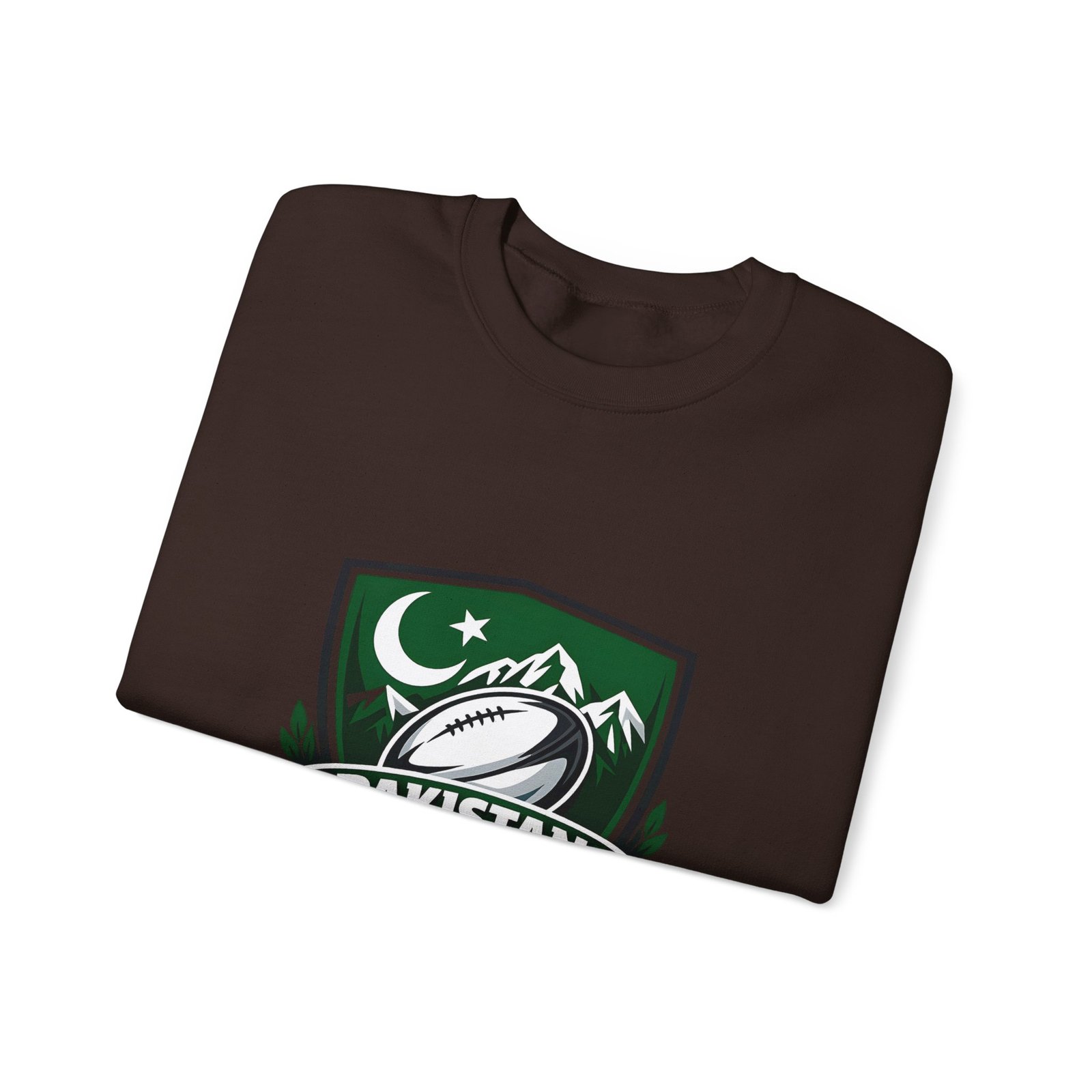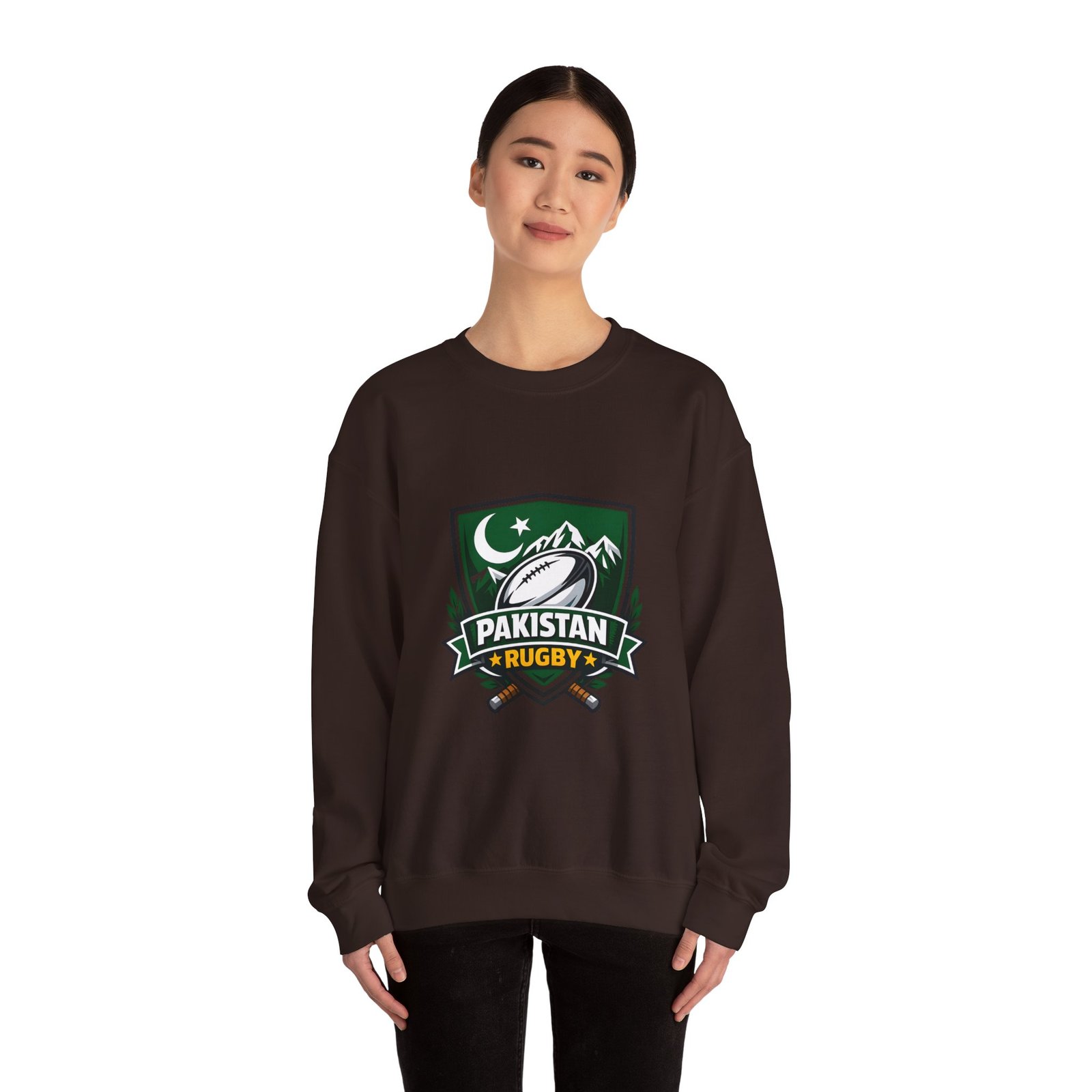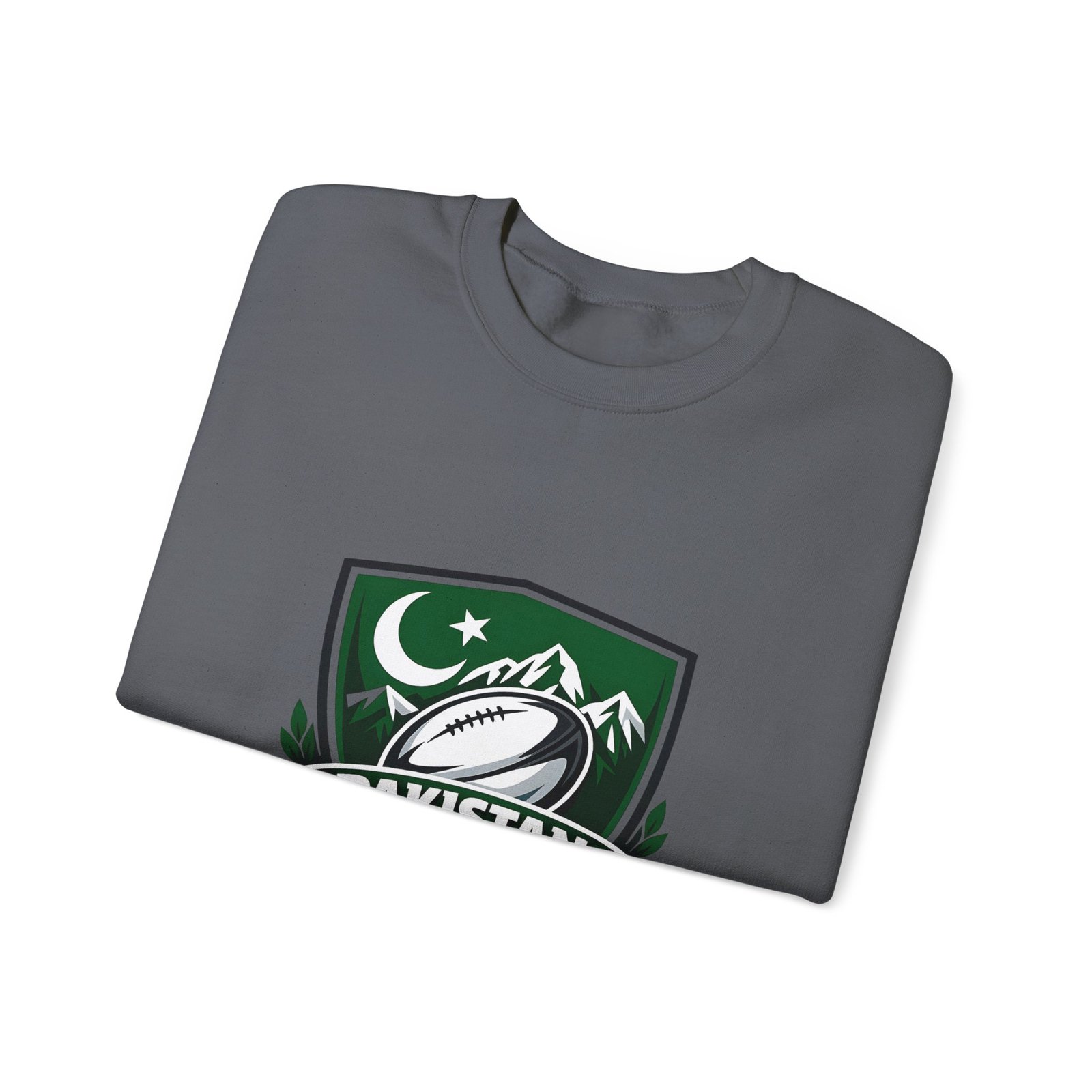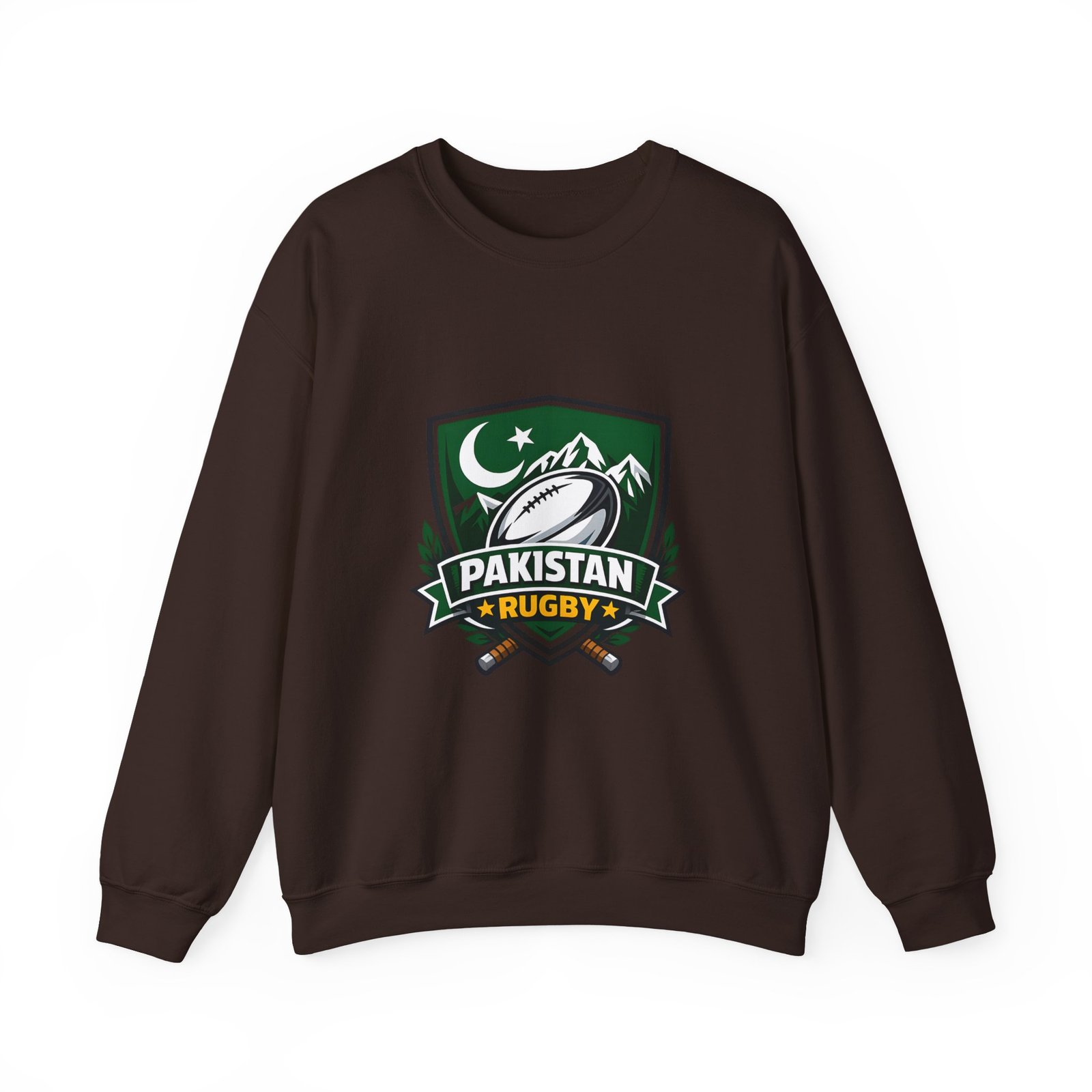 A soft, midweight crewneck that wears like a teammate. This sweatshirt carries a bold Pakistan Rugby crest across the chest — crescent and stars, mountain silhouettes and a stylized rugby ball — so every wear feels like standing with your squad. The fabric has a smooth, slightly brushed face and a clean, classic fit that layers easily over tees or under a jacket. Details like ribbed collar and cuffs, tubular knit construction (no side seams), and reinforced double-needle stitching mean it won’t sag after season after season. Choose embroidered accents on the chest or wrists for a textured, heritage look, or keep the crisp printed crest as shown. Ethically sourced cotton and OEKO‑TEX certified dyes add quiet confidence to something you’ll reach for on cool mornings, match days, and long drives home.