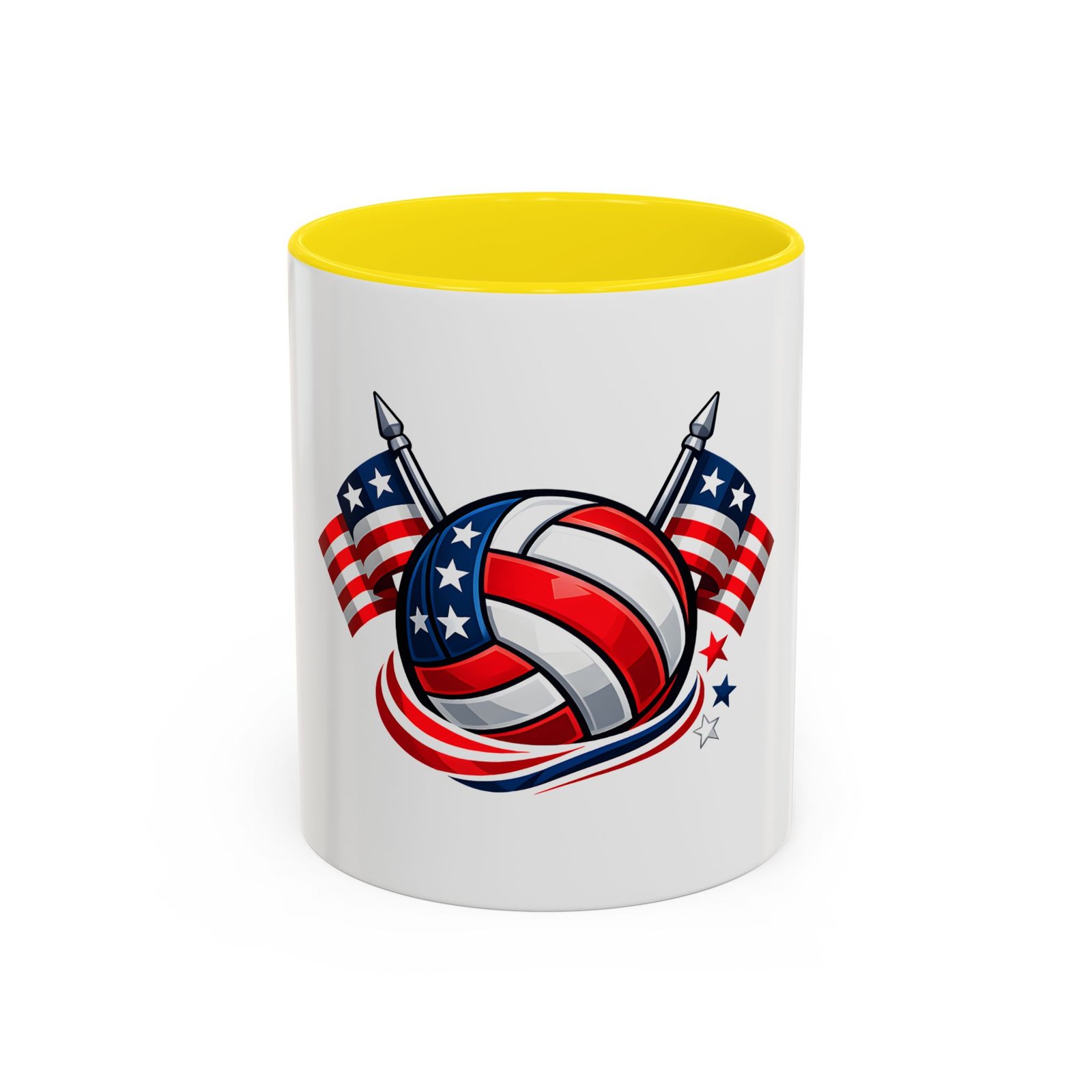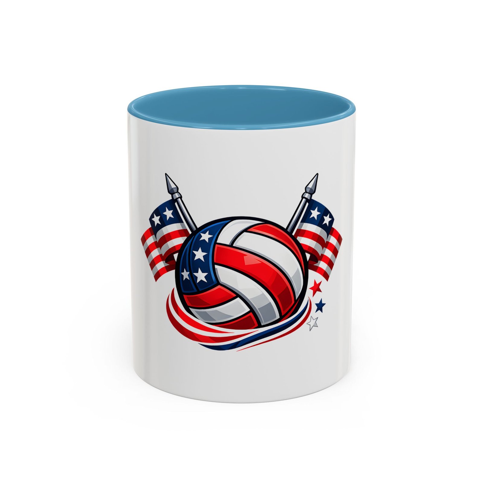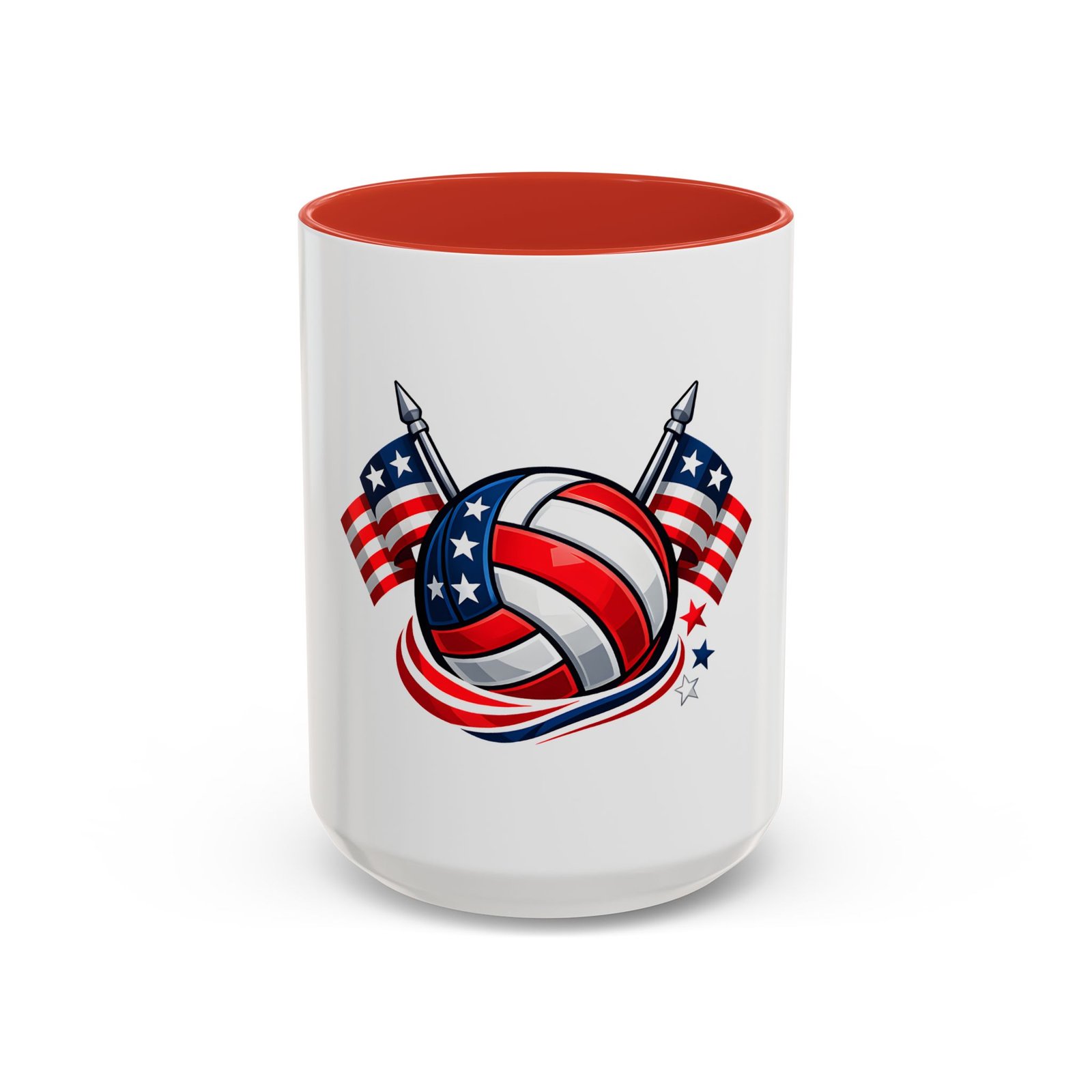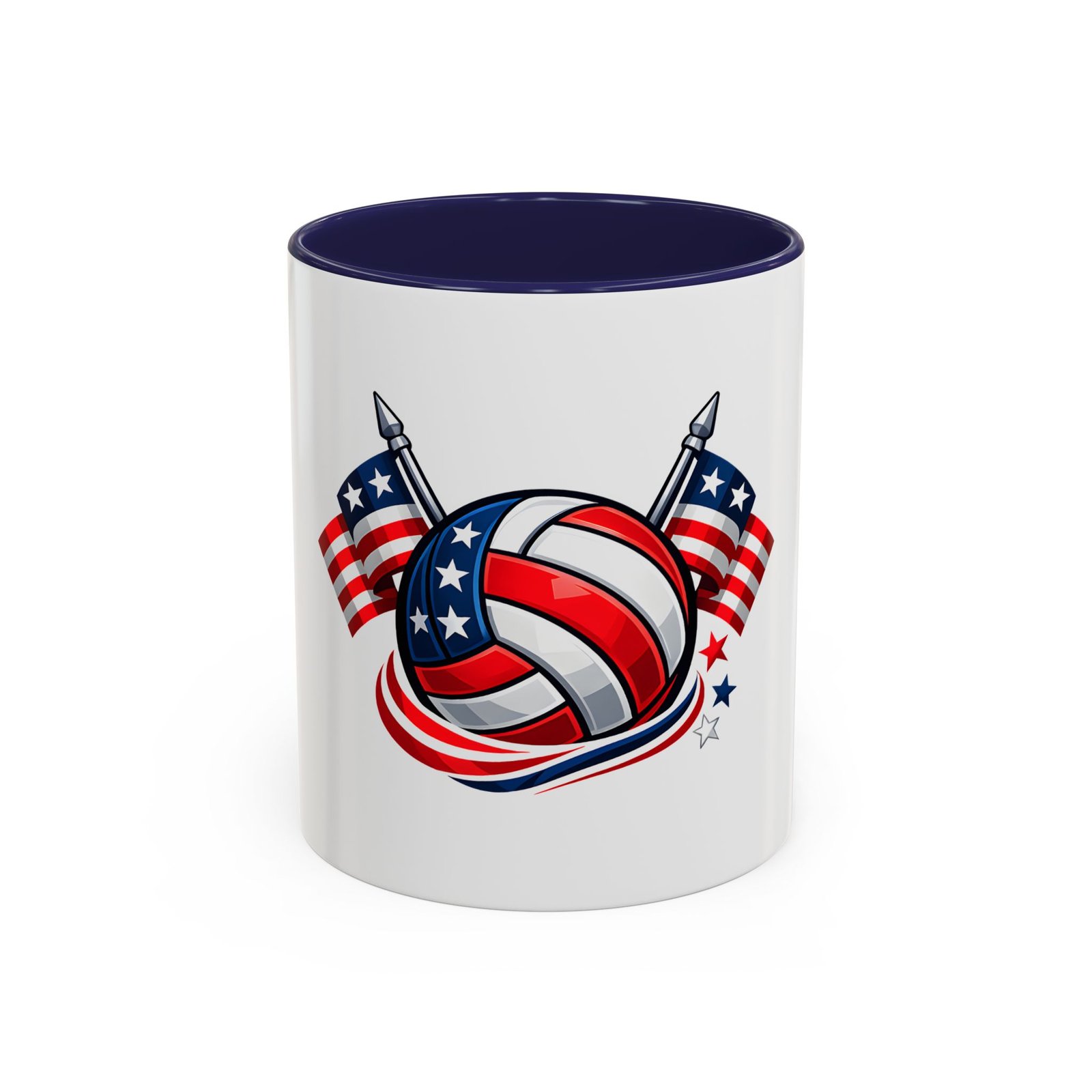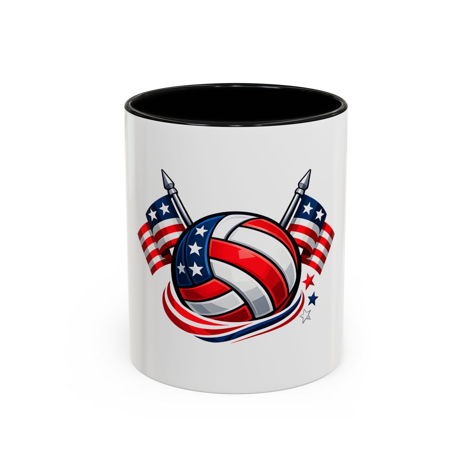 Bright morning energy wrapped in red, white, and blue. This ceramic coffee mug pairs a glossy black interior and handle with a bold patriotic volleyball illustration — stars and stripes woven into the ball with two flags behind it. It feels lively on the counter and confident in your hands: the C-shaped handle gives a familiar grip while the glossy finish makes the colors pop. Use it to celebrate match mornings, team rallies, or quiet moments of pride between practices.