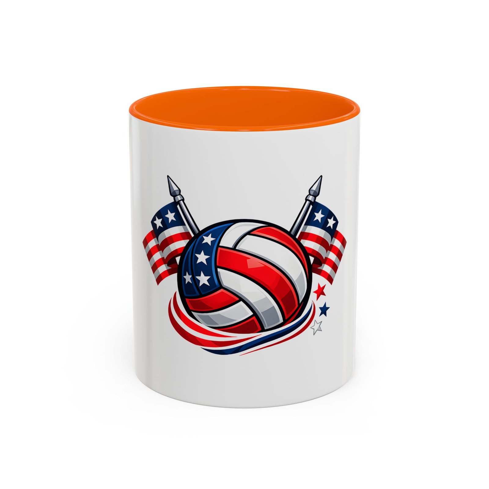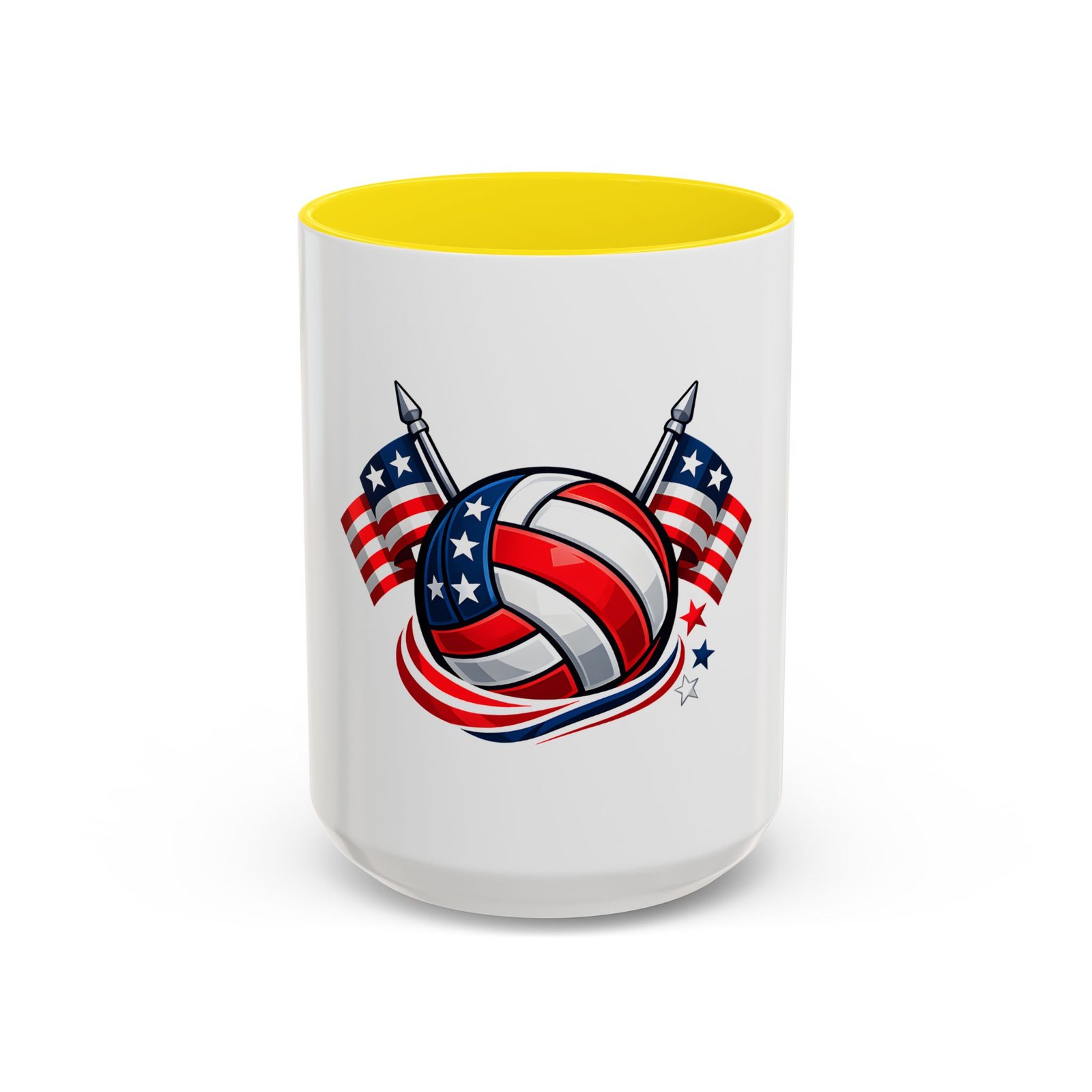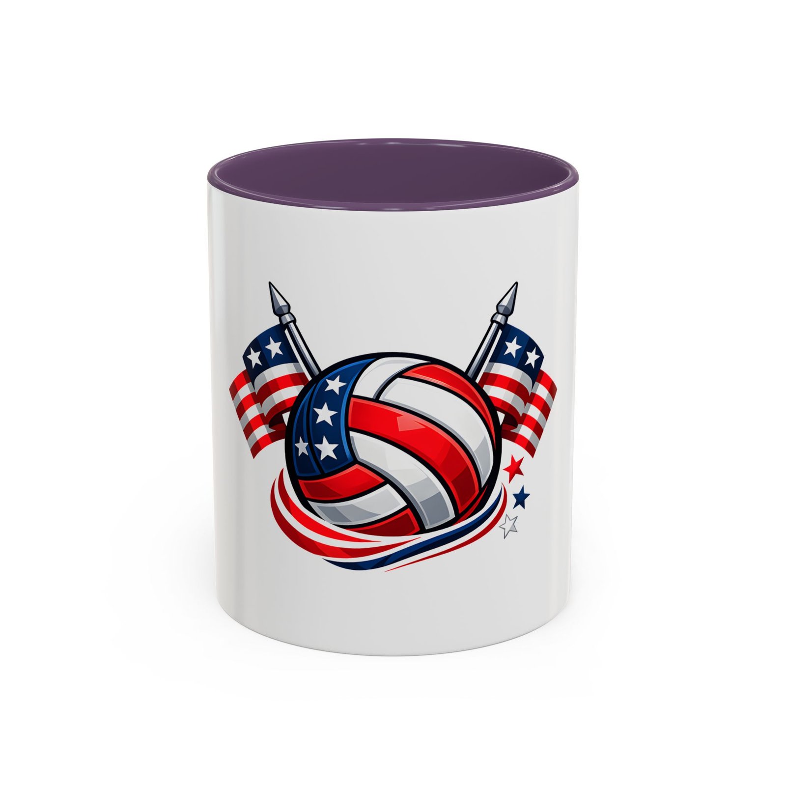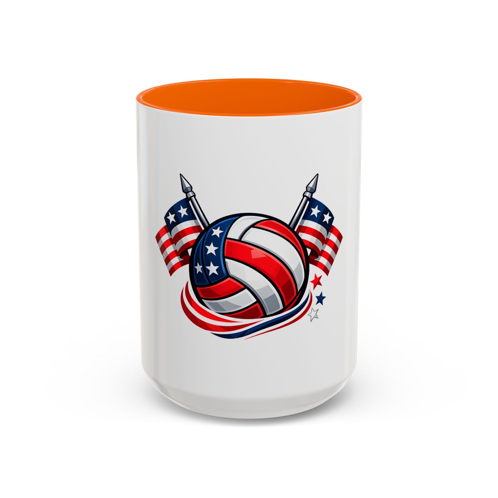 Bright morning energy wrapped in red, white, and blue. This ceramic coffee mug pairs a glossy black interior and handle with a bold patriotic volleyball illustration — stars and stripes woven into the ball with two flags behind it. It feels lively on the counter and confident in your hands: the C-shaped handle gives a familiar grip while the glossy finish makes the colors pop. Use it to celebrate match mornings, team rallies, or quiet moments of pride between practices.