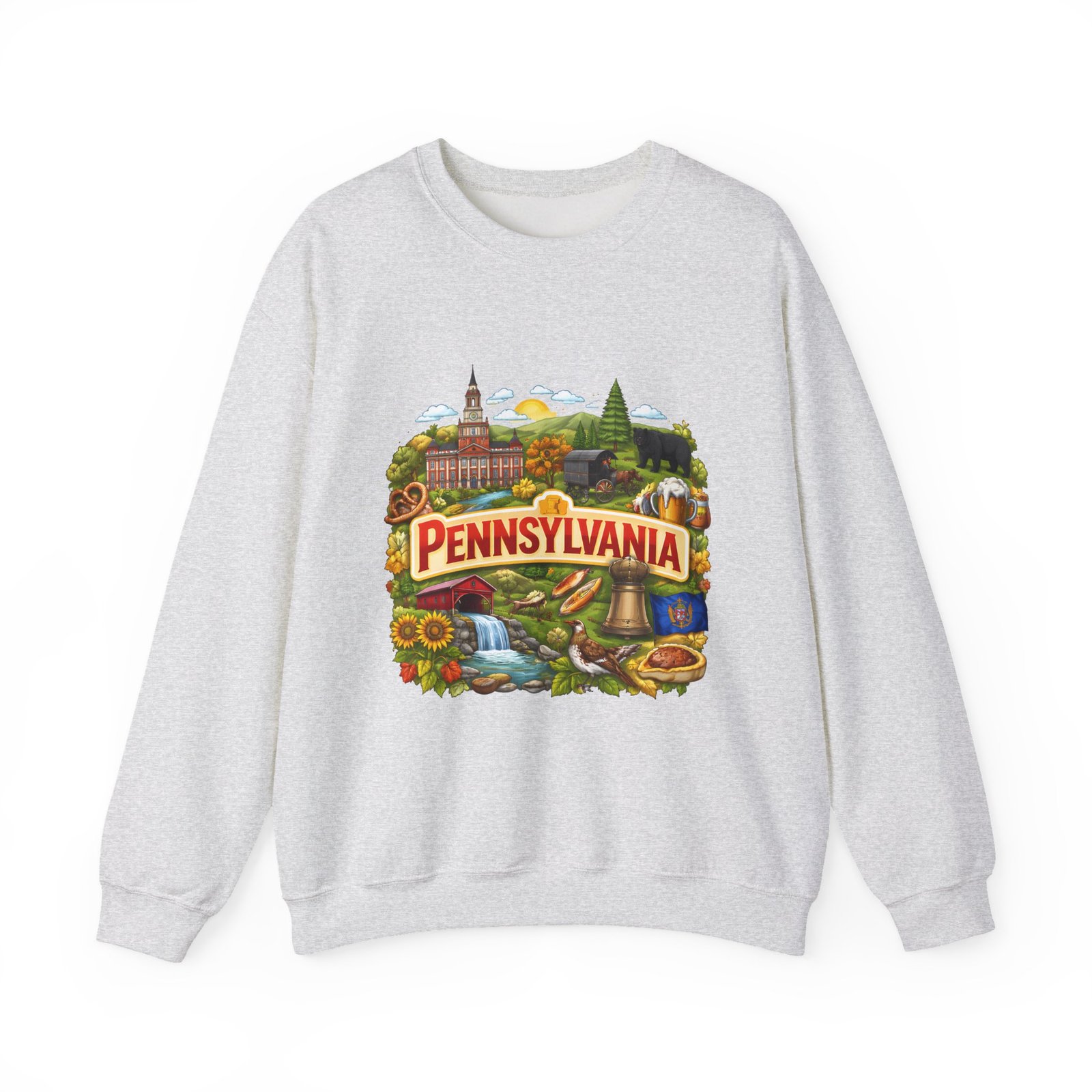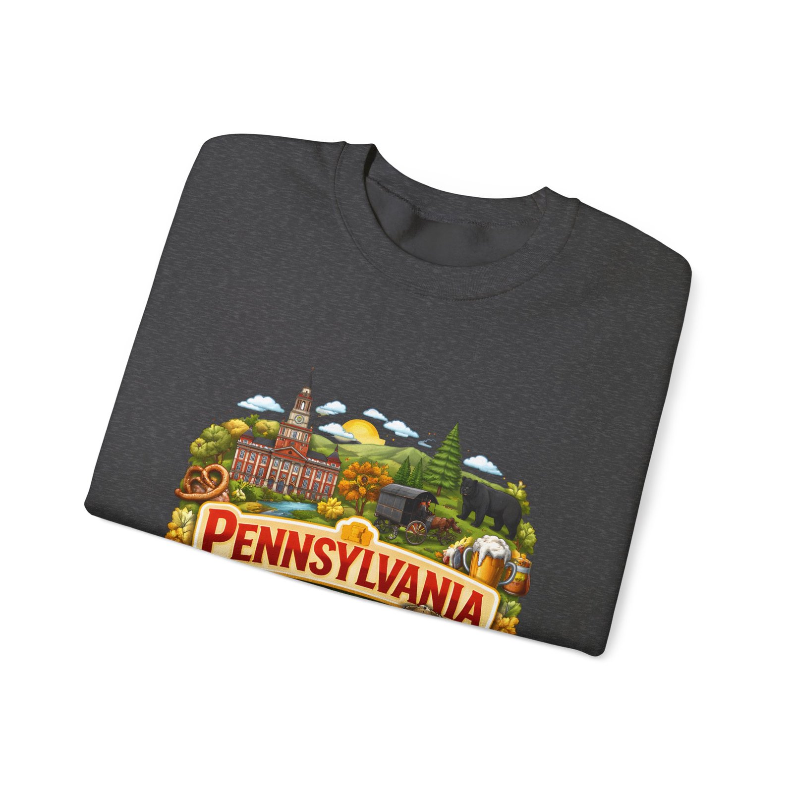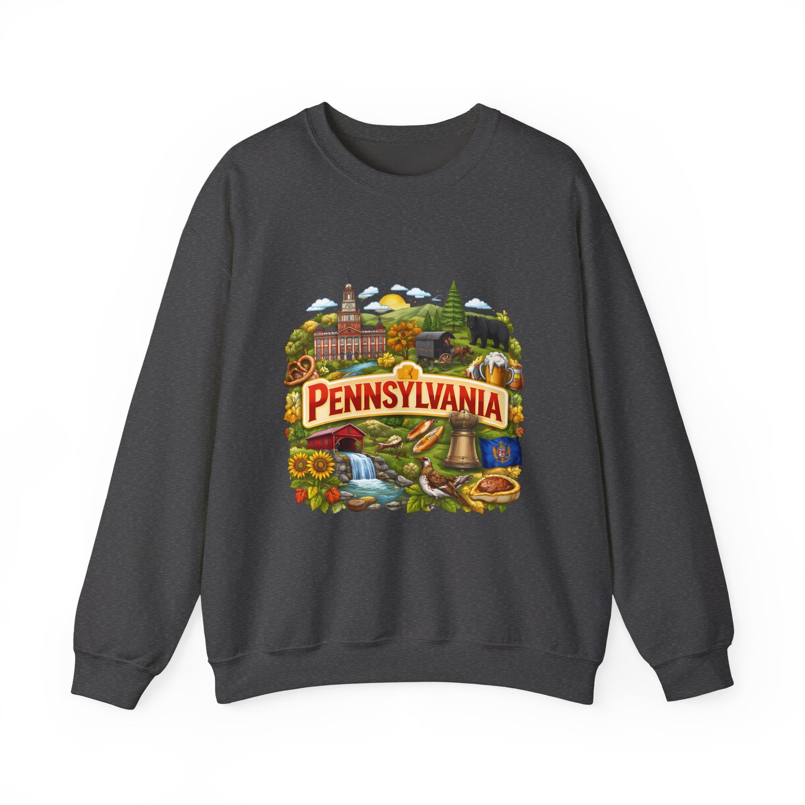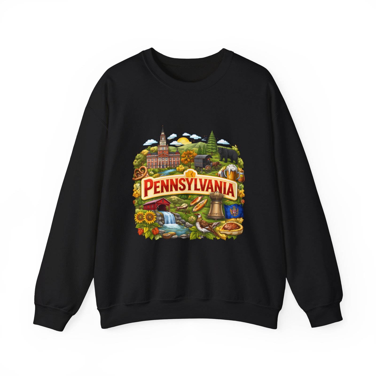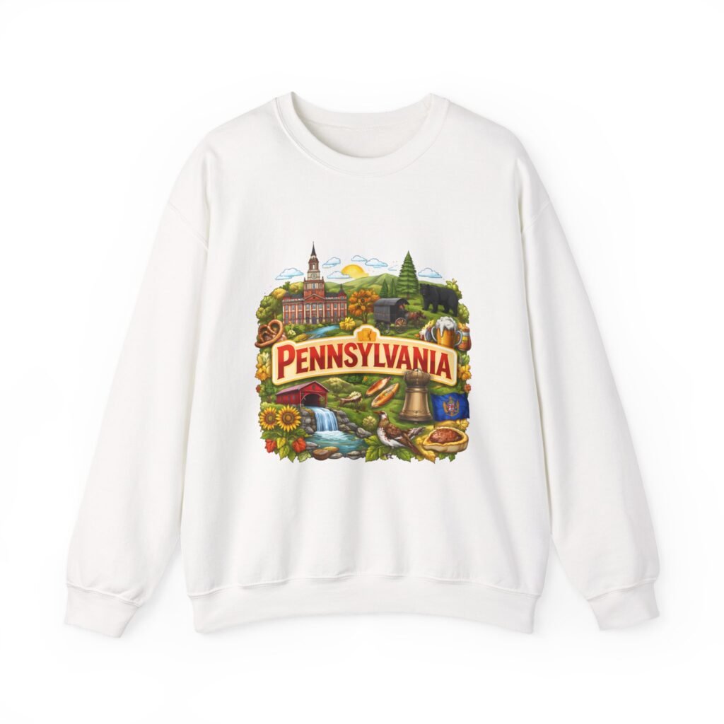Wear a piece of place and memory. This cozy crewneck carries a warm, illustrated Pennsylvania scene—rolling hills, sunflowers, a bell, and a classic town skyline—printed on soft, mid-weight fabric. It settles in like a familiar coffee shop: comfortable at weekend drives, layered for crisp mornings, or pulled on after a long day working outside. The artwork reads like a postcard, nostalgic without being precious, so it fits into days spent exploring small towns, visiting fall festivals, or hosting friends for a backyard bonfire. Thoughtful construction—the tubular knit body, ribbed collar, and reinforced stitching—keeps the fit neat and the sweatshirt lasting through seasons of wear. Little details like tear-away neck labels and DTF inner prints make it feel finished and easy to wear all day.