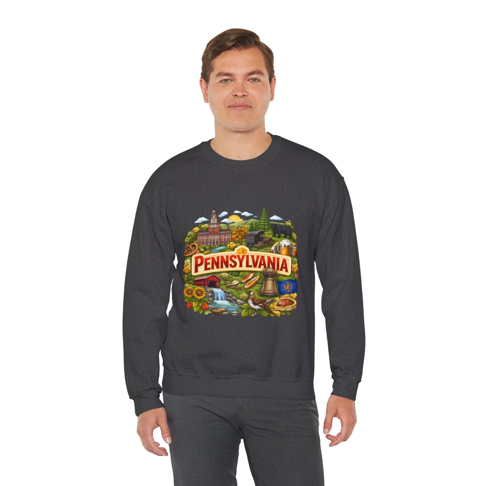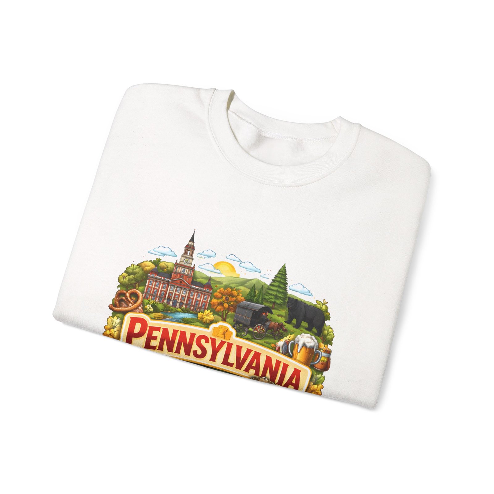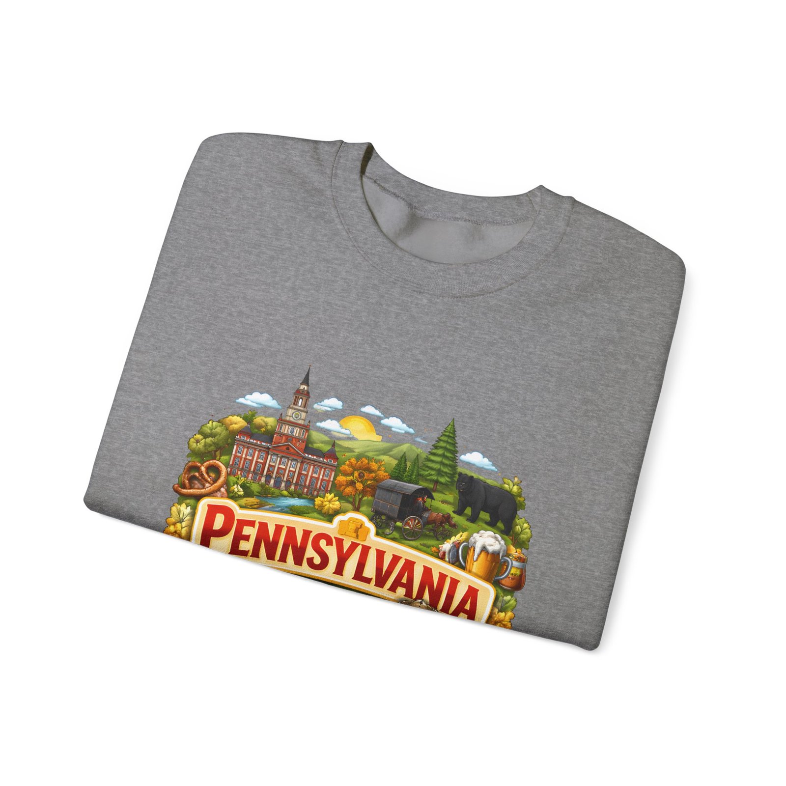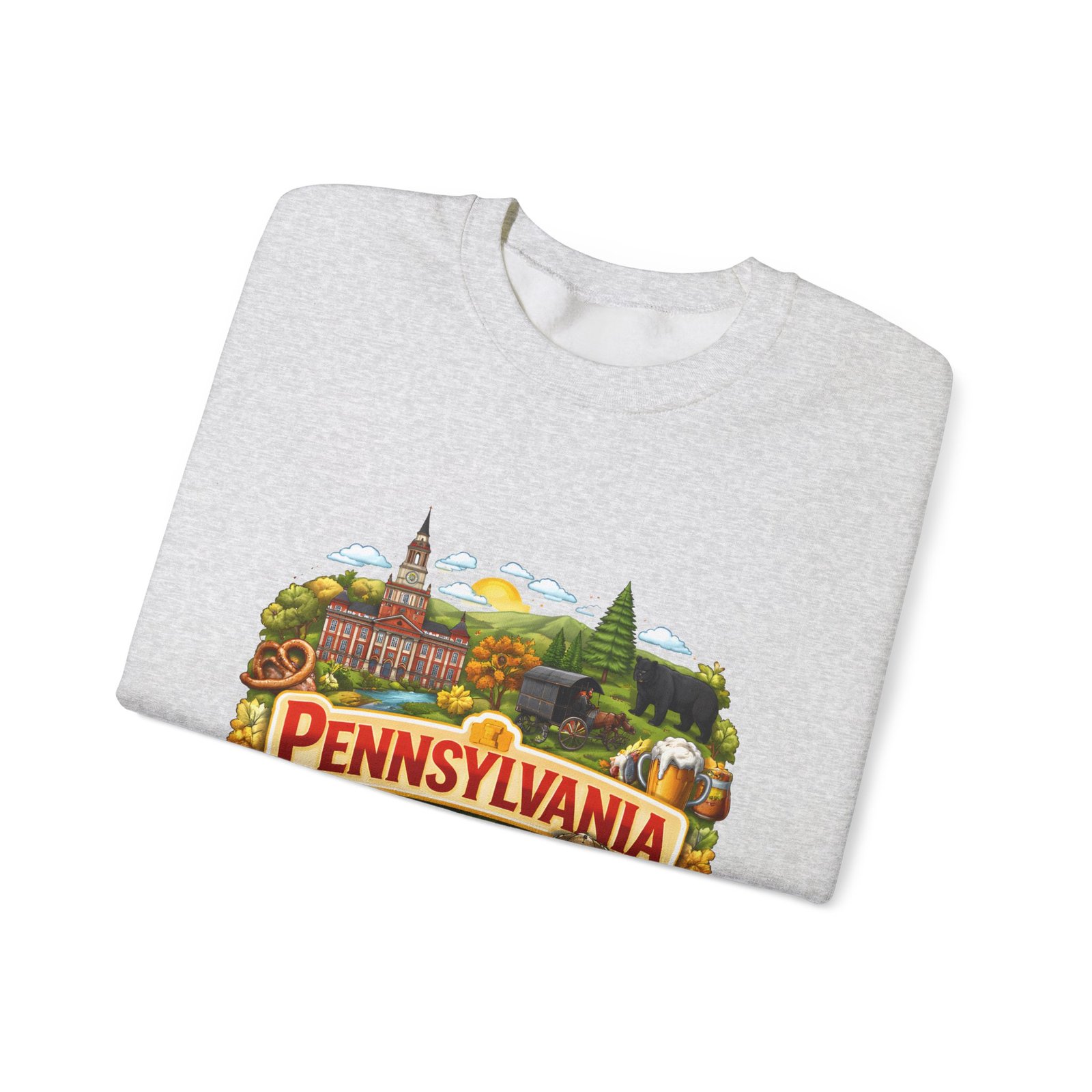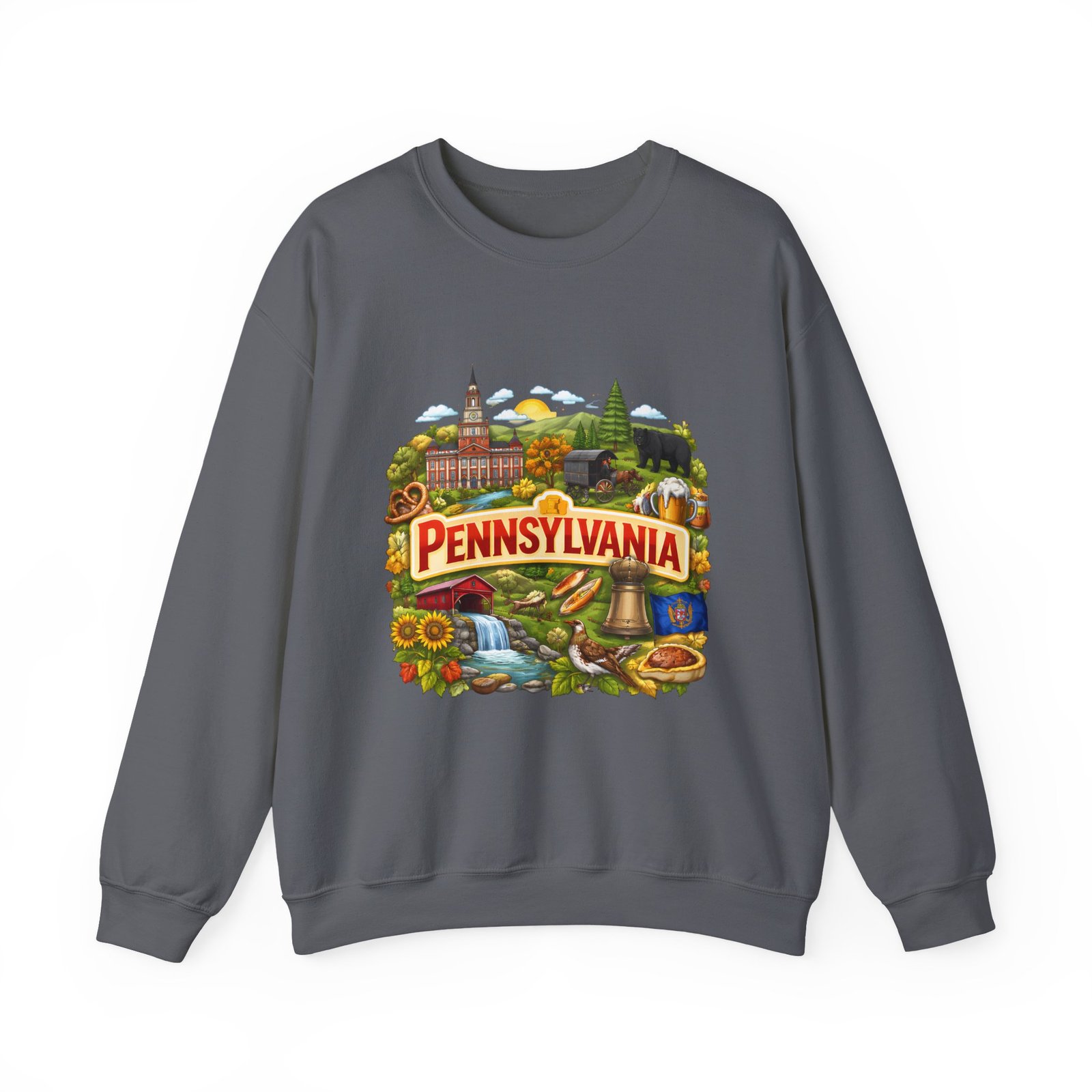 Wear a piece of place and memory. This cozy crewneck carries a warm, illustrated Pennsylvania scene—rolling hills, sunflowers, a bell, and a classic town skyline—printed on soft, mid-weight fabric. It settles in like a familiar coffee shop: comfortable at weekend drives, layered for crisp mornings, or pulled on after a long day working outside. The artwork reads like a postcard, nostalgic without being precious, so it fits into days spent exploring small towns, visiting fall festivals, or hosting friends for a backyard bonfire. Thoughtful construction—the tubular knit body, ribbed collar, and reinforced stitching—keeps the fit neat and the sweatshirt lasting through seasons of wear. Little details like tear-away neck labels and DTF inner prints make it feel finished and easy to wear all day.