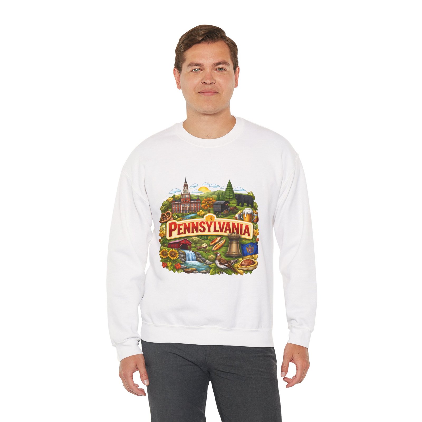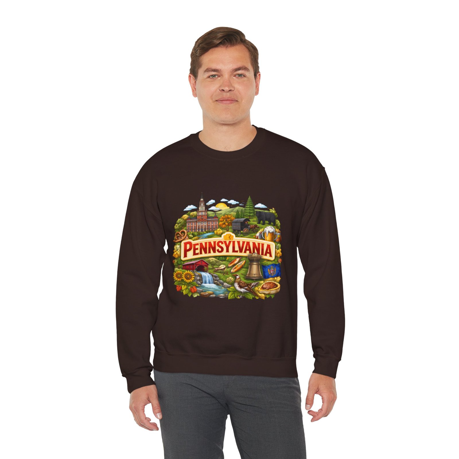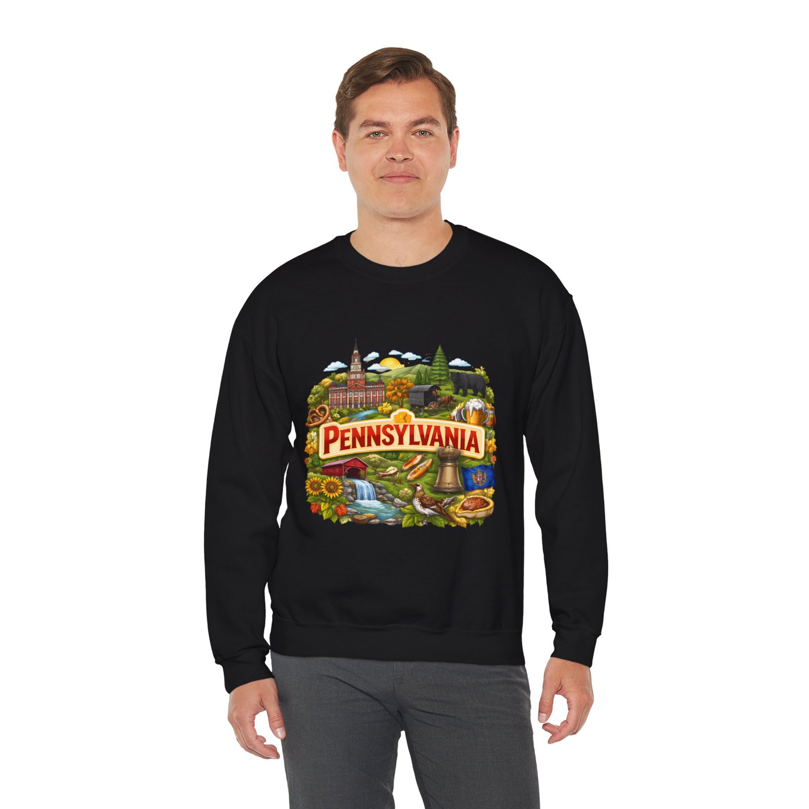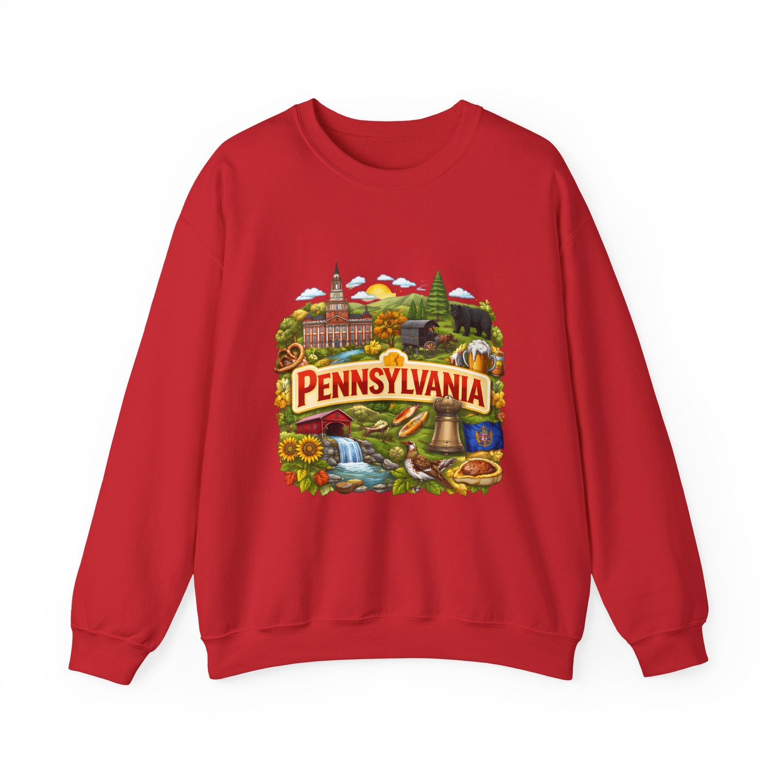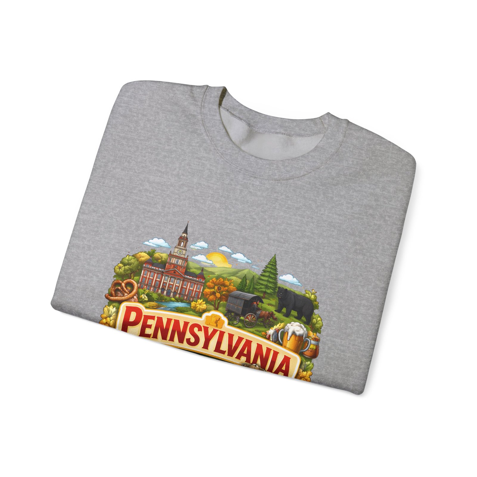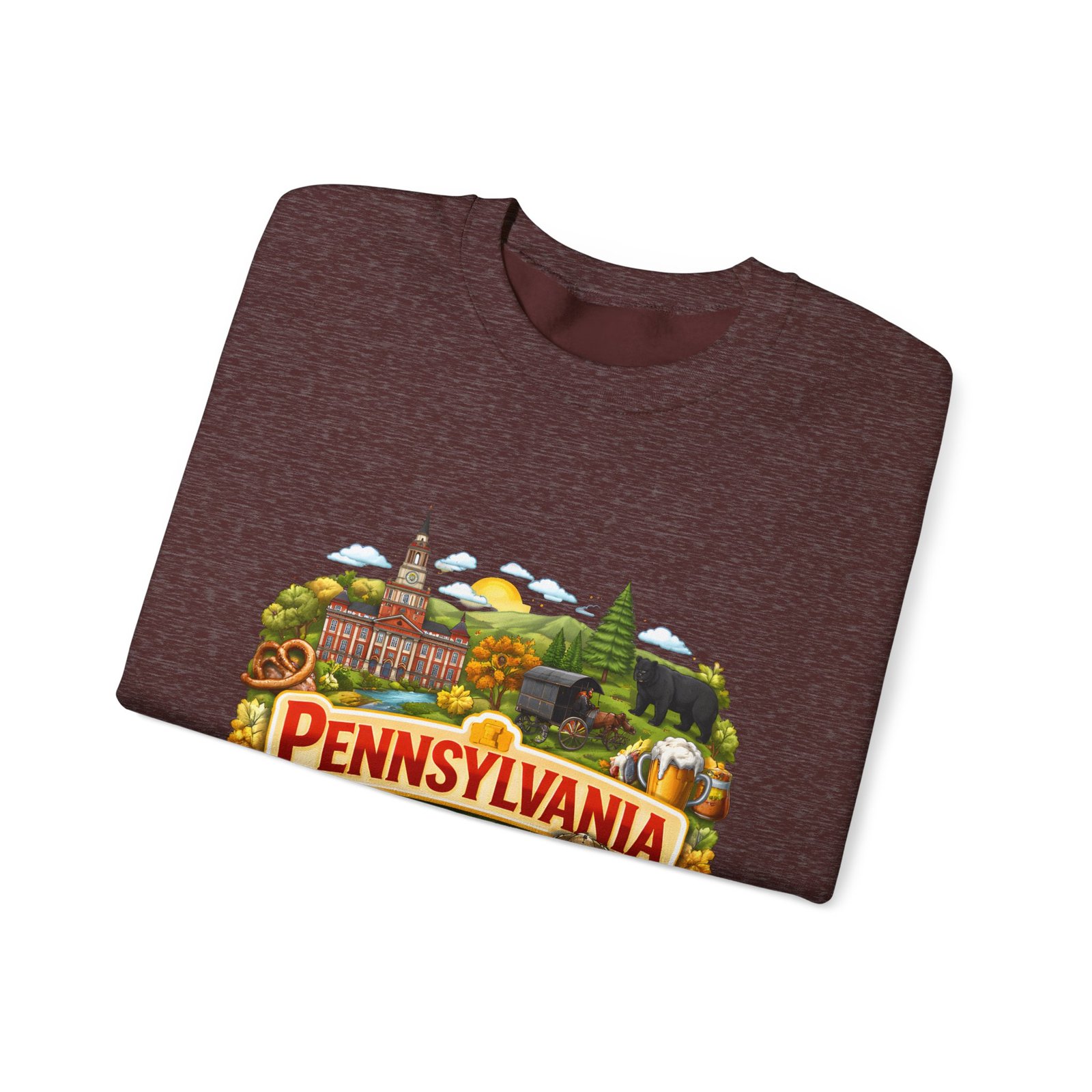 Wear a piece of place and memory. This cozy crewneck carries a warm, illustrated Pennsylvania scene—rolling hills, sunflowers, a bell, and a classic town skyline—printed on soft, mid-weight fabric. It settles in like a familiar coffee shop: comfortable at weekend drives, layered for crisp mornings, or pulled on after a long day working outside. The artwork reads like a postcard, nostalgic without being precious, so it fits into days spent exploring small towns, visiting fall festivals, or hosting friends for a backyard bonfire. Thoughtful construction—the tubular knit body, ribbed collar, and reinforced stitching—keeps the fit neat and the sweatshirt lasting through seasons of wear. Little details like tear-away neck labels and DTF inner prints make it feel finished and easy to wear all day.