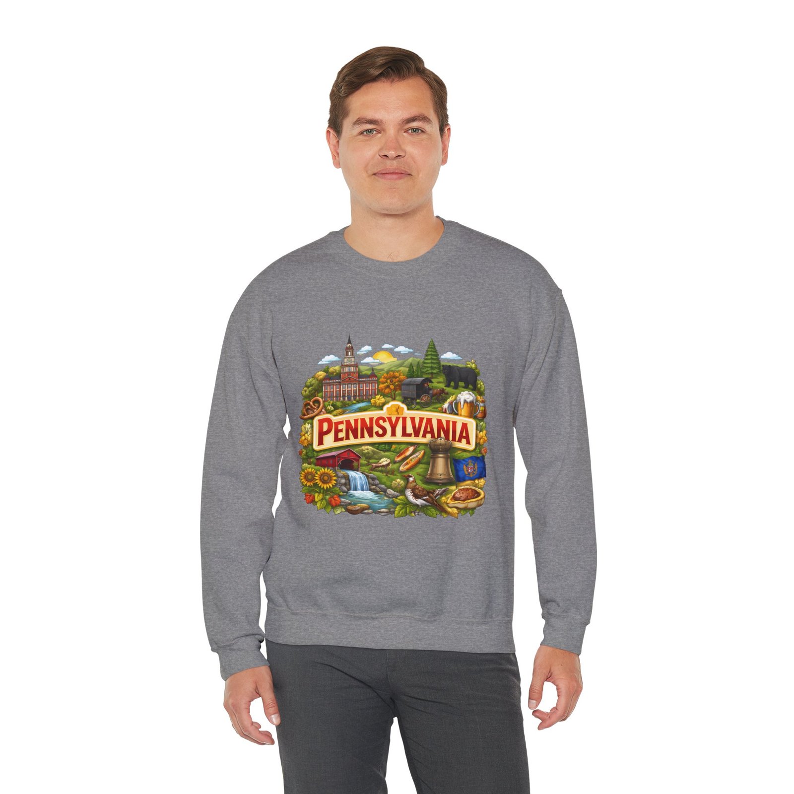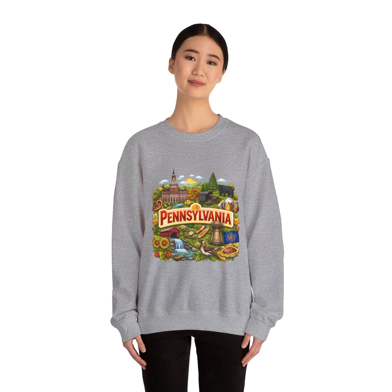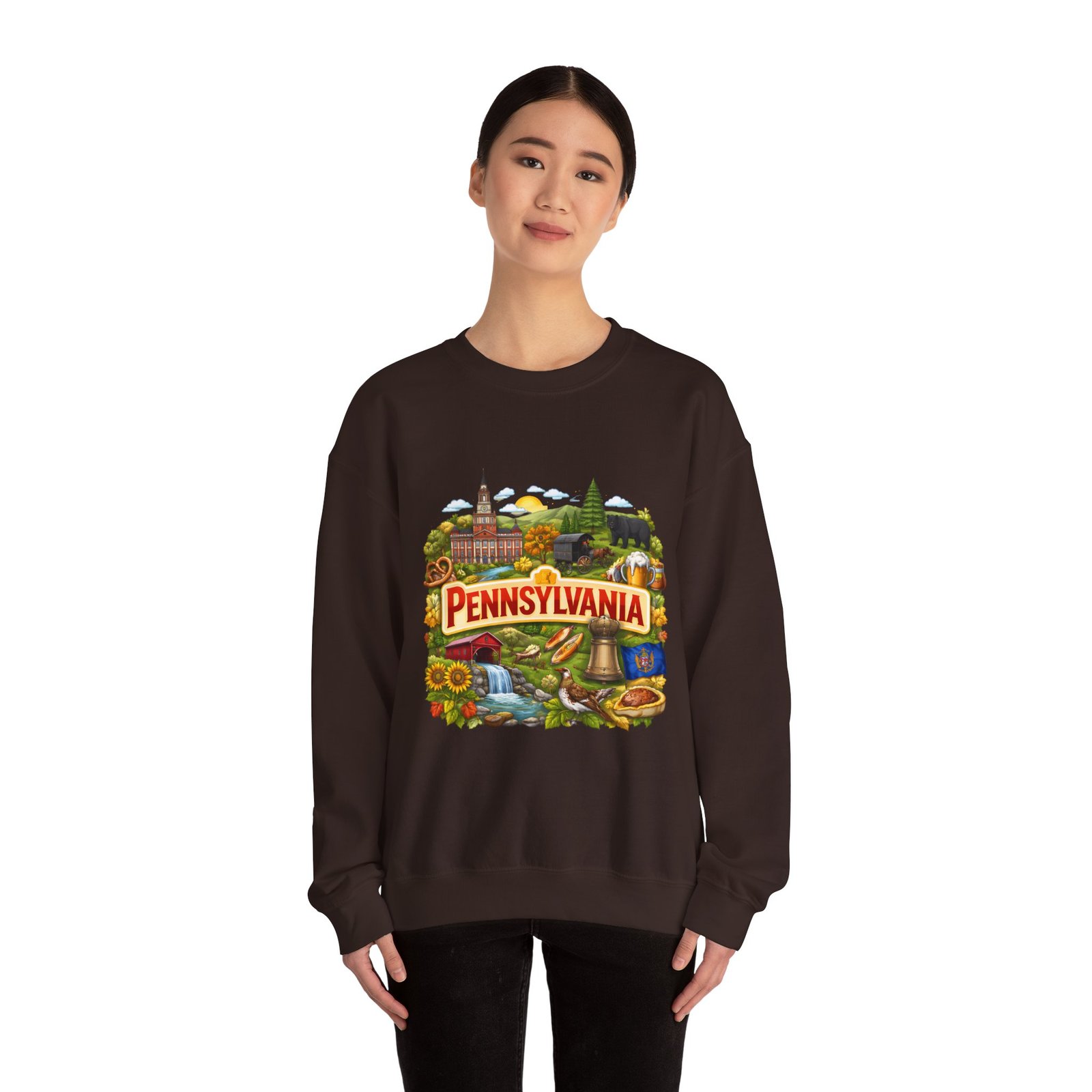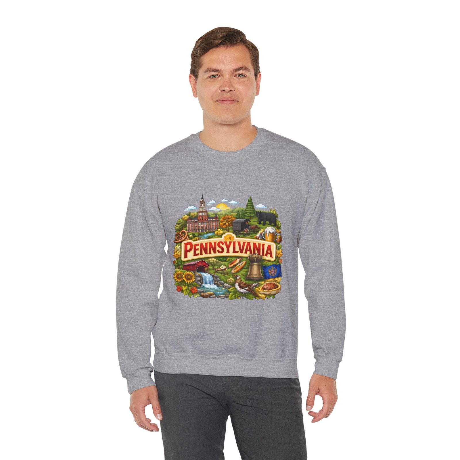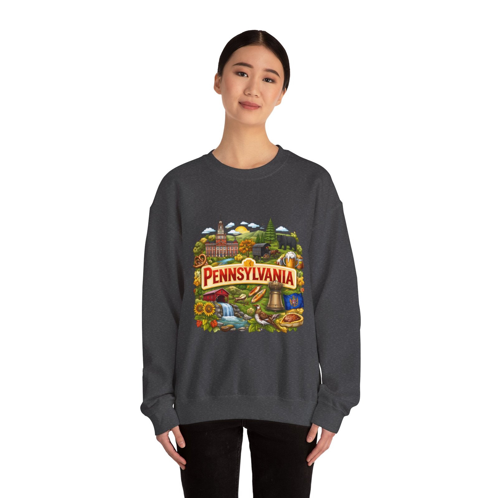 Wear a piece of place and memory. This cozy crewneck carries a warm, illustrated Pennsylvania scene—rolling hills, sunflowers, a bell, and a classic town skyline—printed on soft, mid-weight fabric. It settles in like a familiar coffee shop: comfortable at weekend drives, layered for crisp mornings, or pulled on after a long day working outside. The artwork reads like a postcard, nostalgic without being precious, so it fits into days spent exploring small towns, visiting fall festivals, or hosting friends for a backyard bonfire. Thoughtful construction—the tubular knit body, ribbed collar, and reinforced stitching—keeps the fit neat and the sweatshirt lasting through seasons of wear. Little details like tear-away neck labels and DTF inner prints make it feel finished and easy to wear all day.