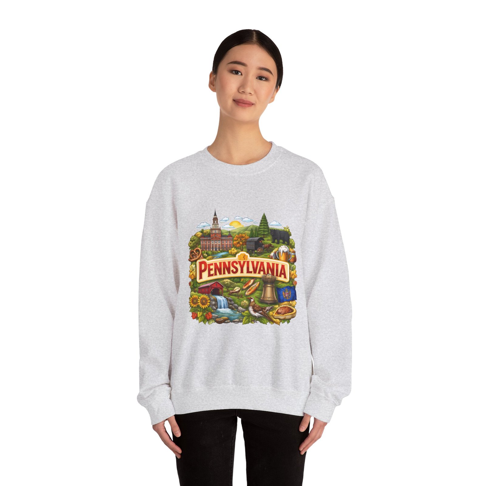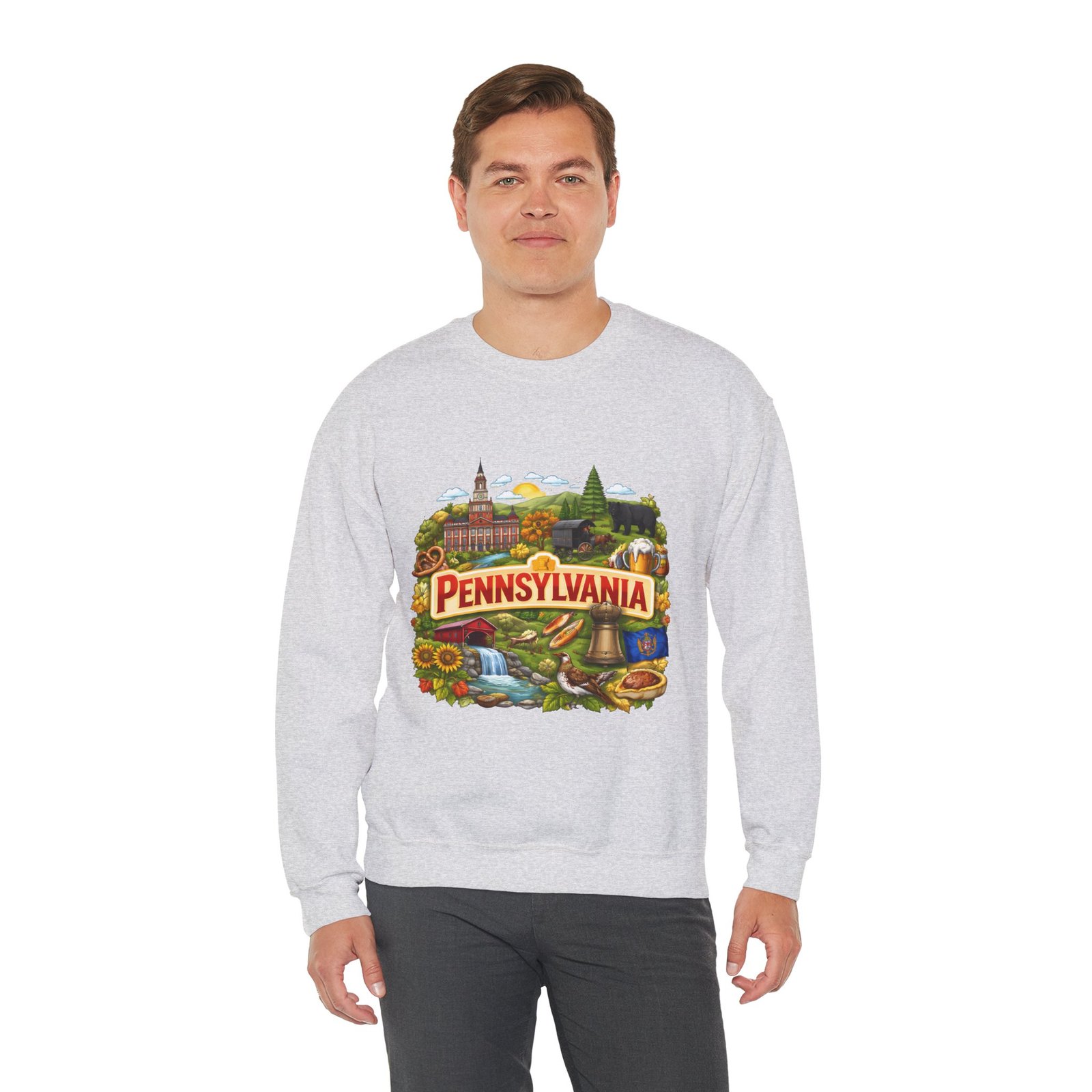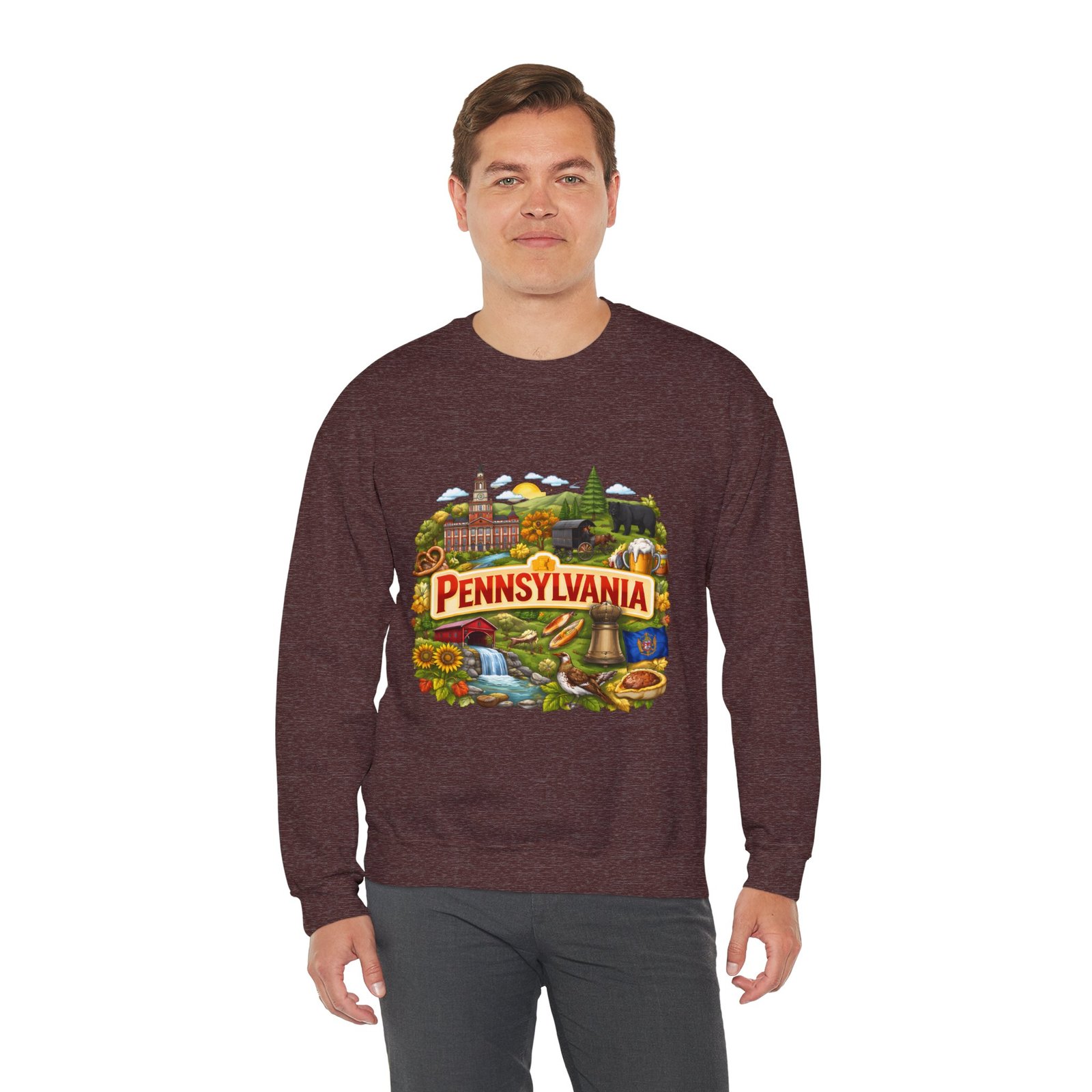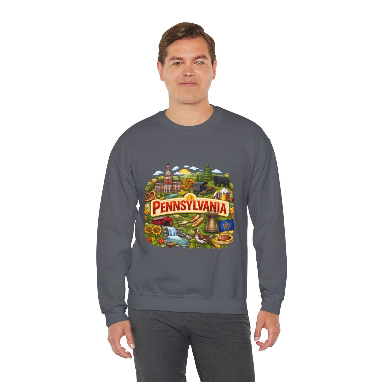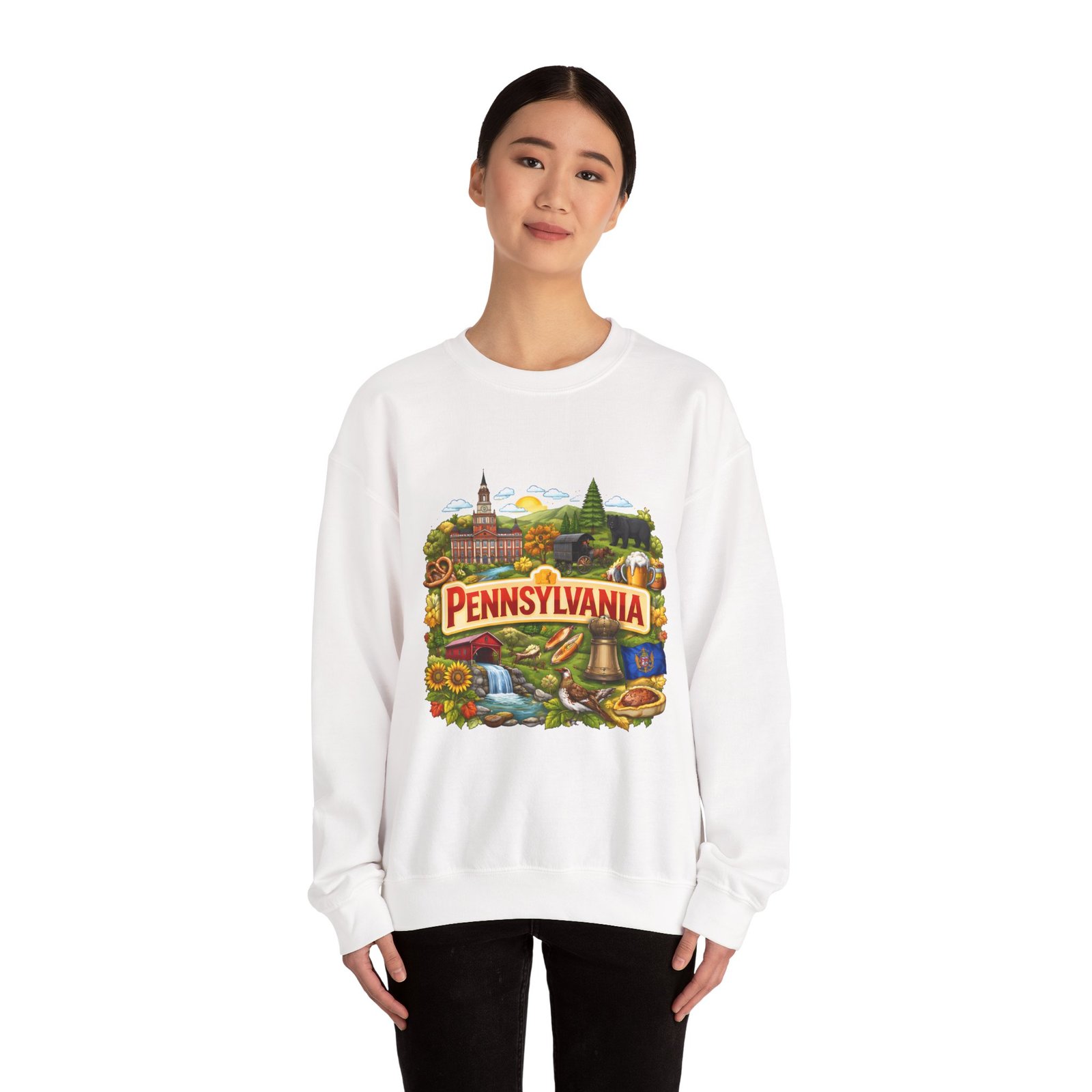 Wear a piece of place and memory. This cozy crewneck carries a warm, illustrated Pennsylvania scene—rolling hills, sunflowers, a bell, and a classic town skyline—printed on soft, mid-weight fabric. It settles in like a familiar coffee shop: comfortable at weekend drives, layered for crisp mornings, or pulled on after a long day working outside. The artwork reads like a postcard, nostalgic without being precious, so it fits into days spent exploring small towns, visiting fall festivals, or hosting friends for a backyard bonfire. Thoughtful construction—the tubular knit body, ribbed collar, and reinforced stitching—keeps the fit neat and the sweatshirt lasting through seasons of wear. Little details like tear-away neck labels and DTF inner prints make it feel finished and easy to wear all day.