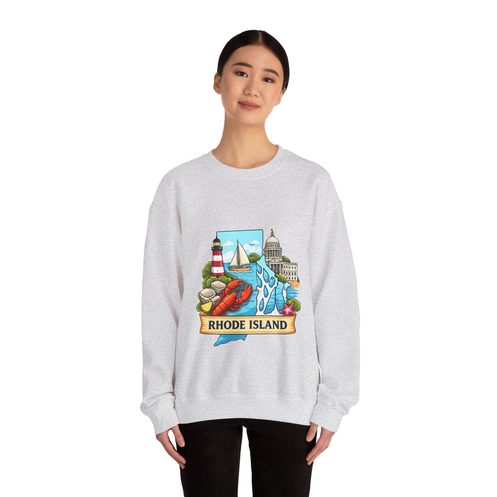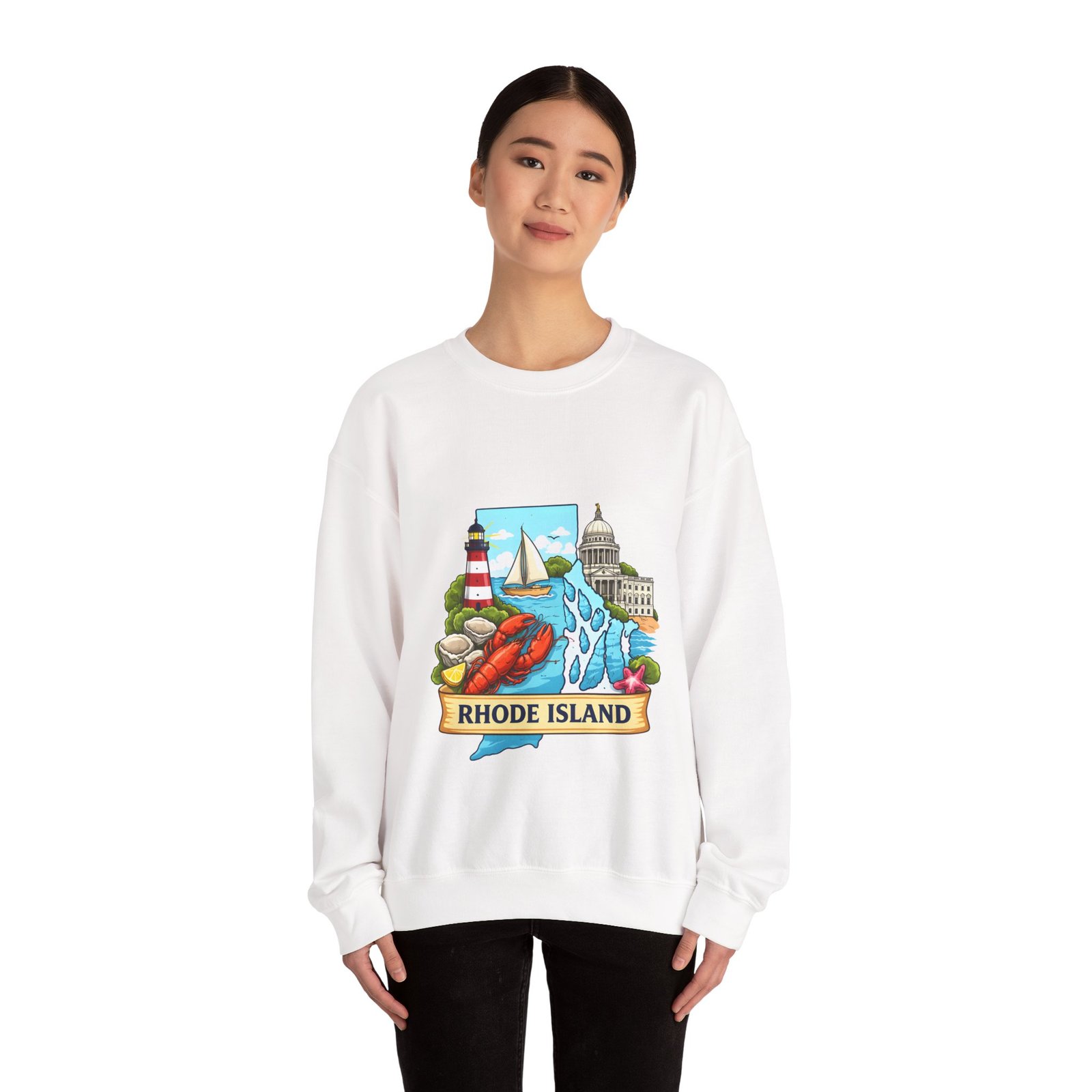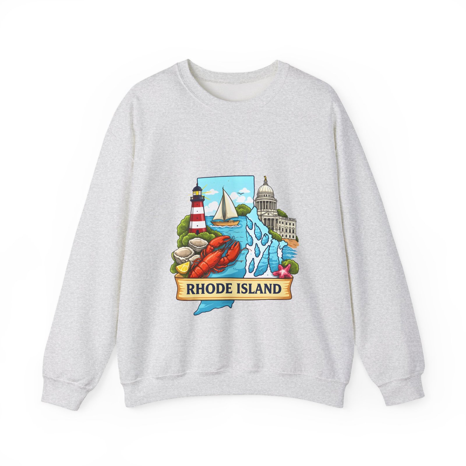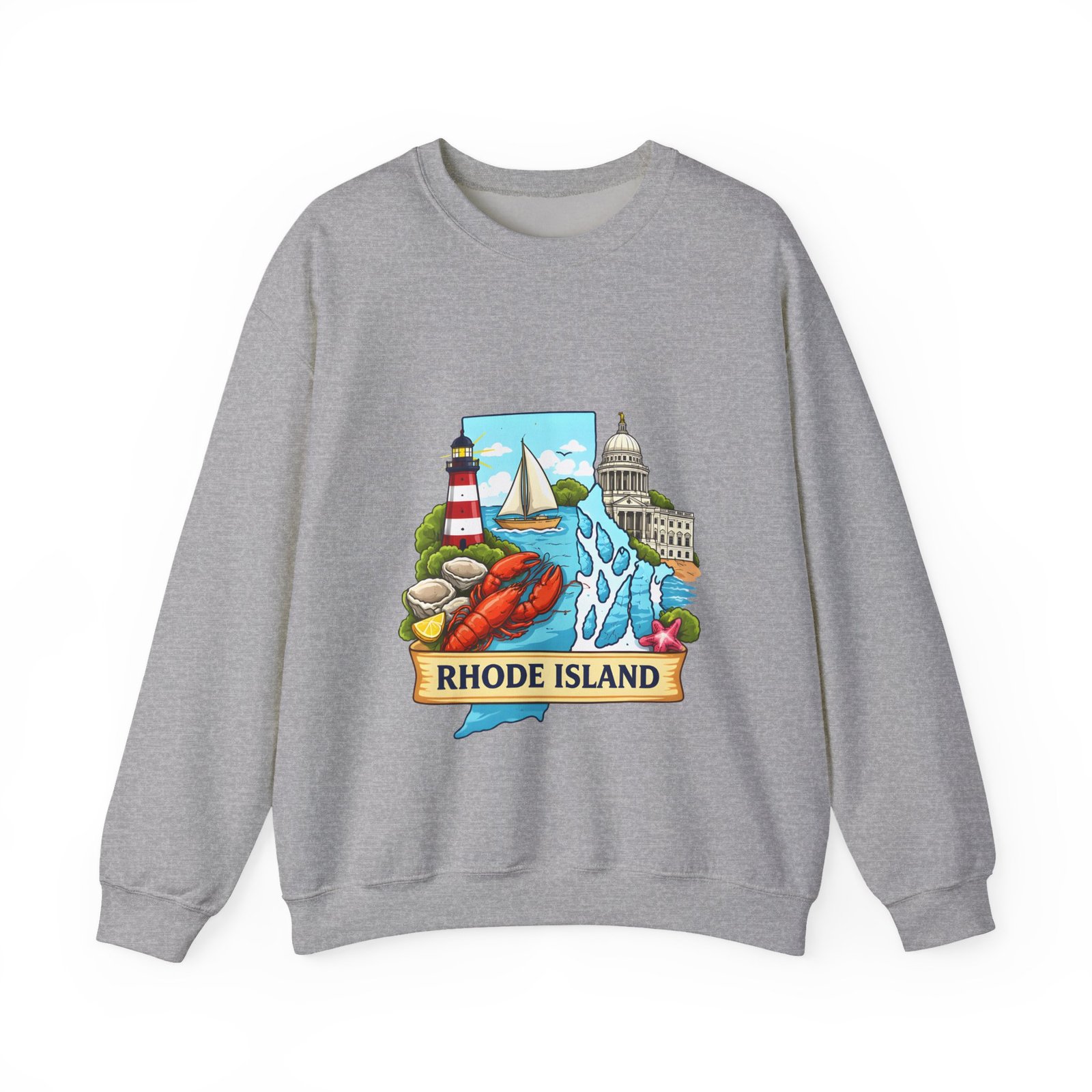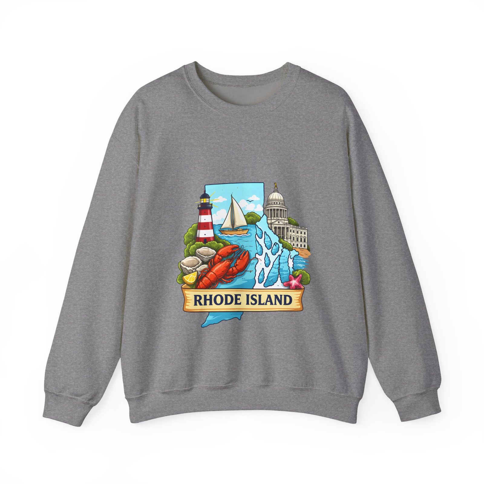 Rhode Island Scenic Crewneck Sweatshirt – Coastal Lighthouse, Sailboat & Capitol Design