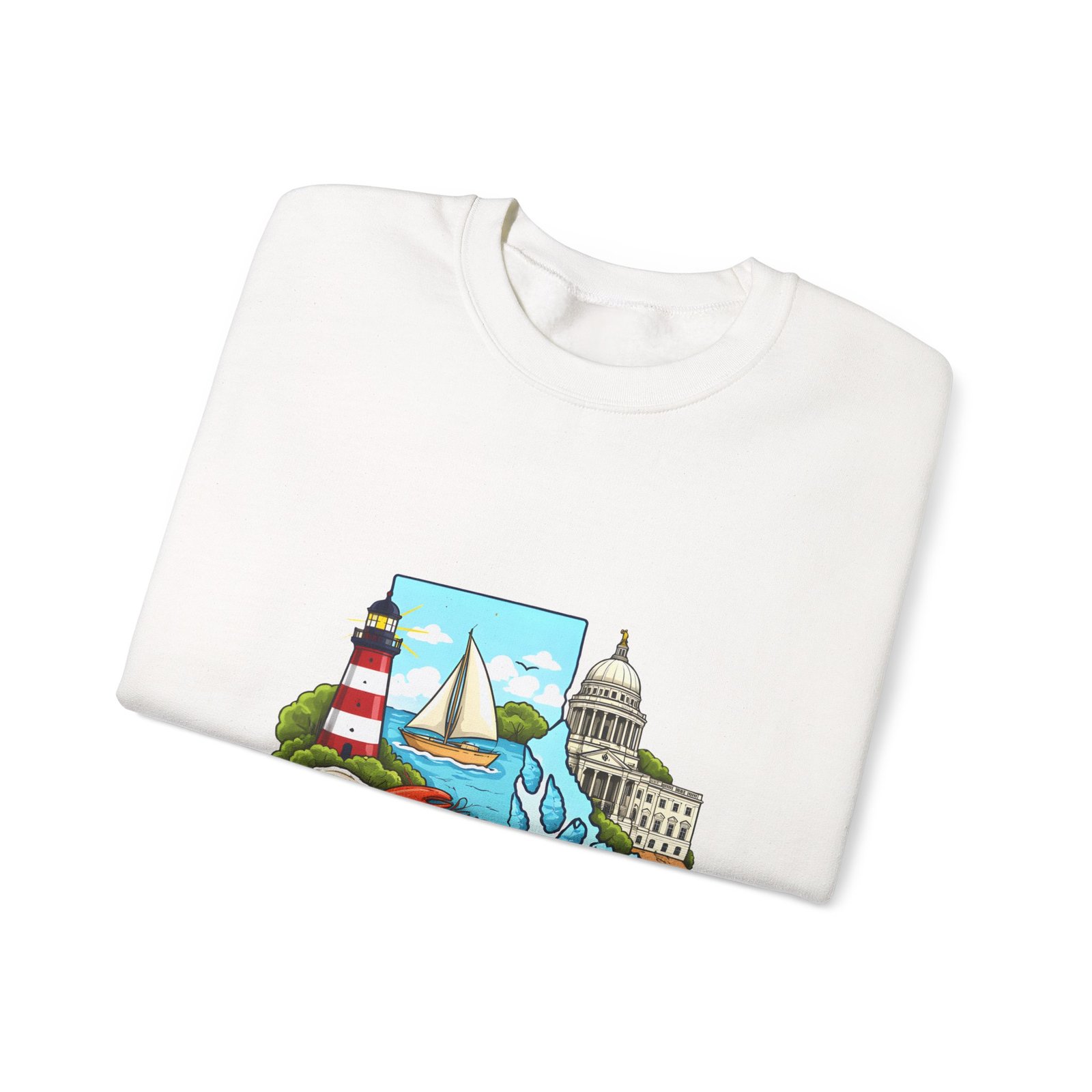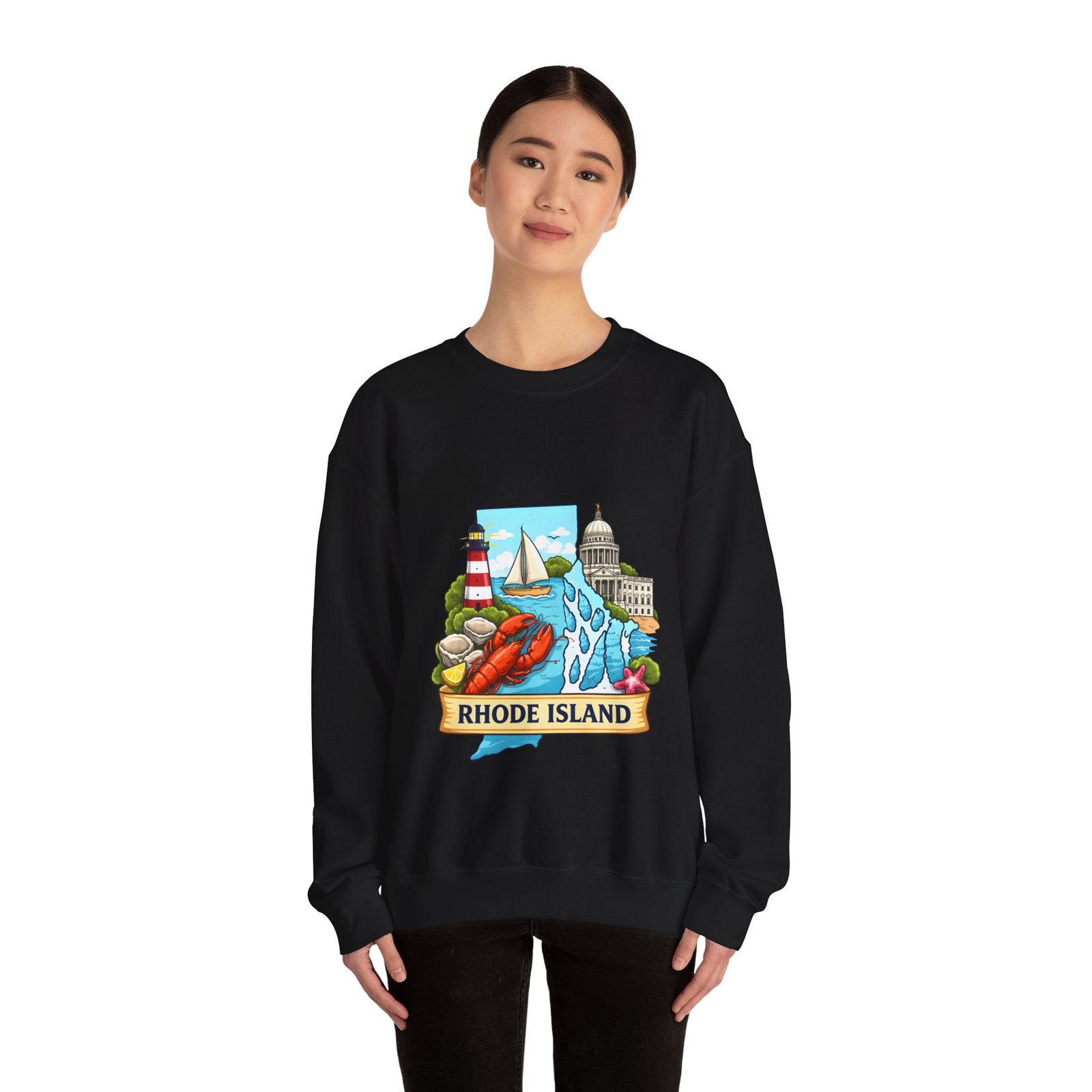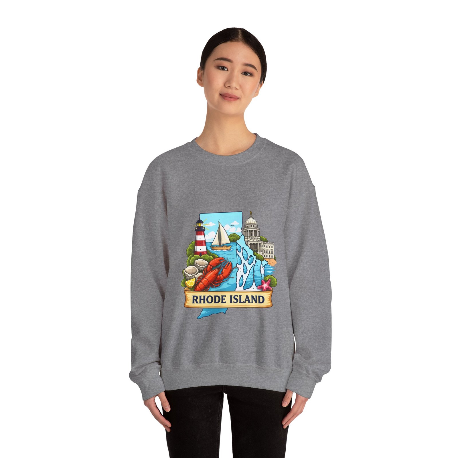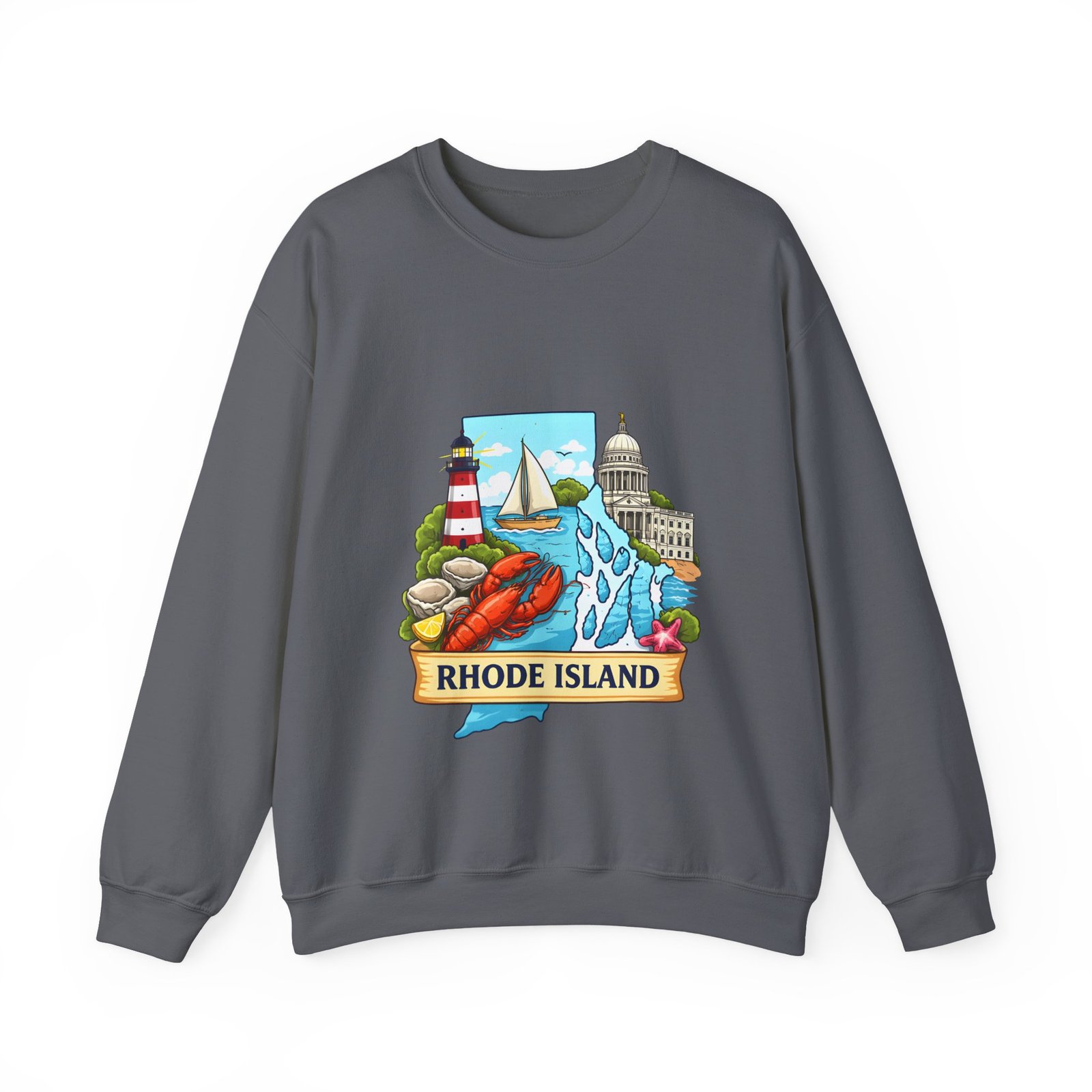 Rhode Island Scenic Crewneck Sweatshirt – Coastal Lighthouse, Sailboat & Capitol Design