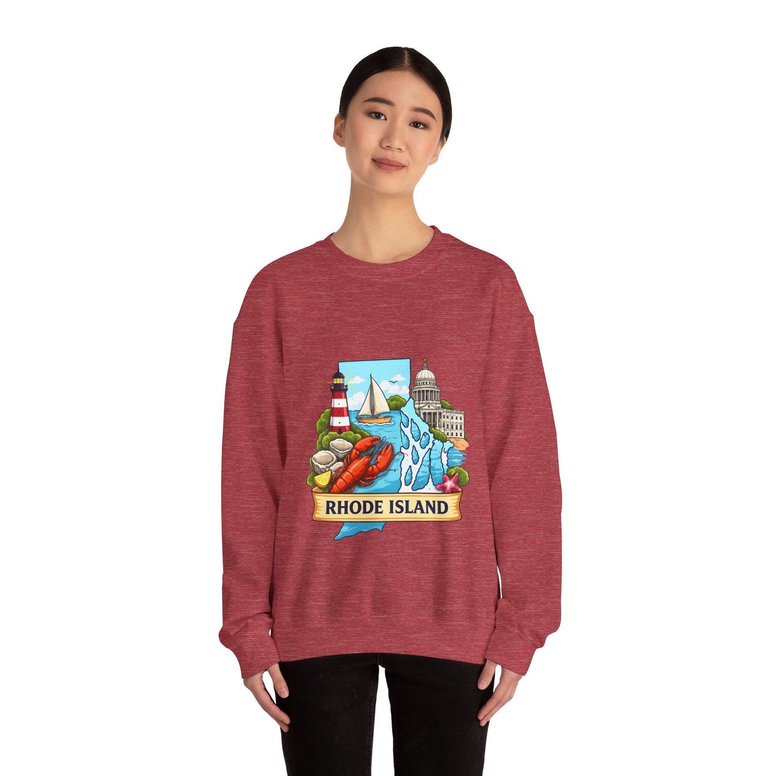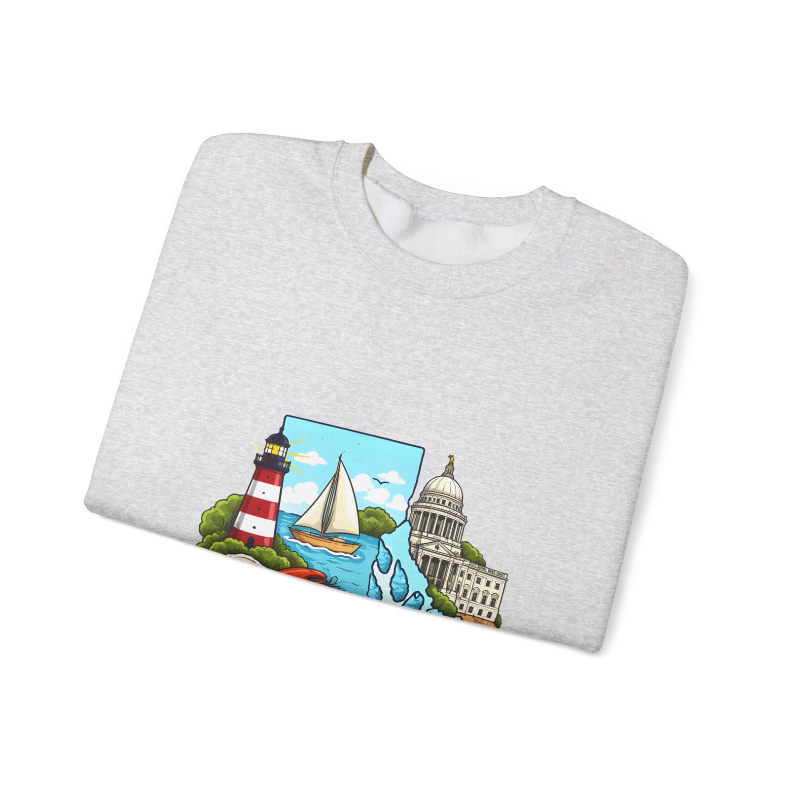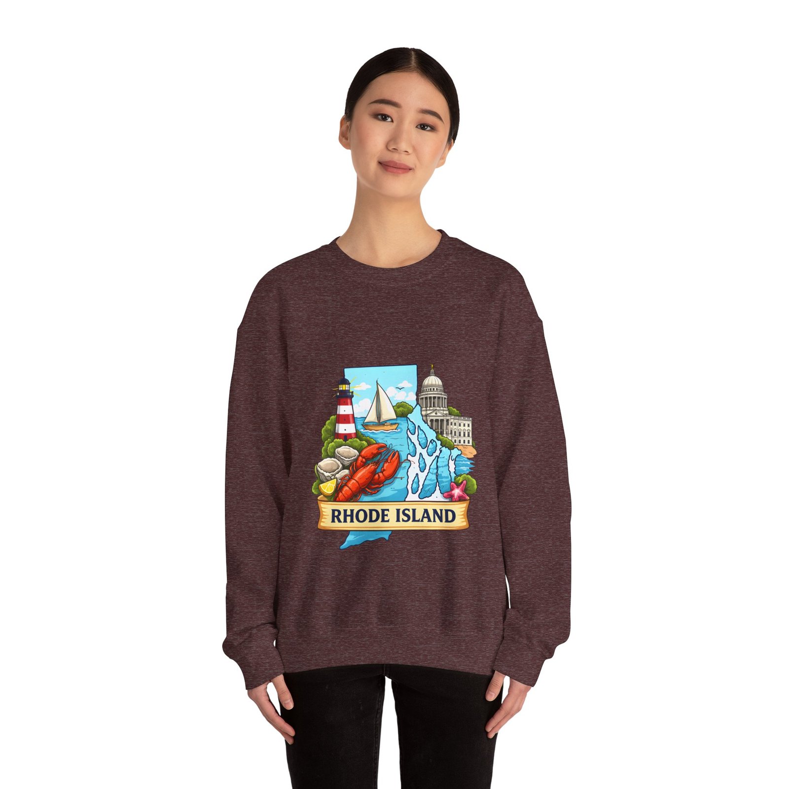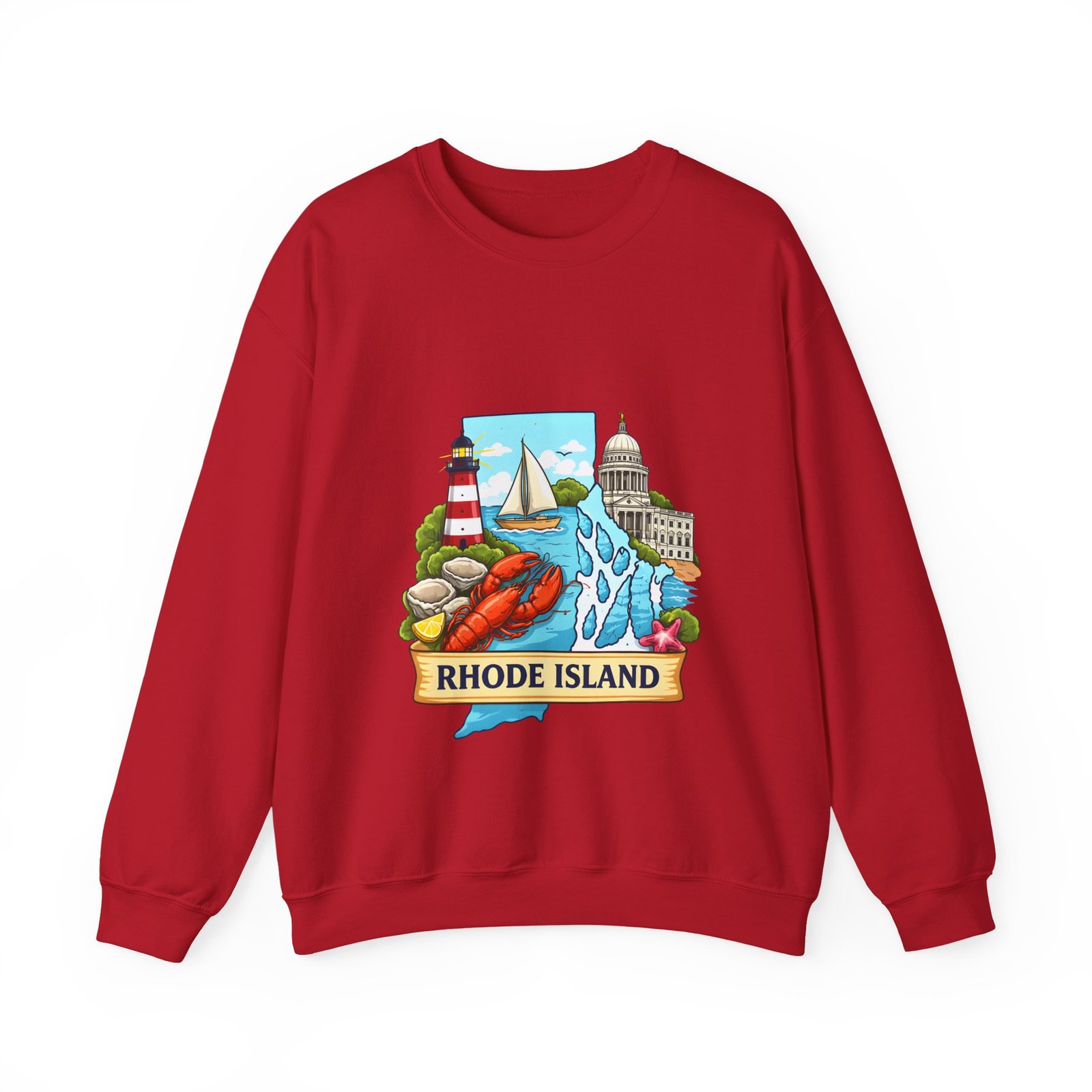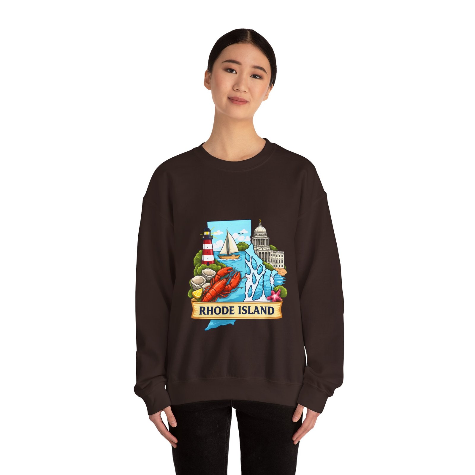 Rhode Island Scenic Crewneck Sweatshirt – Coastal Lighthouse, Sailboat & Capitol Design