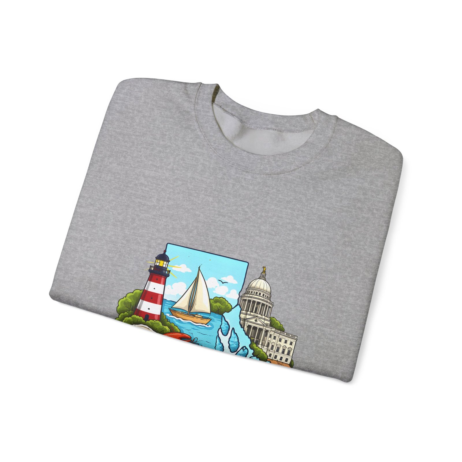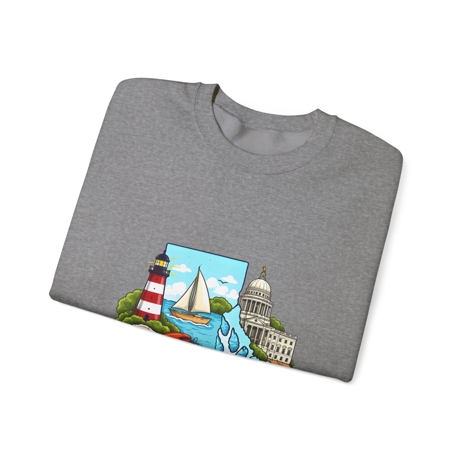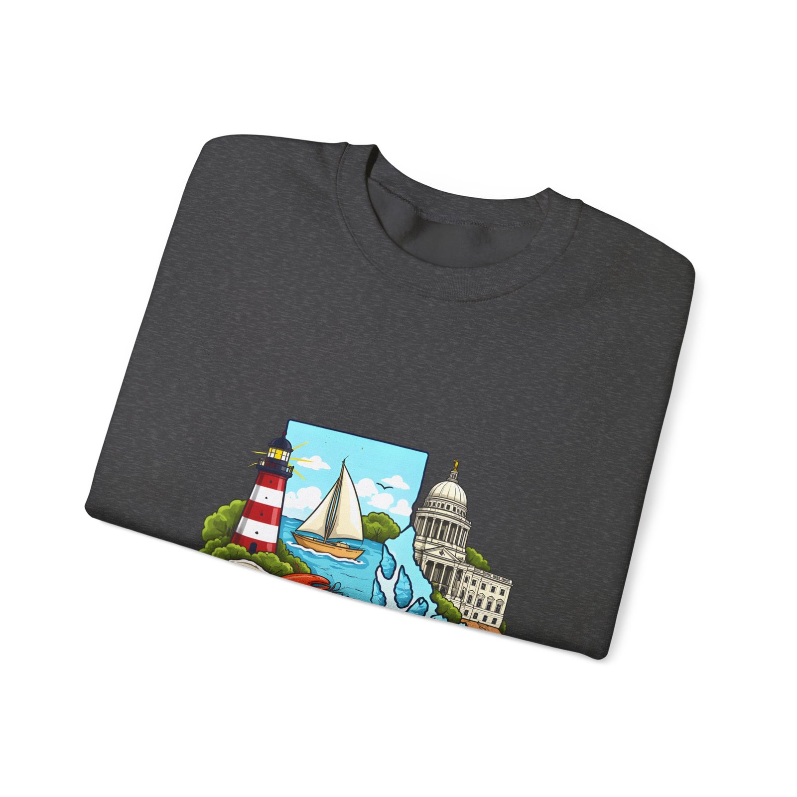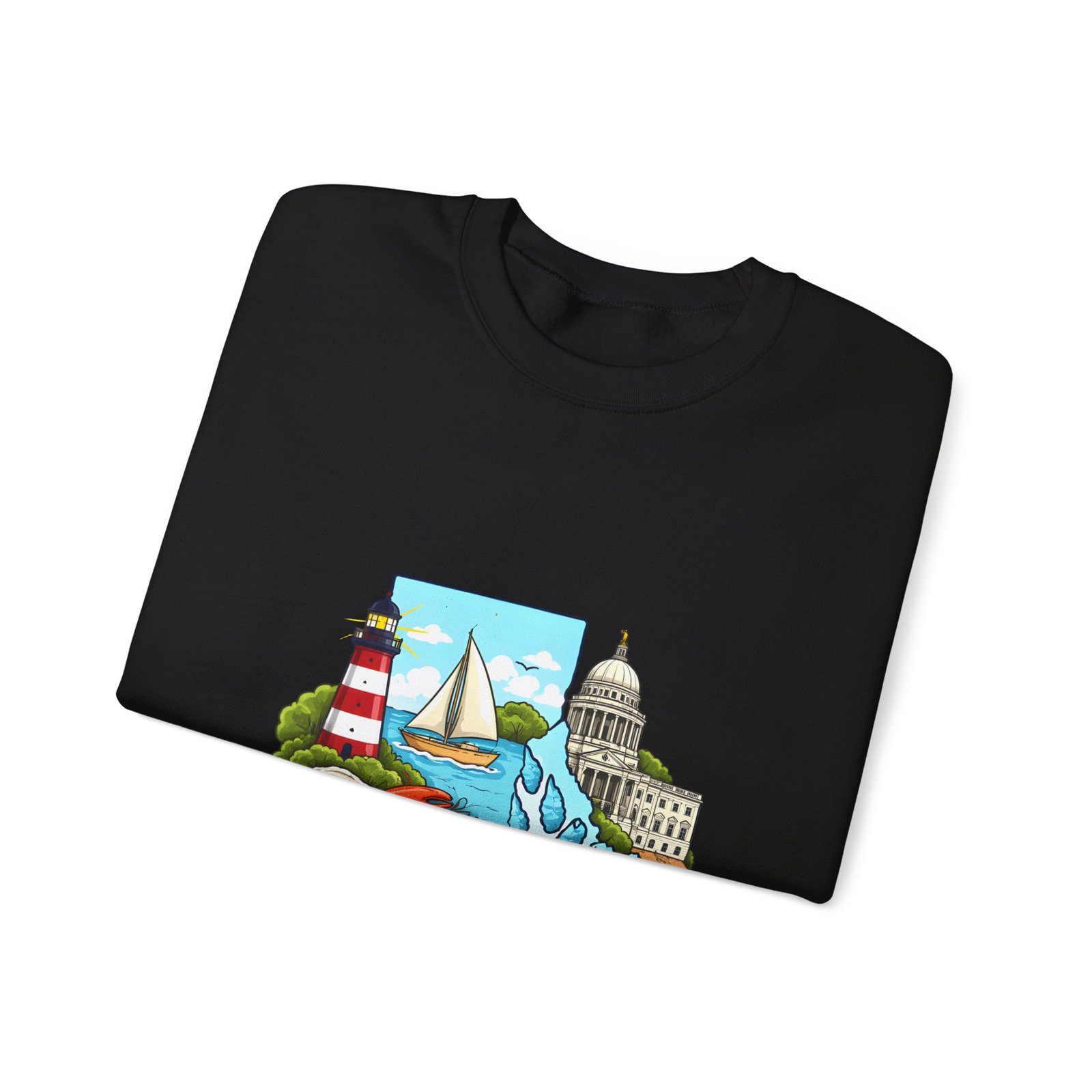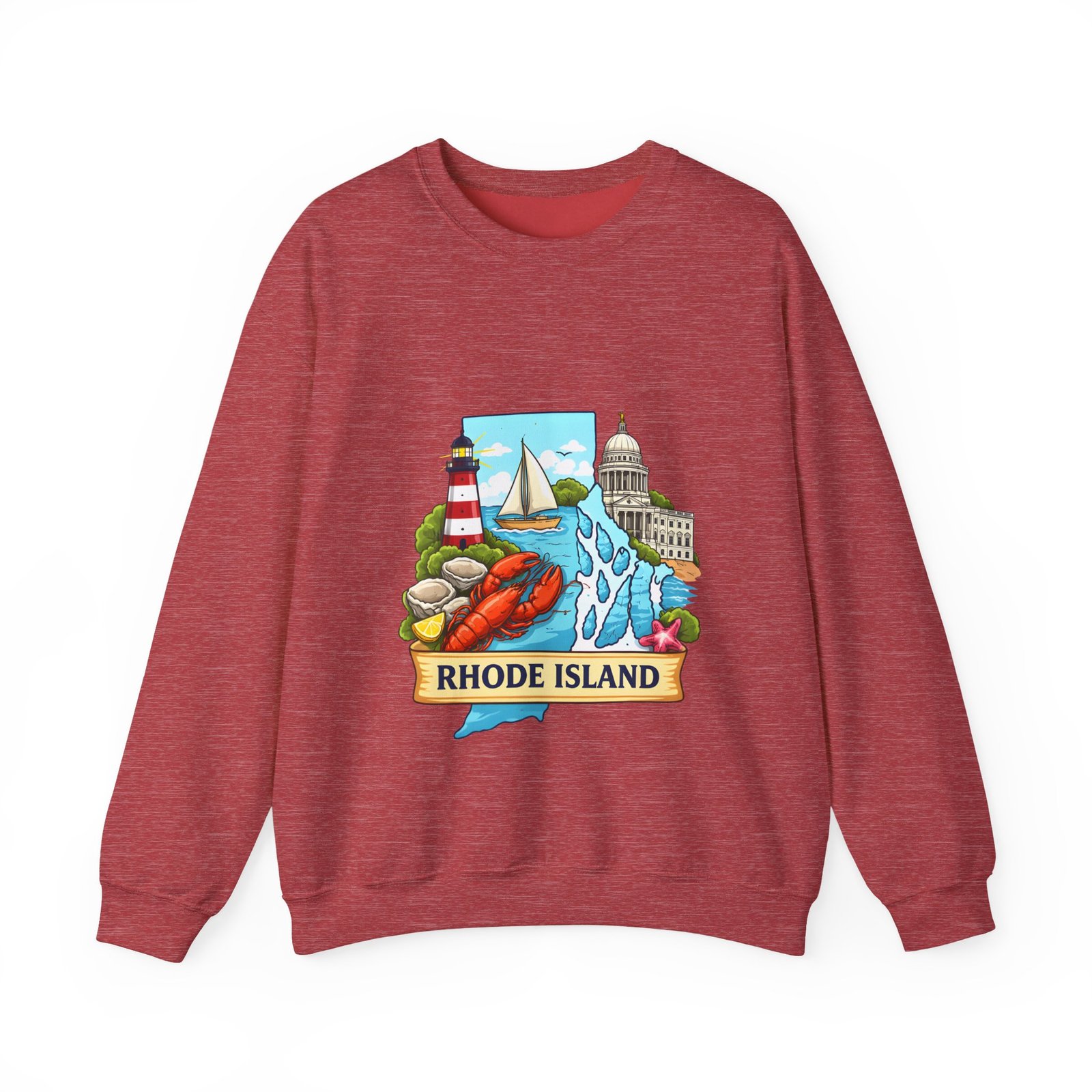 Rhode Island Scenic Crewneck Sweatshirt – Coastal Lighthouse, Sailboat & Capitol Design