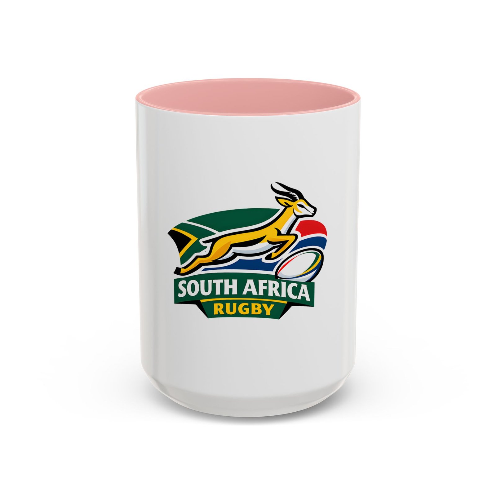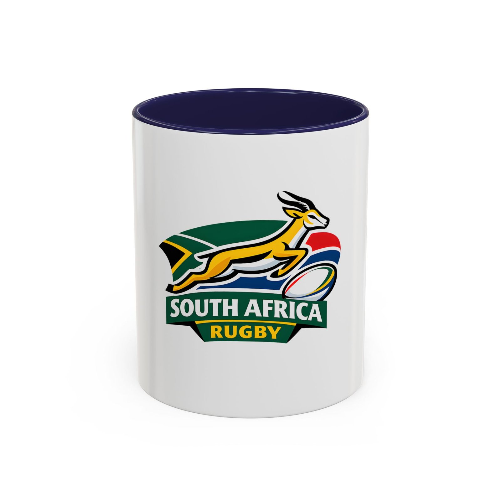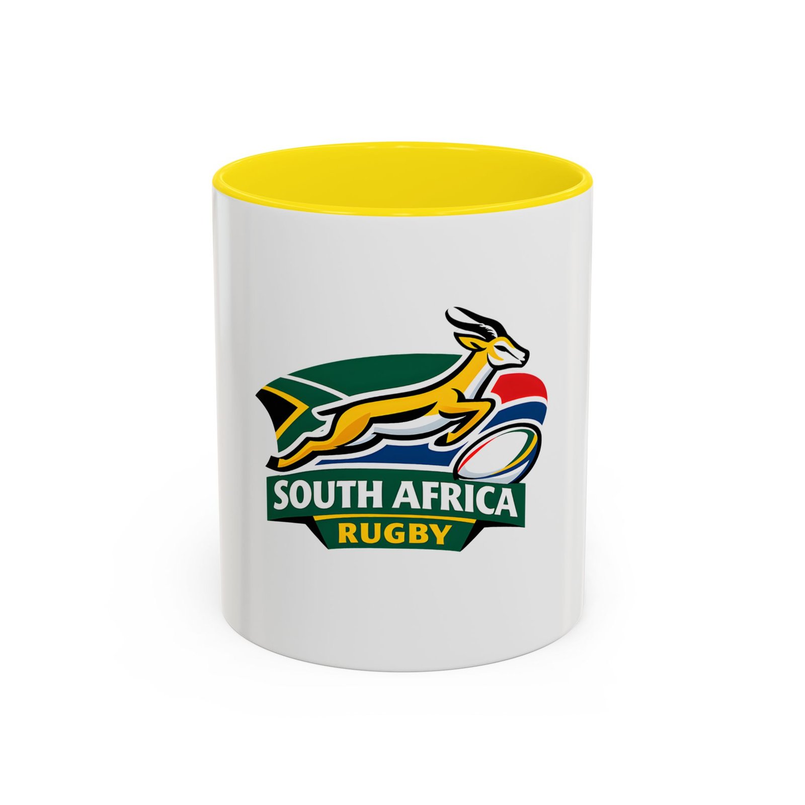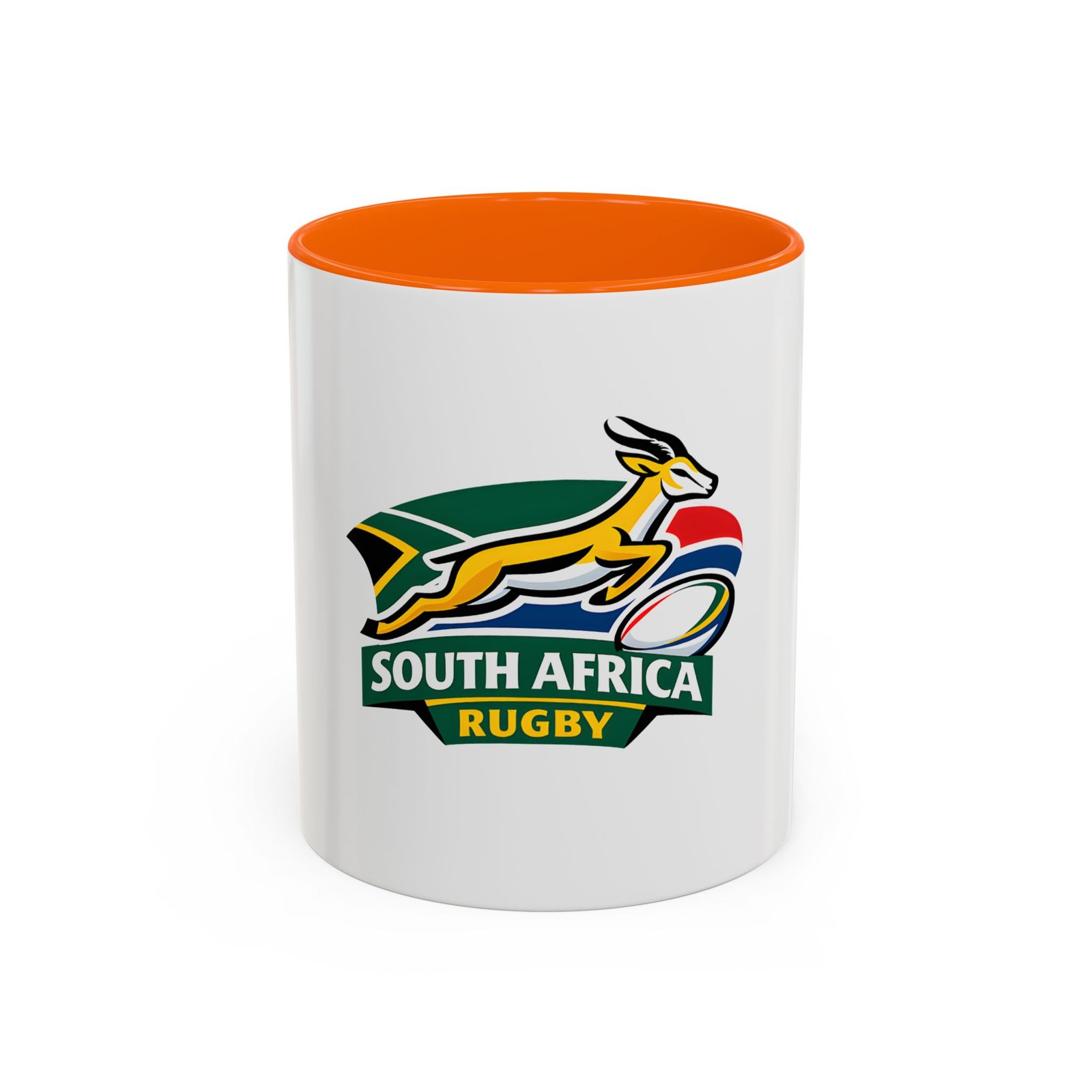 A bold, color-contrast ceramic mug celebrating South African rugby spirit. The clean white exterior showcases a vibrant Springbok emblem and rugby ball in rich team colors, while the colored interior and handle add a striking pop. Thick C-shaped handle and glossy finish make it comfortable to hold and display. Use it for your morning coffee, as a desk companion during match day, or as a proud reminder of national pride between sips. Durable printing stays bright through daily use and the microwave- and dishwasher-safe construction makes it easy to live with.