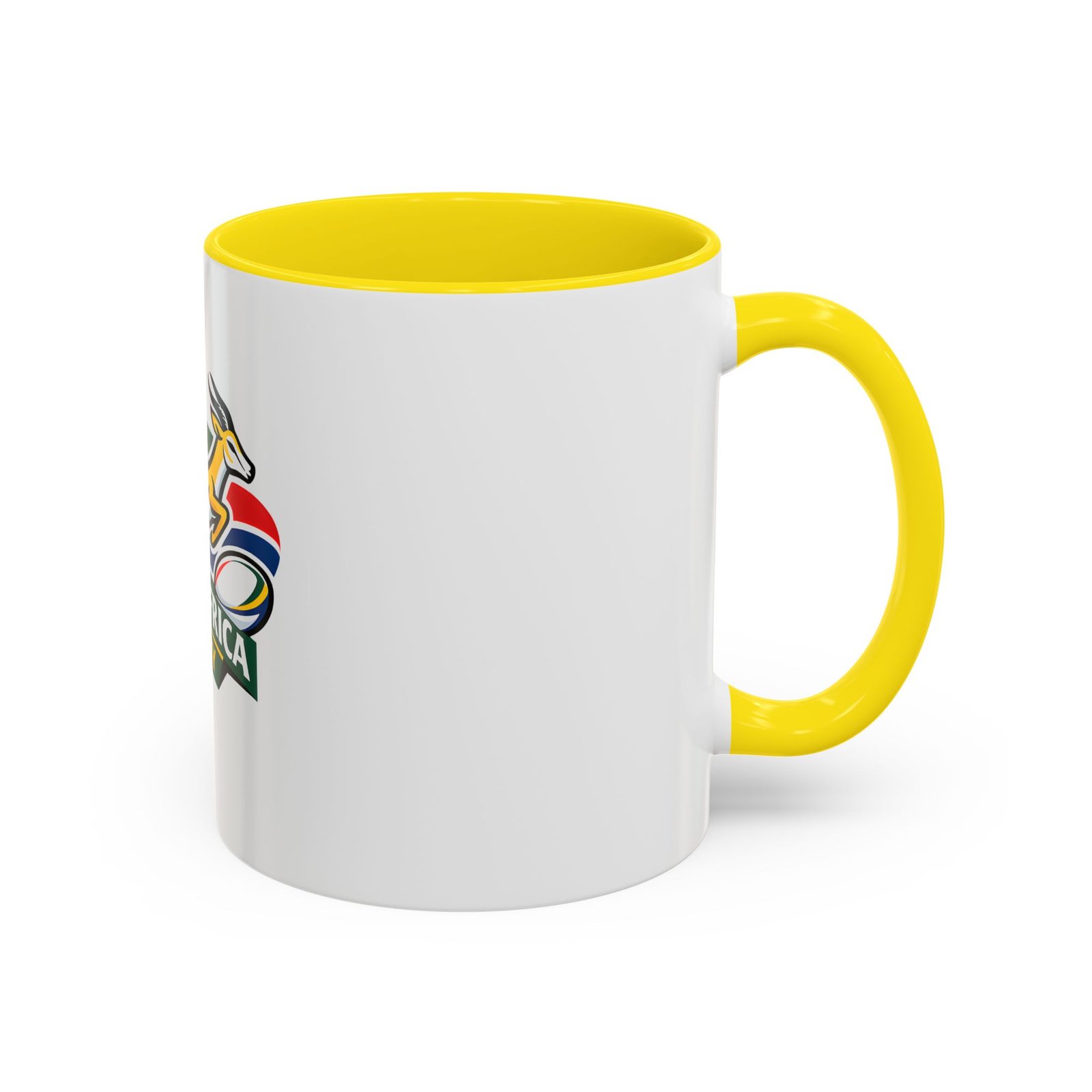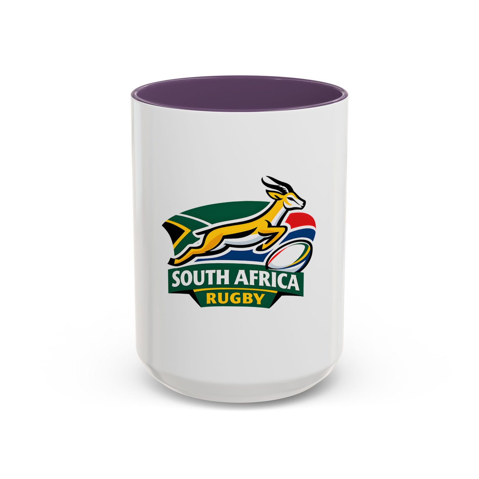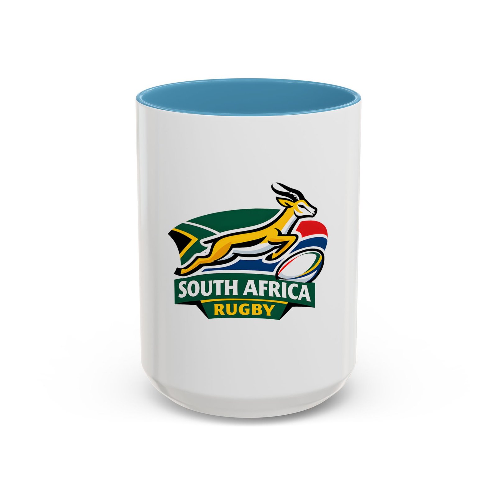 A bold, color-contrast ceramic mug celebrating South African rugby spirit. The clean white exterior showcases a vibrant Springbok emblem and rugby ball in rich team colors, while the colored interior and handle add a striking pop. Thick C-shaped handle and glossy finish make it comfortable to hold and display. Use it for your morning coffee, as a desk companion during match day, or as a proud reminder of national pride between sips. Durable printing stays bright through daily use and the microwave- and dishwasher-safe construction makes it easy to live with.