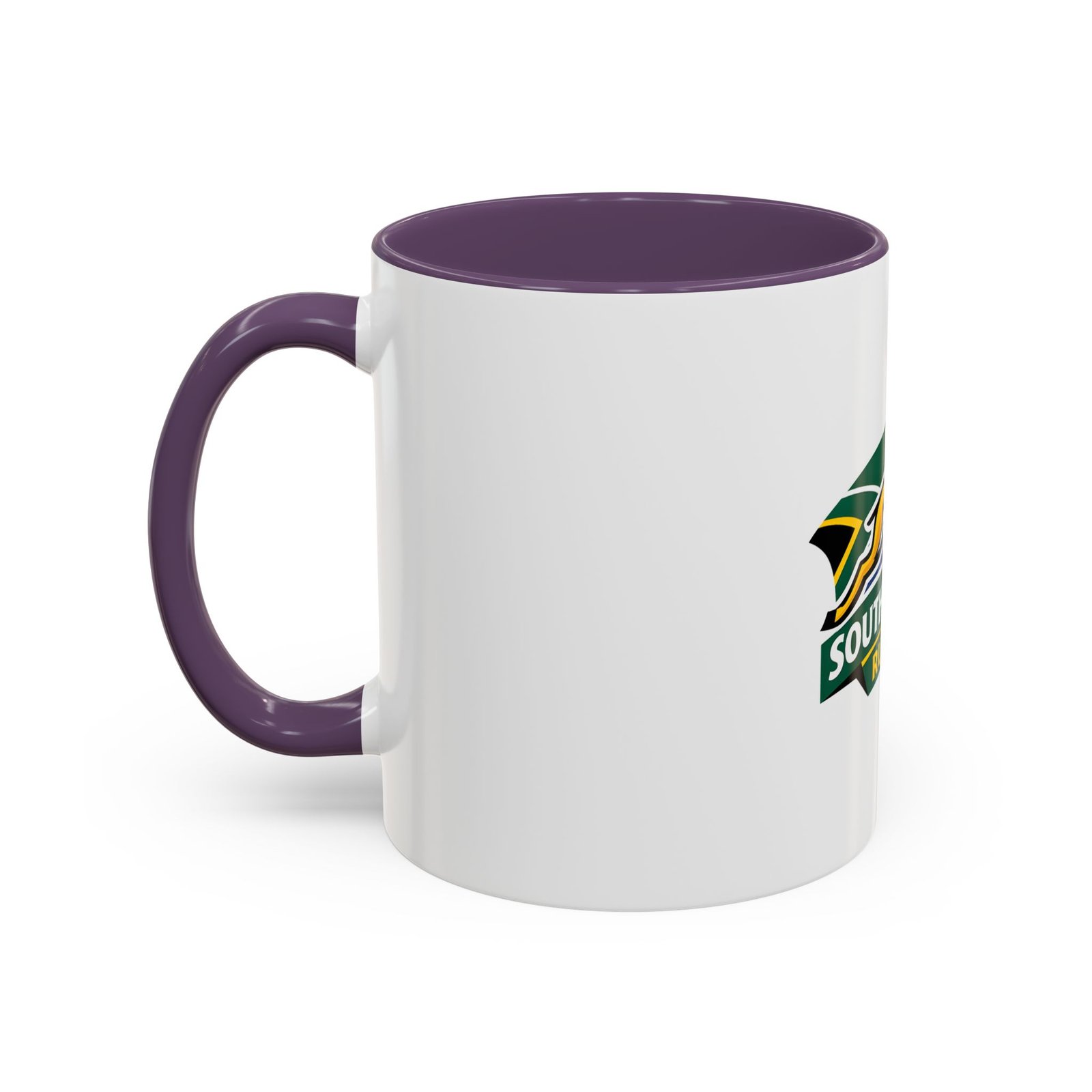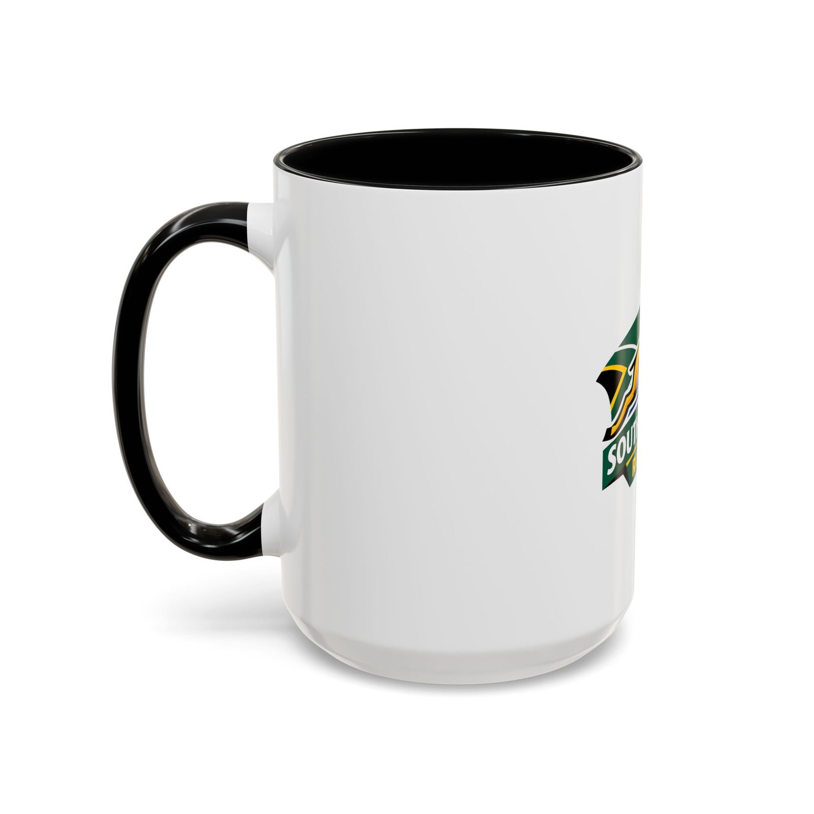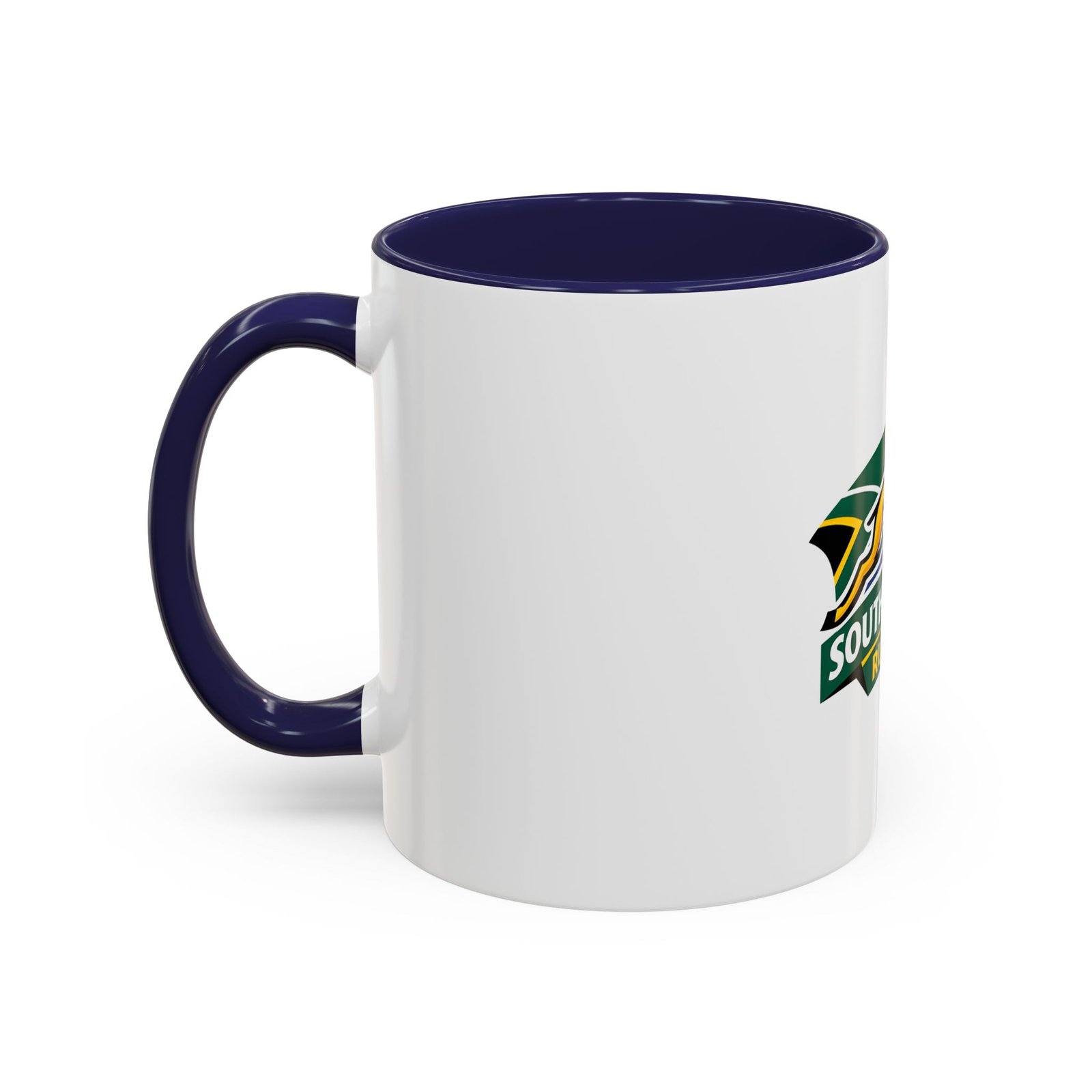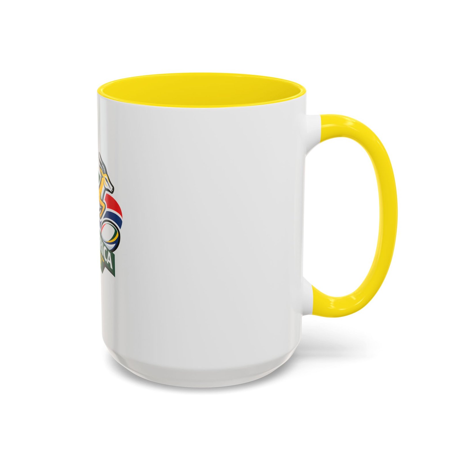 A bold, color-contrast ceramic mug celebrating South African rugby spirit. The clean white exterior showcases a vibrant Springbok emblem and rugby ball in rich team colors, while the colored interior and handle add a striking pop. Thick C-shaped handle and glossy finish make it comfortable to hold and display. Use it for your morning coffee, as a desk companion during match day, or as a proud reminder of national pride between sips. Durable printing stays bright through daily use and the microwave- and dishwasher-safe construction makes it easy to live with.