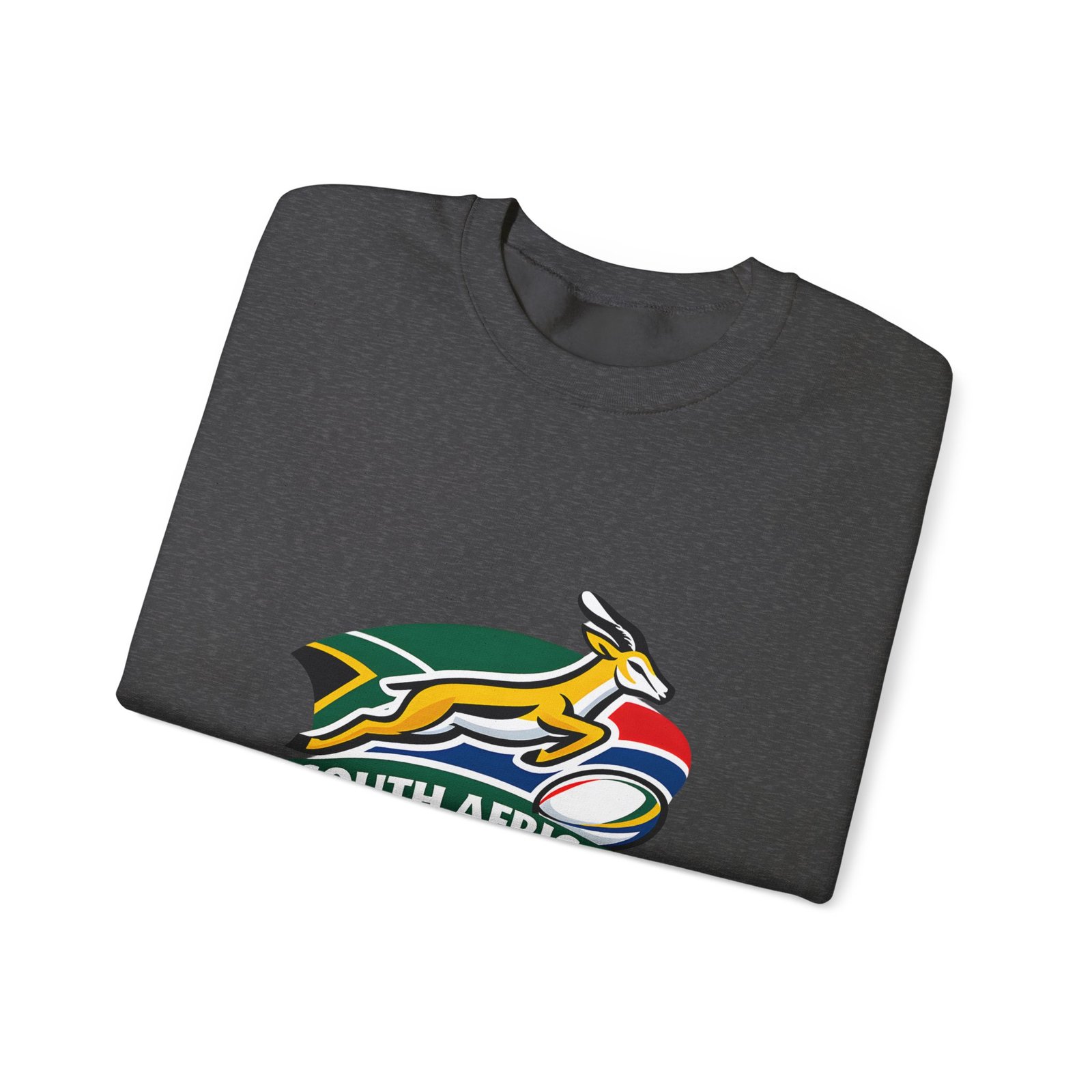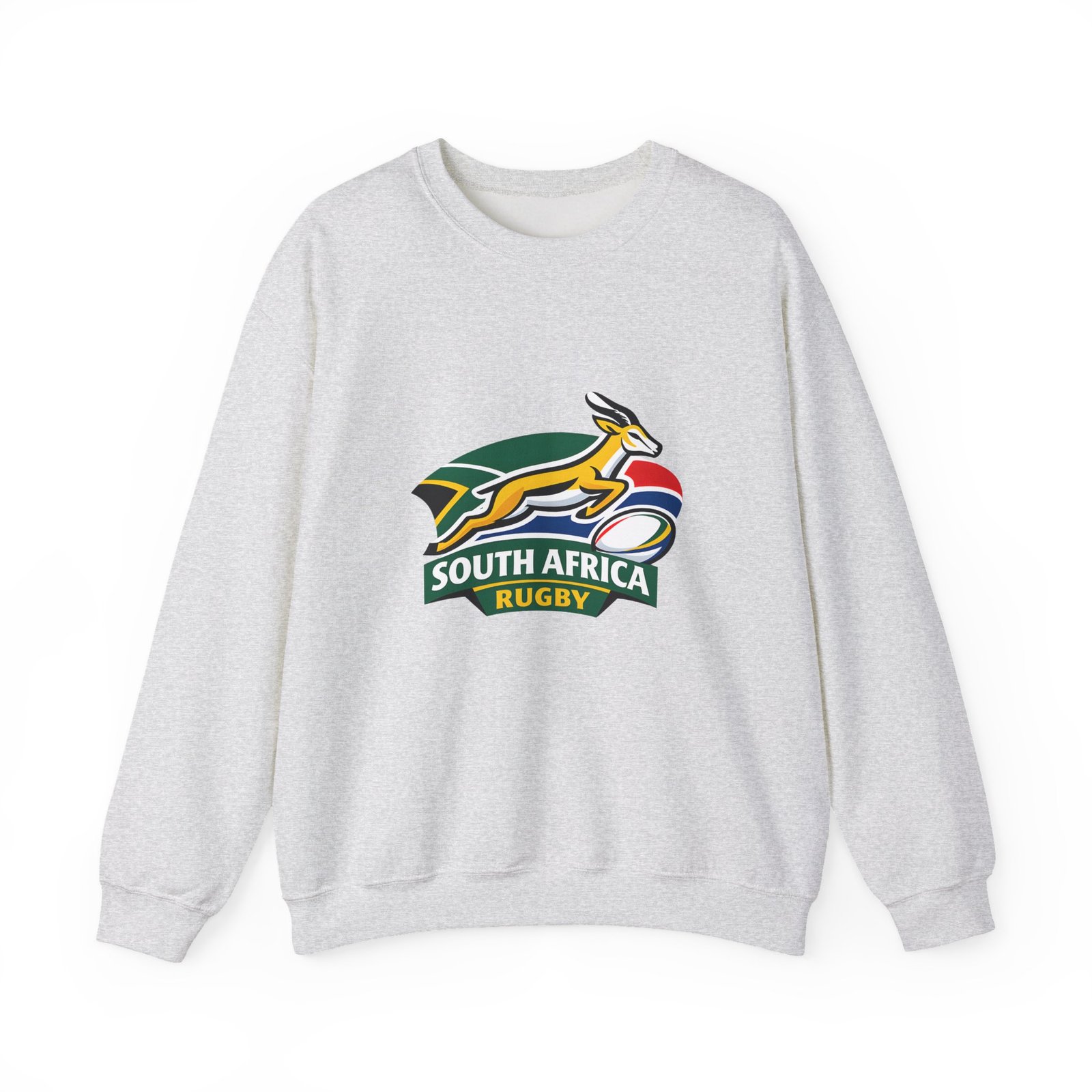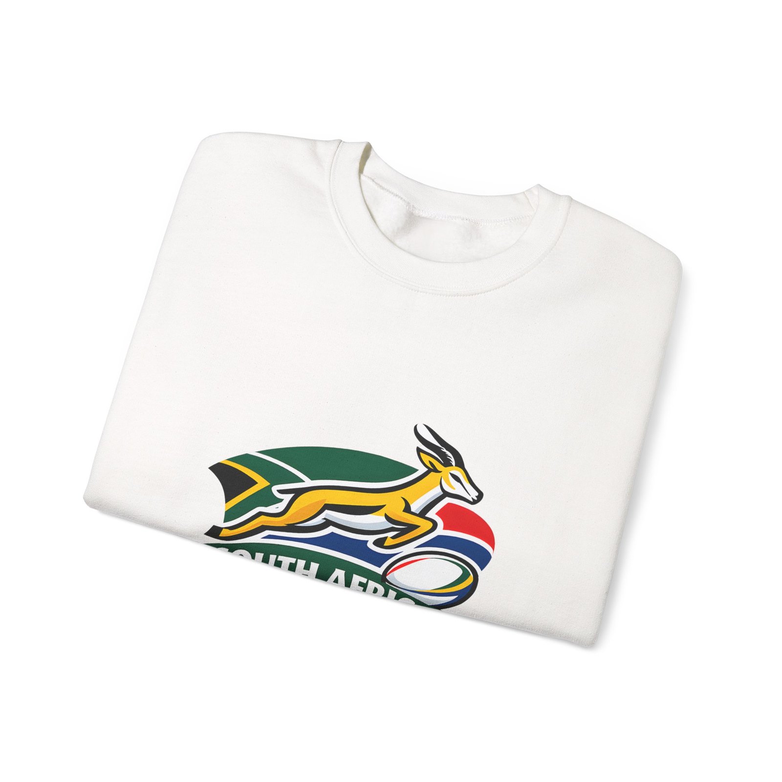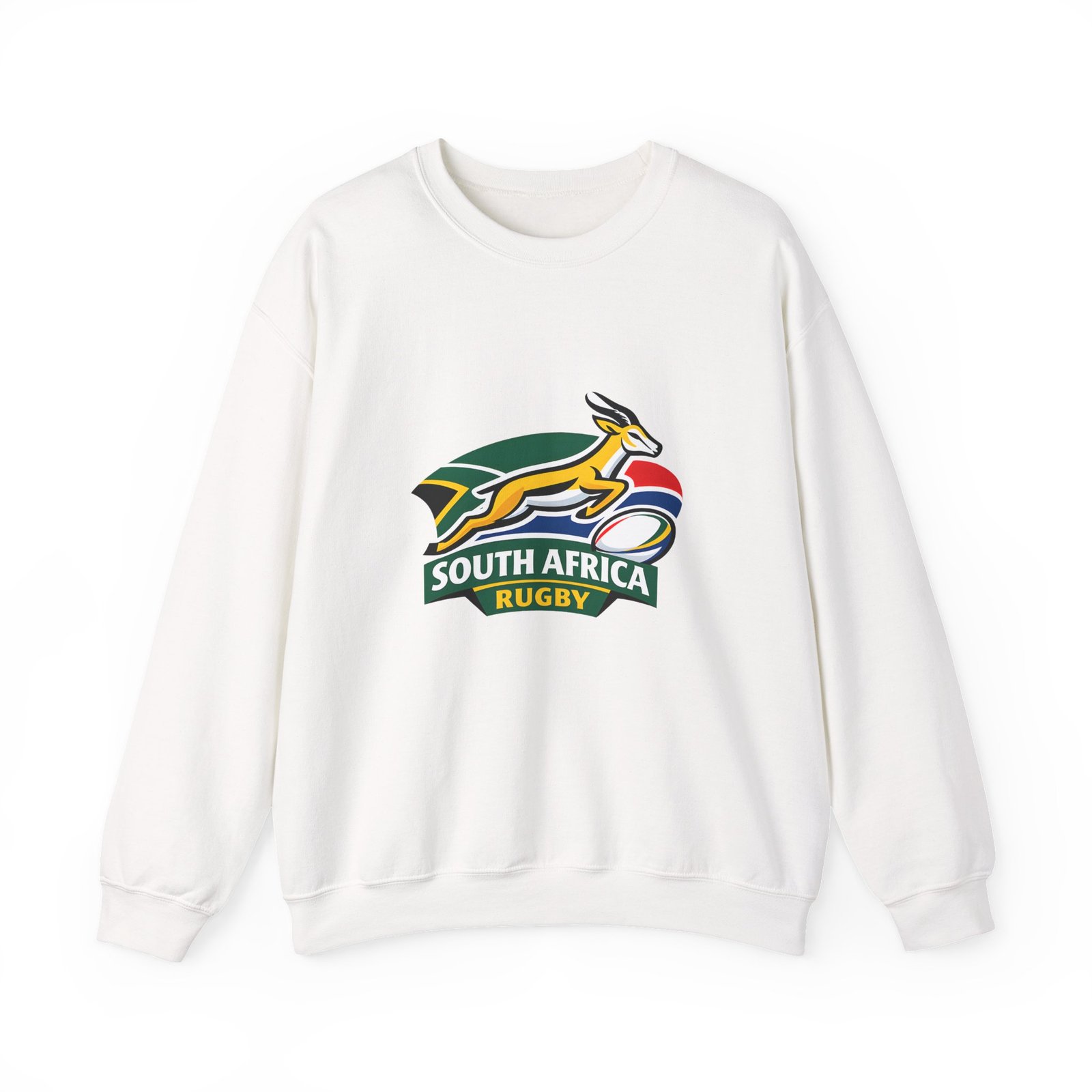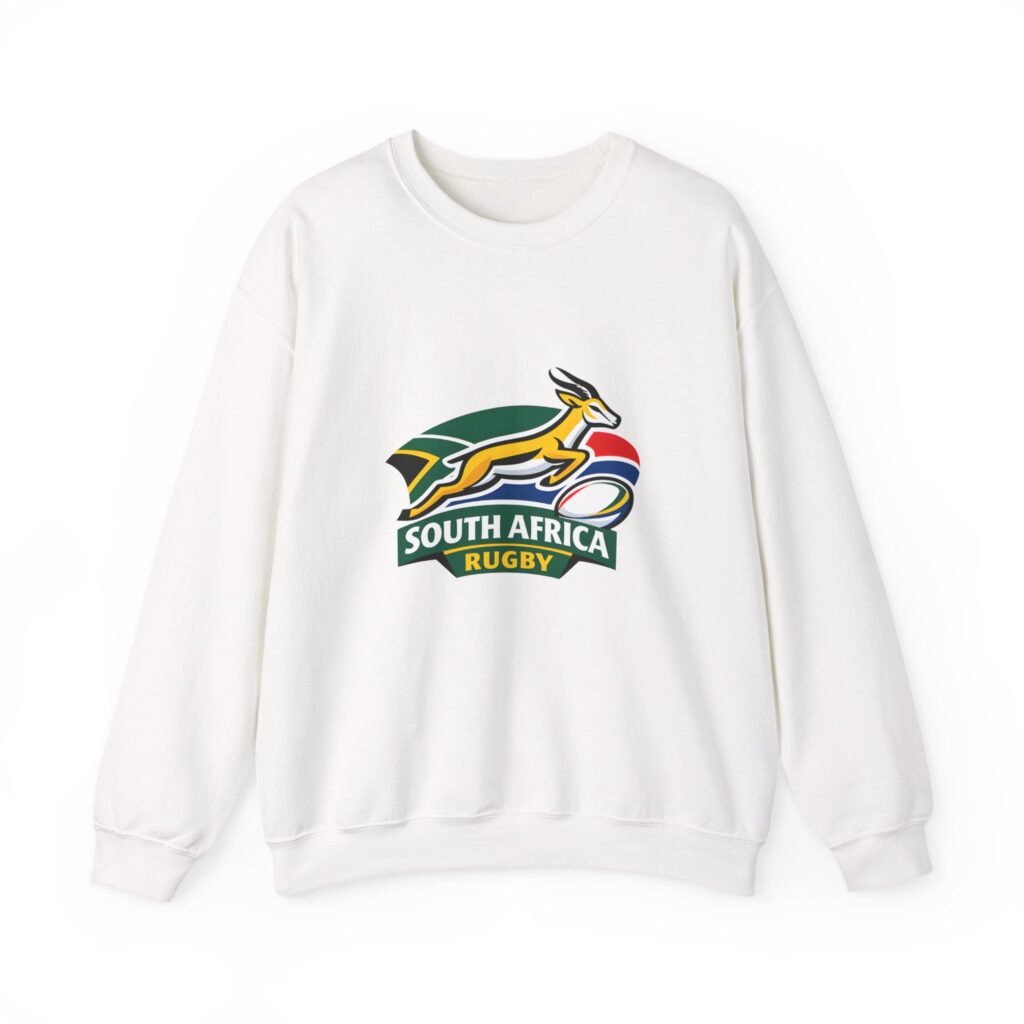 This soft, midweight crewneck carries the quiet confidence of match-day fandom. The clean white sweatshirt features a bold embroidered South Africa rugby emblem on the chest — a leaping springbok over a waving flag — that reads like a badge of belonging. It sits comfortably in the wardrobe: roomy enough for layering, but tailored by a classic crew neckline and ribbed cuffs for a neat silhouette. Wear it to chilly training runs, weekend watch parties, or while running errands; it brings the warmth of shared chants and the calm energy of team pride without shouting. The subtle craft details — tubular knit construction, reinforced double-needle stitching, and a tear-away label — keep it feeling smooth against skin and built to last season after season.