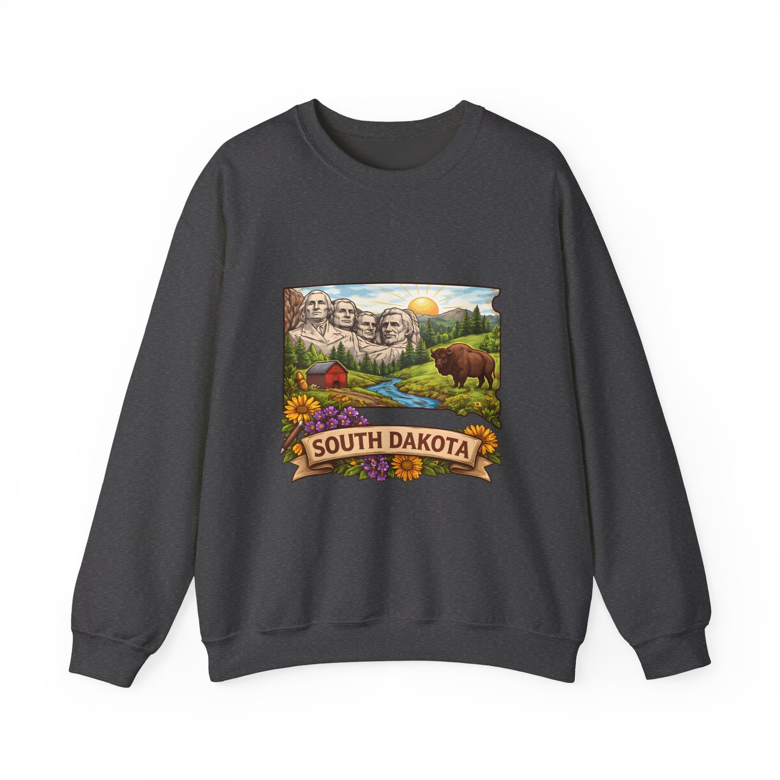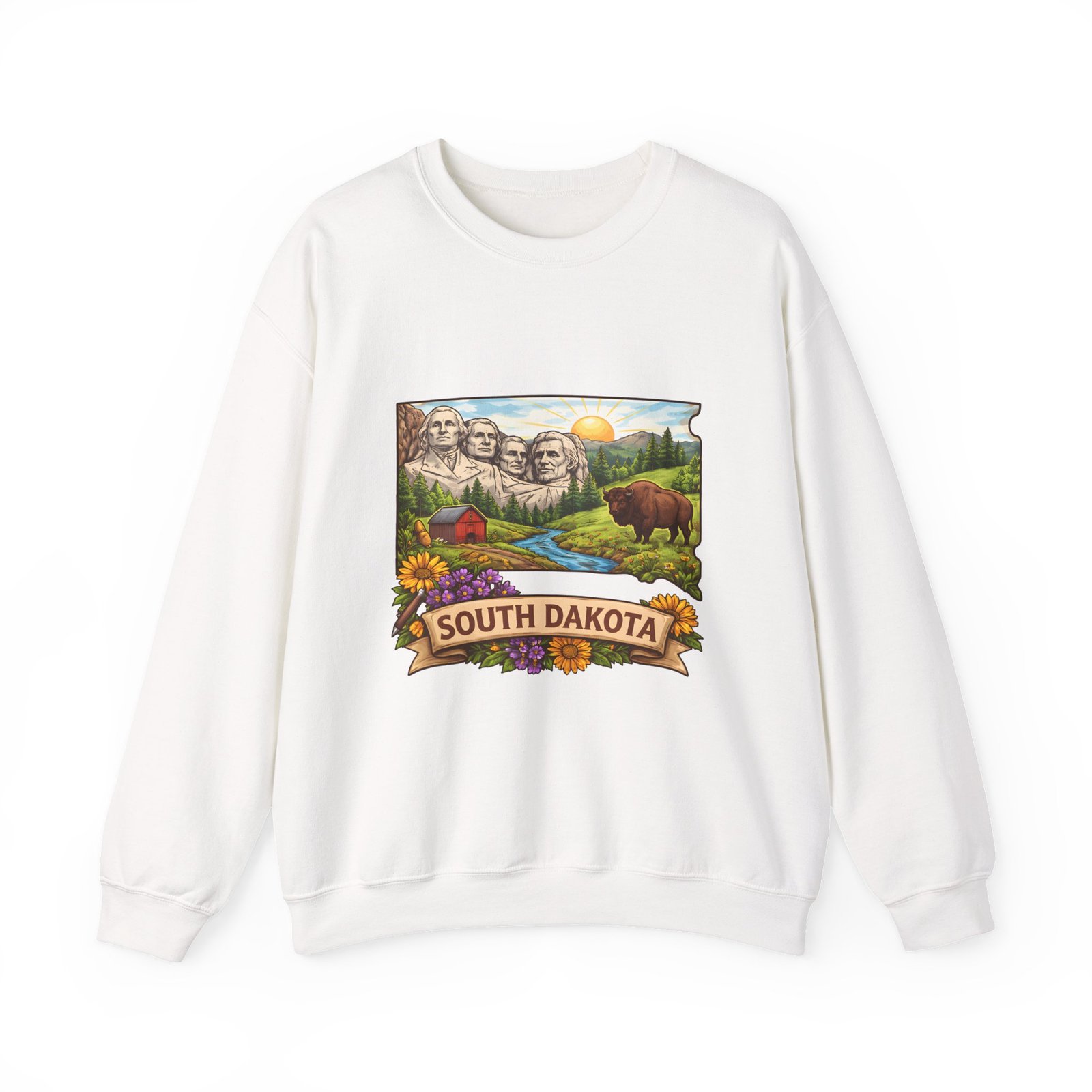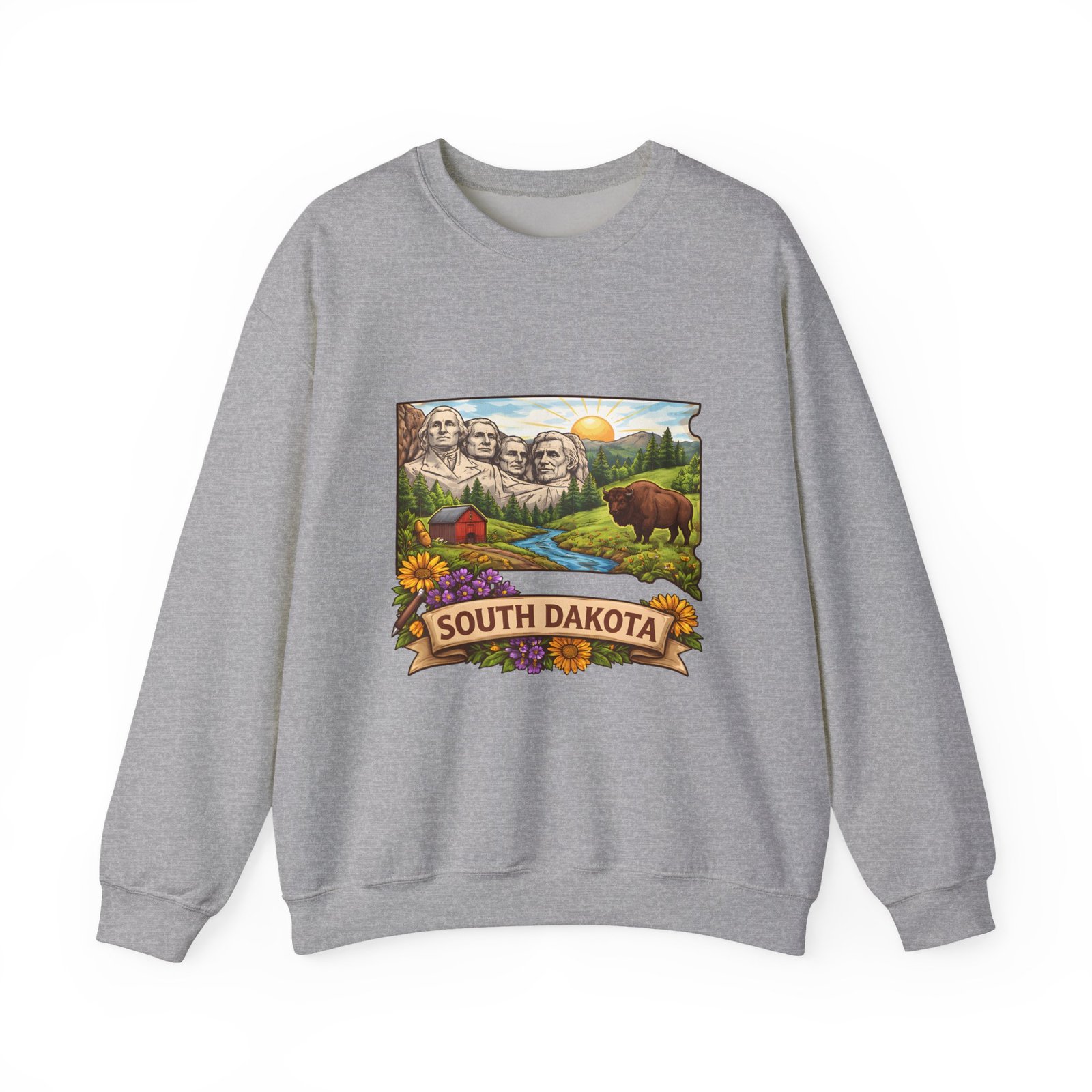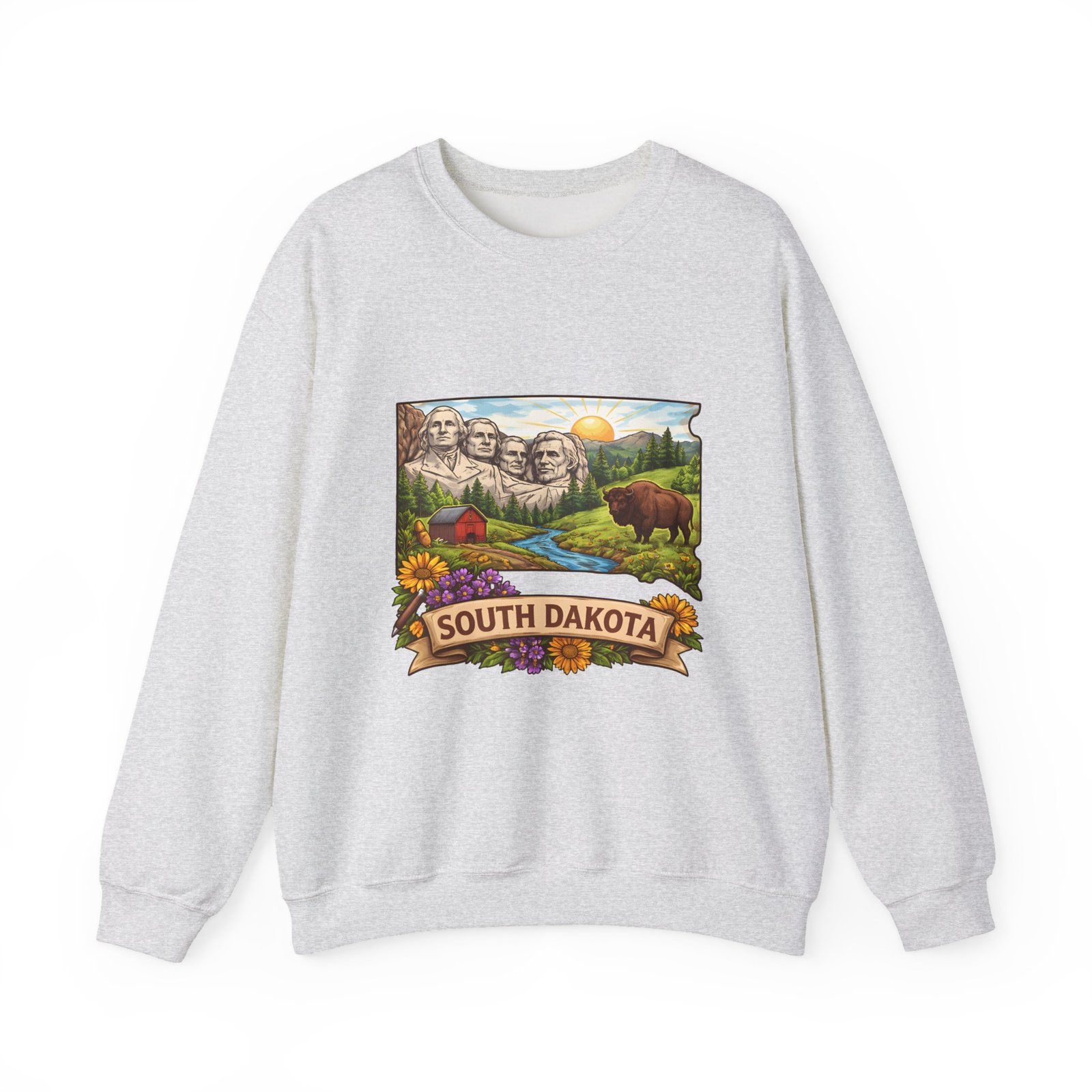 This cozy crewneck sweatshirt brings a sunlit South Dakota landscape to your everyday rhythm. Soft, midweight fleece holds a detailed, full-color scene—Mount Rushmore, rolling prairies, a wandering river and a bear framed by wildflowers—so every wear feels like a quiet stroll through familiar terrain. The classic cut and ribbed collar settle easily into layered outfits for road trips, bonfires, or slow mornings at the cabin. Durable double-needle stitching and thoughtfully placed printing and embroidery options mean this sweat will age like a memory: warm, comfortable, and easy to reach for whenever you want to feel rooted to that place.