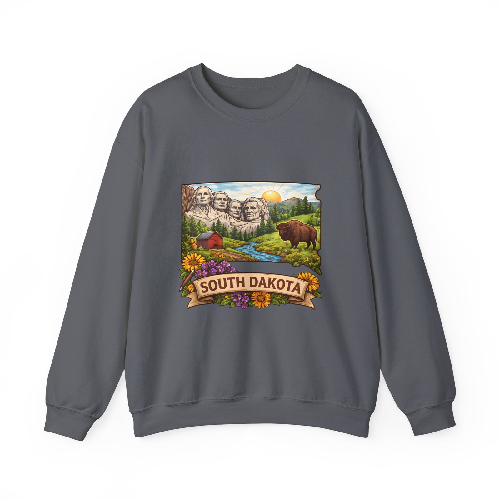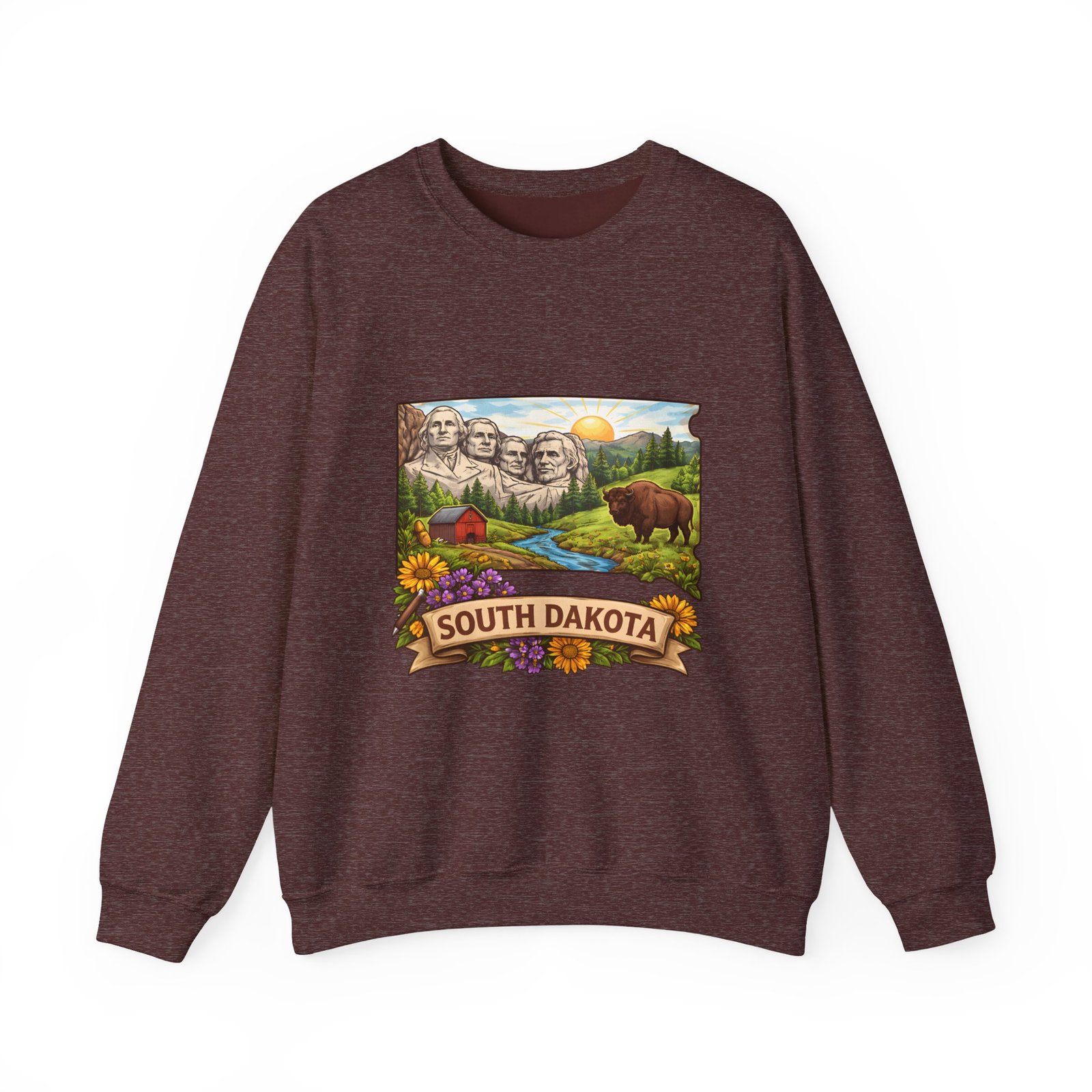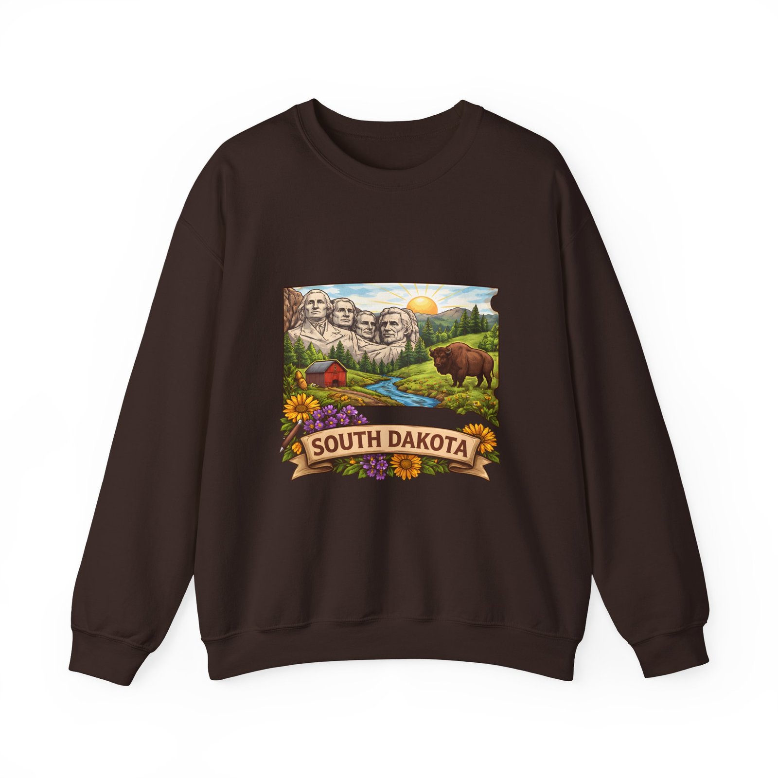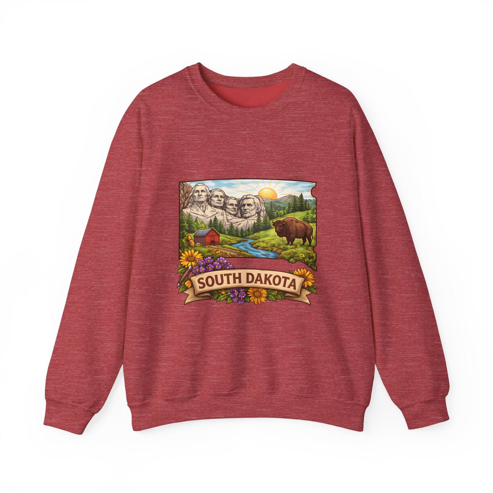 This cozy crewneck sweatshirt brings a sunlit South Dakota landscape to your everyday rhythm. Soft, midweight fleece holds a detailed, full-color scene—Mount Rushmore, rolling prairies, a wandering river and a bear framed by wildflowers—so every wear feels like a quiet stroll through familiar terrain. The classic cut and ribbed collar settle easily into layered outfits for road trips, bonfires, or slow mornings at the cabin. Durable double-needle stitching and thoughtfully placed printing and embroidery options mean this sweat will age like a memory: warm, comfortable, and easy to reach for whenever you want to feel rooted to that place.