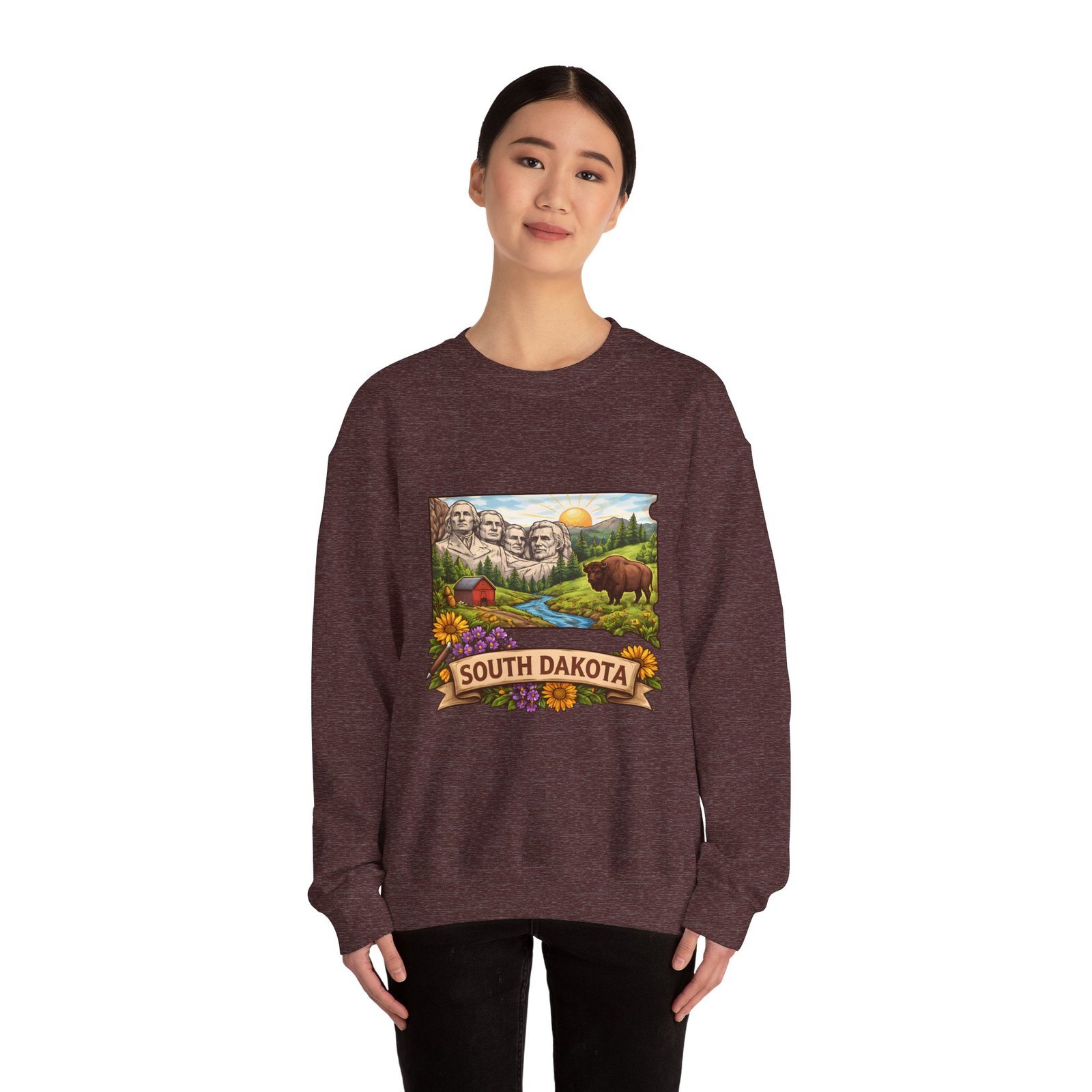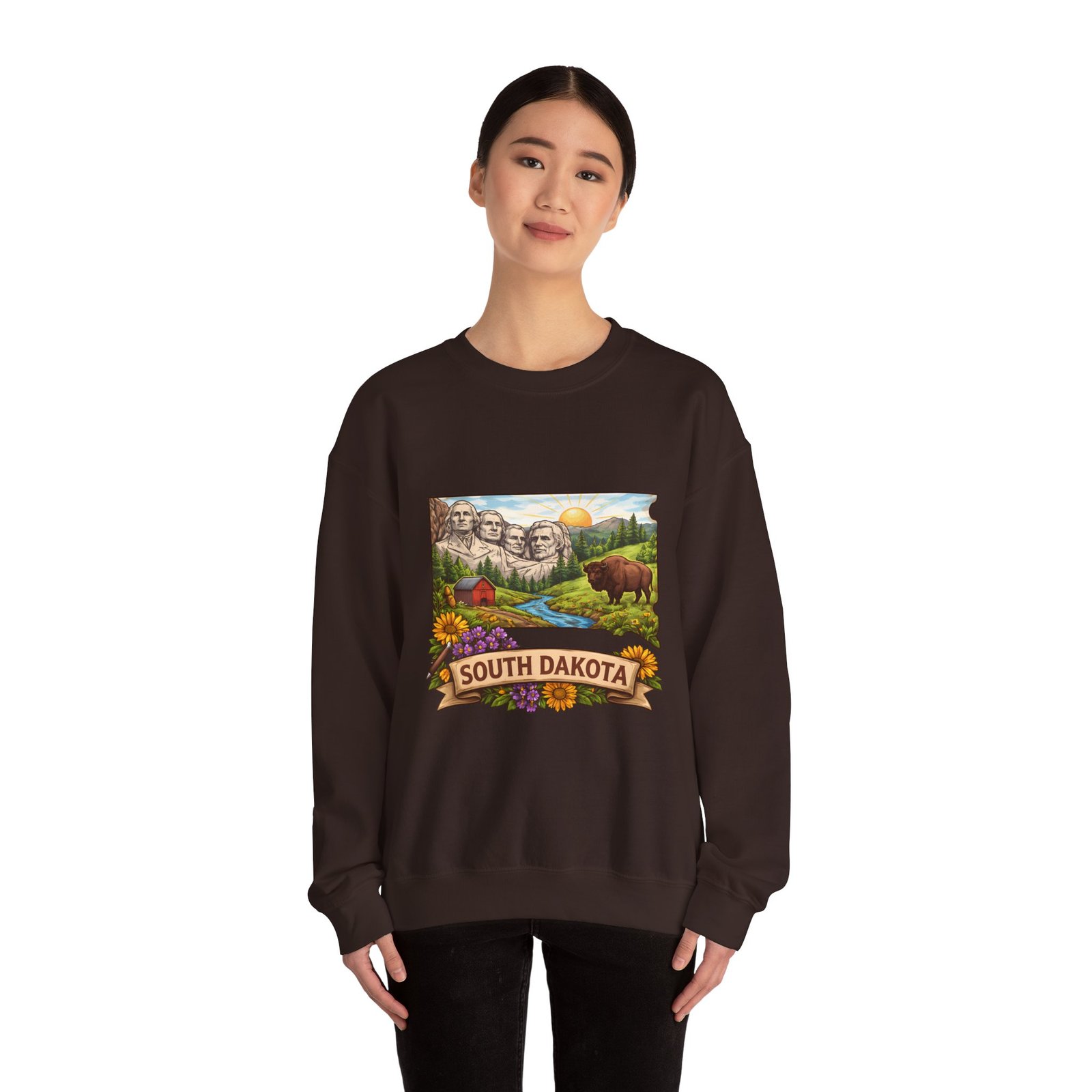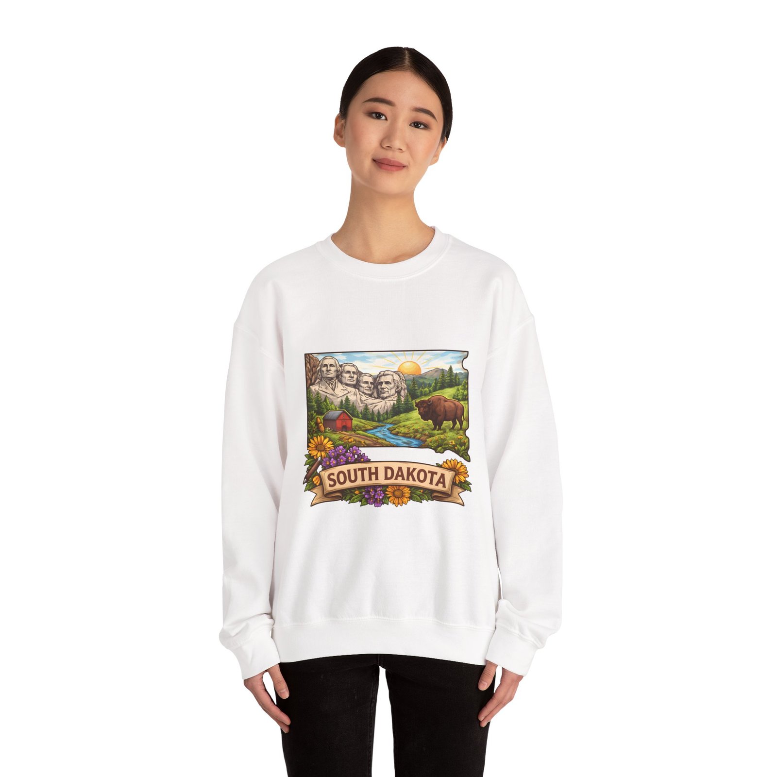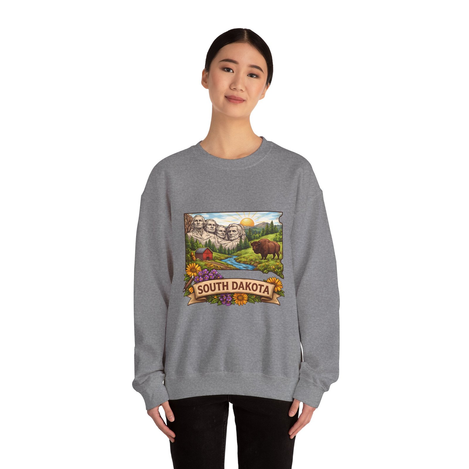 This cozy crewneck sweatshirt brings a sunlit South Dakota landscape to your everyday rhythm. Soft, midweight fleece holds a detailed, full-color scene—Mount Rushmore, rolling prairies, a wandering river and a bear framed by wildflowers—so every wear feels like a quiet stroll through familiar terrain. The classic cut and ribbed collar settle easily into layered outfits for road trips, bonfires, or slow mornings at the cabin. Durable double-needle stitching and thoughtfully placed printing and embroidery options mean this sweat will age like a memory: warm, comfortable, and easy to reach for whenever you want to feel rooted to that place.