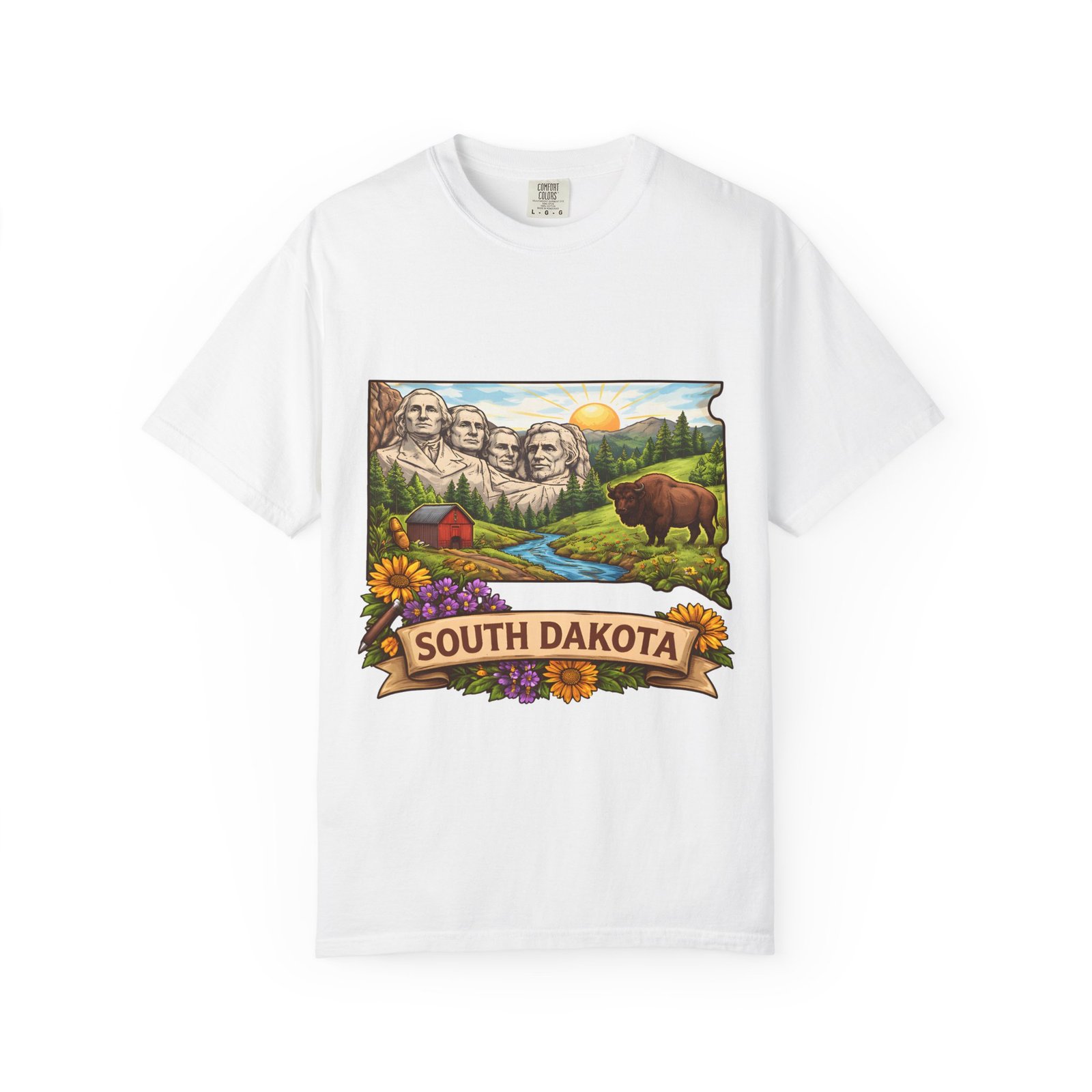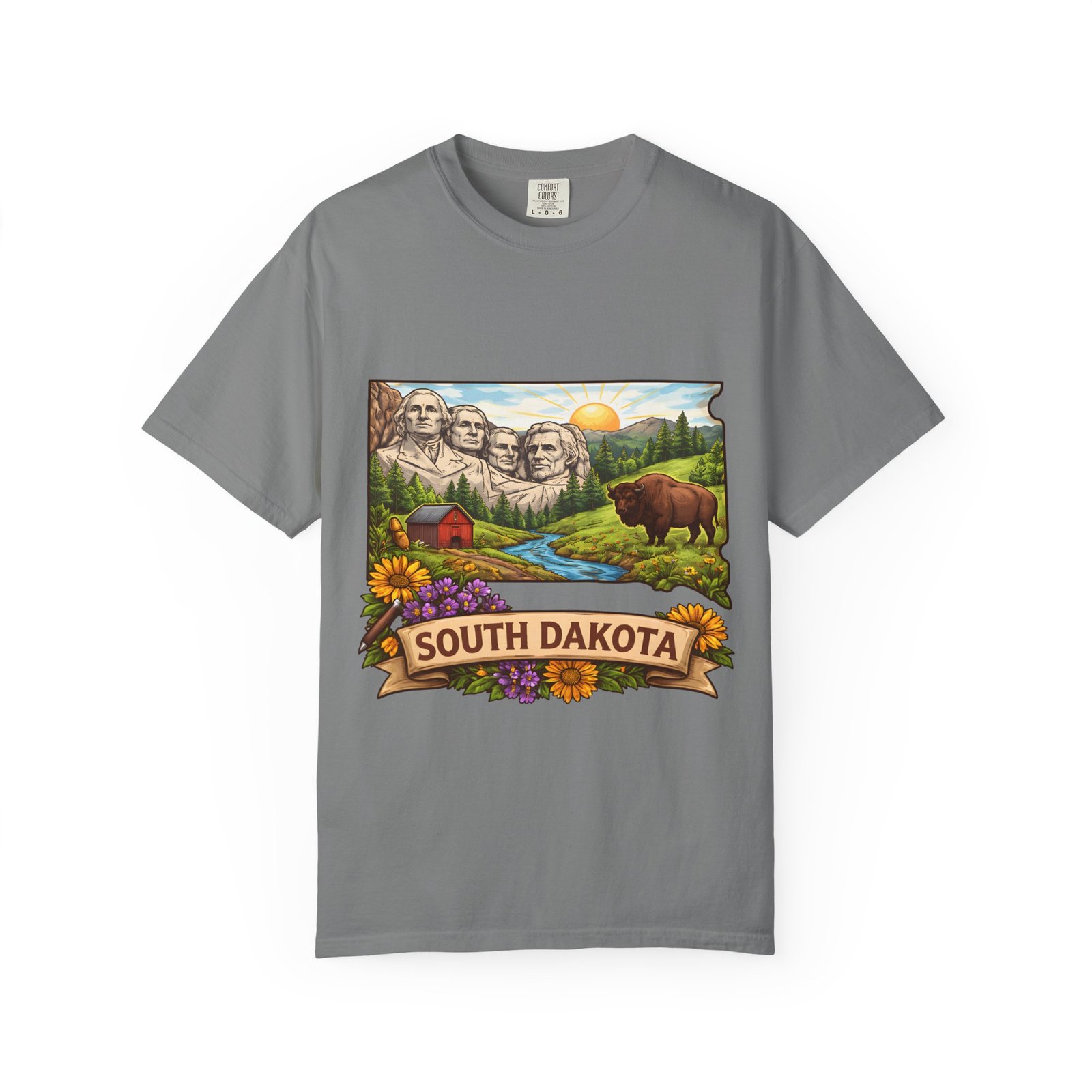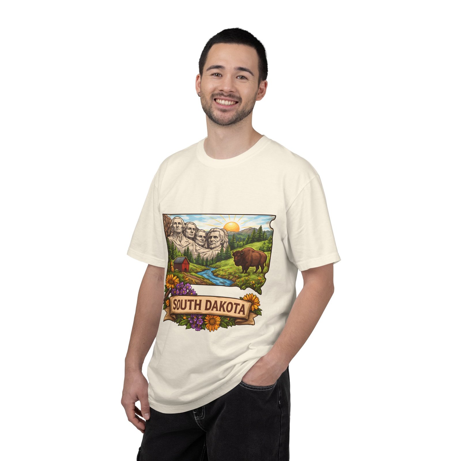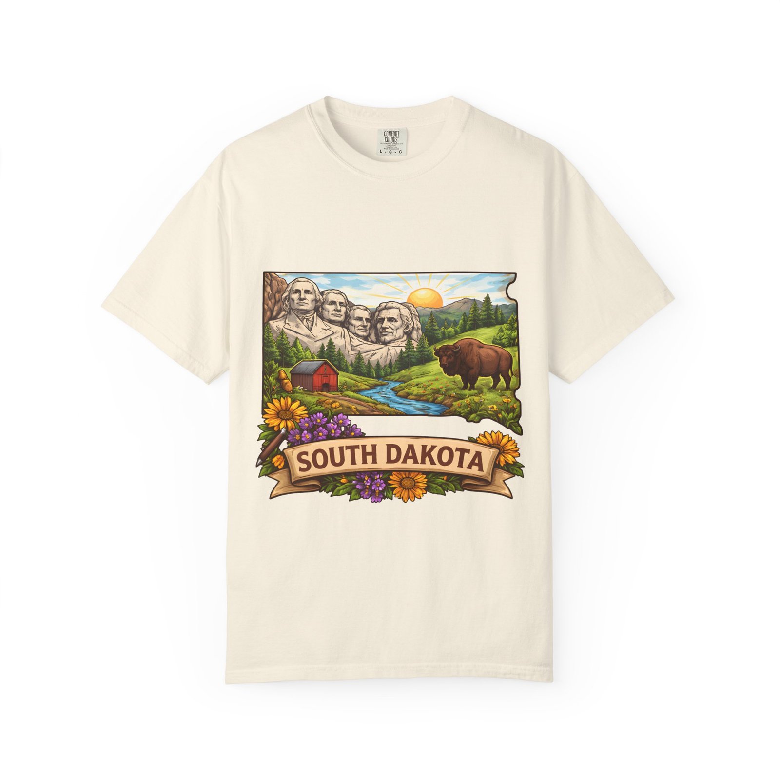 This garment-dyed tee carries a sunlit slice of South Dakota across its chest — Mount Rushmore rising over rolling hills, a meandering river, a lumber-red barn, wildflowers and a grazing bison. The heavyweight ring-spun cotton feels substantial yet soft thanks to the post-construction dye, and the relaxed fit drapes casually for easy days on the road or evenings around a campfire. It’s the sort of shirt you reach for when you want to wear a memory: state pride, open skies, and slow mornings folded into one comfortable layer.