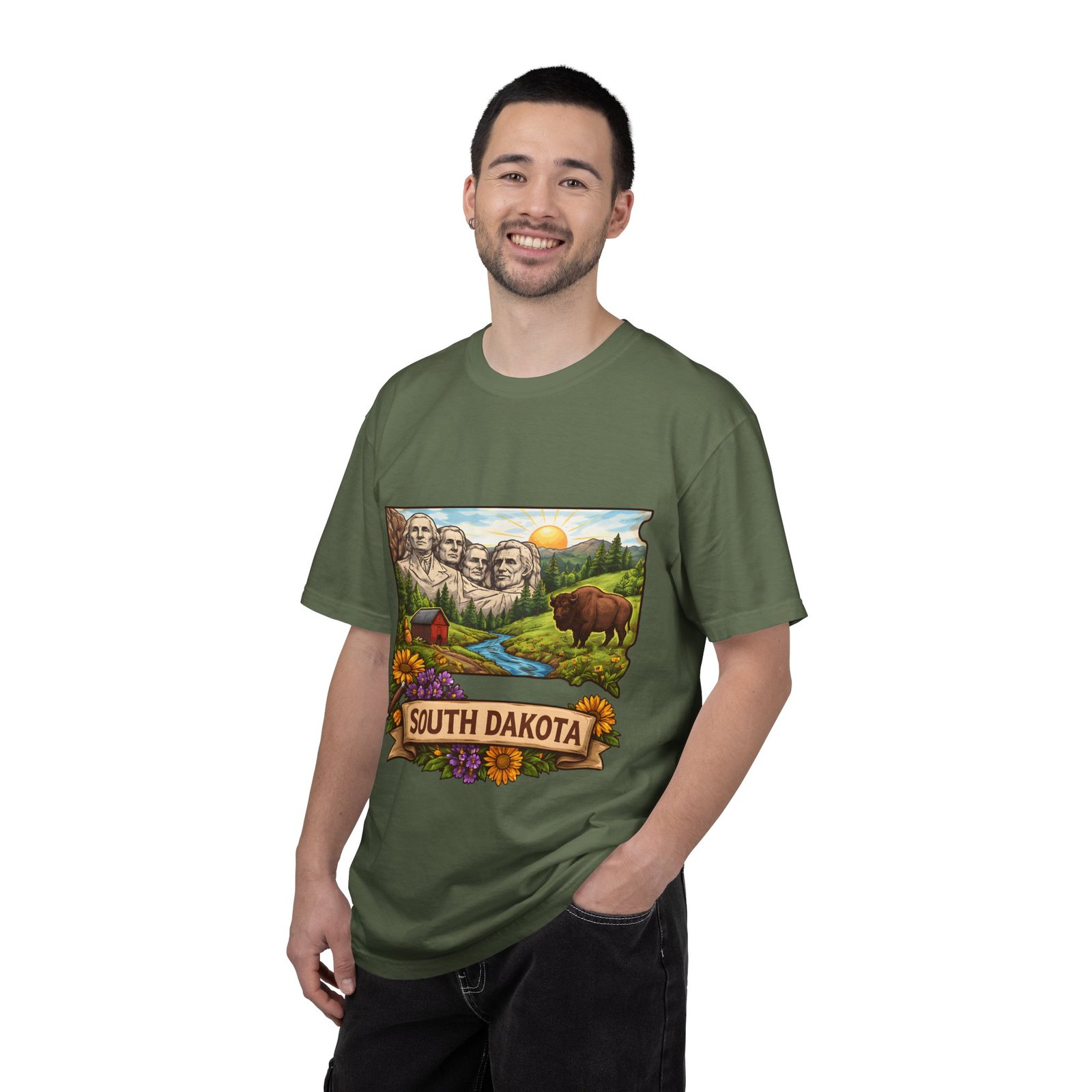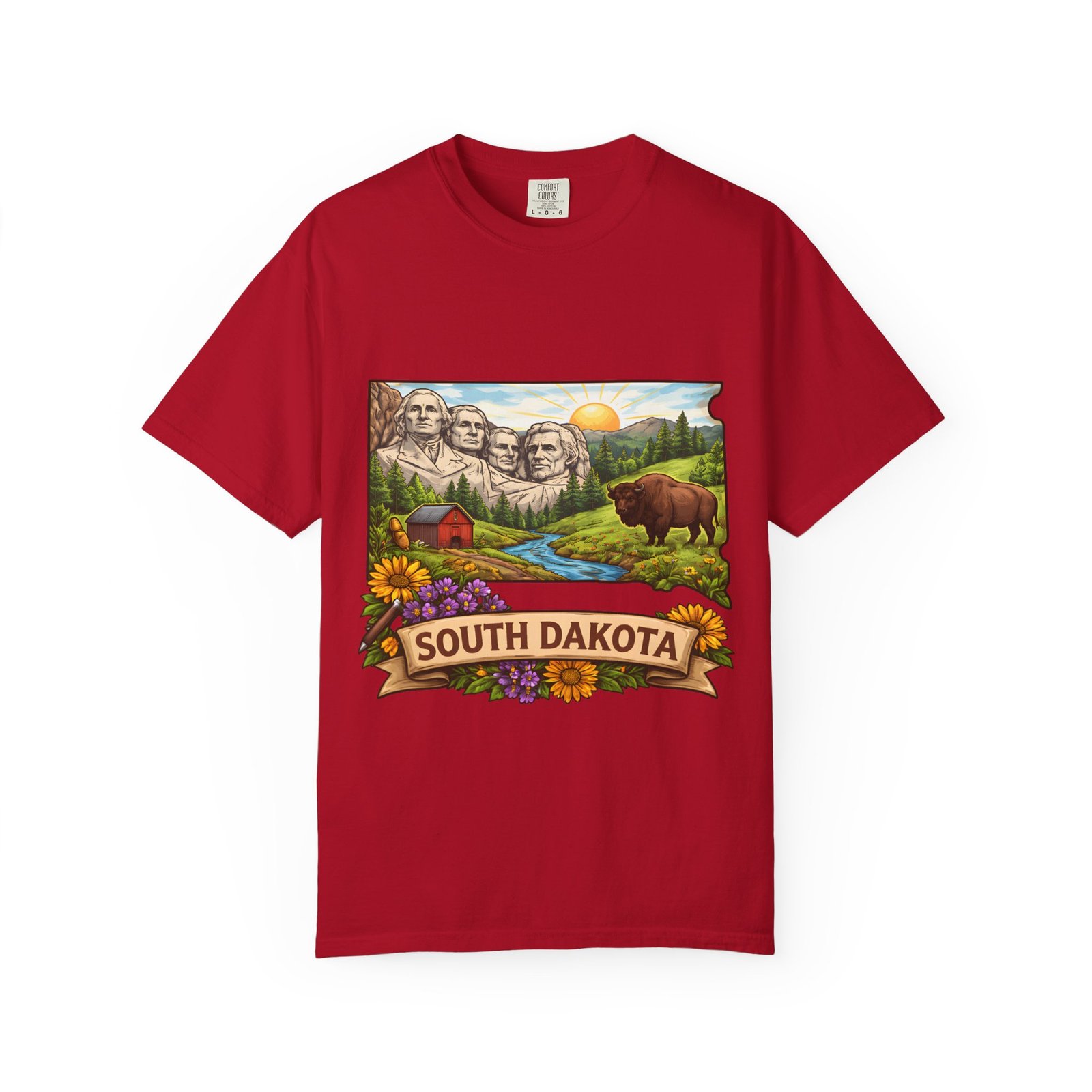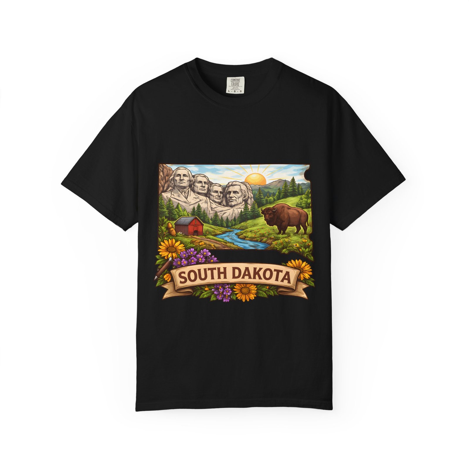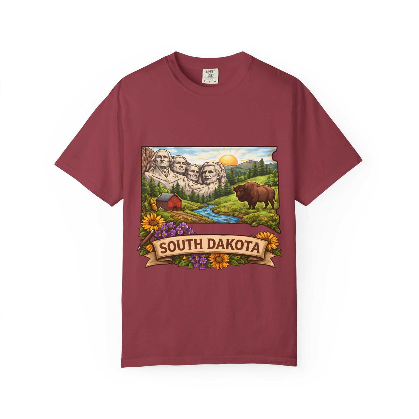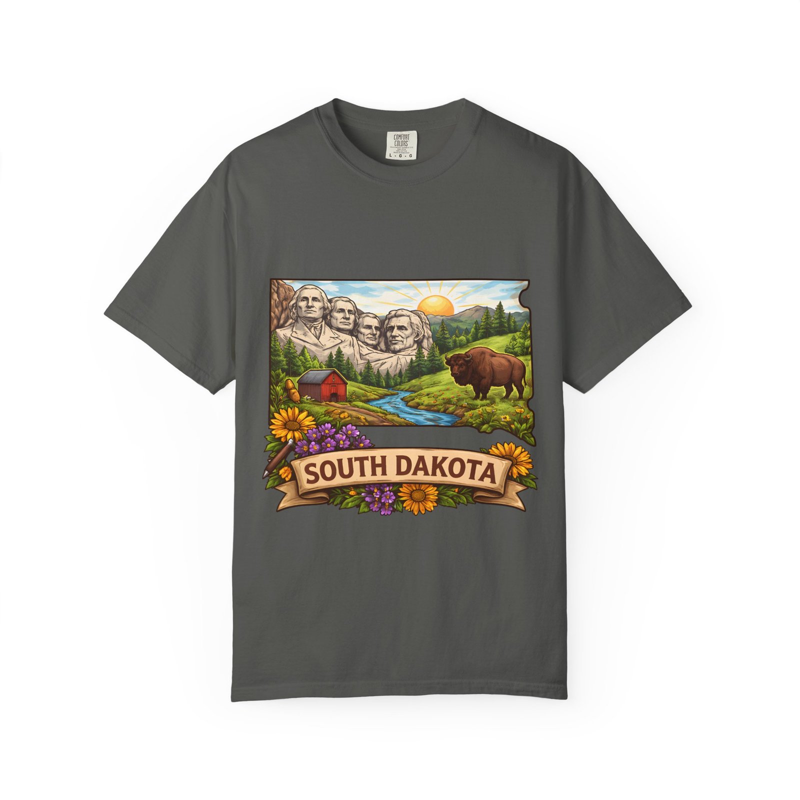 This garment-dyed tee carries a sunlit slice of South Dakota across its chest — Mount Rushmore rising over rolling hills, a meandering river, a lumber-red barn, wildflowers and a grazing bison. The heavyweight ring-spun cotton feels substantial yet soft thanks to the post-construction dye, and the relaxed fit drapes casually for easy days on the road or evenings around a campfire. It’s the sort of shirt you reach for when you want to wear a memory: state pride, open skies, and slow mornings folded into one comfortable layer.