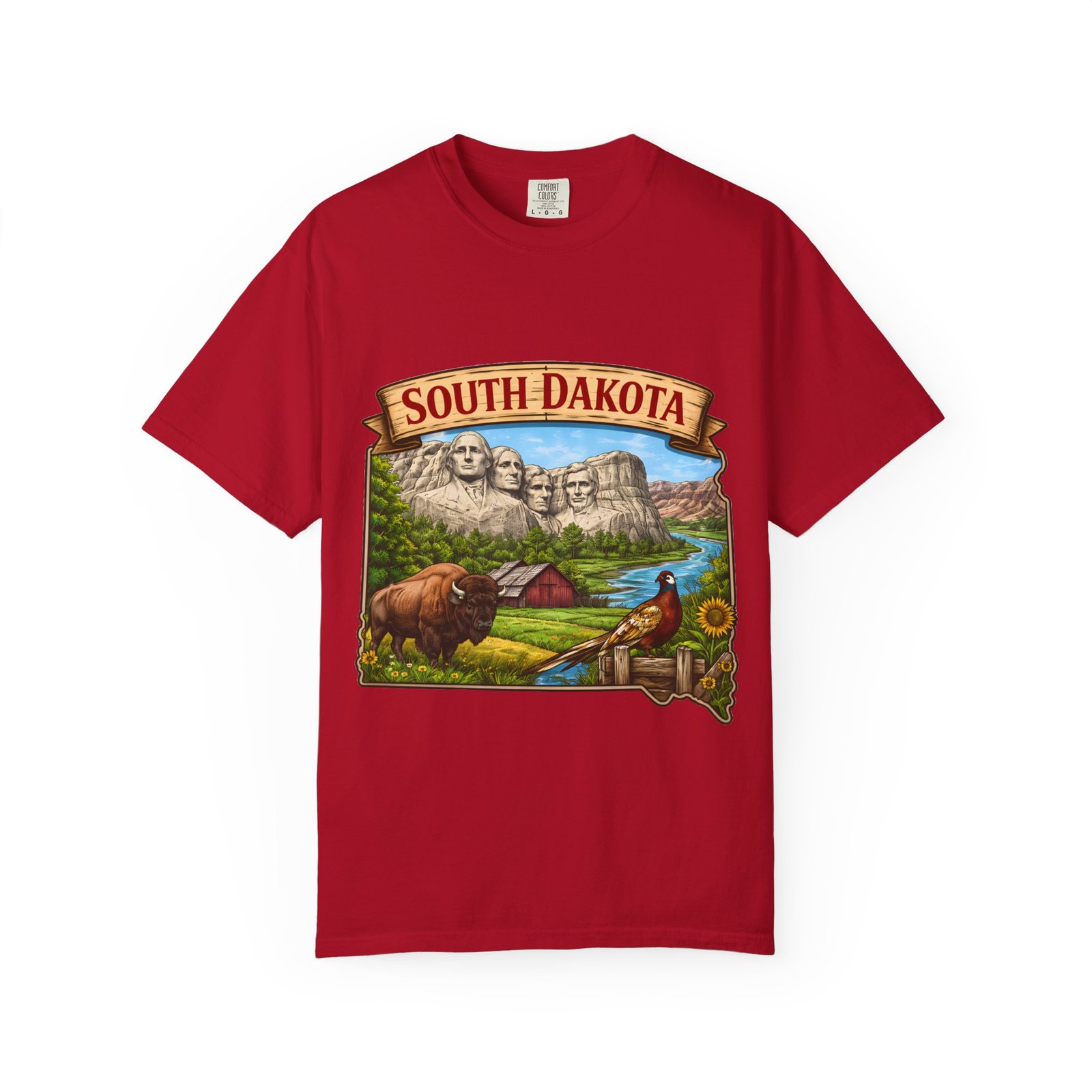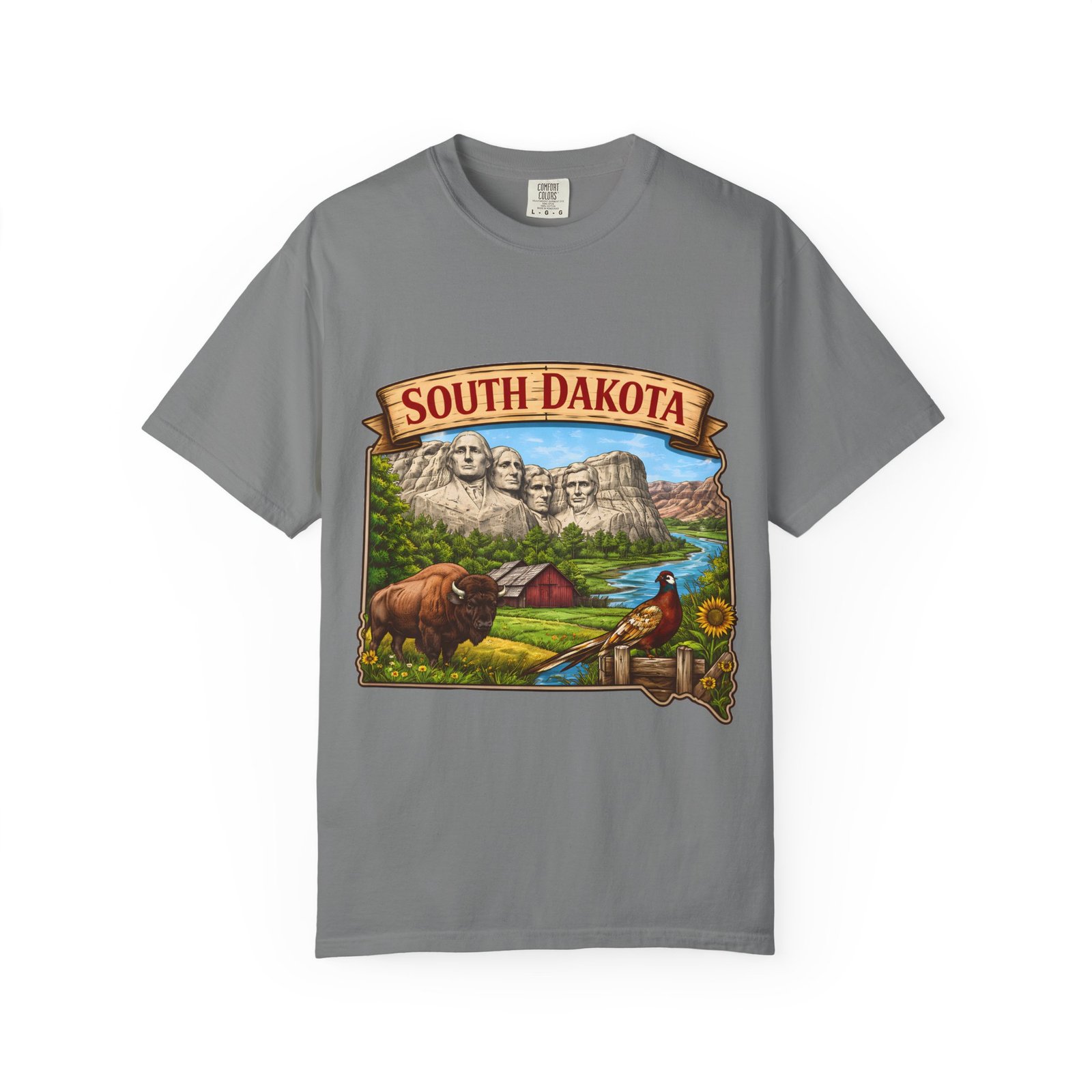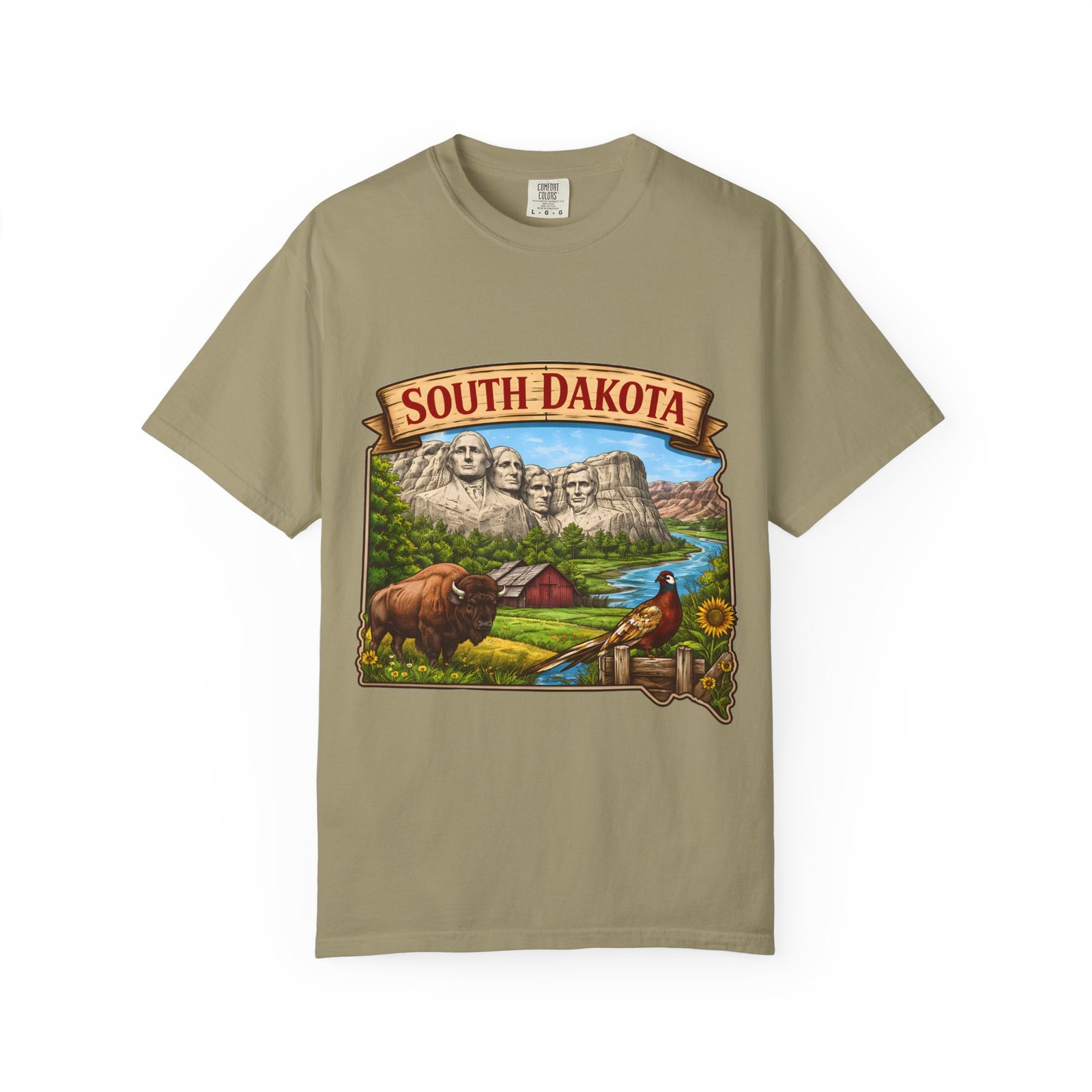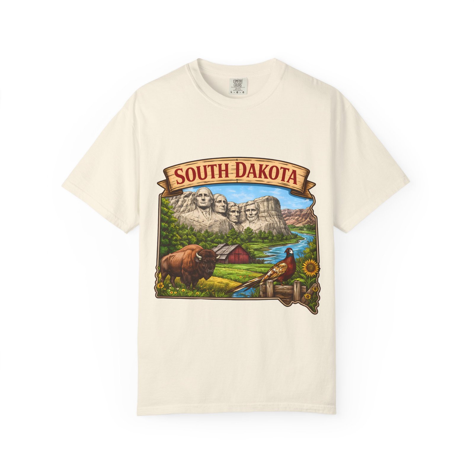 This garment-dyed T-shirt brings a sunlit corner of South Dakota to your everyday wear. The relaxed, heavyweight cotton has a lived-in softness from after-construction dyeing, so the vintage-inspired Mount Rushmore scene, buffalo, pheasant, and prairie barn feels like a found treasure from a roadside stop. Wear it on road trips down winding two-lane highways, at summer county fairs, or when you want a low-key nod to Midwestern landscapes. The roomy fit and durable double-needle seams stand up to long days outside. Pick a color that echoes open sky or prairie gold to match the art’s warm palette and let the tee become one of the pieces you reach for when you want comfort with a little hometown pride.