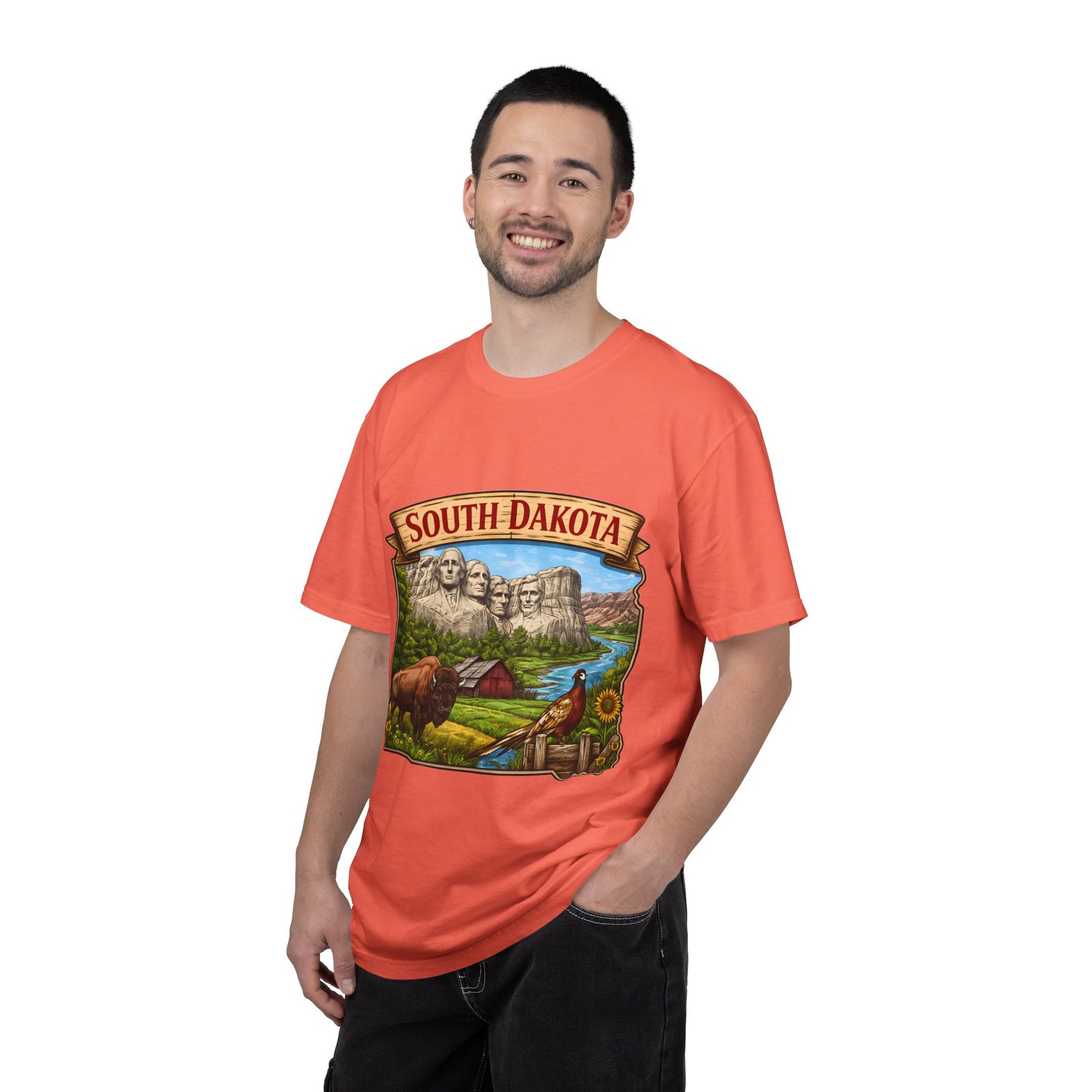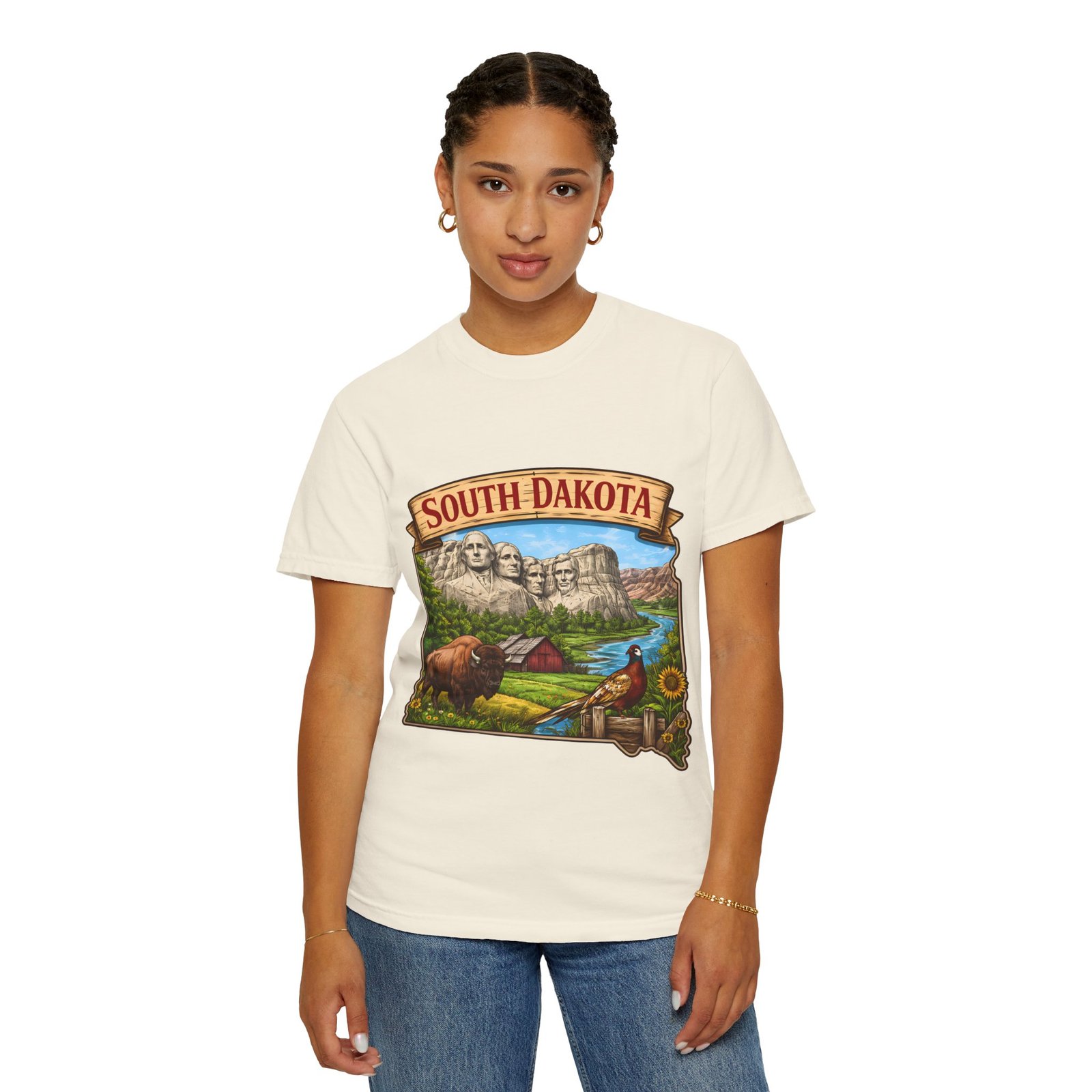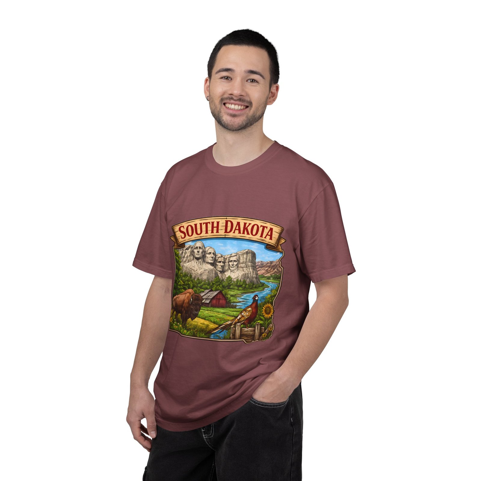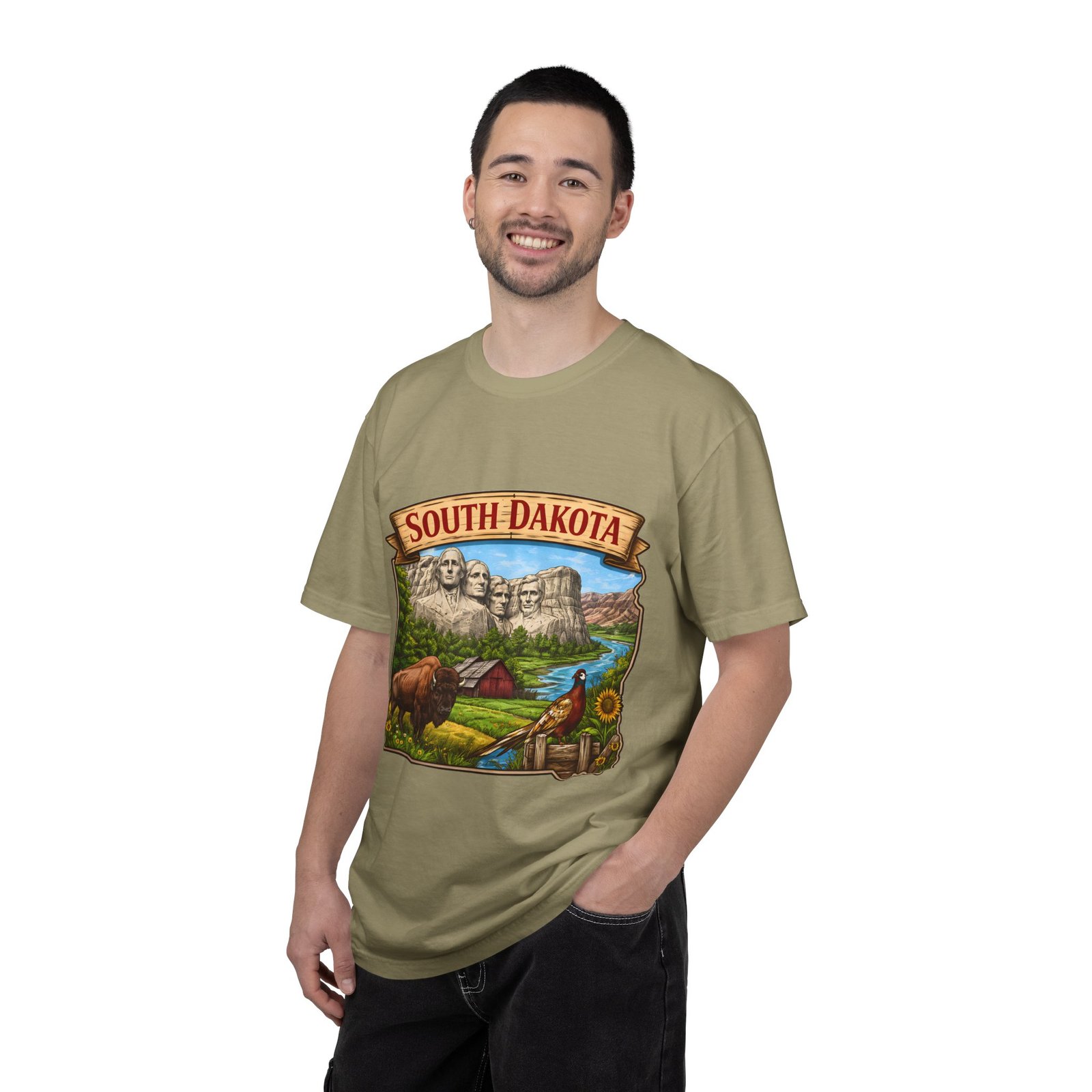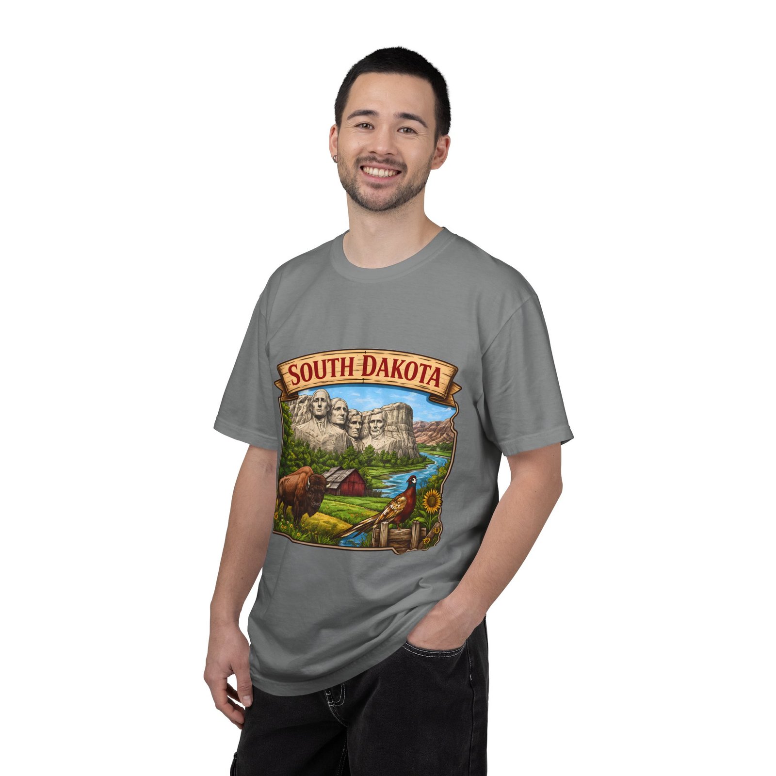 This garment-dyed T-shirt brings a sunlit corner of South Dakota to your everyday wear. The relaxed, heavyweight cotton has a lived-in softness from after-construction dyeing, so the vintage-inspired Mount Rushmore scene, buffalo, pheasant, and prairie barn feels like a found treasure from a roadside stop. Wear it on road trips down winding two-lane highways, at summer county fairs, or when you want a low-key nod to Midwestern landscapes. The roomy fit and durable double-needle seams stand up to long days outside. Pick a color that echoes open sky or prairie gold to match the art’s warm palette and let the tee become one of the pieces you reach for when you want comfort with a little hometown pride.