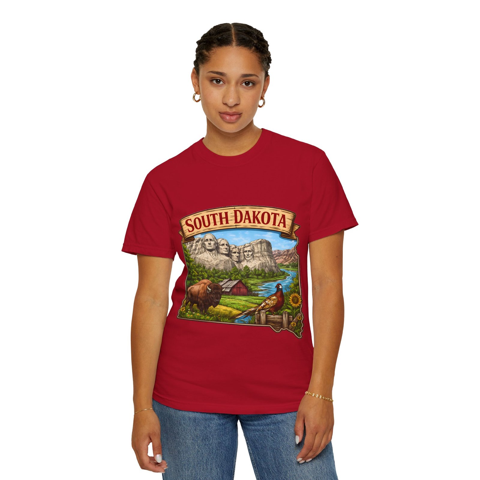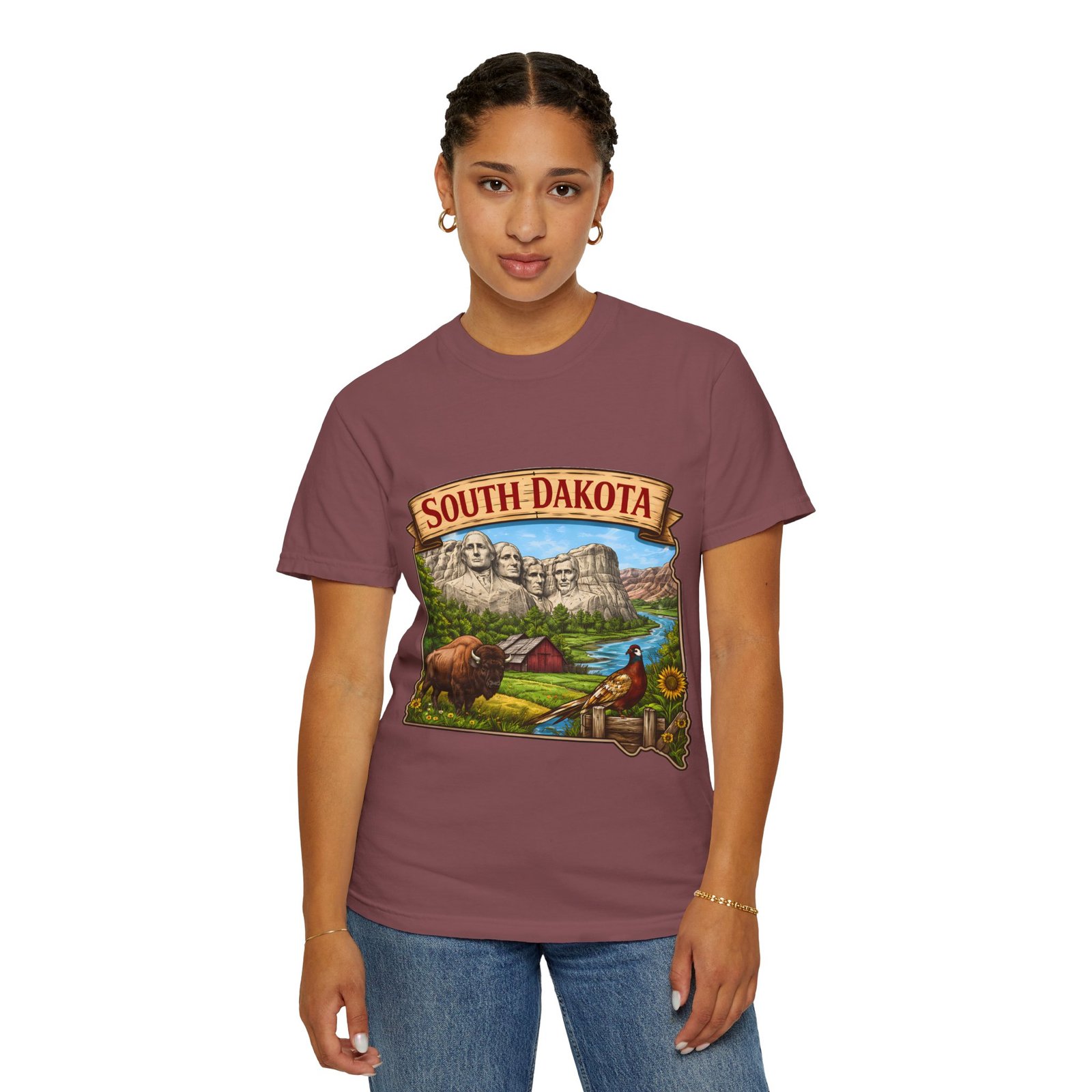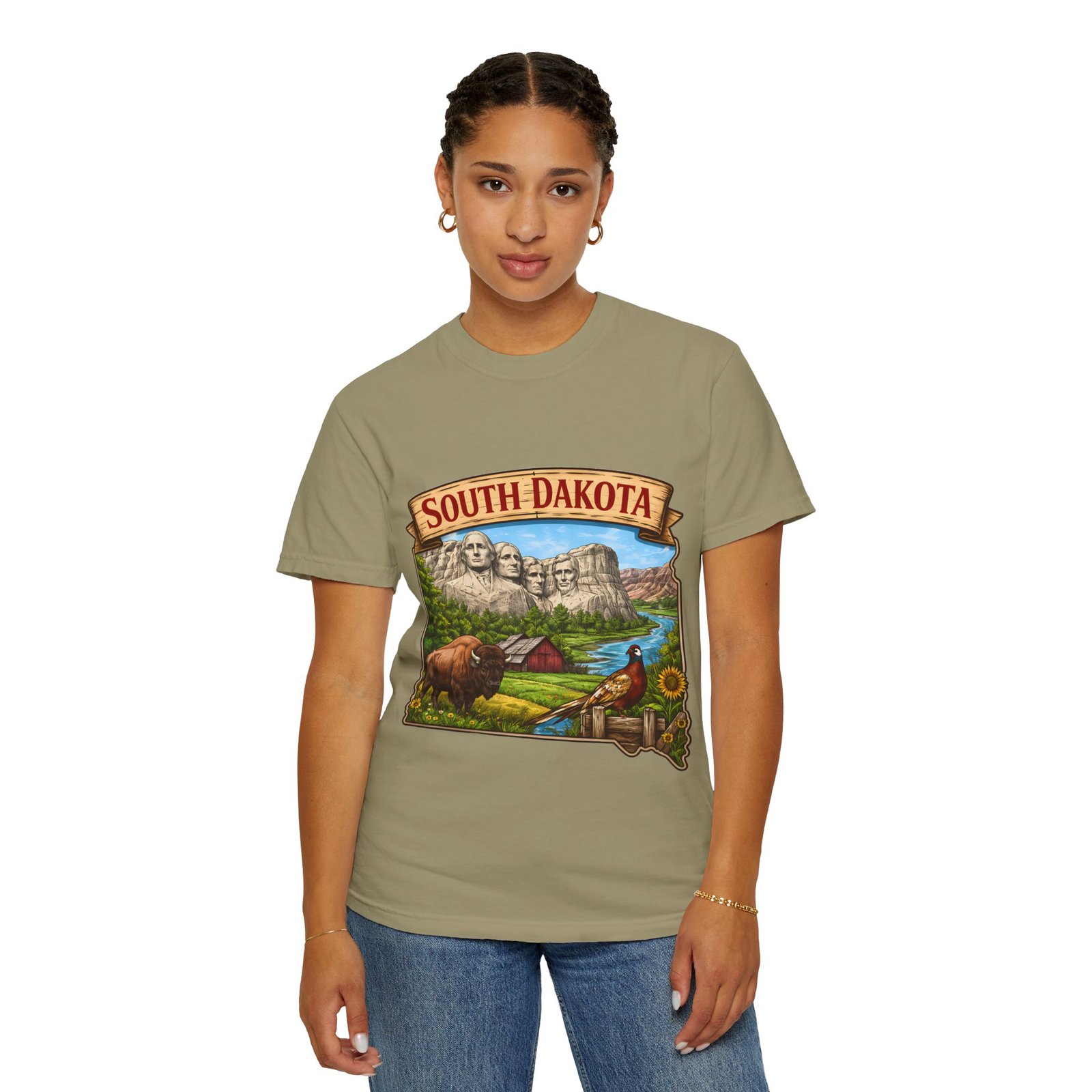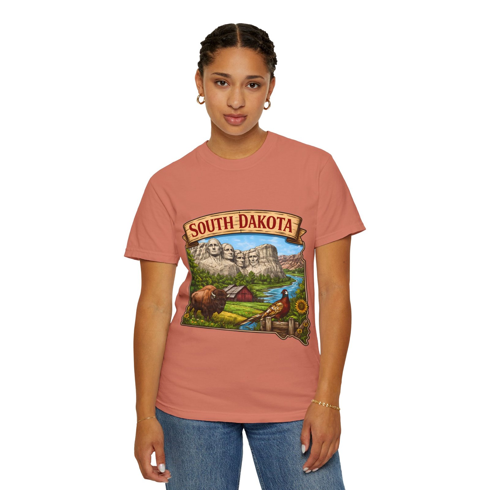 This garment-dyed T-shirt brings a sunlit corner of South Dakota to your everyday wear. The relaxed, heavyweight cotton has a lived-in softness from after-construction dyeing, so the vintage-inspired Mount Rushmore scene, buffalo, pheasant, and prairie barn feels like a found treasure from a roadside stop. Wear it on road trips down winding two-lane highways, at summer county fairs, or when you want a low-key nod to Midwestern landscapes. The roomy fit and durable double-needle seams stand up to long days outside. Pick a color that echoes open sky or prairie gold to match the art’s warm palette and let the tee become one of the pieces you reach for when you want comfort with a little hometown pride.