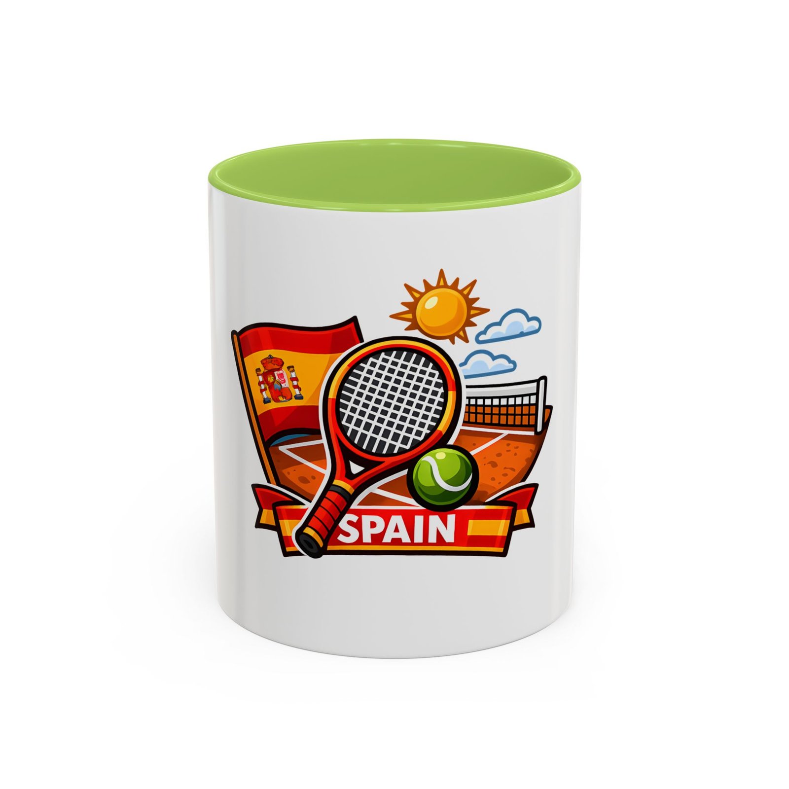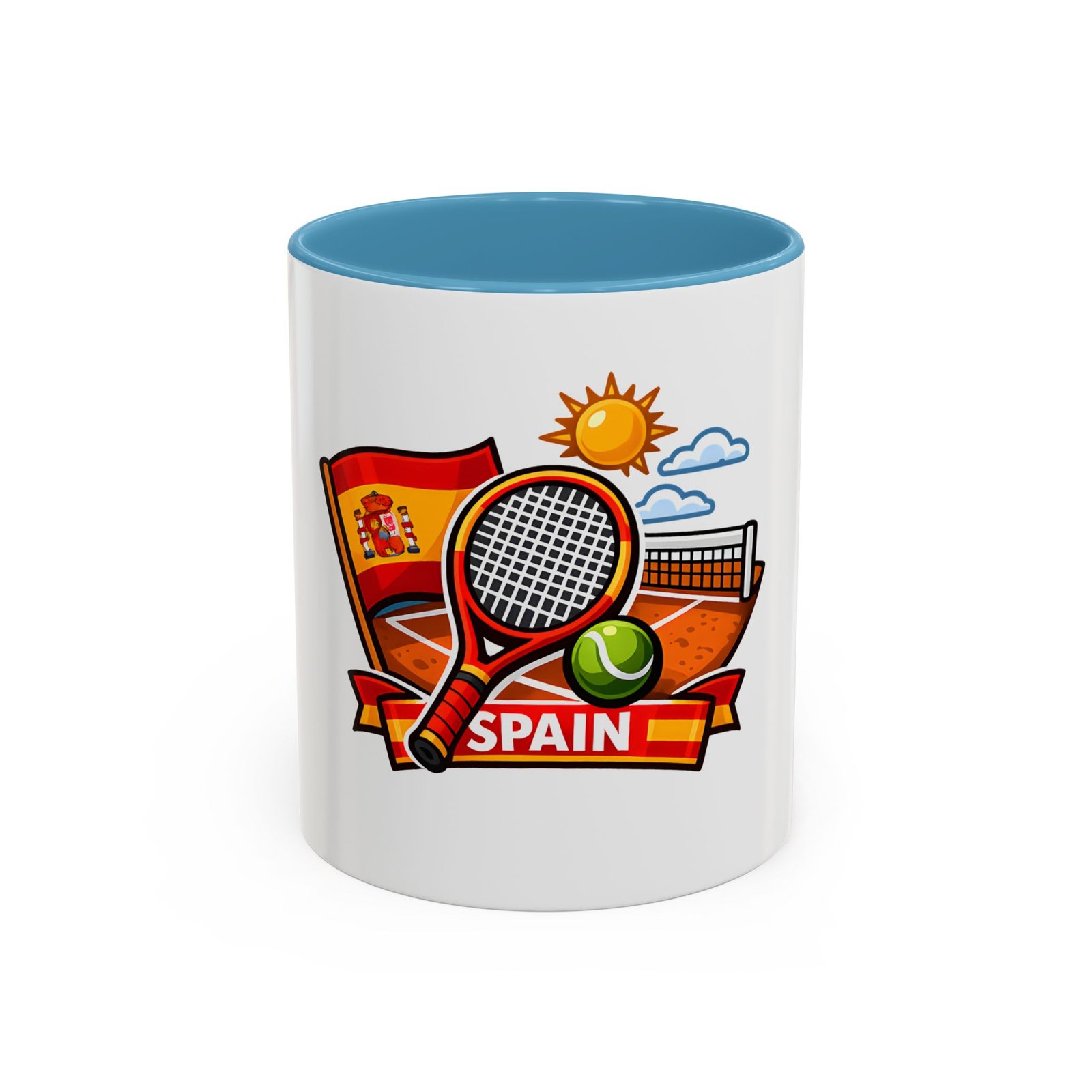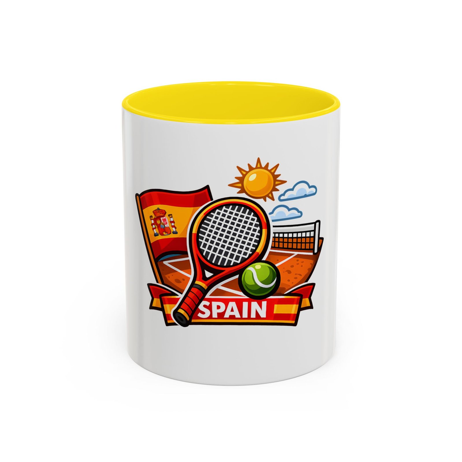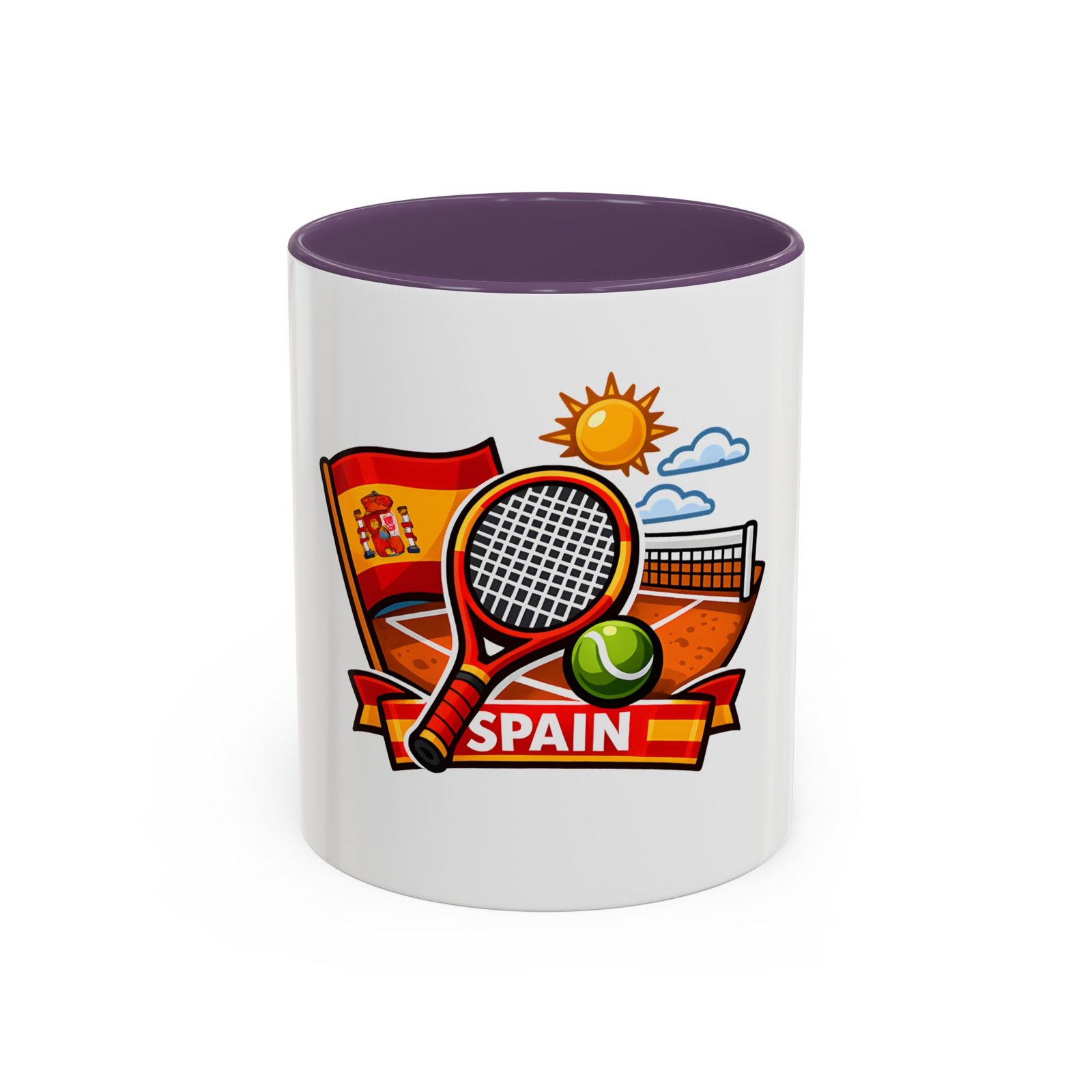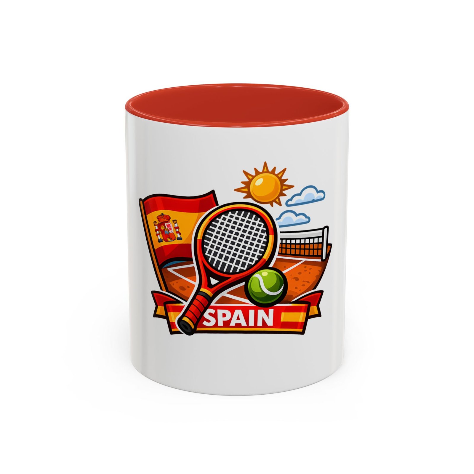 Sip your morning brew and carry a slice of sun-soaked clay courts with you. This ceramic mug pairs a bold, colorful print of a tennis racket, ball, net and the Spanish flag with a glossy contrast interior and handle. Each sip feels like an afternoon match under a warm Spanish sky — lively, focused, and a little bit playful. It’s great for warming hands between sets, fueling early-morning rallies, or keeping on your desk as a cheerful reminder of match day memories and travel dreams.