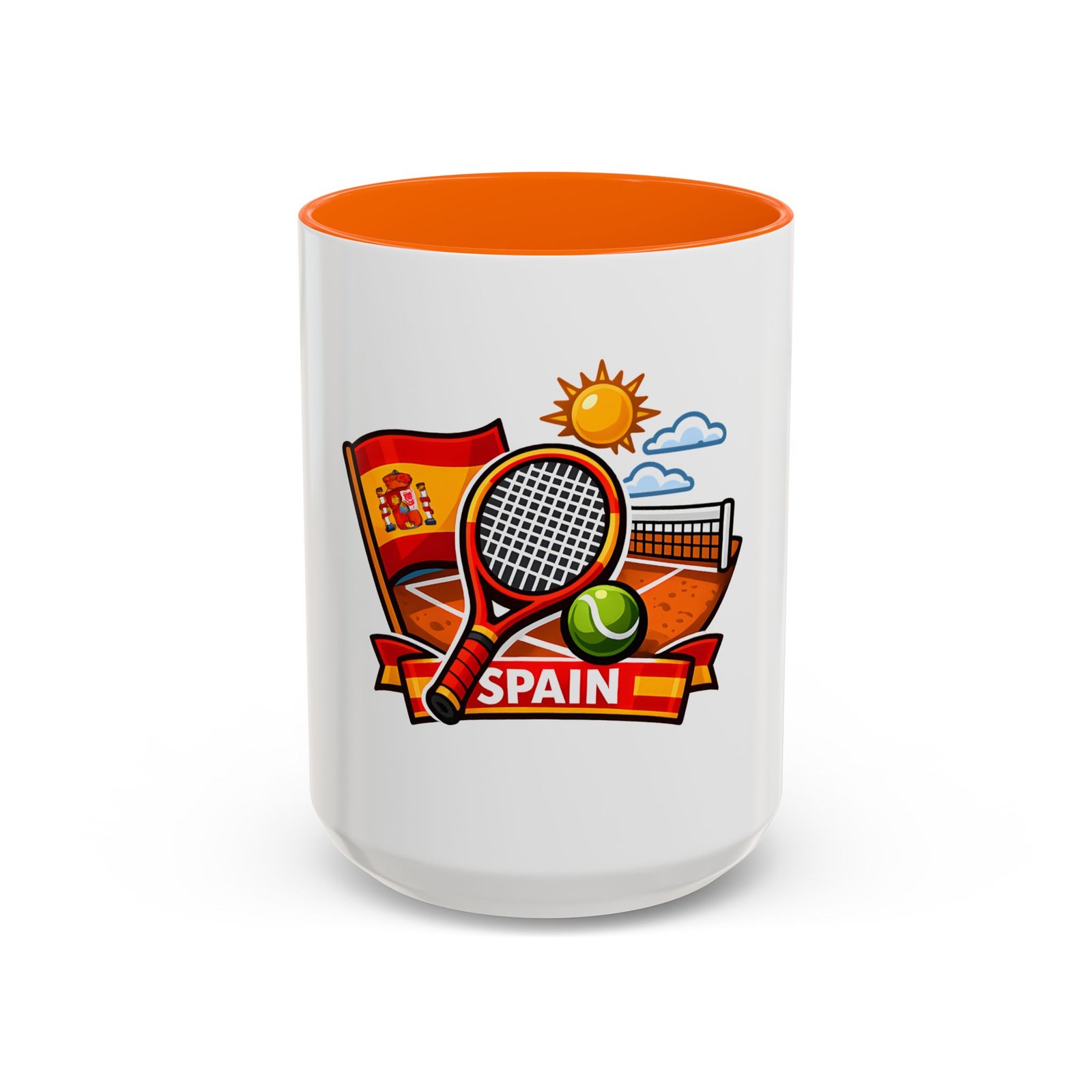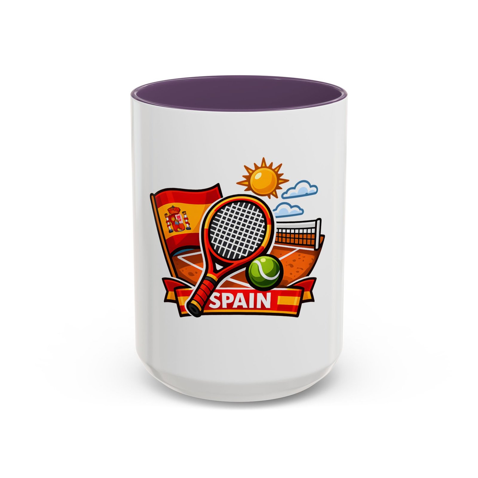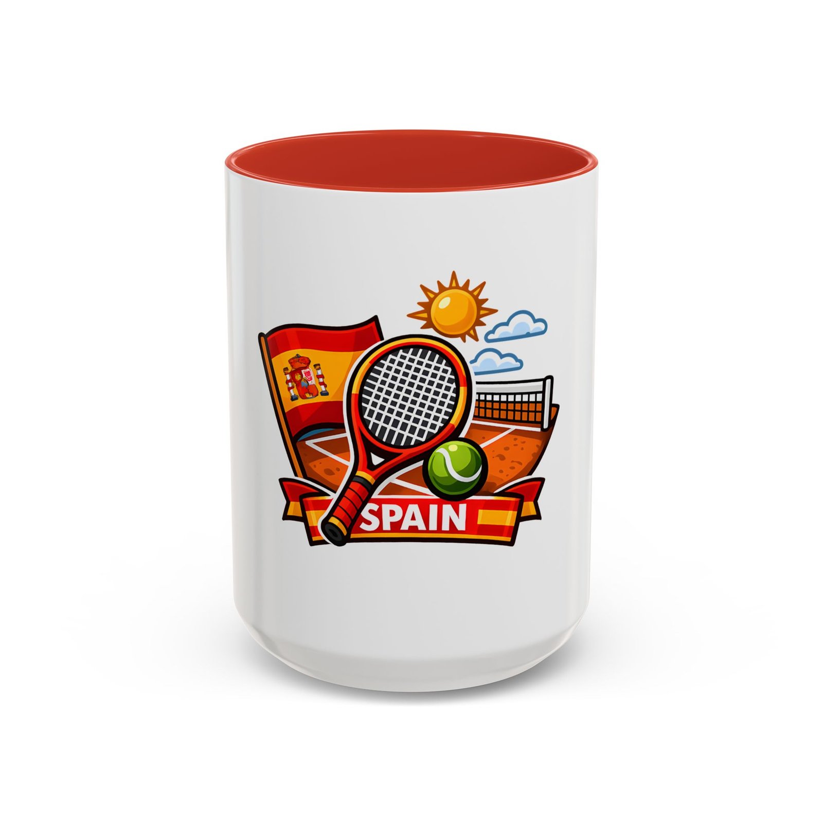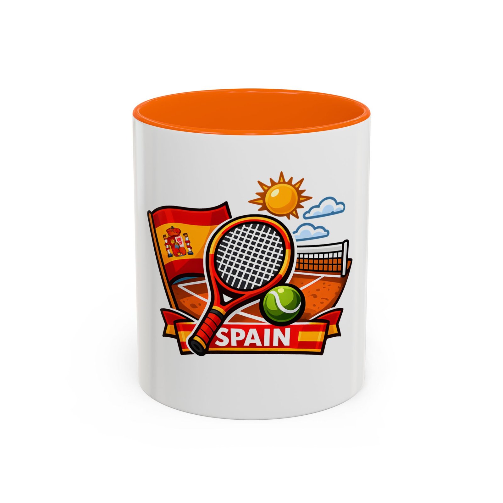 Sip your morning brew and carry a slice of sun-soaked clay courts with you. This ceramic mug pairs a bold, colorful print of a tennis racket, ball, net and the Spanish flag with a glossy contrast interior and handle. Each sip feels like an afternoon match under a warm Spanish sky — lively, focused, and a little bit playful. It’s great for warming hands between sets, fueling early-morning rallies, or keeping on your desk as a cheerful reminder of match day memories and travel dreams.