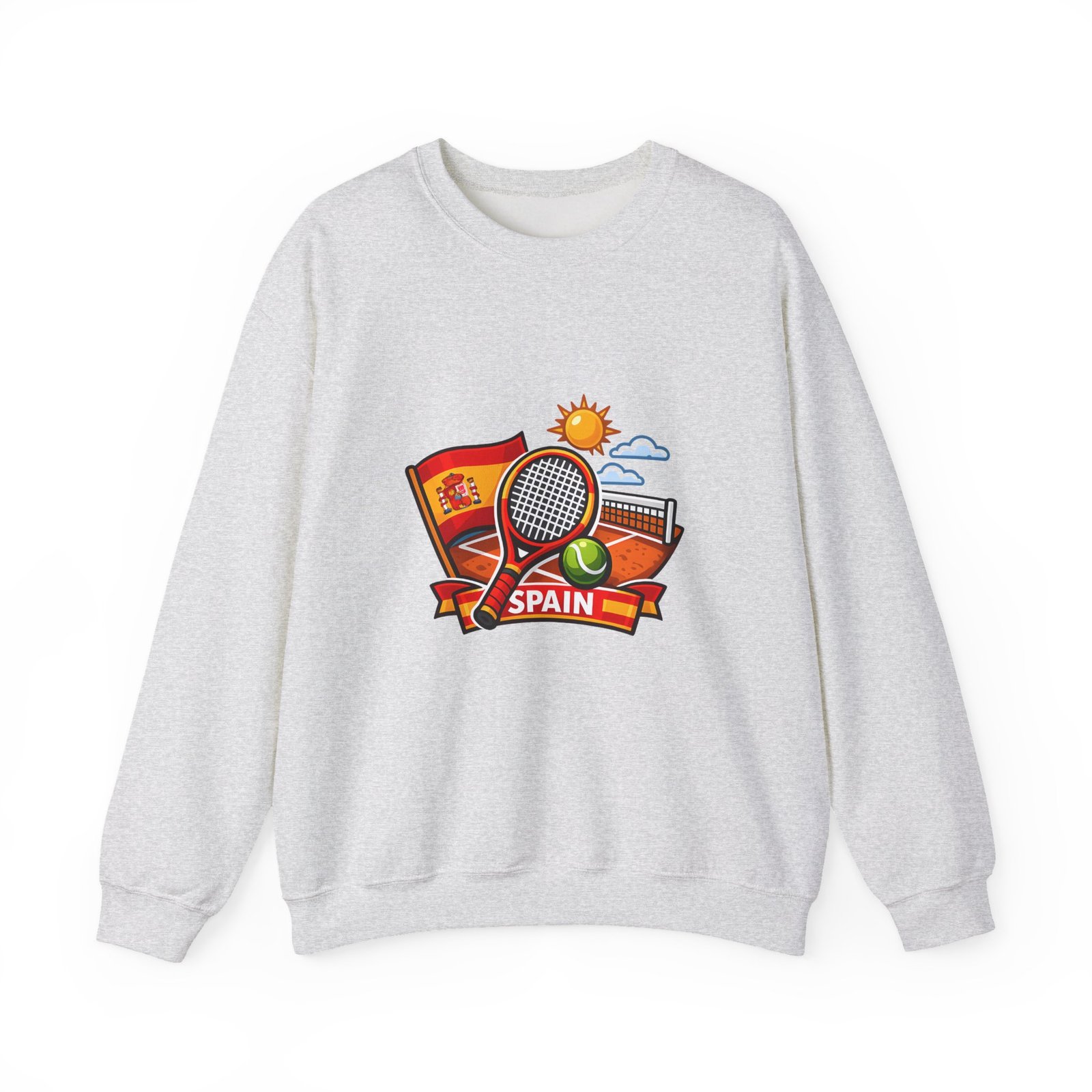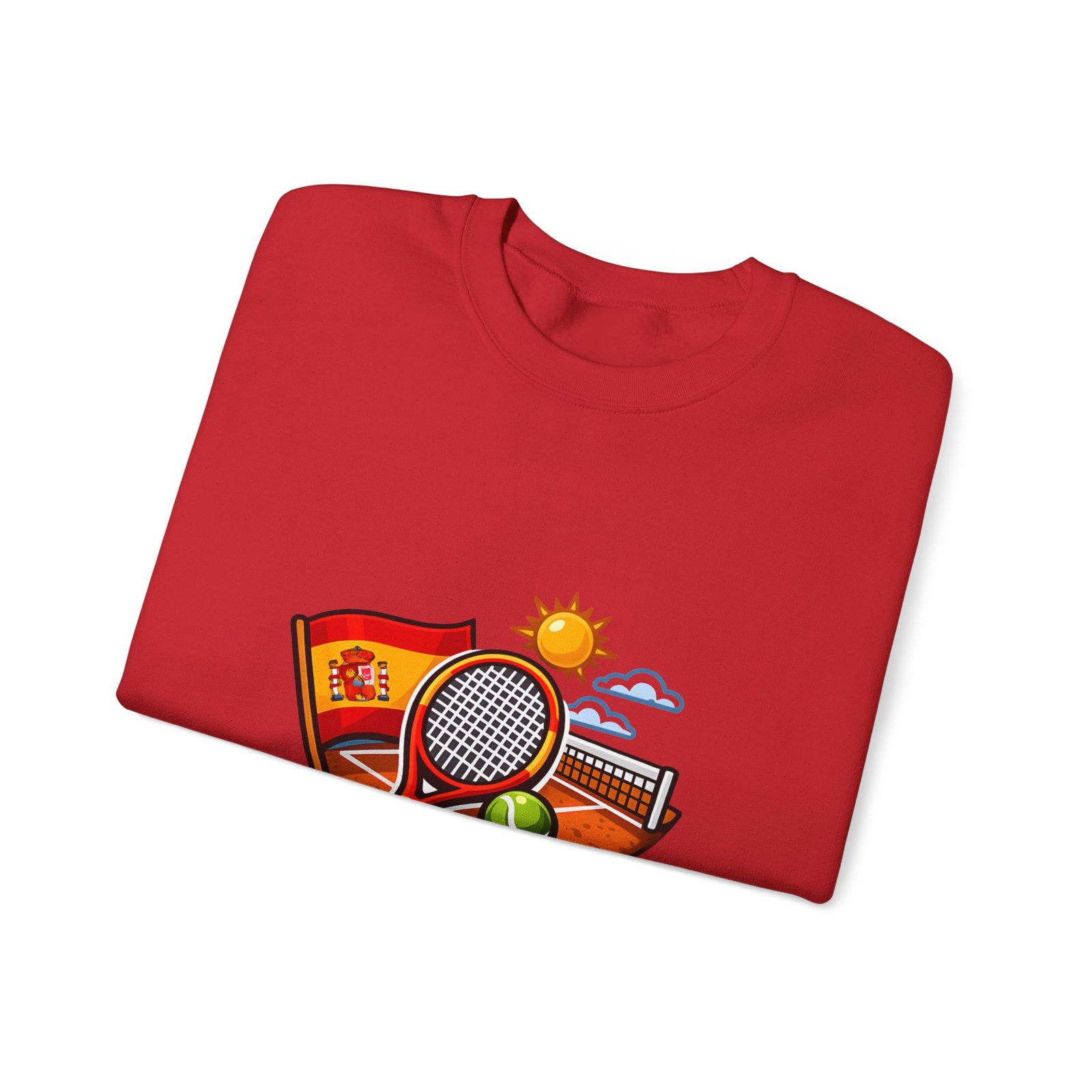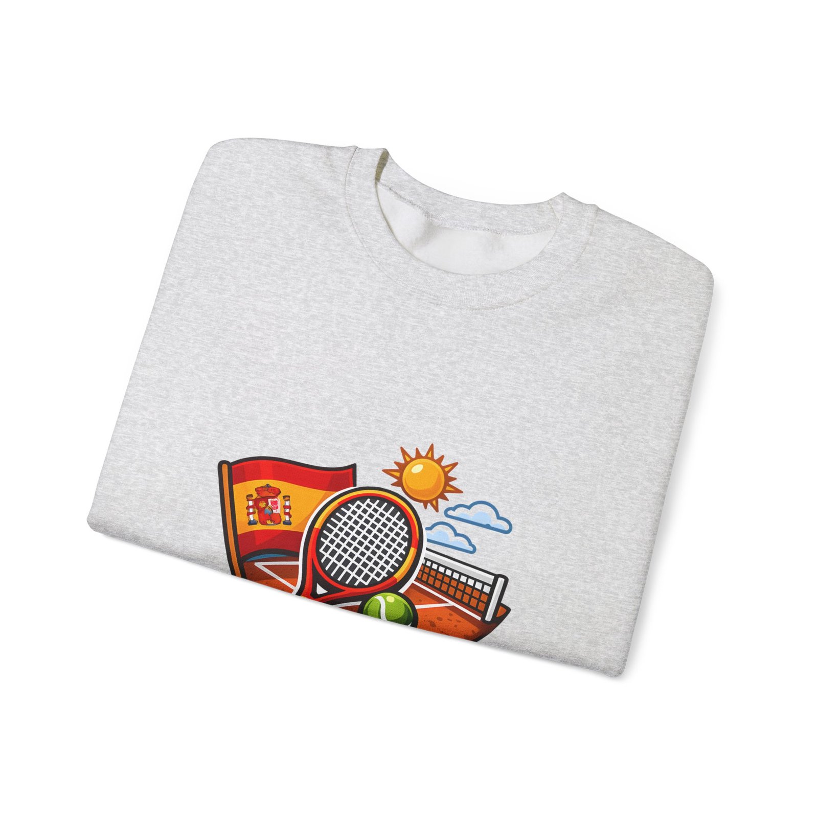 Light, warm, and quietly proud — this crewneck carries a sunny slice of Spain you can slip into any day. A clean white sweatshirt cradles a colorful tennis-themed crest: a waving Spanish flag, a racket and ball, a glowing sun and a slice of blue sky. It reads like a keepsake from long rallies on clay courts and afternoons cheering from the stands. The medium-heavy cotton-poly blend hugs the body without stiffness and the ribbed collar and reinforced seams hold their shape wash after wash. Wear it to practice sessions, post-match meetups, or weekend walks along the paseo; it blends sporty energy with casual street style so you feel connected to the game and the place every time you button the collarless neckline.