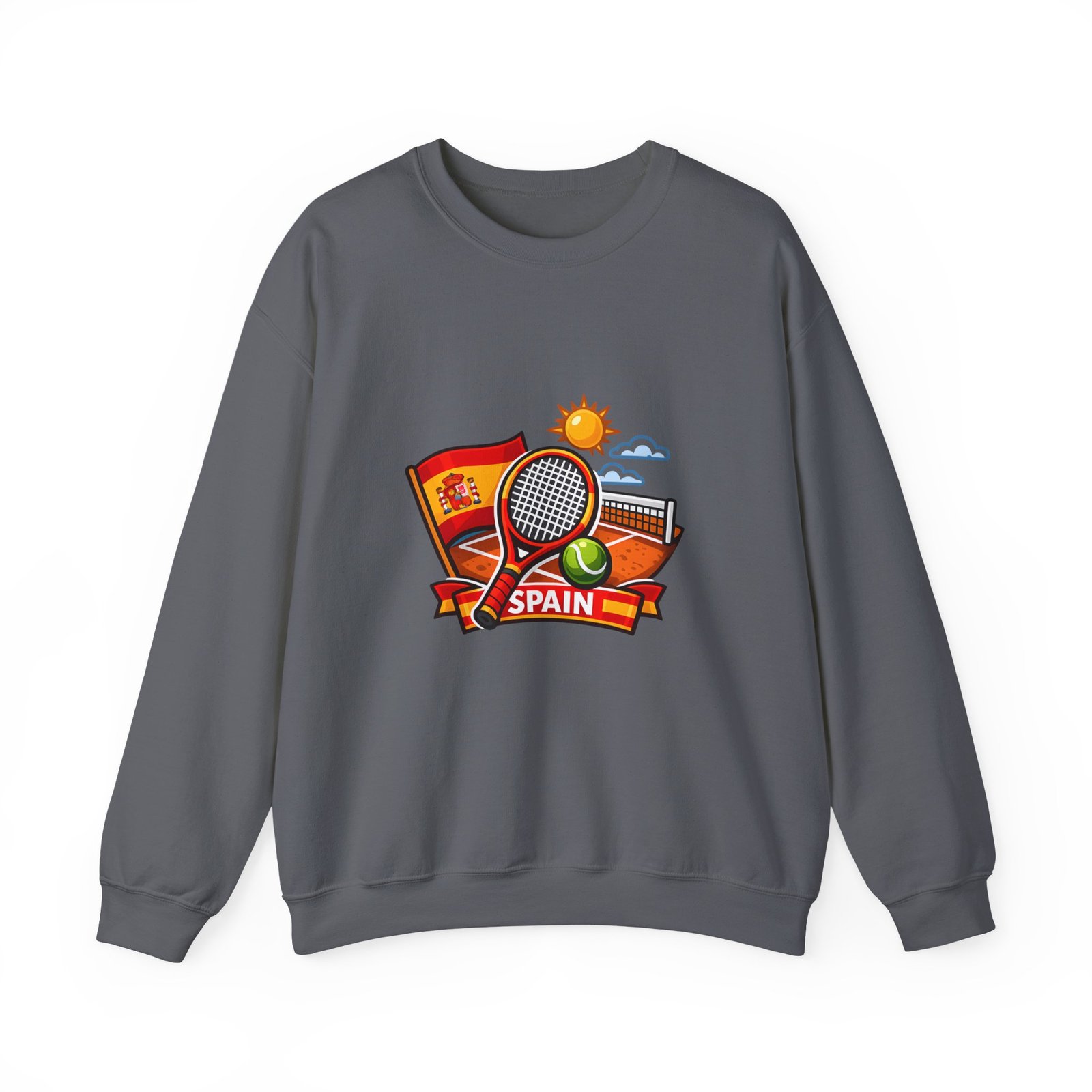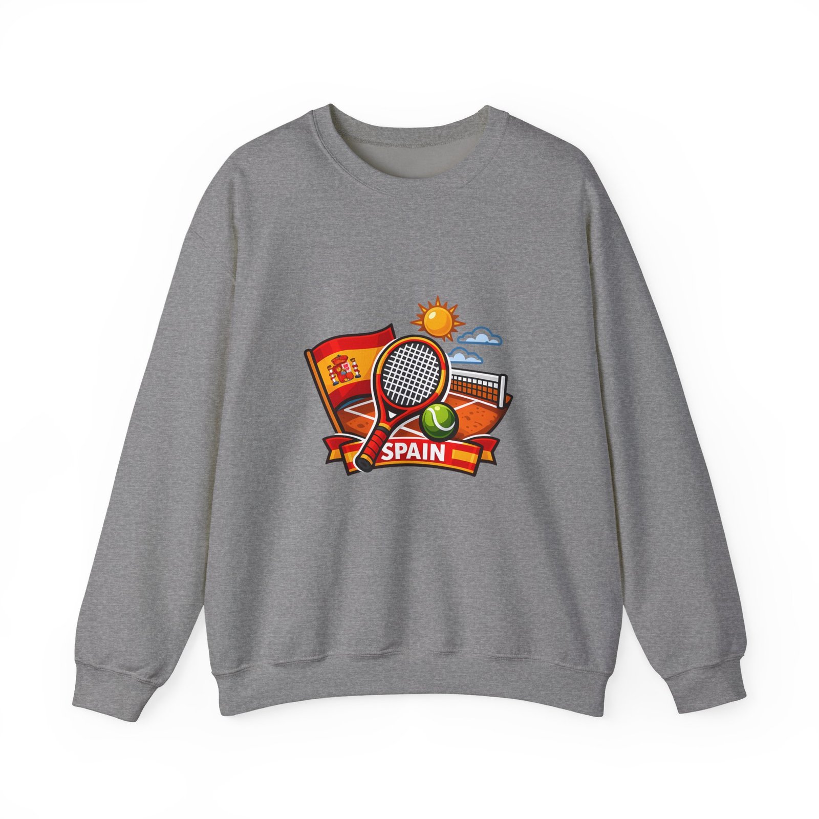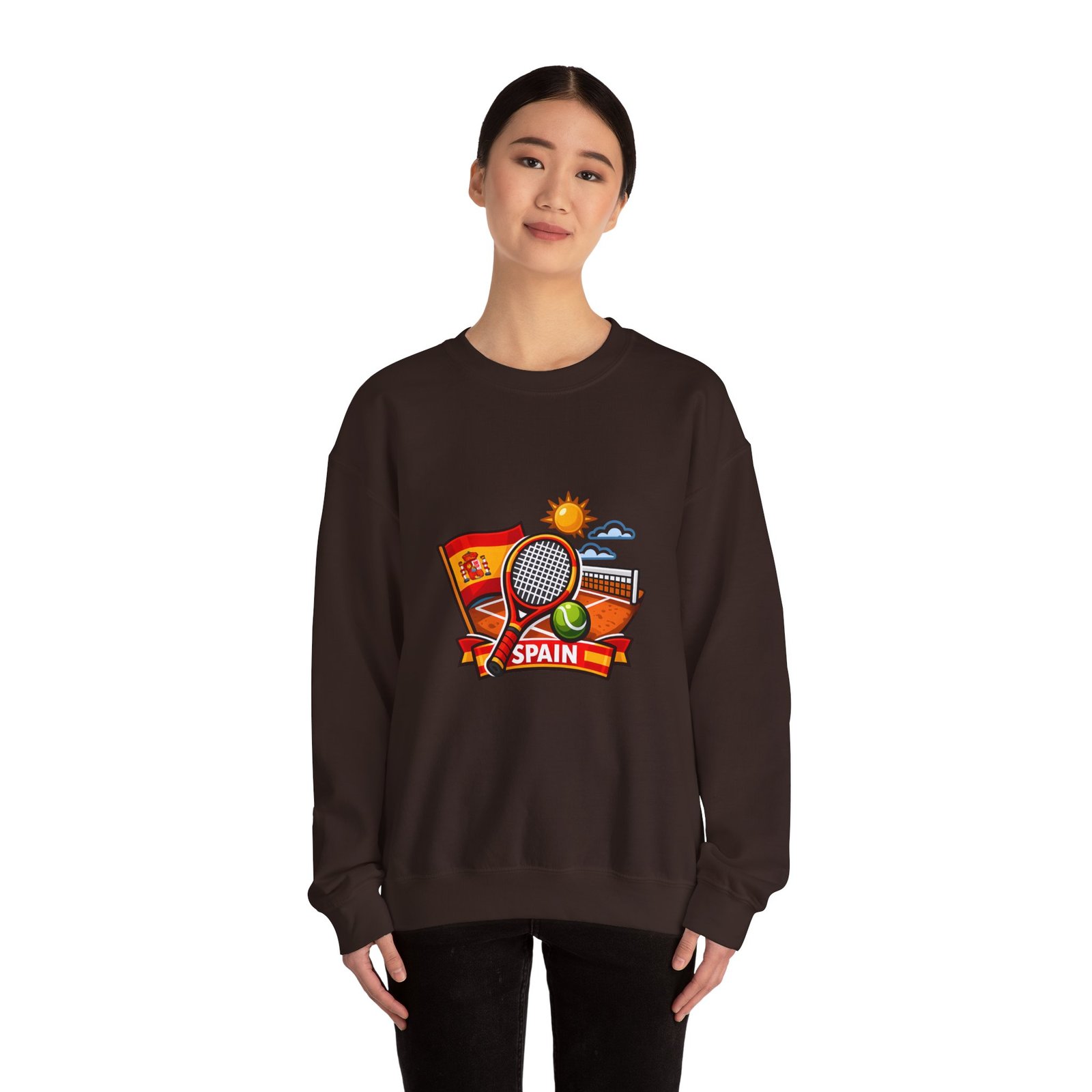 Light, warm, and quietly proud — this crewneck carries a sunny slice of Spain you can slip into any day. A clean white sweatshirt cradles a colorful tennis-themed crest: a waving Spanish flag, a racket and ball, a glowing sun and a slice of blue sky. It reads like a keepsake from long rallies on clay courts and afternoons cheering from the stands. The medium-heavy cotton-poly blend hugs the body without stiffness and the ribbed collar and reinforced seams hold their shape wash after wash. Wear it to practice sessions, post-match meetups, or weekend walks along the paseo; it blends sporty energy with casual street style so you feel connected to the game and the place every time you button the collarless neckline.