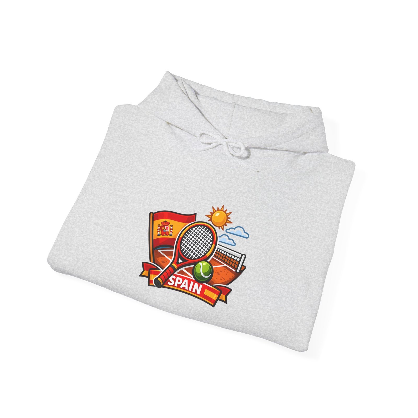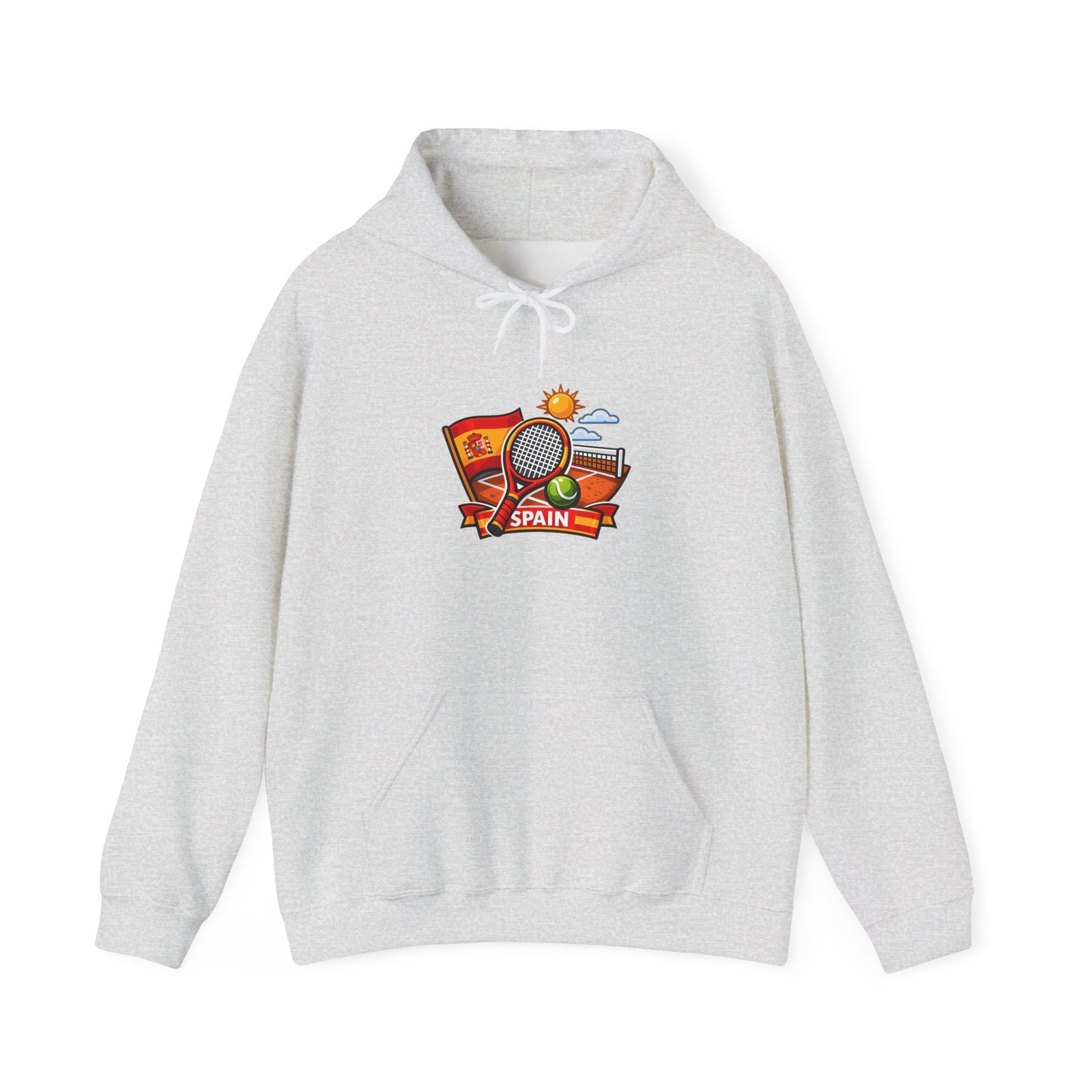 This cozy hoodie brings a slice of sunlit Spain to chilly days. The compact, colorful crest—complete with a tennis racket, stadium, and warm sun—feels like a postcard from a weekend match by the Mediterranean. Wear it after a morning run, layered on a ferry ride, or while replaying a favorite game with friends. The roomy hood and pouch pocket keep hands warm; the clean white canvas makes the artwork pop and keeps the look casual and approachable. It’s for people who collect travel memories, love the rhythm of the courts, and want a comfortable layer that quietly announces their tastes without shouting.