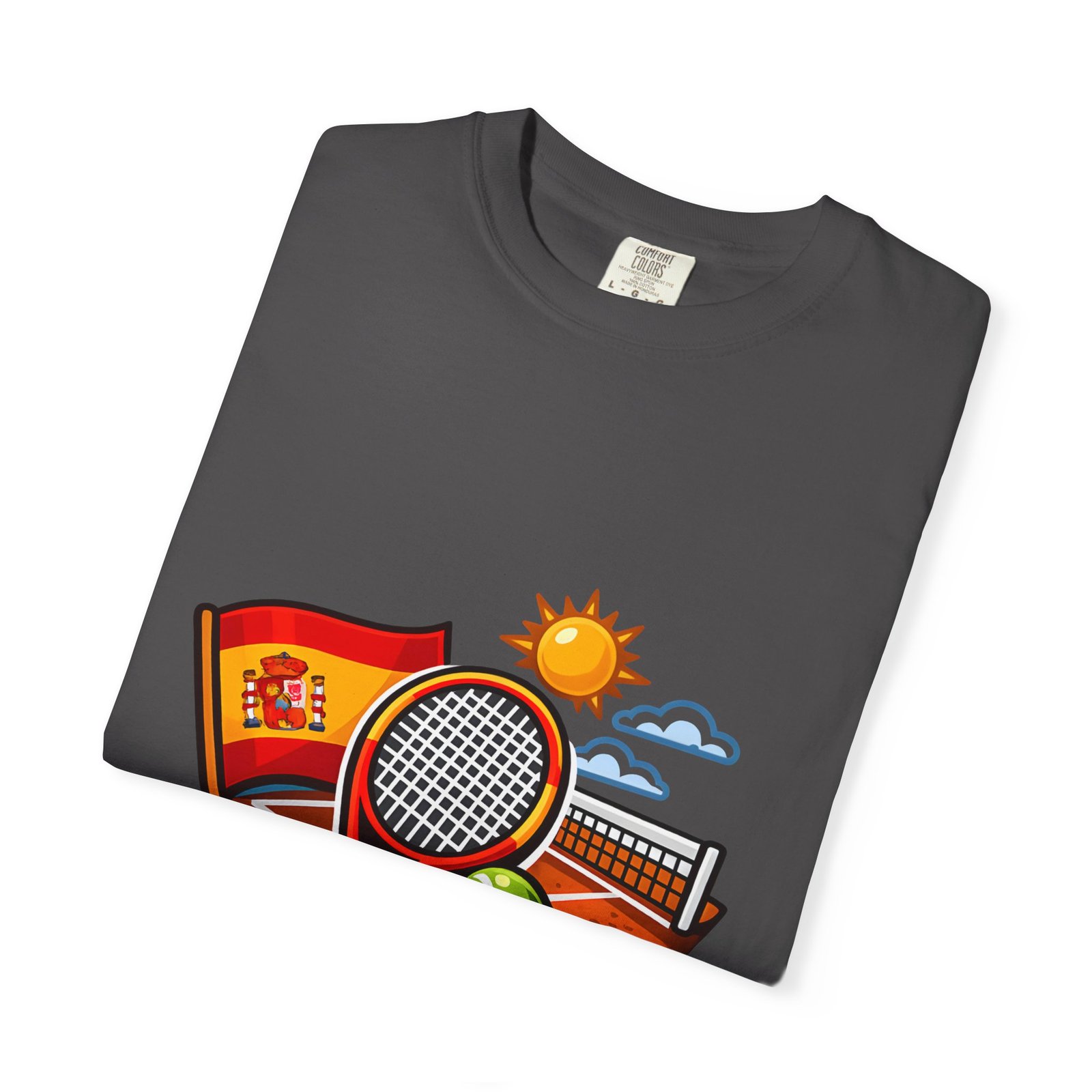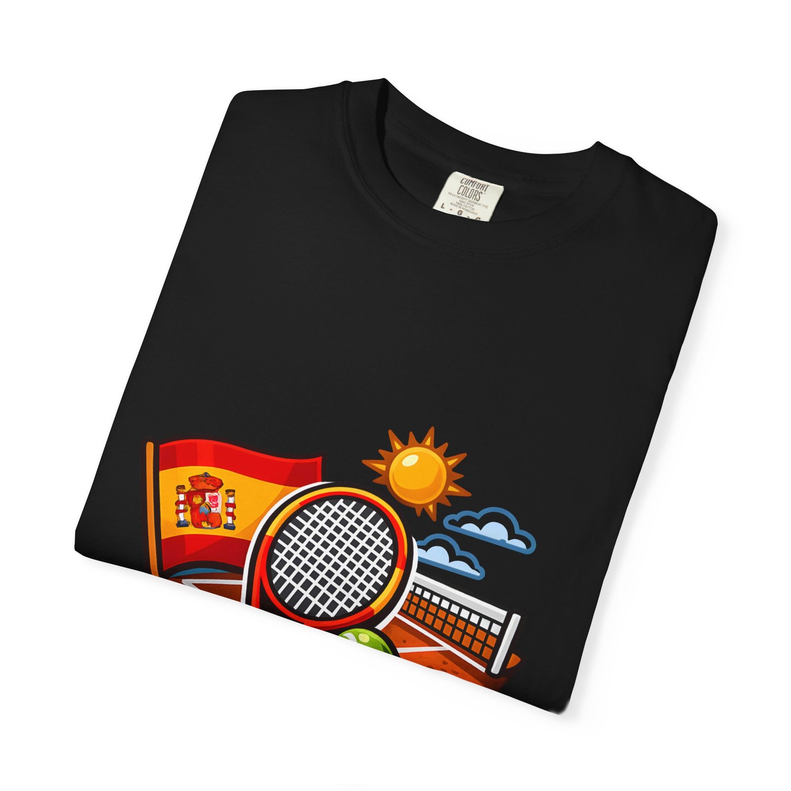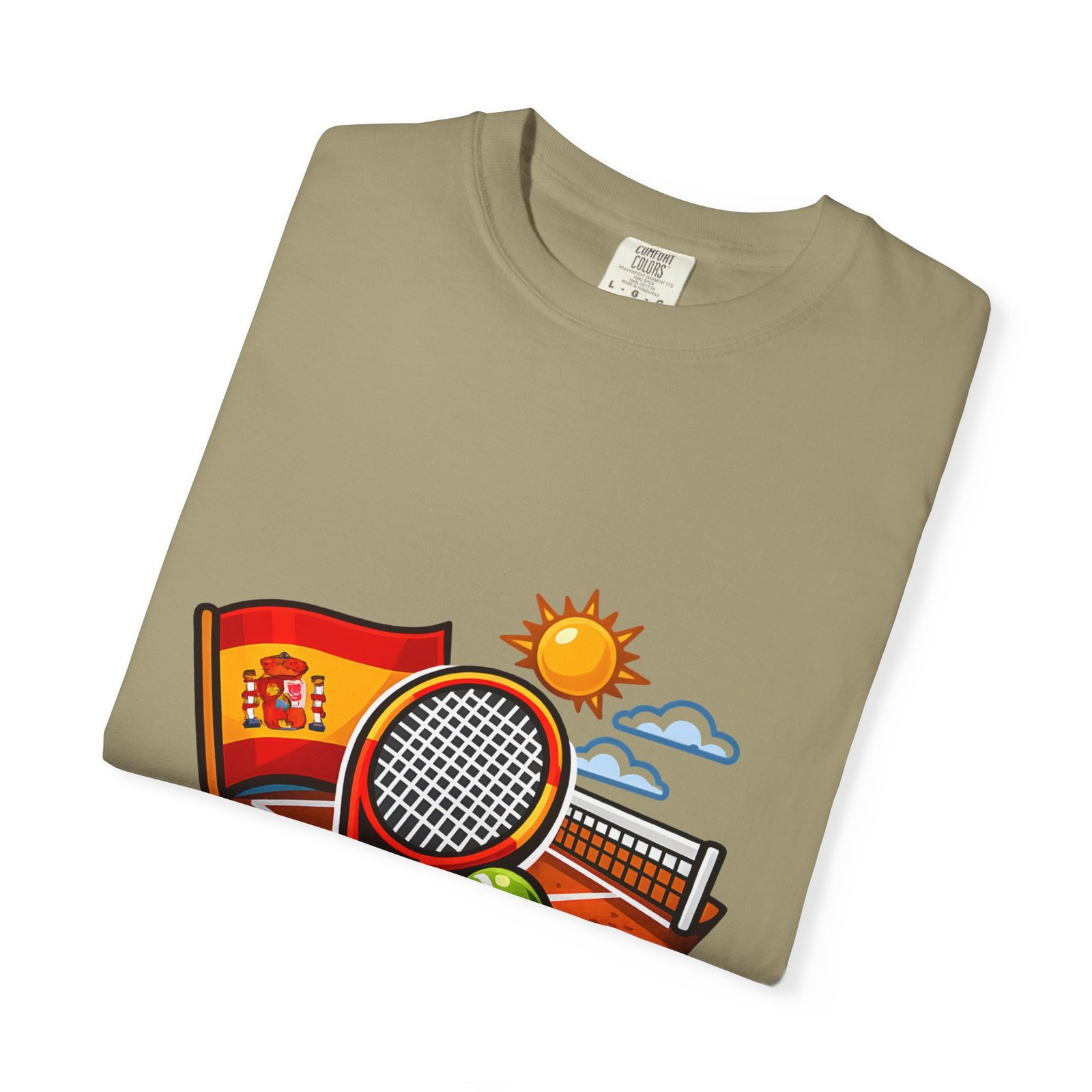 This heavyweight, garment-dyed tee brings the warmth of a Spanish sun and the energy of the tennis court into everyday wear. Softened by post-construction dyeing, the fabric has a lived-in hand that invites repeated wear. A bright, playful graphic—tennis racket, ball, net, sun and a waving Spanish flag—sits at the chest, evoking long afternoons on clay courts and the relaxed pride of coastal towns. The relaxed fit and durable double-stitched seams make it comfortable for travel days, match-watching with friends, or wandering seaside promenades. Available in many colors and sizes, the shirt settles in as a go-to layer for people who love sport, travel, and warm-weather memories.