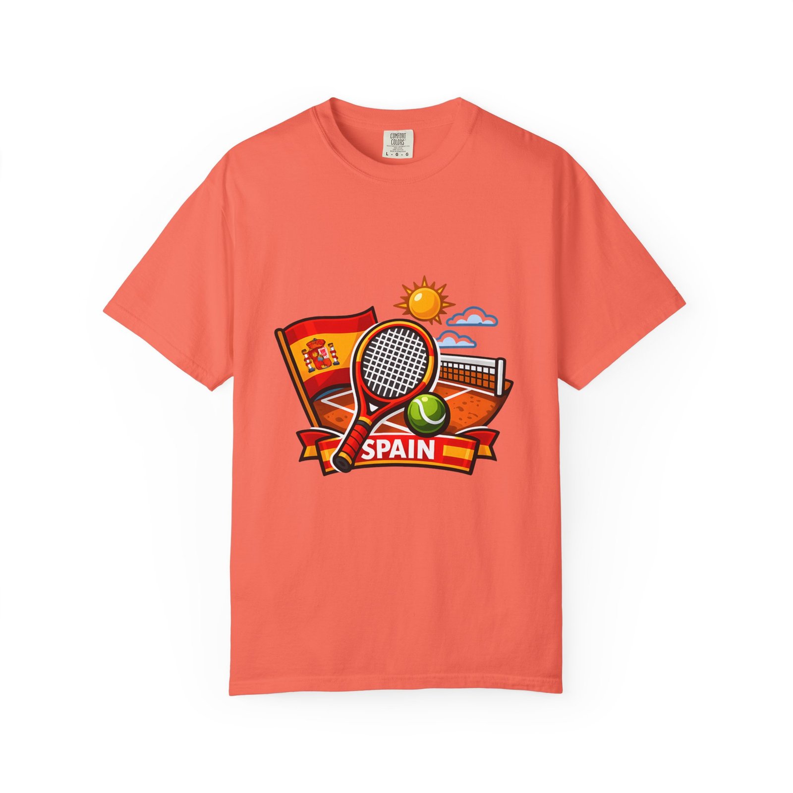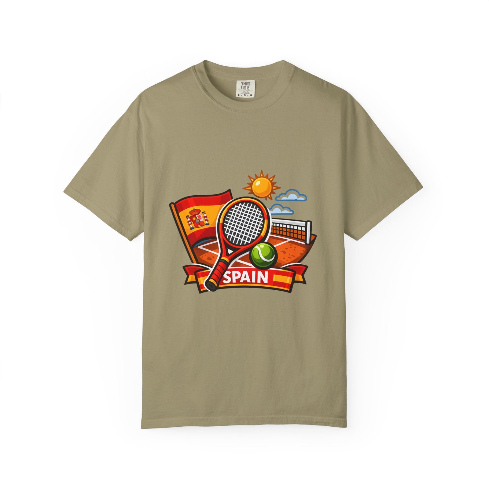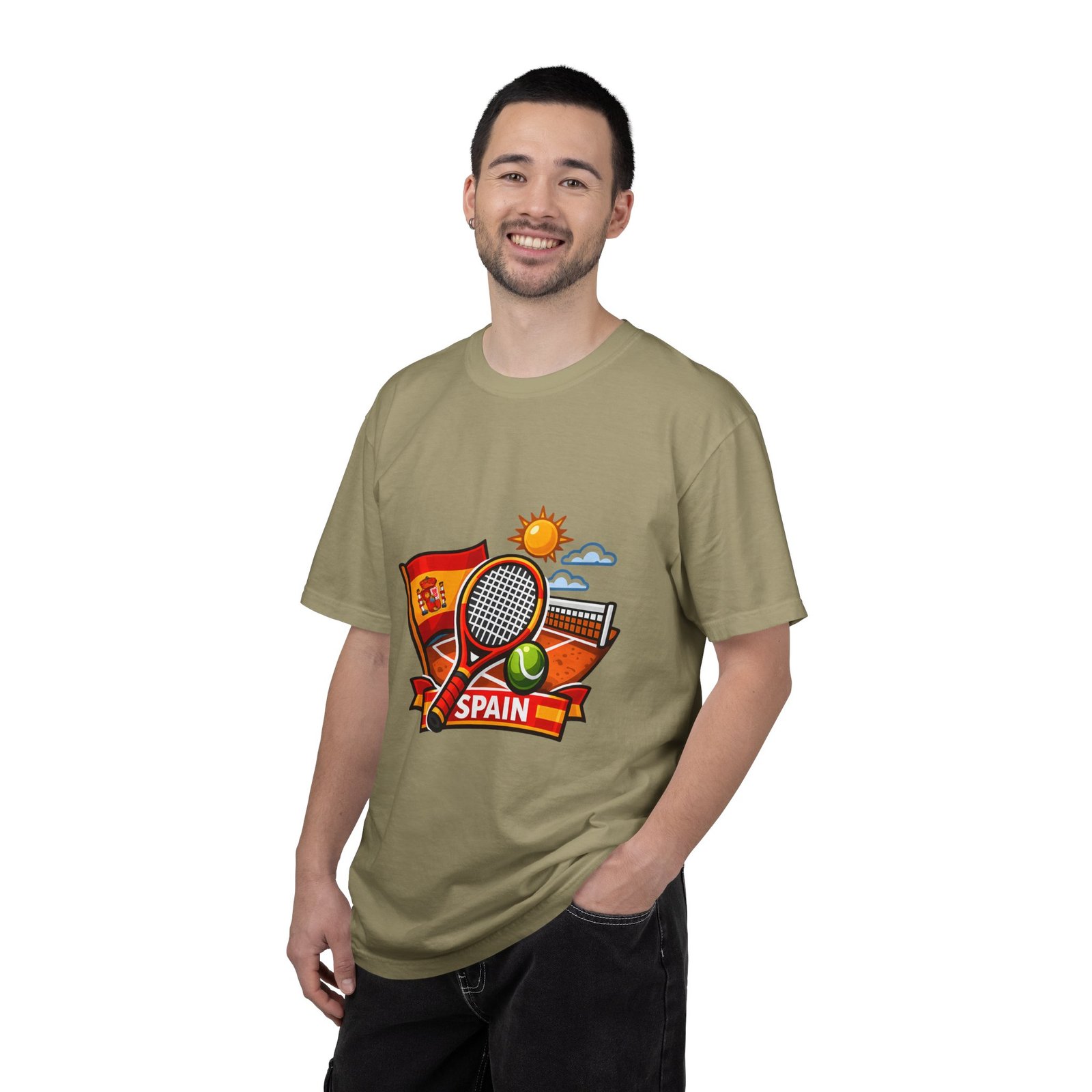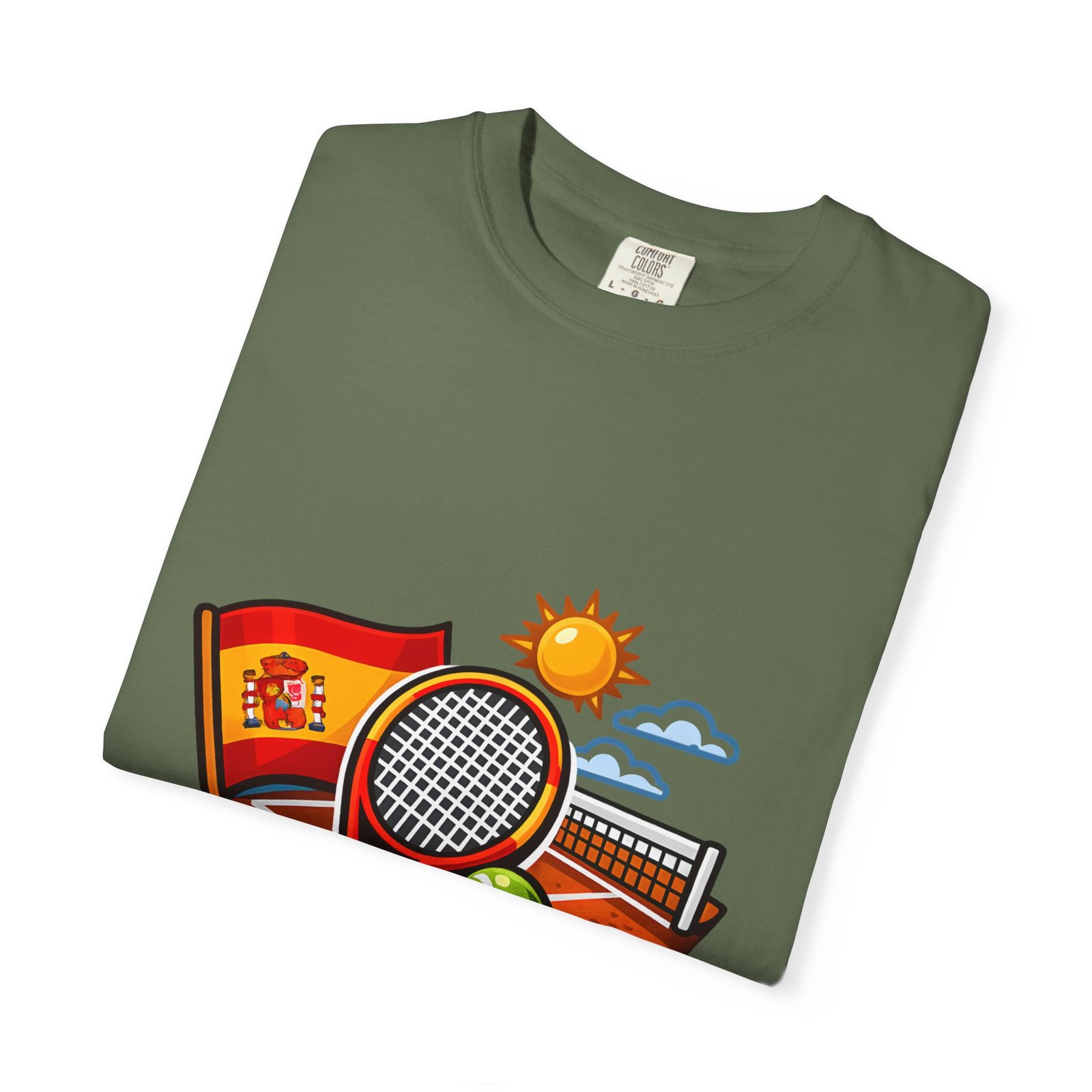 This heavyweight, garment-dyed tee brings the warmth of a Spanish sun and the energy of the tennis court into everyday wear. Softened by post-construction dyeing, the fabric has a lived-in hand that invites repeated wear. A bright, playful graphic—tennis racket, ball, net, sun and a waving Spanish flag—sits at the chest, evoking long afternoons on clay courts and the relaxed pride of coastal towns. The relaxed fit and durable double-stitched seams make it comfortable for travel days, match-watching with friends, or wandering seaside promenades. Available in many colors and sizes, the shirt settles in as a go-to layer for people who love sport, travel, and warm-weather memories.