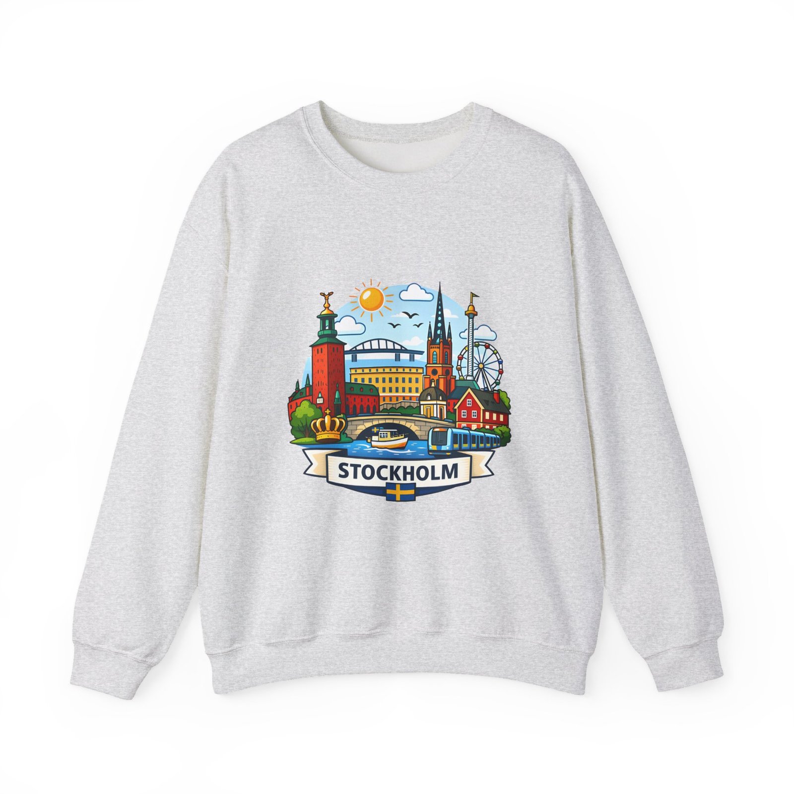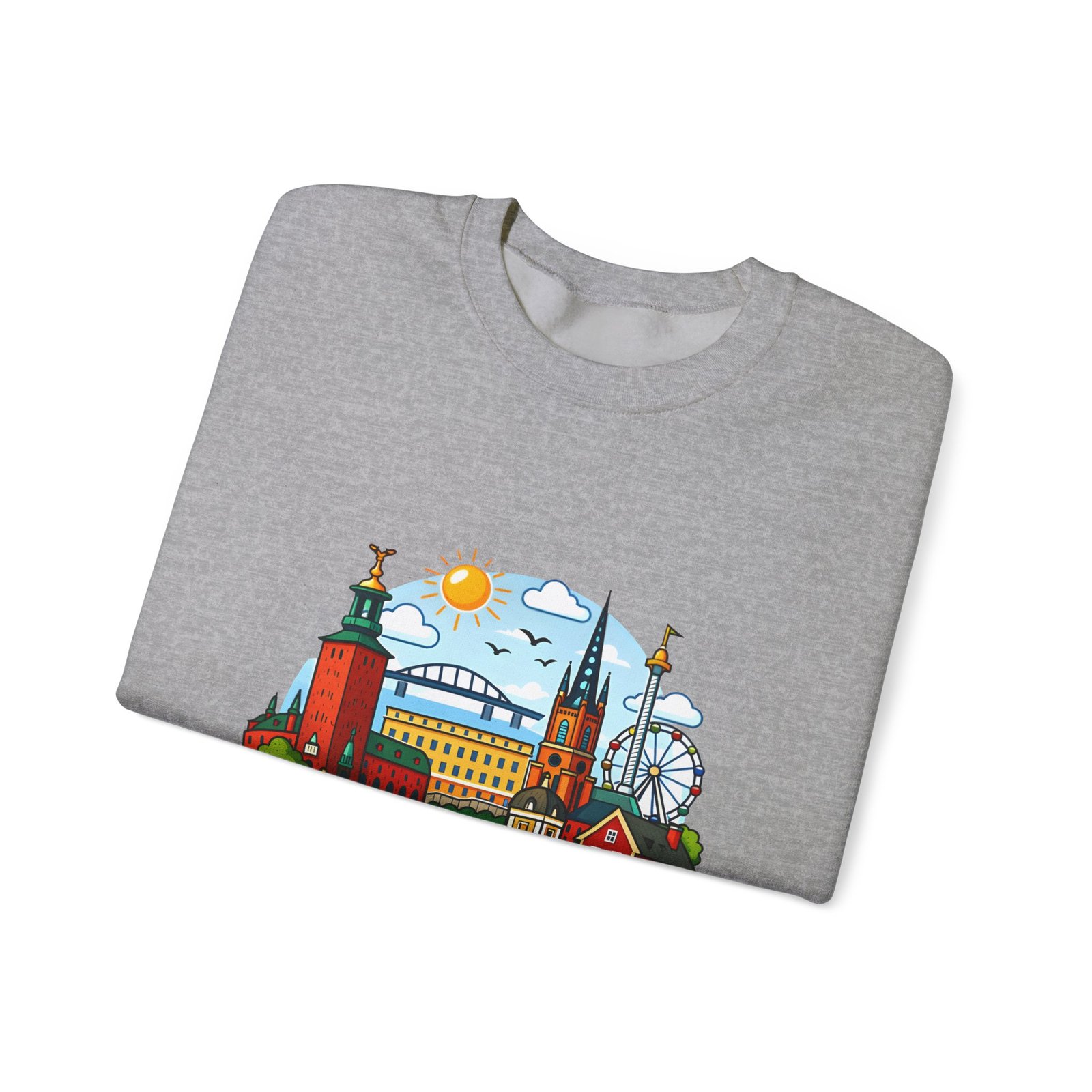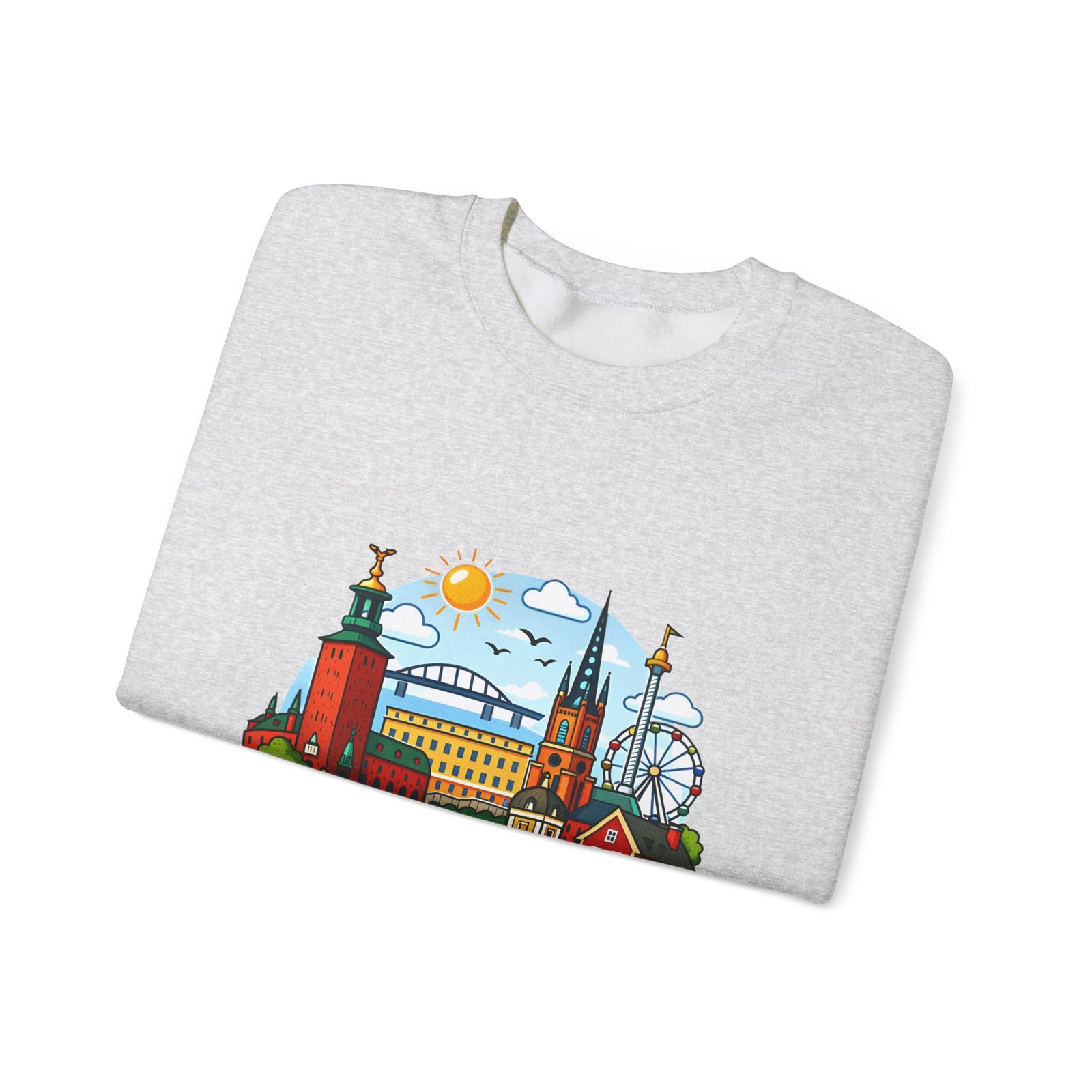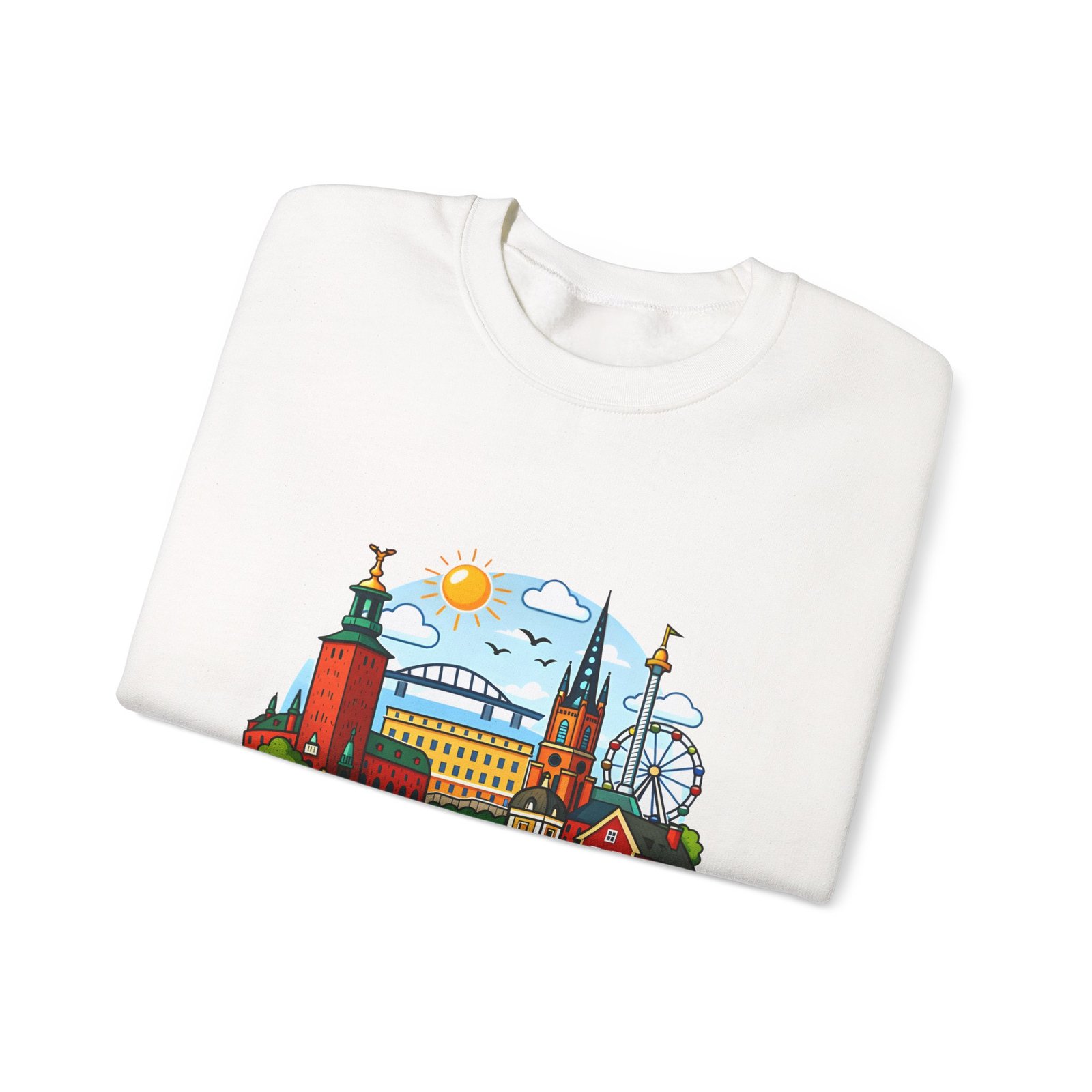 This cozy crewneck brings Stockholm home in soft, lived-in comfort. The midweight 50/50 cotton–poly blend holds a bright, detailed cityscape print on the front that pops against the clean white fabric. Tubular knit construction and ribbed collar keep the silhouette tidy, while double-needle stitching and reinforced seams mean this sweatshirt stands up to frequent wear. It’s breathable yet warm — the kind of layer you reach for on cool mornings, museum days, or long walks along the waterfront. The graphic captures familiar spires, ferris-wheel evenings, and sunlit streets, turning a simple sweatshirt into a small, wearable ode to the city.